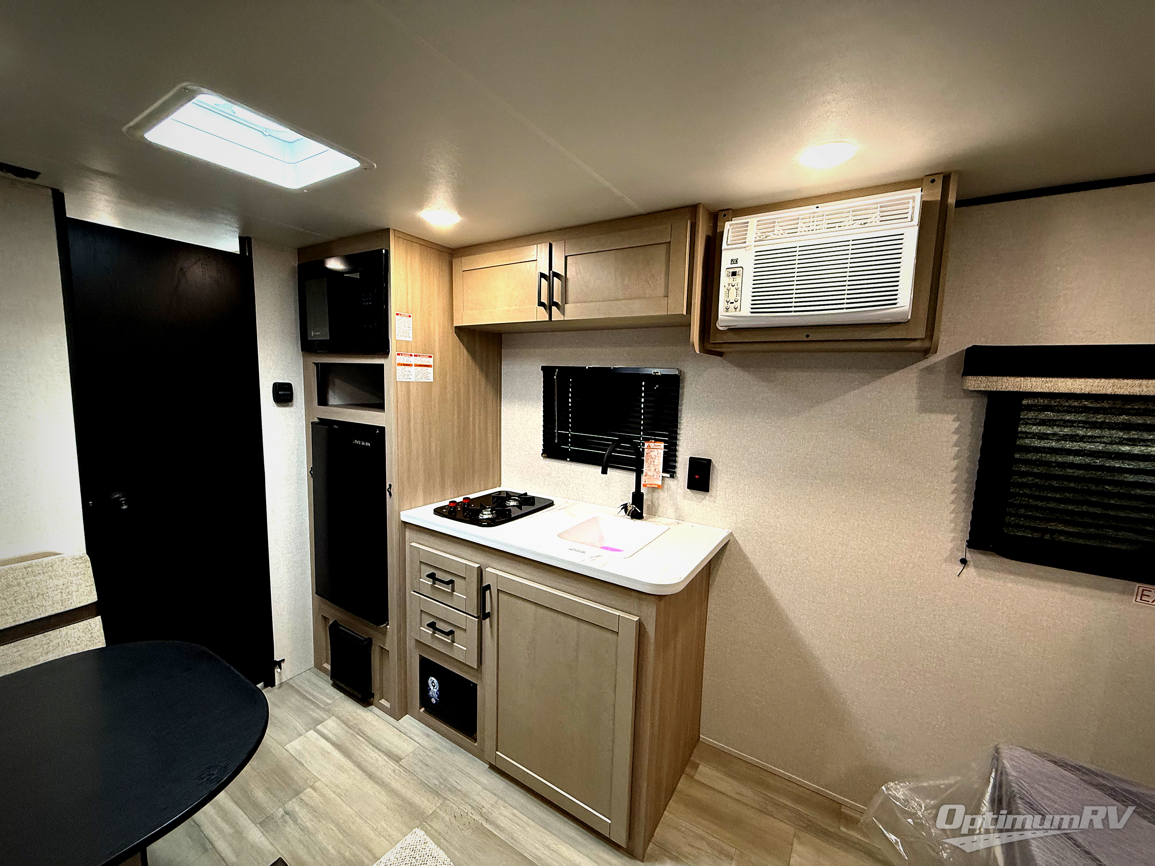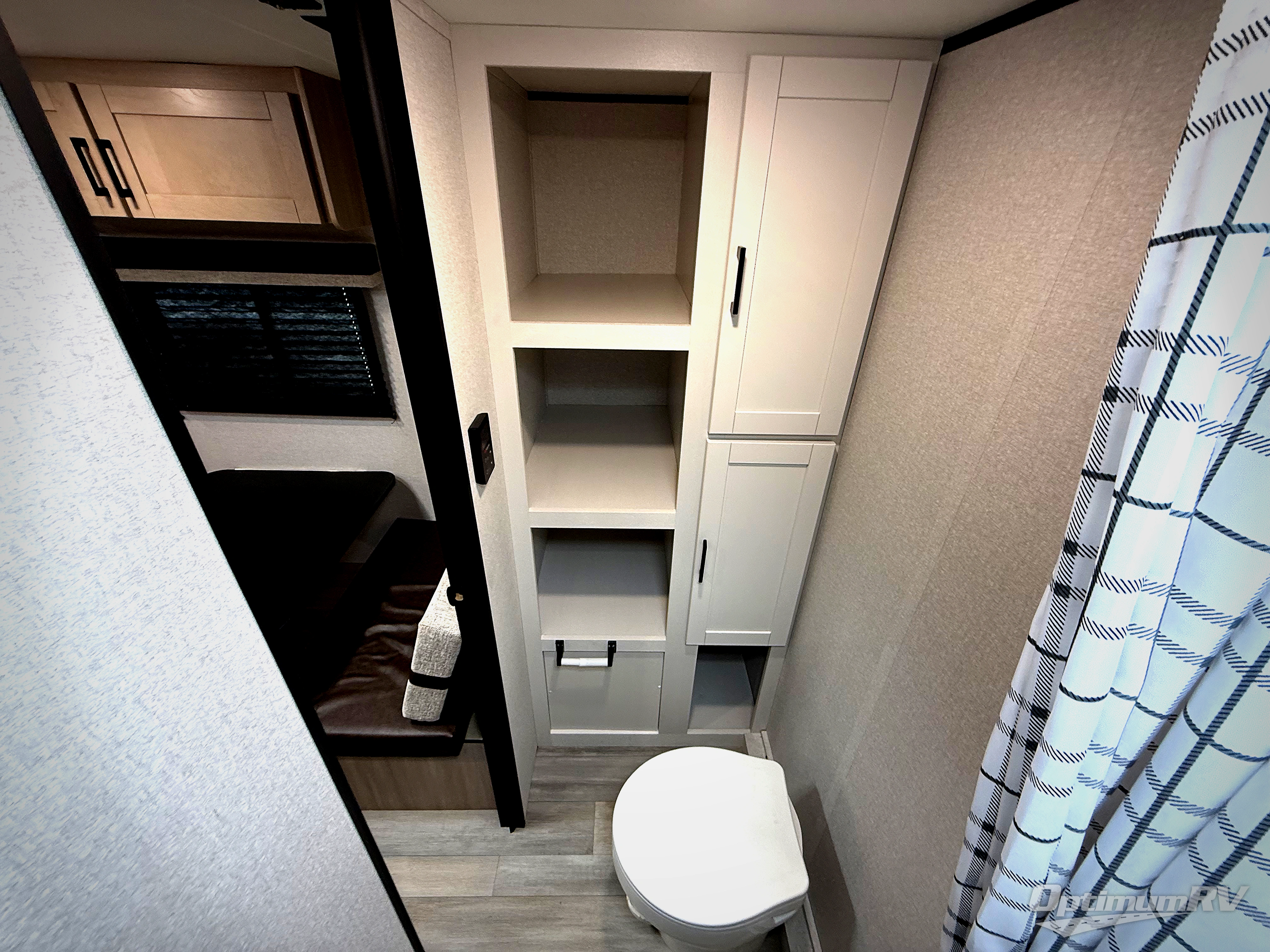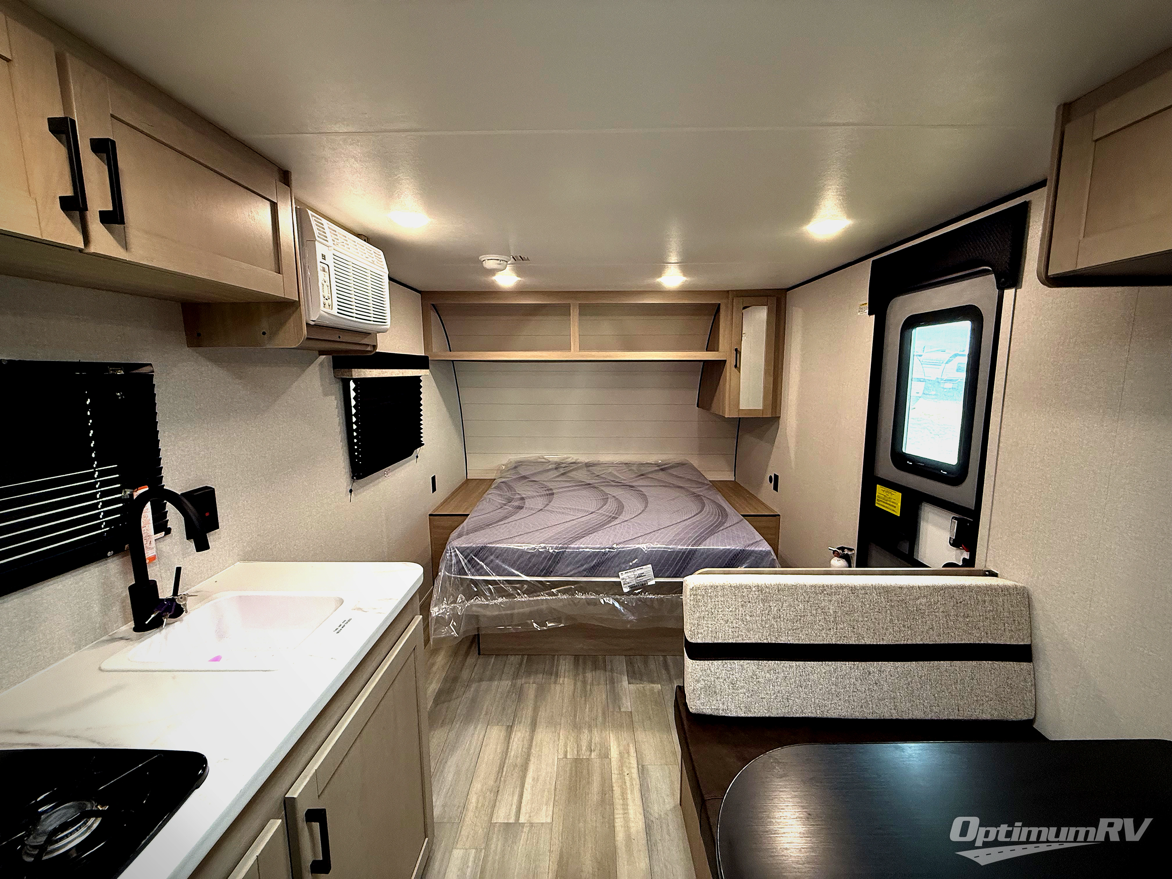 This travel trailer provides you with a little more privacy thanks to the rear bath, which also includes a bath linen closet and shelves for extra storage. The front bedroom includes a walk-around RV queen bed to make it easier to make the bed, and you'll find an overhead shelf for books or games. Once you've made lunch on the two-burner cooktop or in the microwave oven, you can dine at the booth dinette or take your plate outdoors to sit under the 10' power awning.