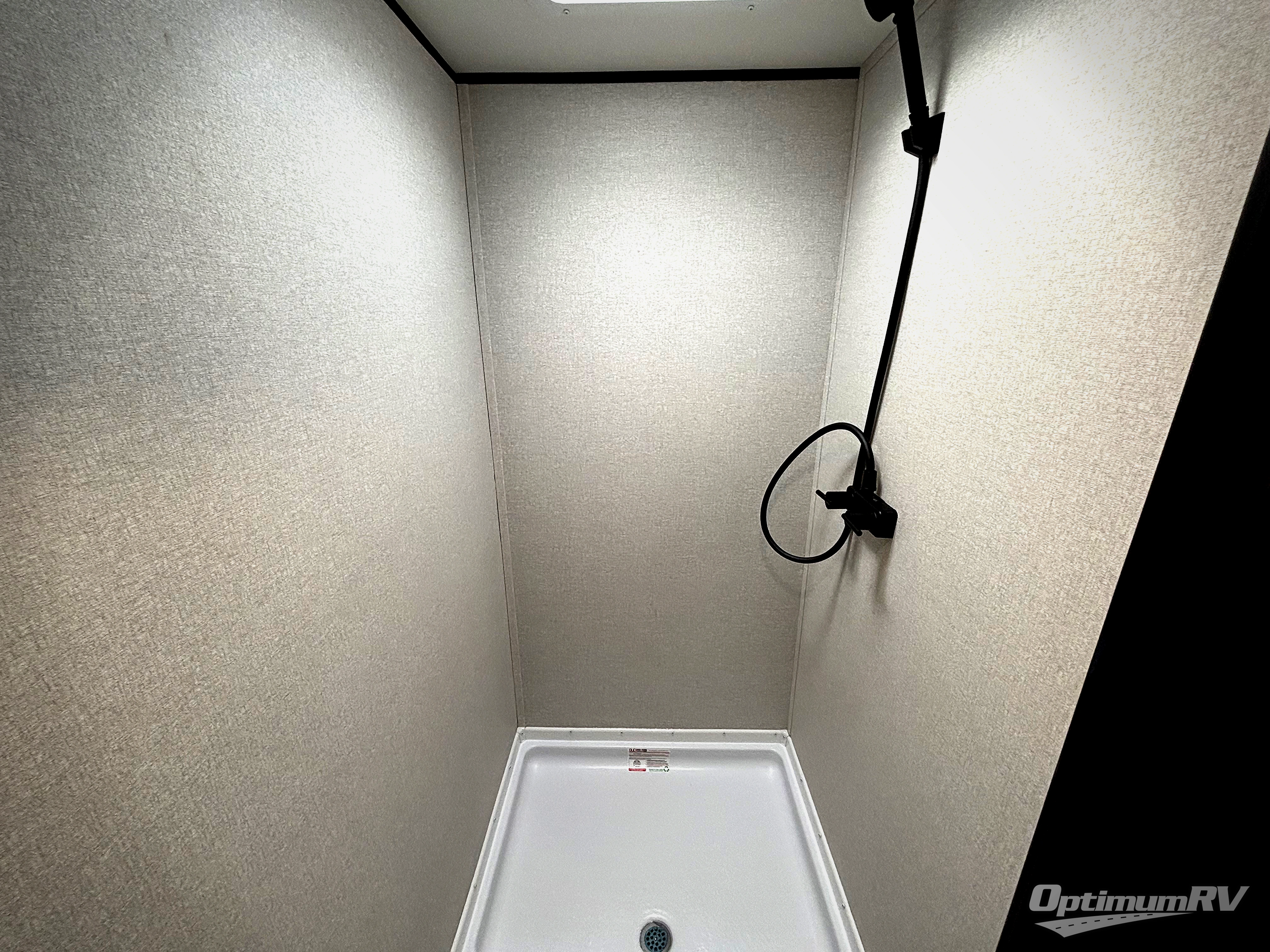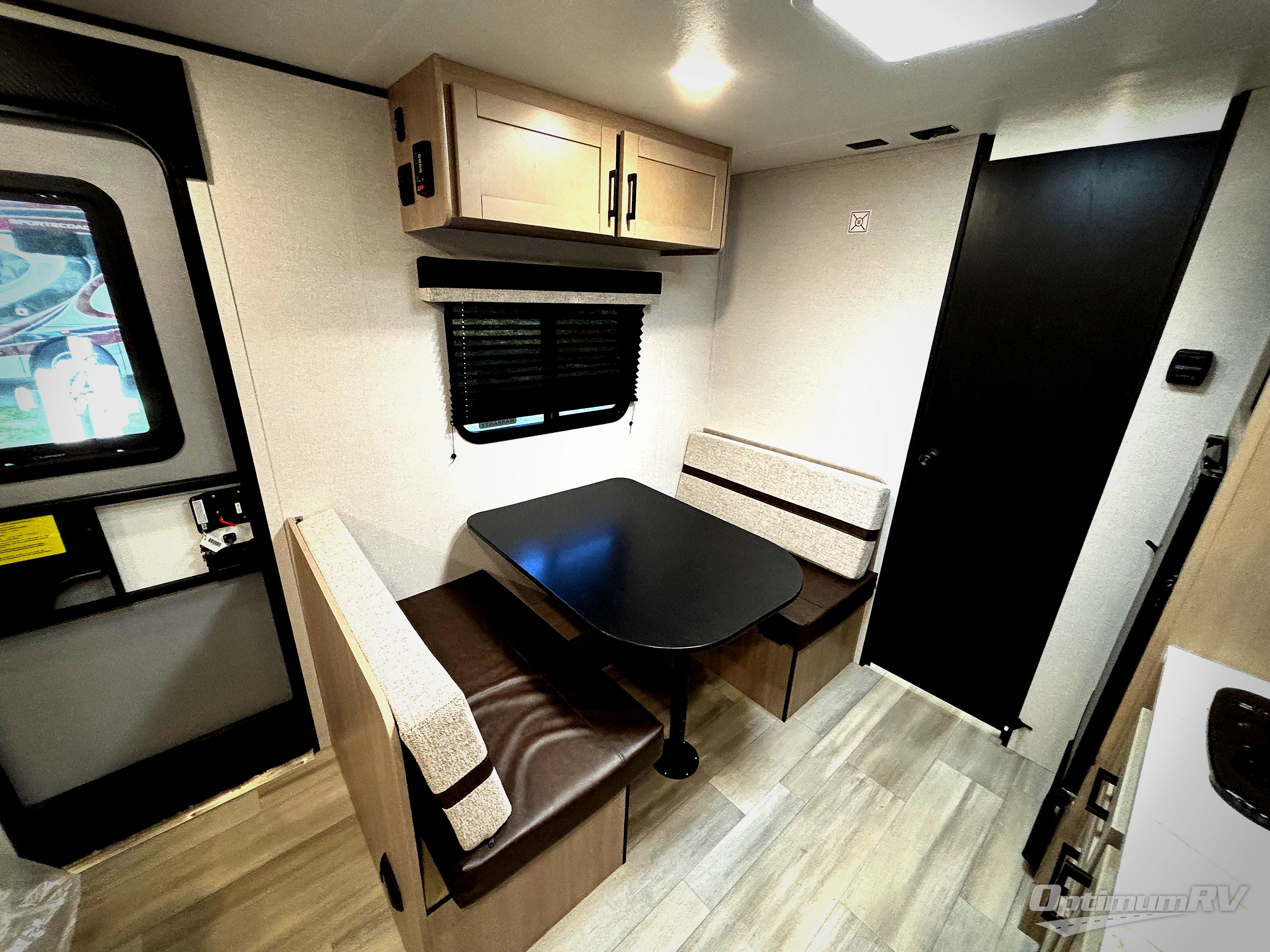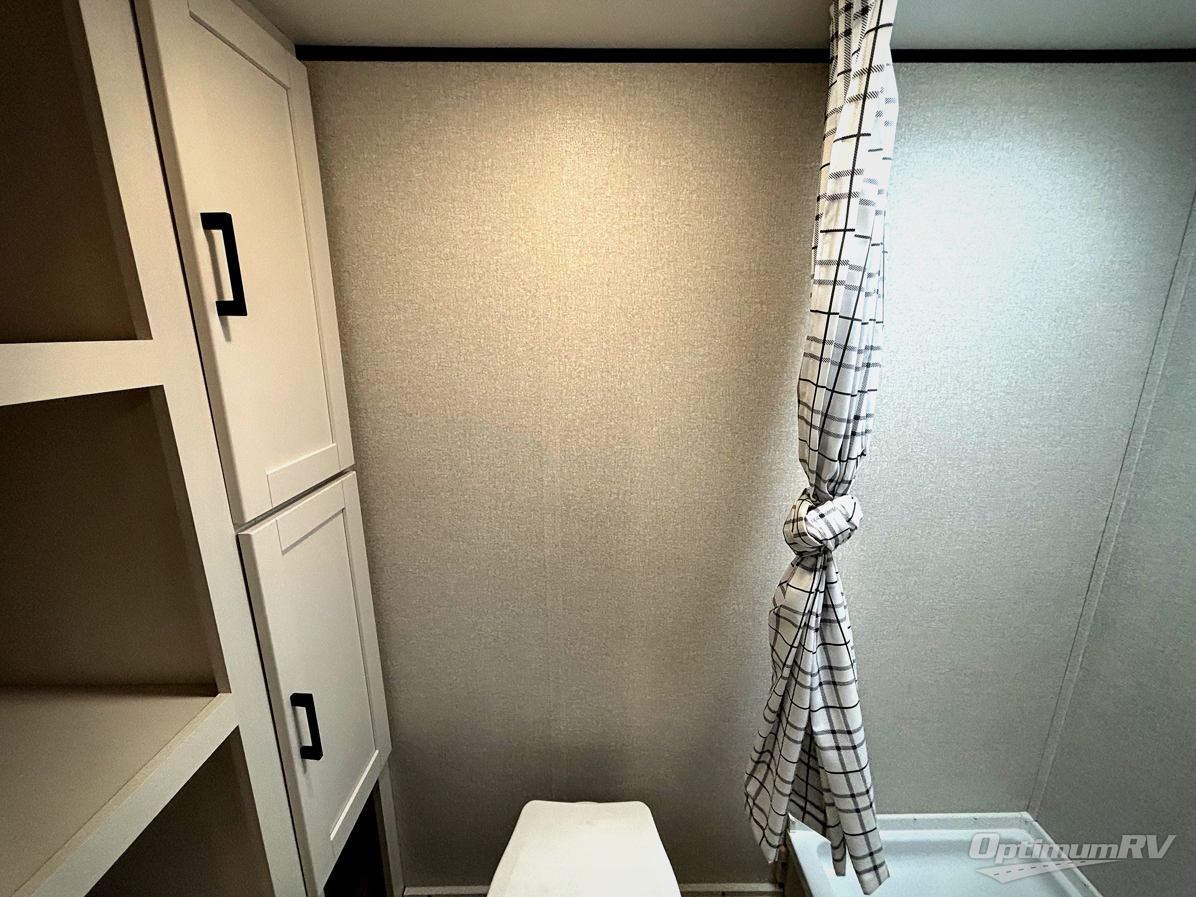 This travel trailer provides you with a little more privacy thanks to the rear bath, which also includes a bath linen closet and shelves for extra storage. The front bedroom includes a walk-around RV queen bed to make it easier to make the bed, and you'll find an overhead shelf for books or games. Once you've made lunch on the two-burner cooktop or in the microwave oven, you can dine at the booth dinette or take your plate outdoors to sit under the 10' power awning.