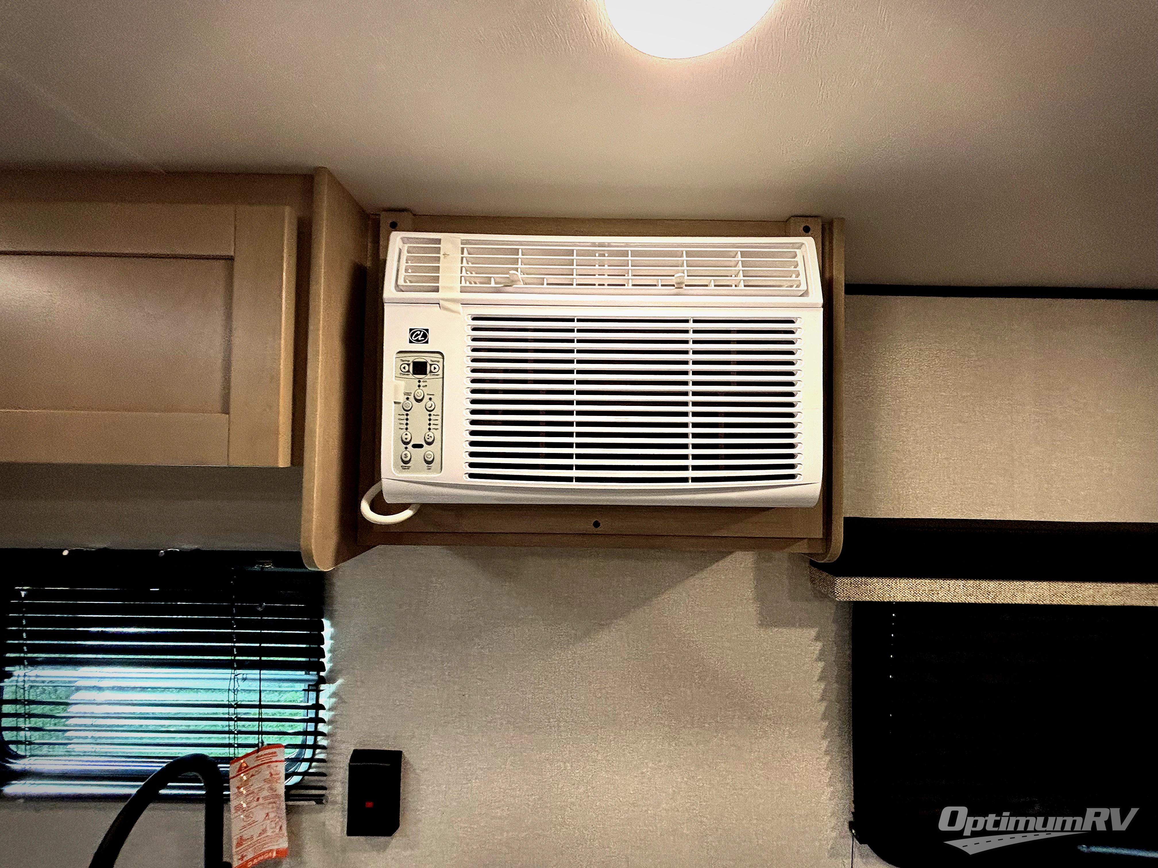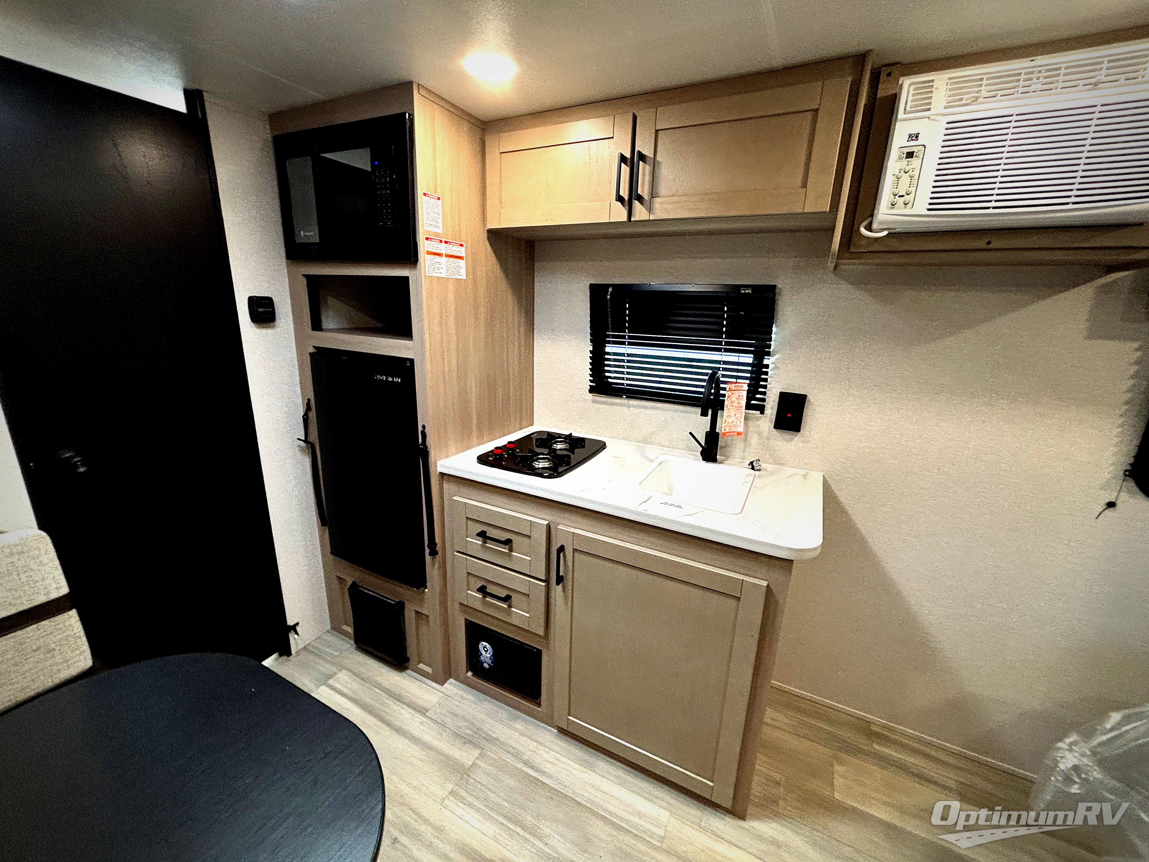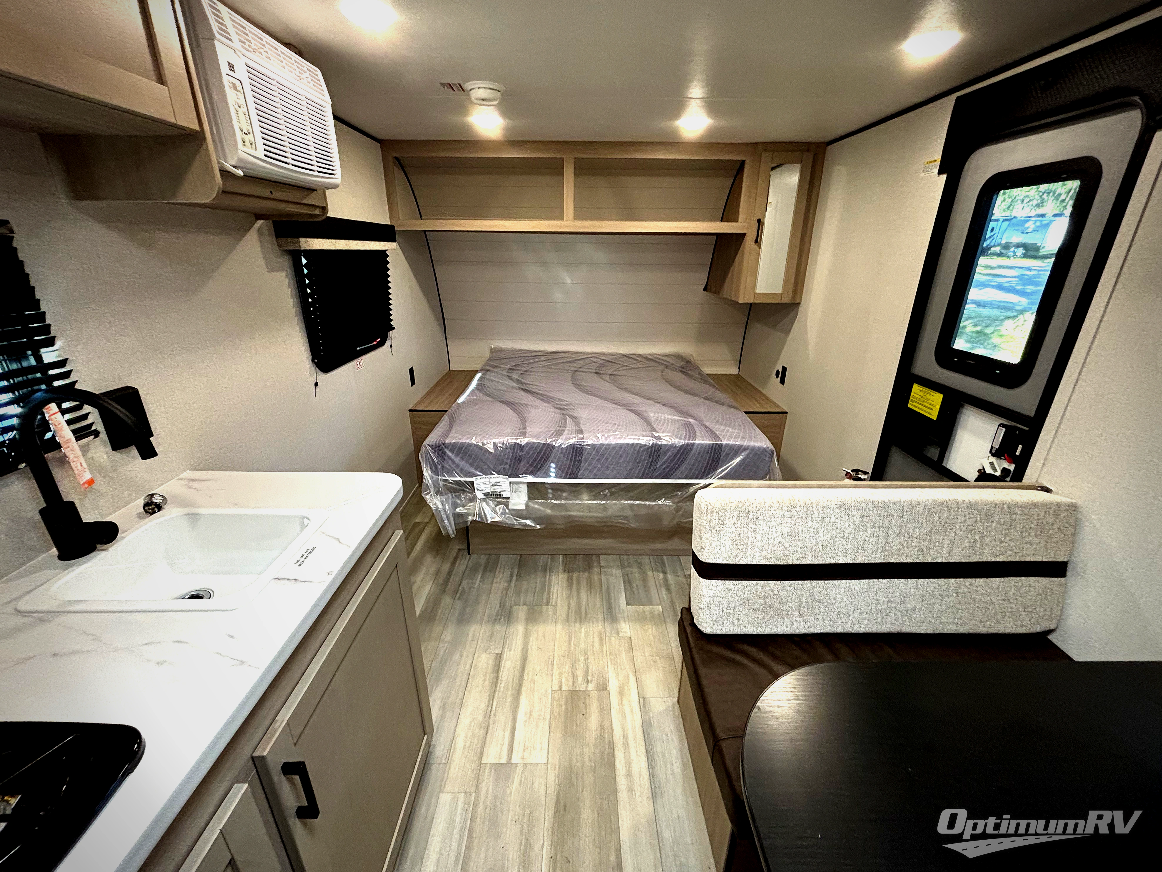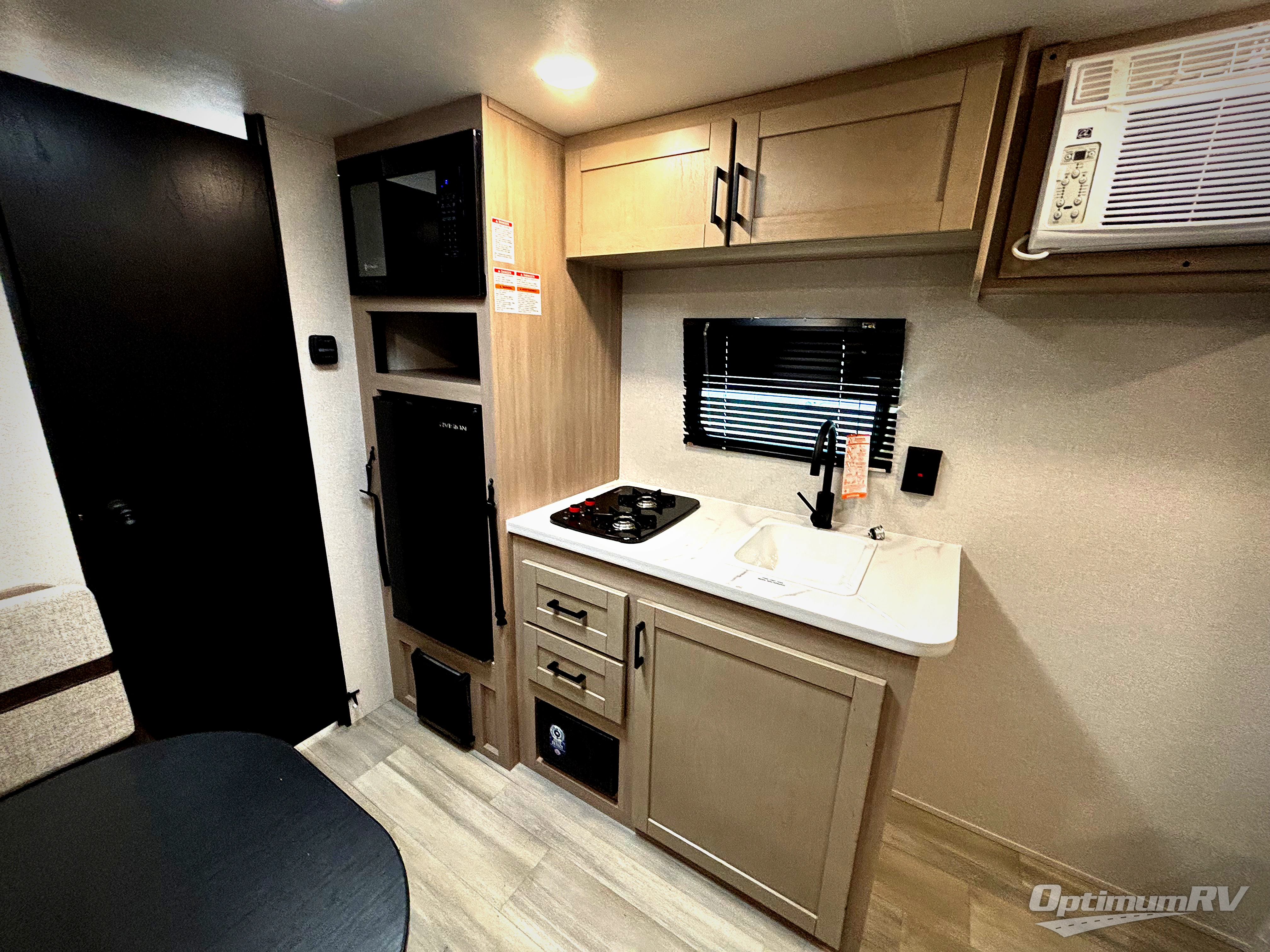 This travel trailer provides you with a little more privacy thanks to the rear bath, which also includes a bath linen closet and shelves for extra storage. The front bedroom includes a walk-around RV queen bed to make it easier to make the bed, and you'll find an overhead shelf for books or games. Once you've made lunch on the two-burner cooktop or in the microwave oven, you can dine at the booth dinette or take your plate outdoors to sit under the 10' power awning.