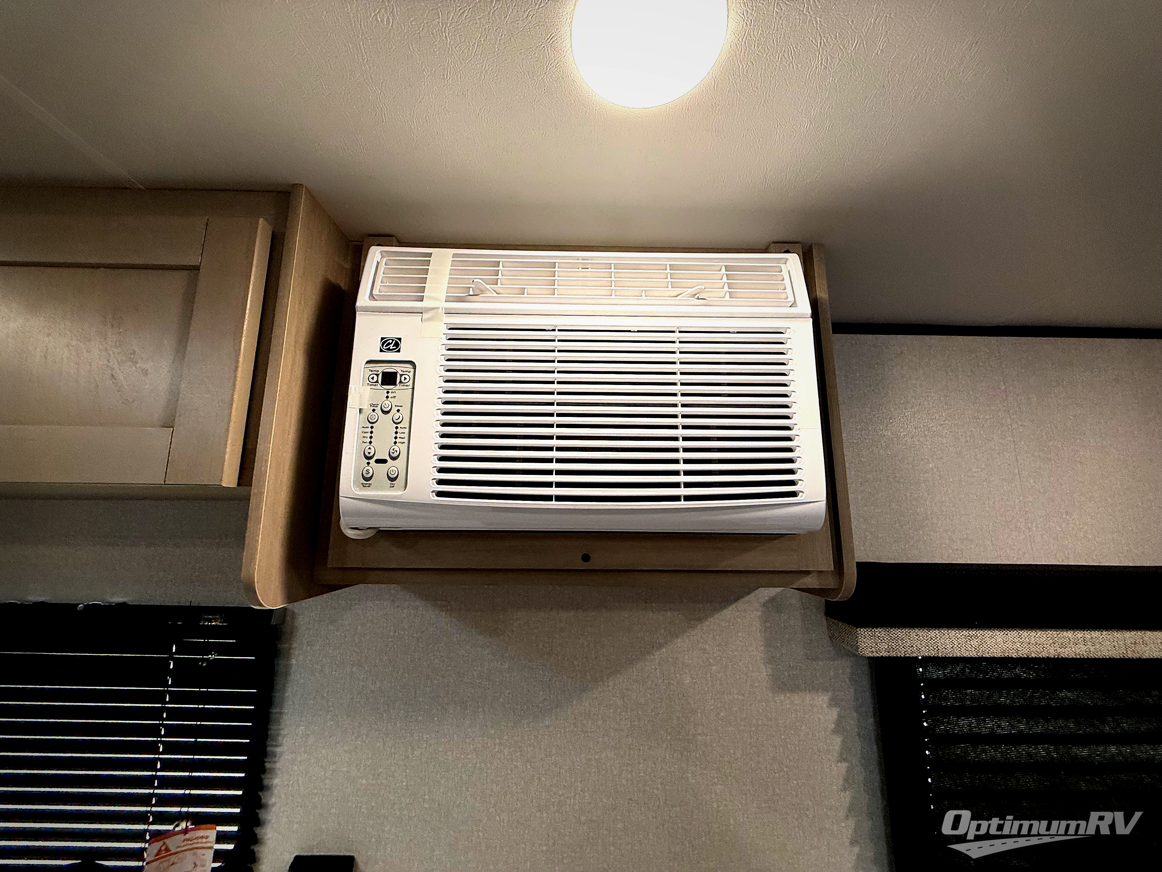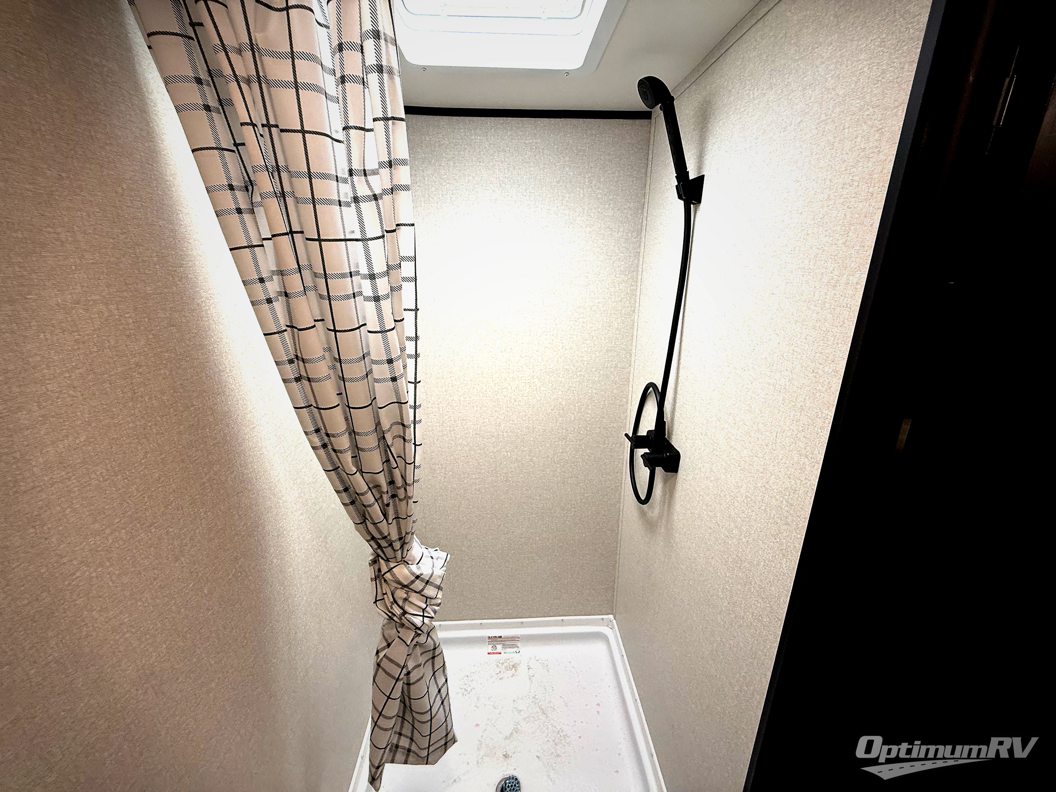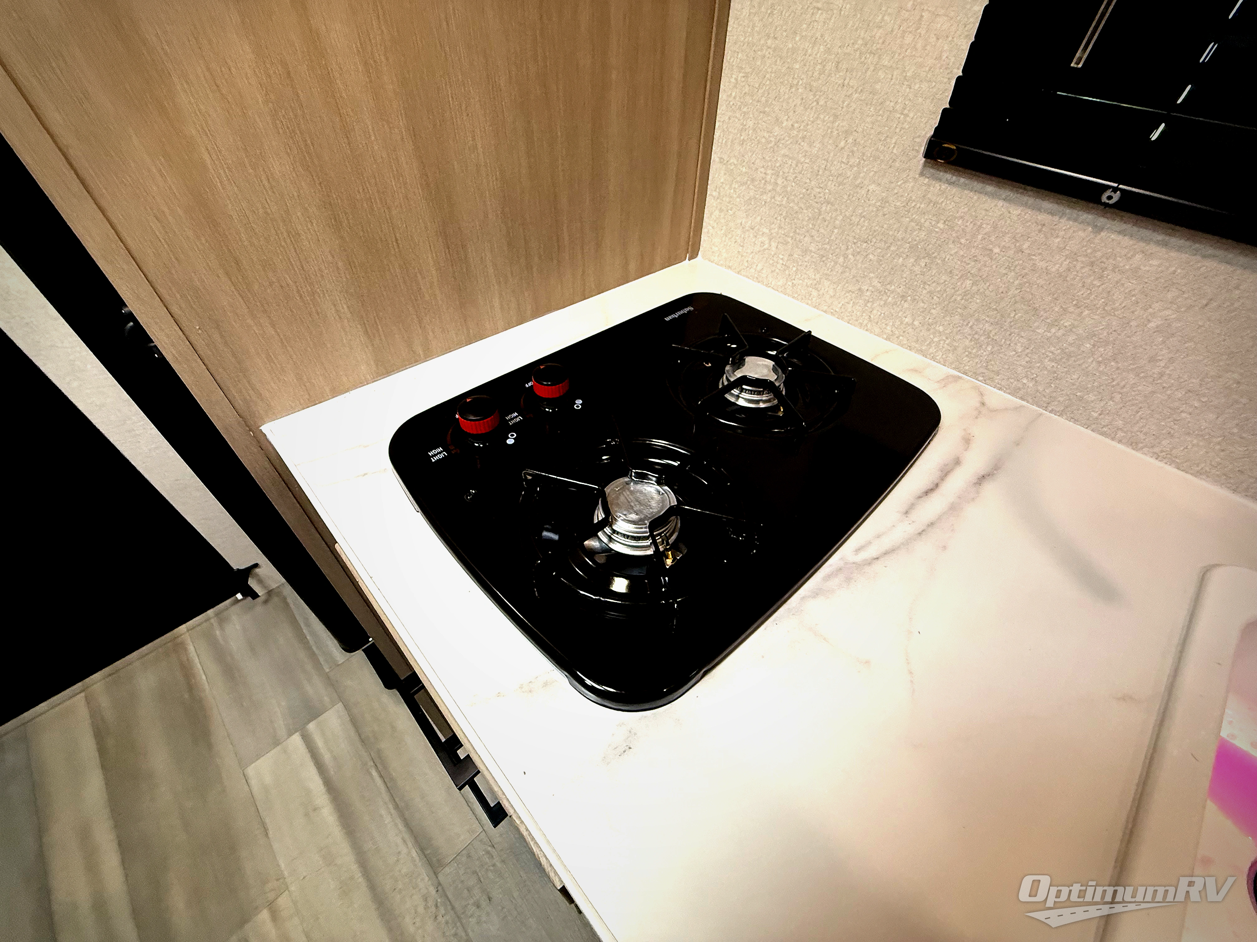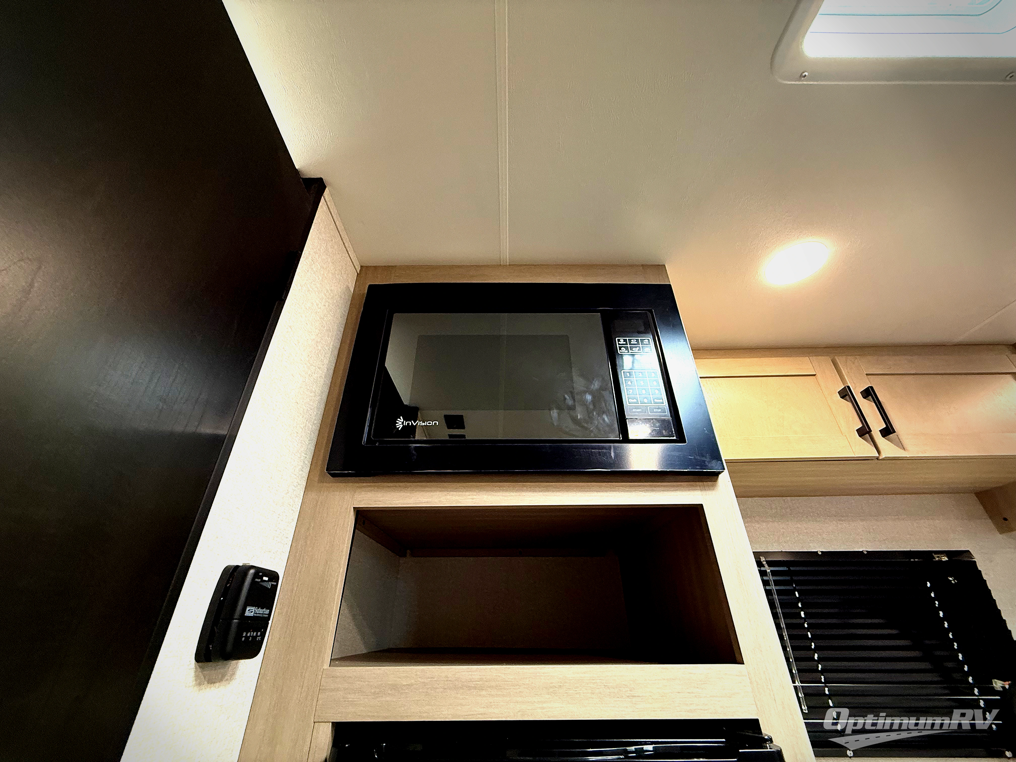 This travel trailer provides you with a little more privacy thanks to the rear bath, which also includes a bath linen closet and shelves for extra storage. The front bedroom includes a walk-around RV queen bed to make it easier to make the bed, and you'll find an overhead shelf for books or games. Once you've made lunch on the two-burner cooktop or in the microwave oven, you can dine at the booth dinette or take your plate outdoors to sit under the 10' power awning.