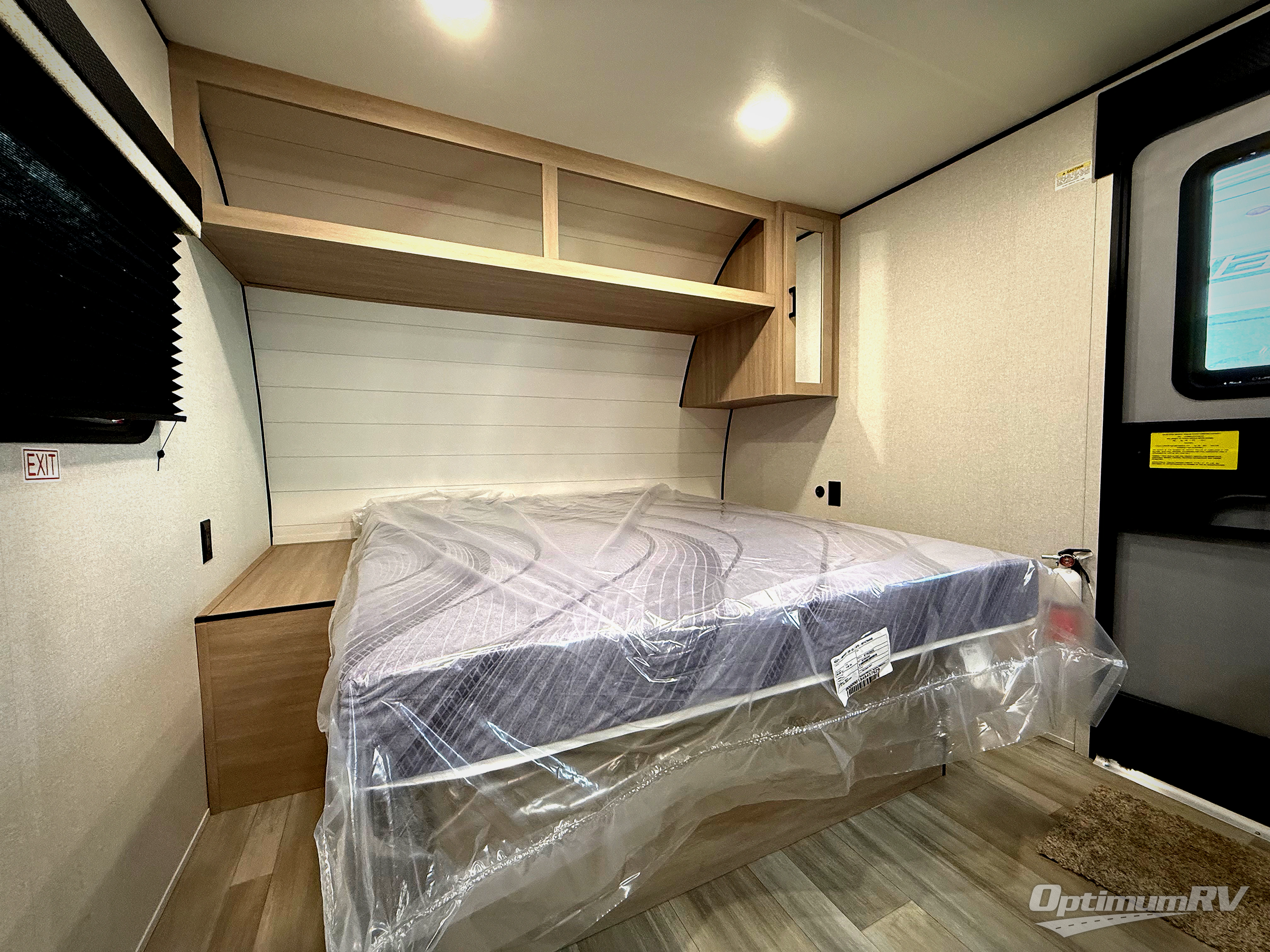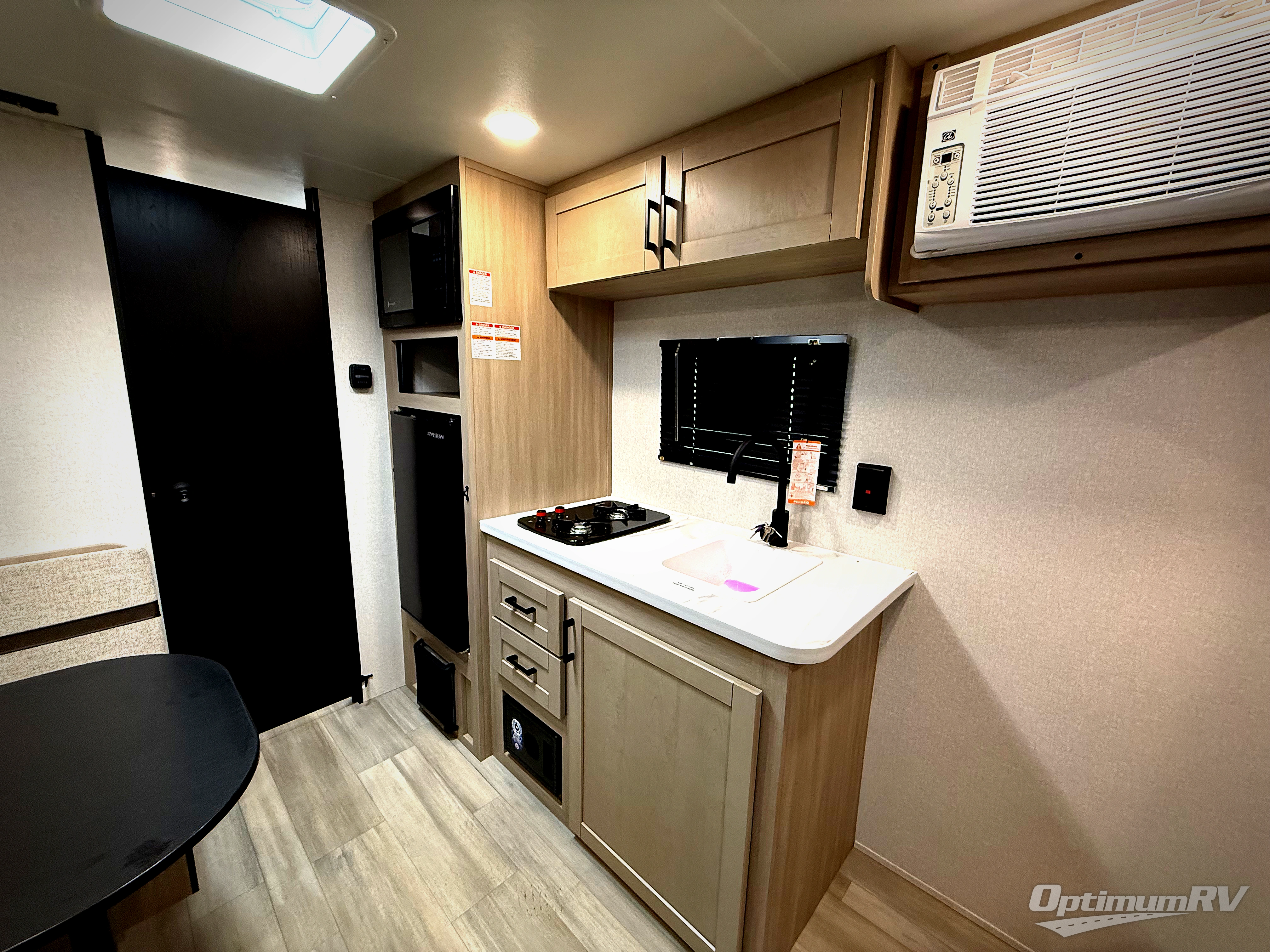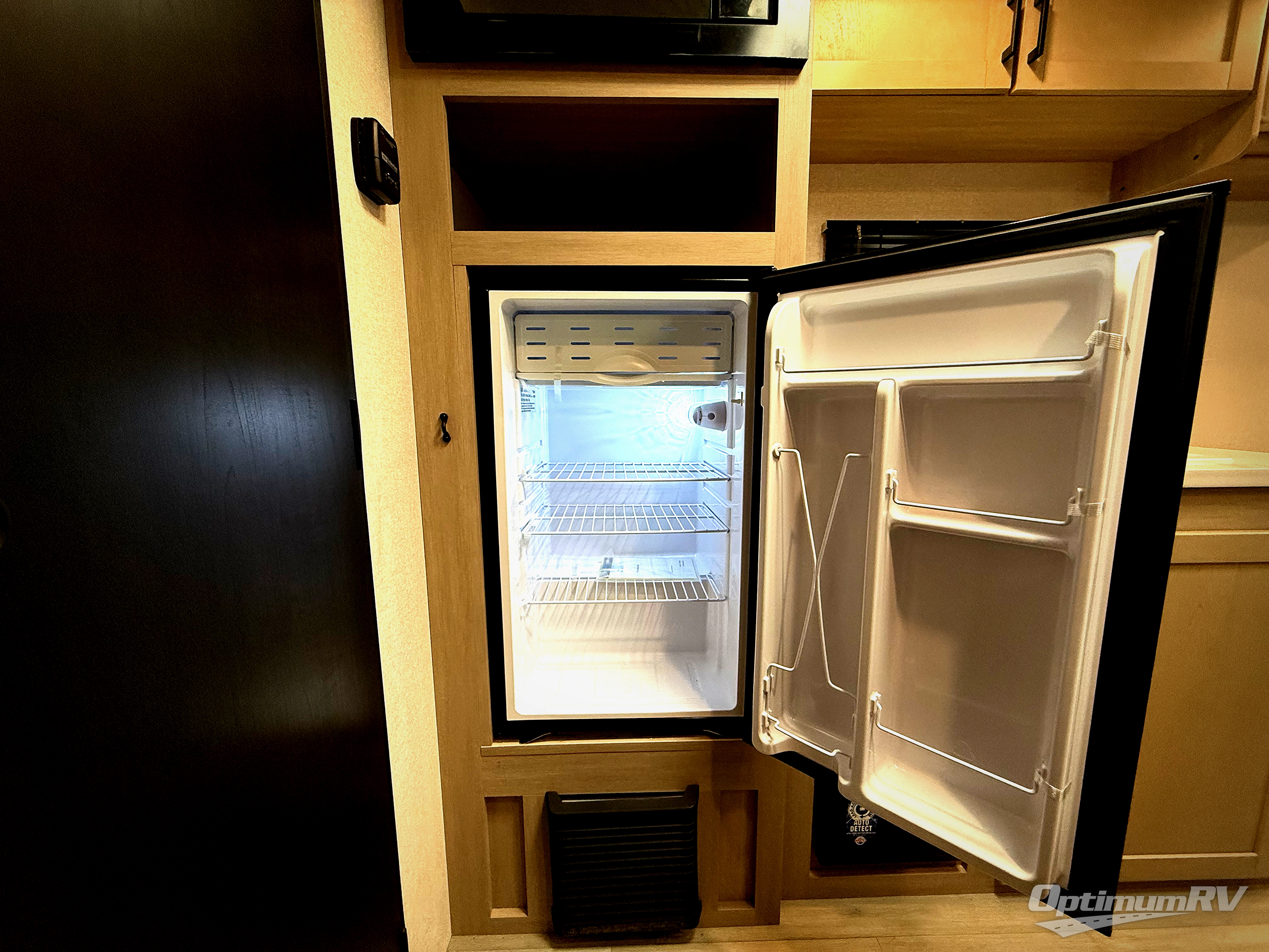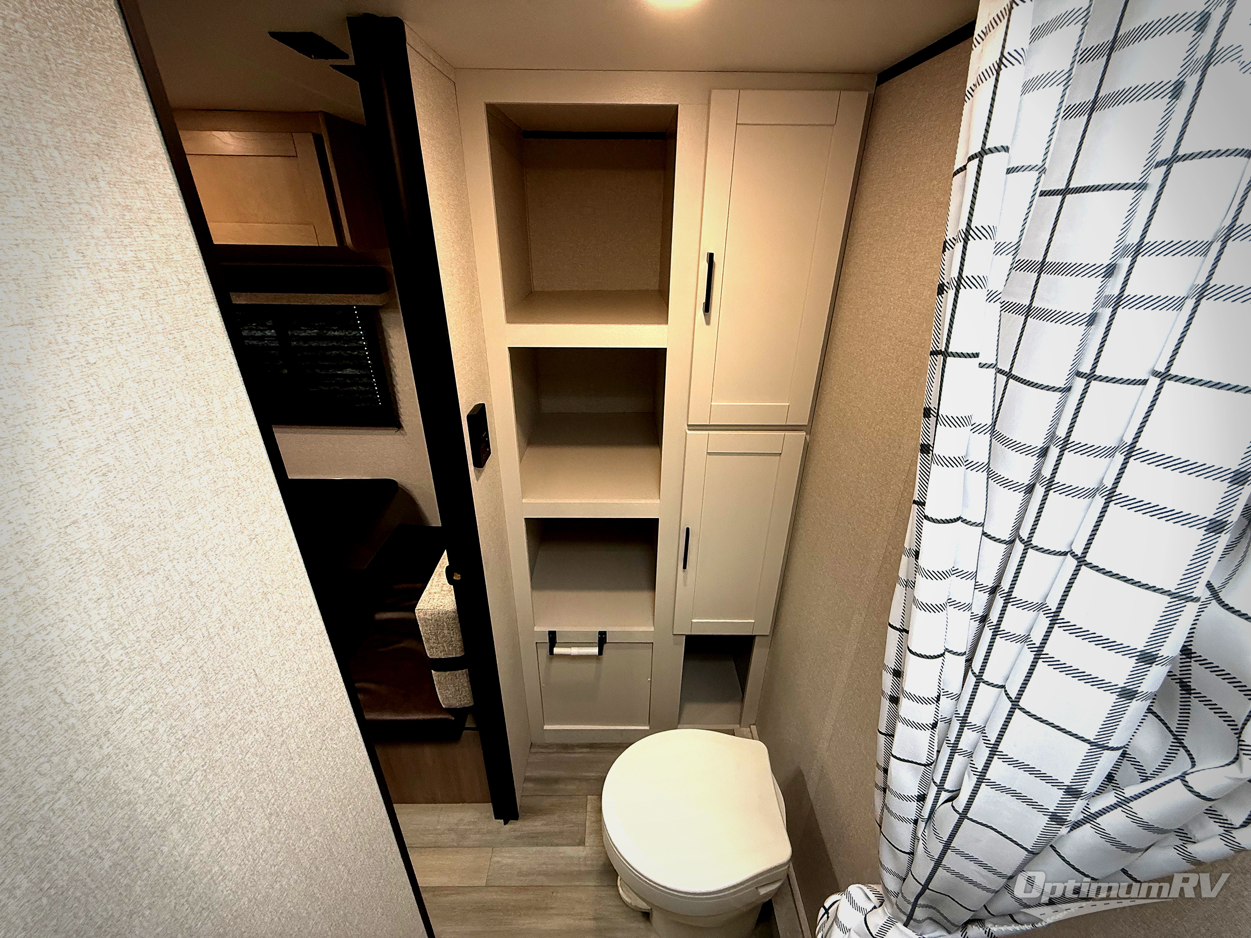 This travel trailer provides you with a little more privacy thanks to the rear bath, which also includes a bath linen closet and shelves for extra storage. The front bedroom includes a walk-around RV queen bed to make it easier to make the bed, and you'll find an overhead shelf for books or games. Once you've made lunch on the two-burner cooktop or in the microwave oven, you can dine at the booth dinette or take your plate outdoors to sit under the 10' power awning.
