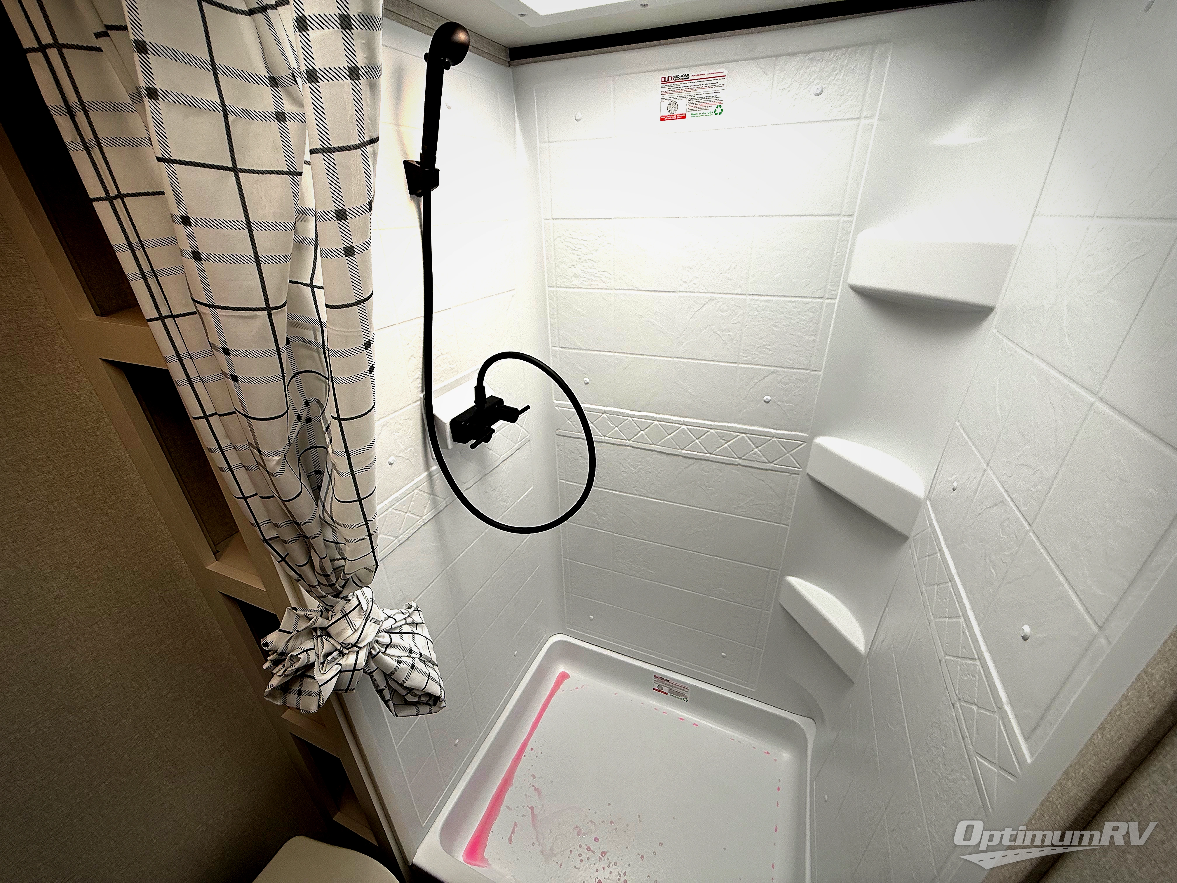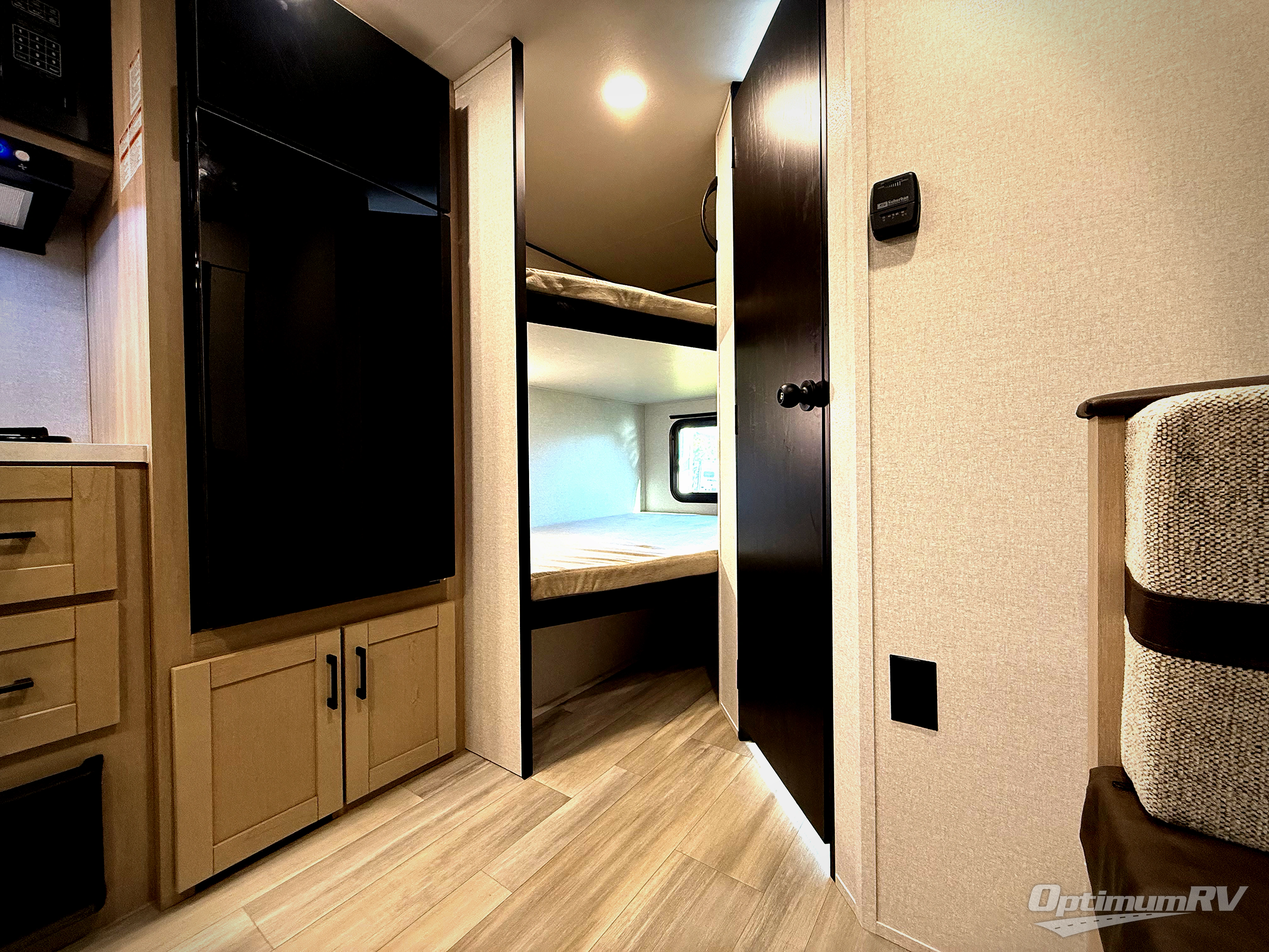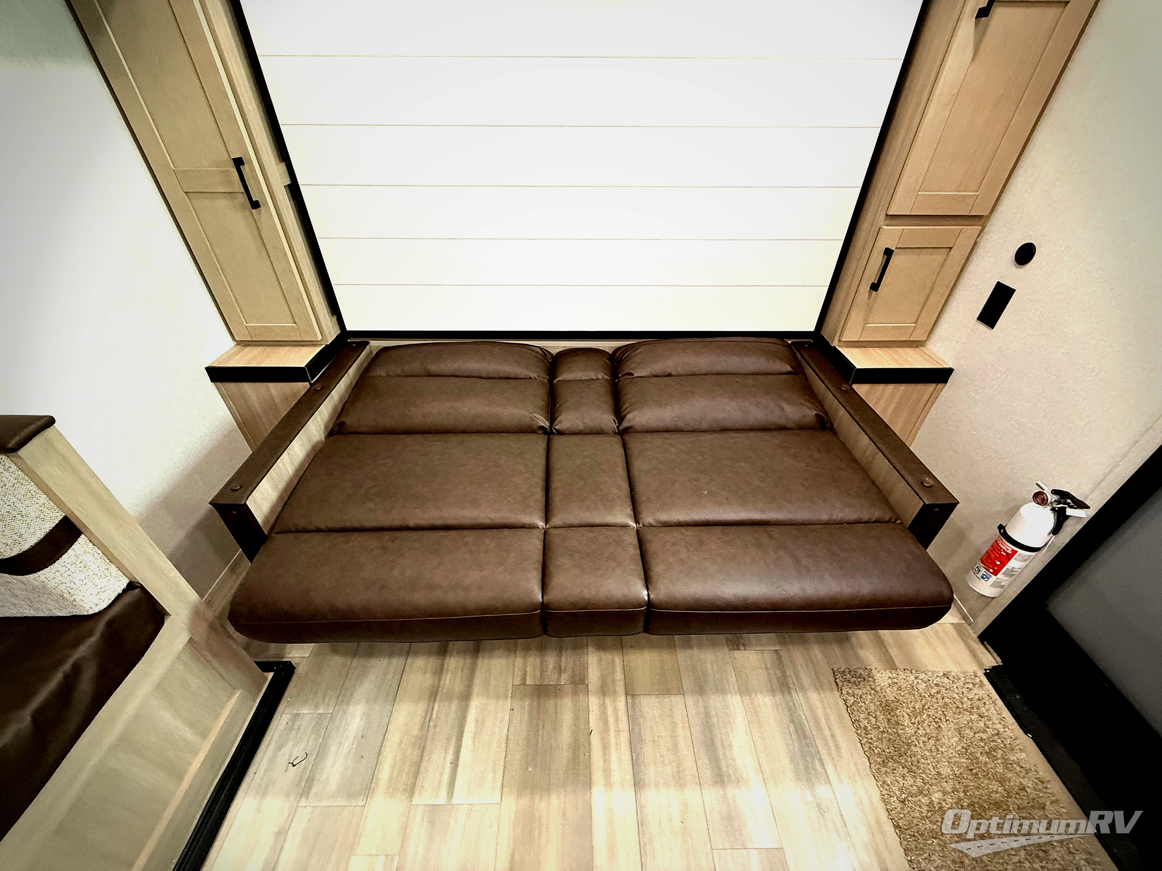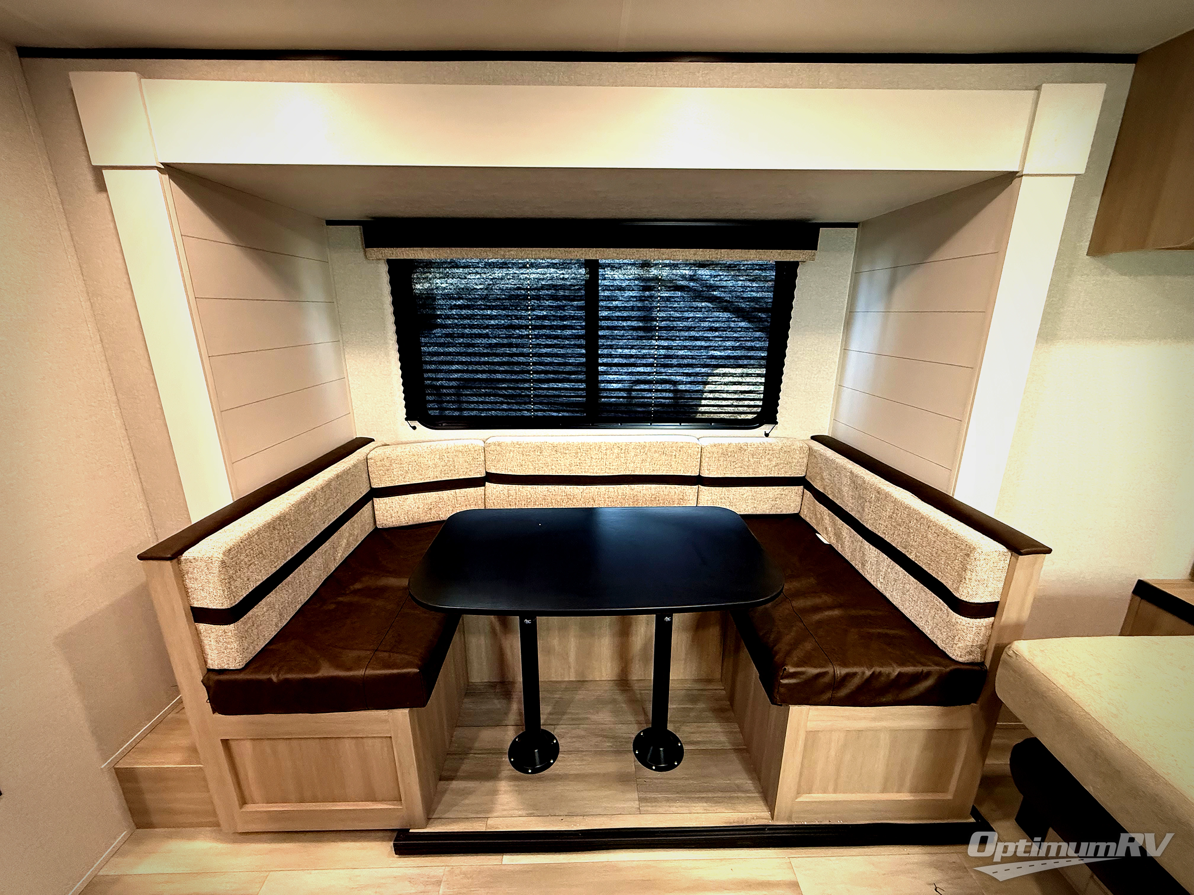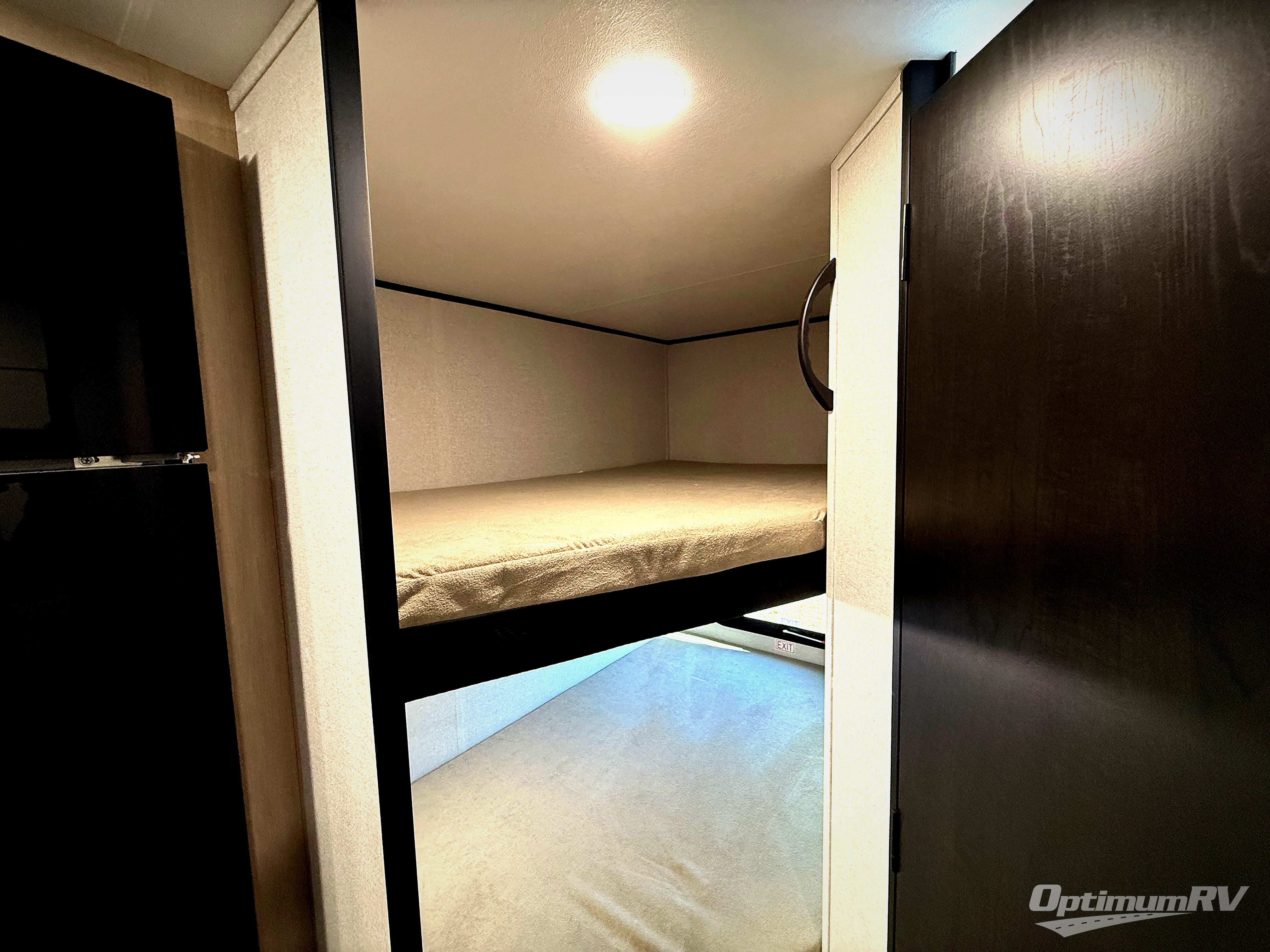 Camping trips are made easy in this travel trailer with double-size bunk beds for guests or little ones. There is a front Murphy bed that will provide you with more space during the day when you put it away to reveal the jack knife sofa. The rear corner full bath includes a foot-flush toilet, a 30" x 36" shower and a sink, so you won't have to leave the camper in the middle of the night. A two-burner cooktop and microwave oven will let you make meals each day, and you can dine around the U-shaped dinette, which is also within a slide out for more space!