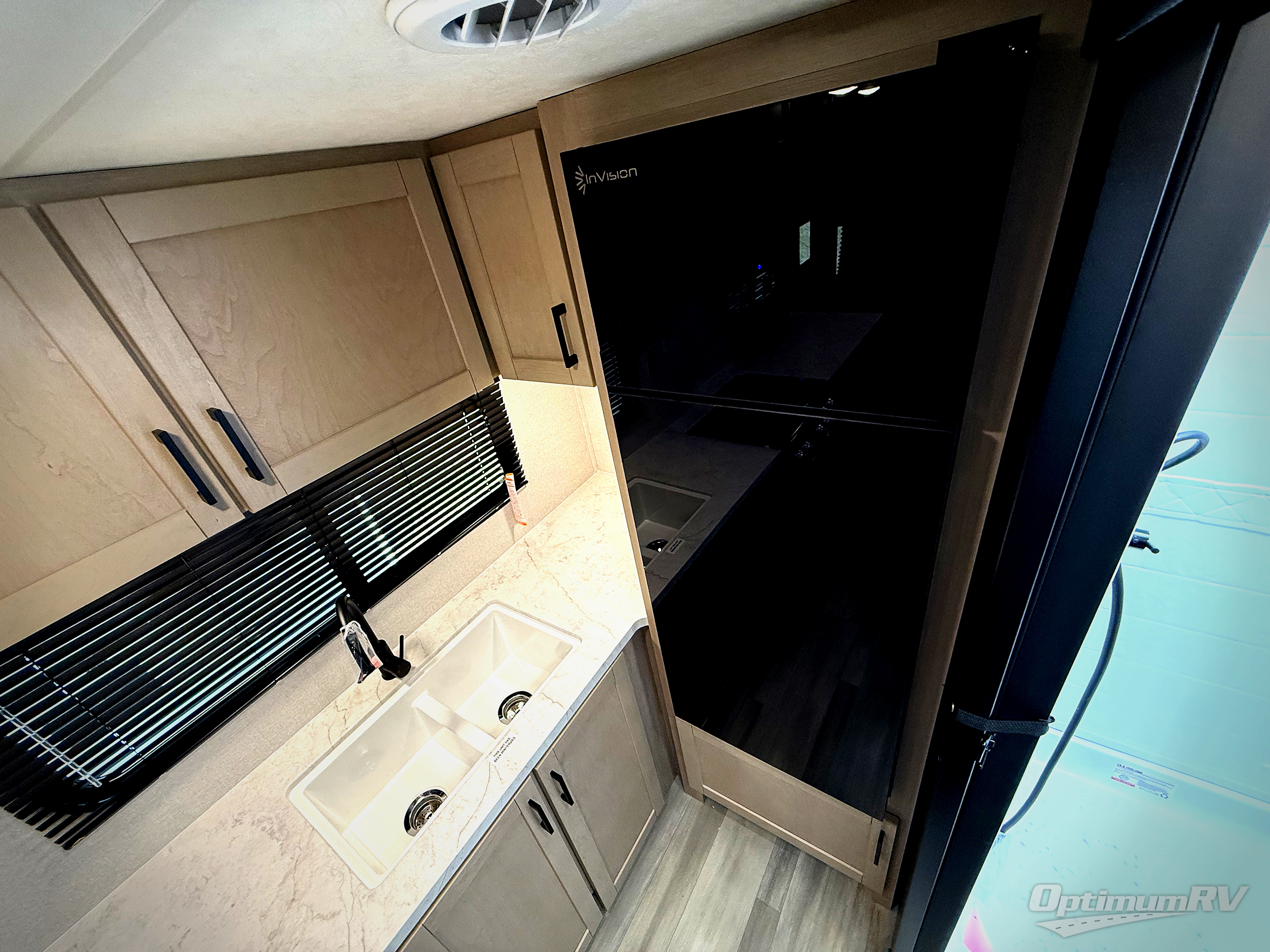 This is the perfect couple's trailer to take to the woods or lake! You can wake up each morning on the front queen bed, which also includes dual bedside wardrobes and overhead storage for your things. The rear corner kitchen includes a three-burner cooktop and microwave oven to make breakfast, and you can relax on the theater seating slide with cup holders and your coffee. And the full bath with a foot-flush toilet, sink, and 30" x 36" shower will let you clean up daily!