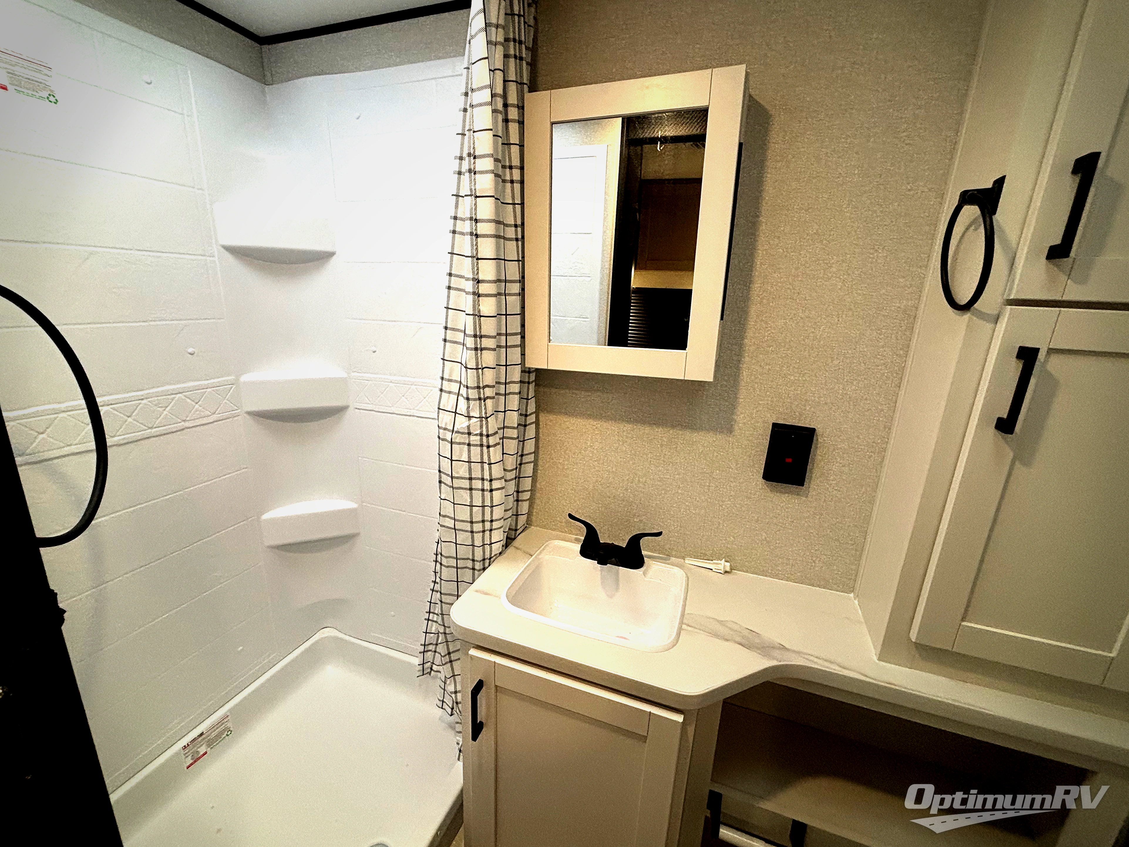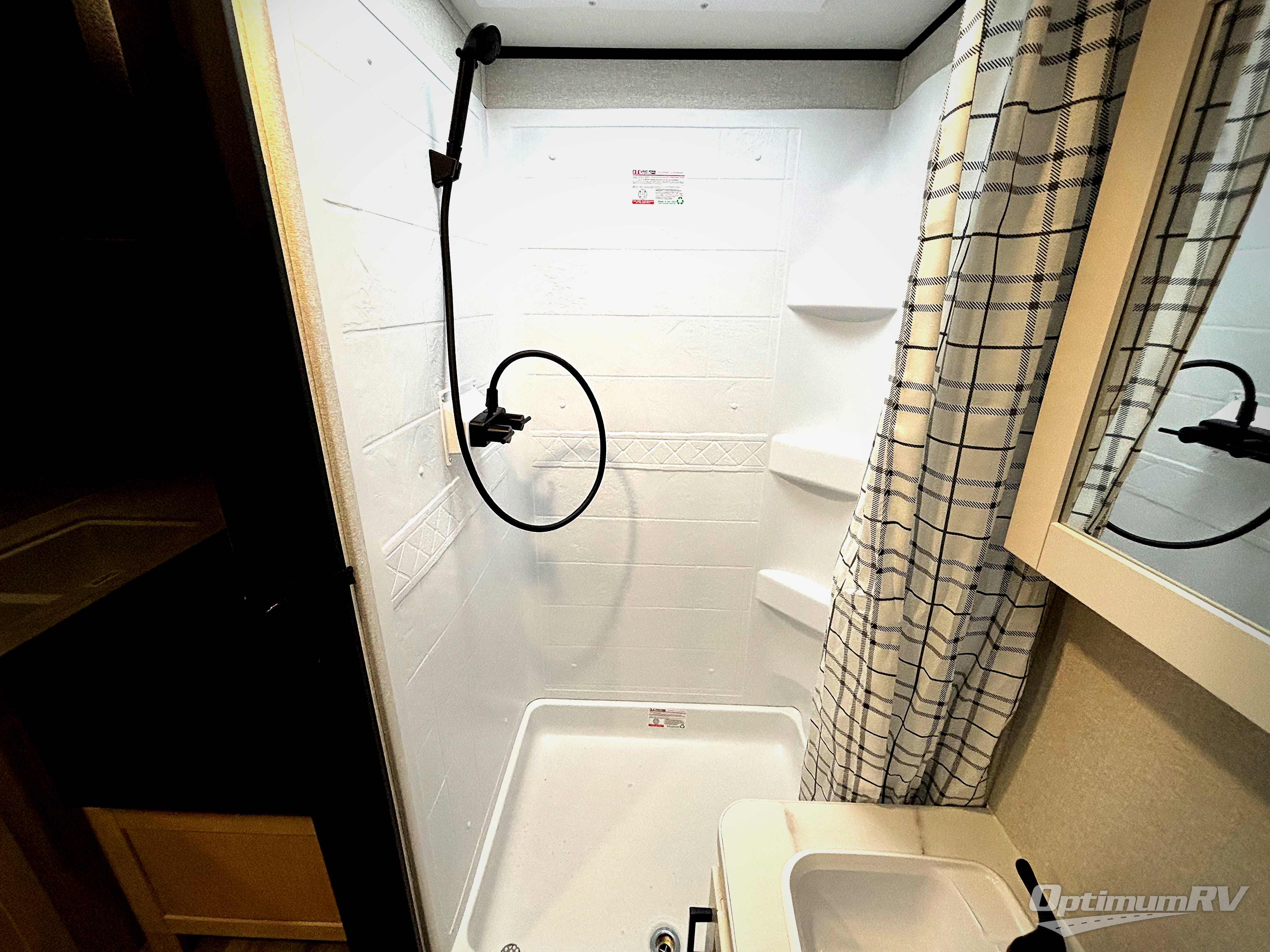 This is the perfect couple's trailer to take to the woods or lake! You can wake up each morning on the front queen bed, which also includes dual bedside wardrobes and overhead storage for your things. The rear corner kitchen includes a three-burner cooktop and microwave oven to make breakfast, and you can relax on the theater seating slide with cup holders and your coffee. And the full bath with a foot-flush toilet, sink, and 30" x 36" shower will let you clean up daily!