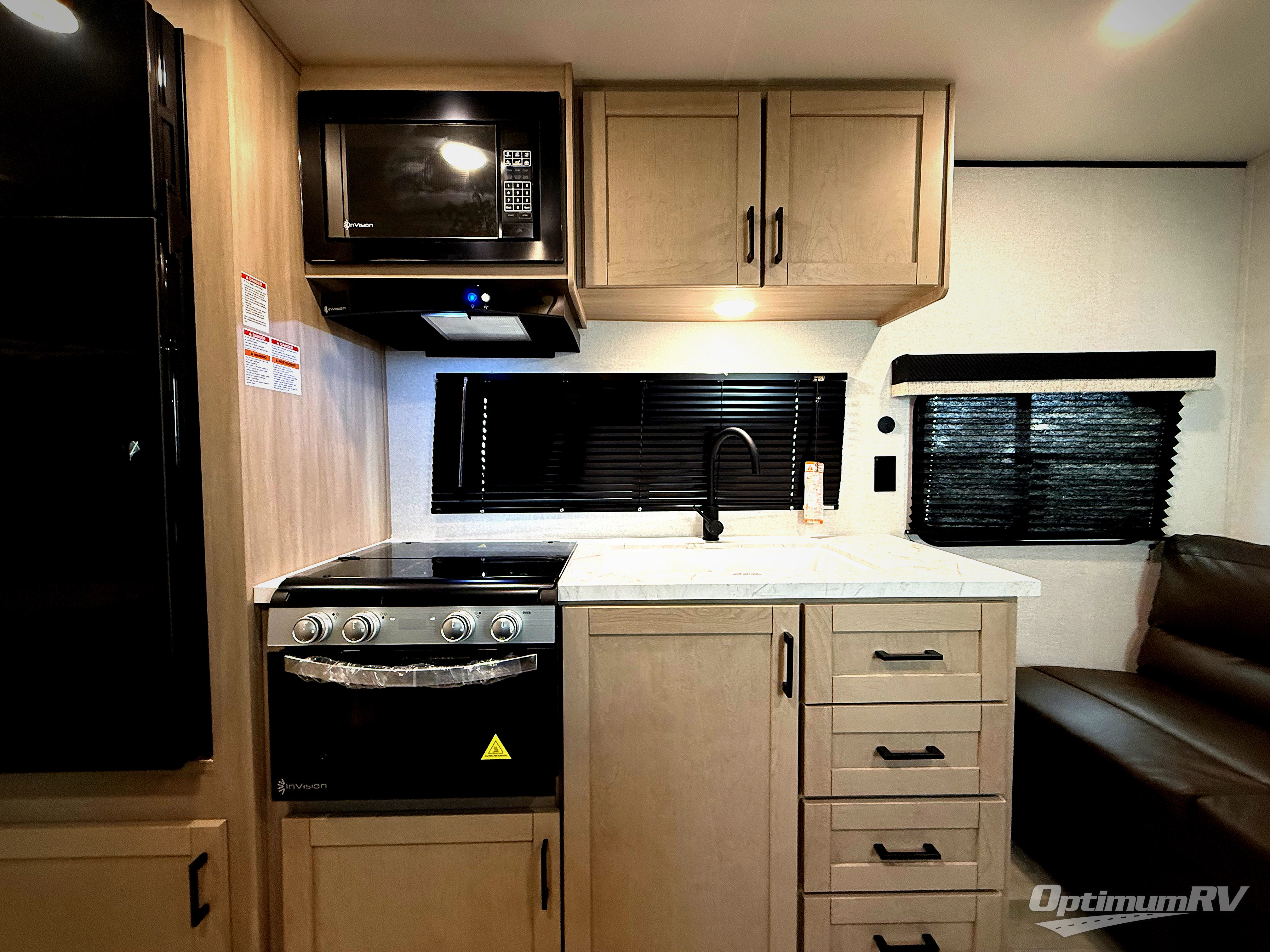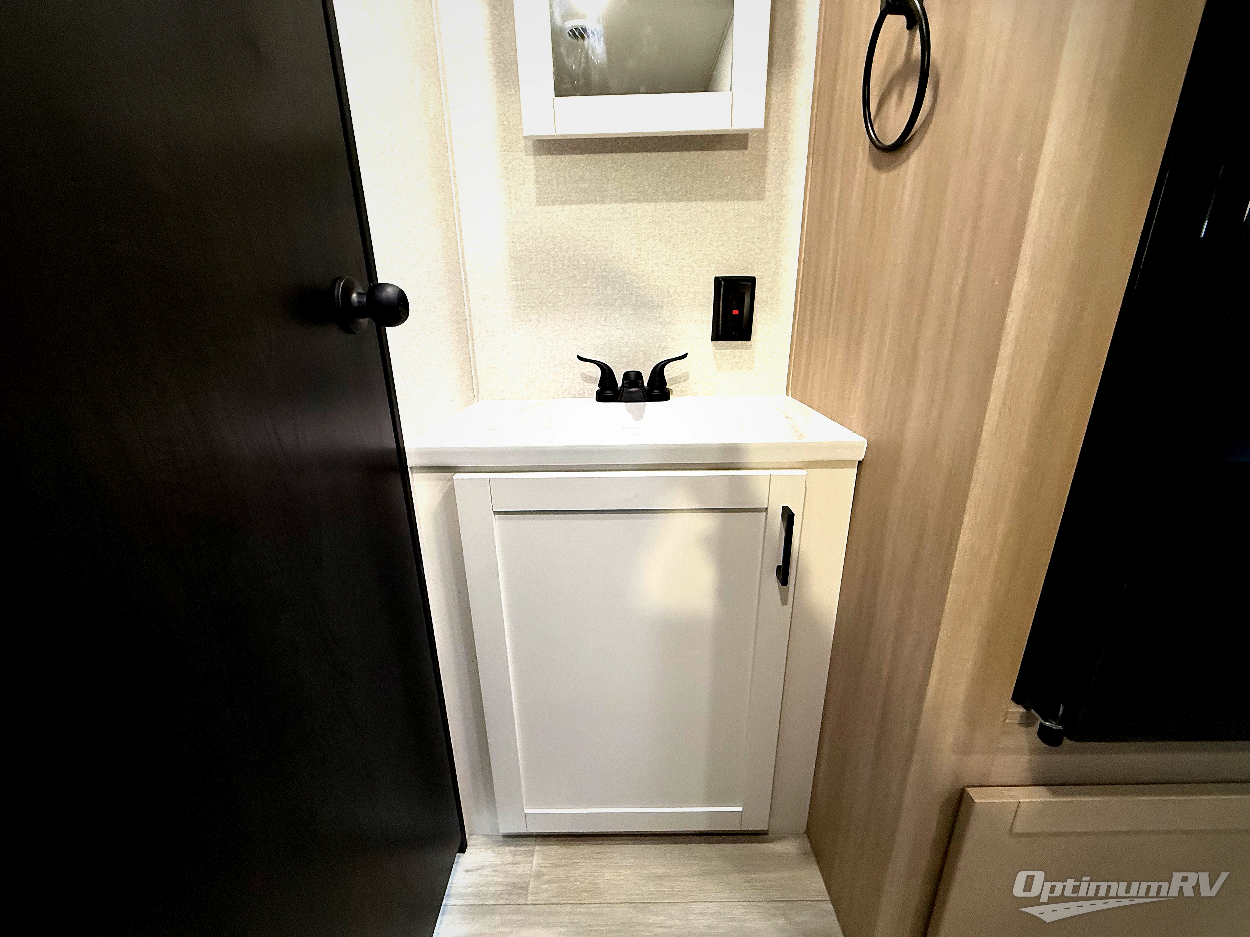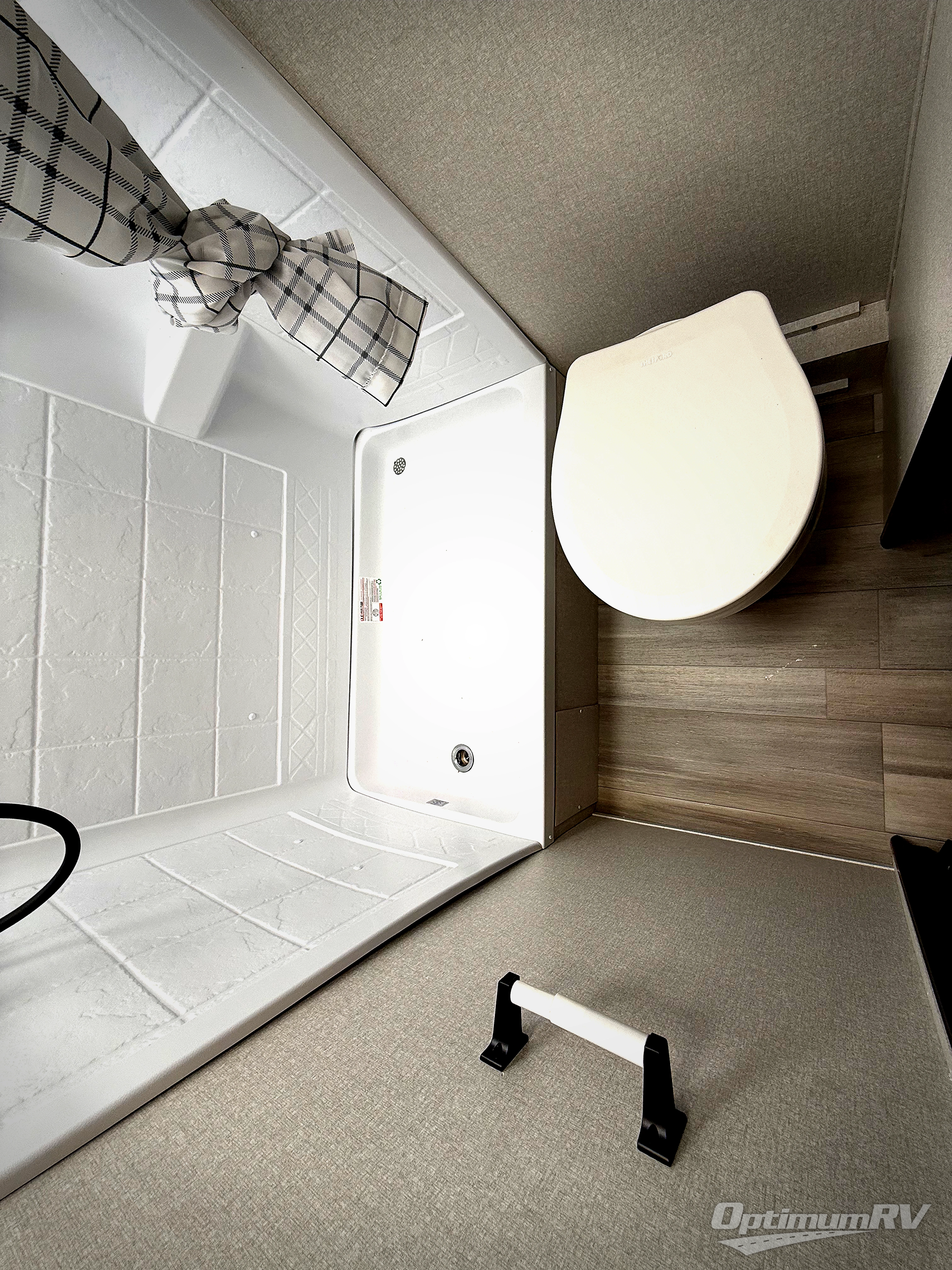 Camping trips are made easy in this spacious travel trailer with double-size bunk beds for guests or little ones. You'll find a front walk-around queen bed for a great night's rest, along with dual bedside wardrobes to keep your things tidy and a privacy curtain. The rear corner private bath includes a foot-flush toilet and a 24" x 40" shower, so you won't have to leave the camper in the middle of the night. A three-burner cooktop and microwave oven will let you make meals each day, and you'll find seating spaces at the booth dinette or on the sofa!