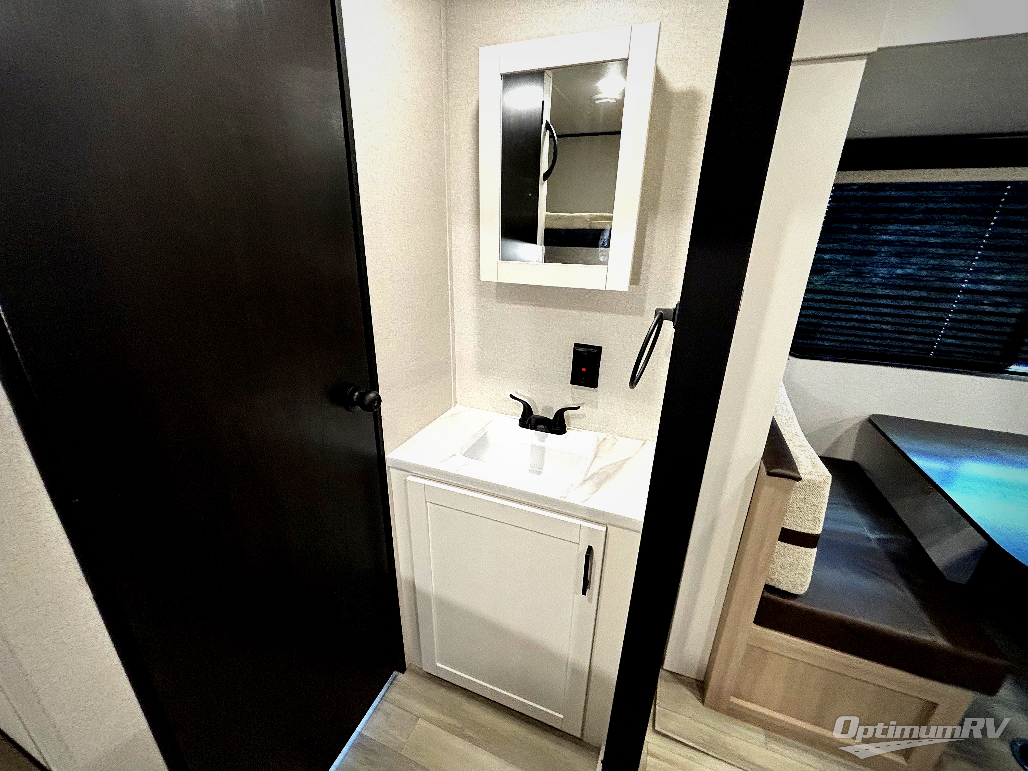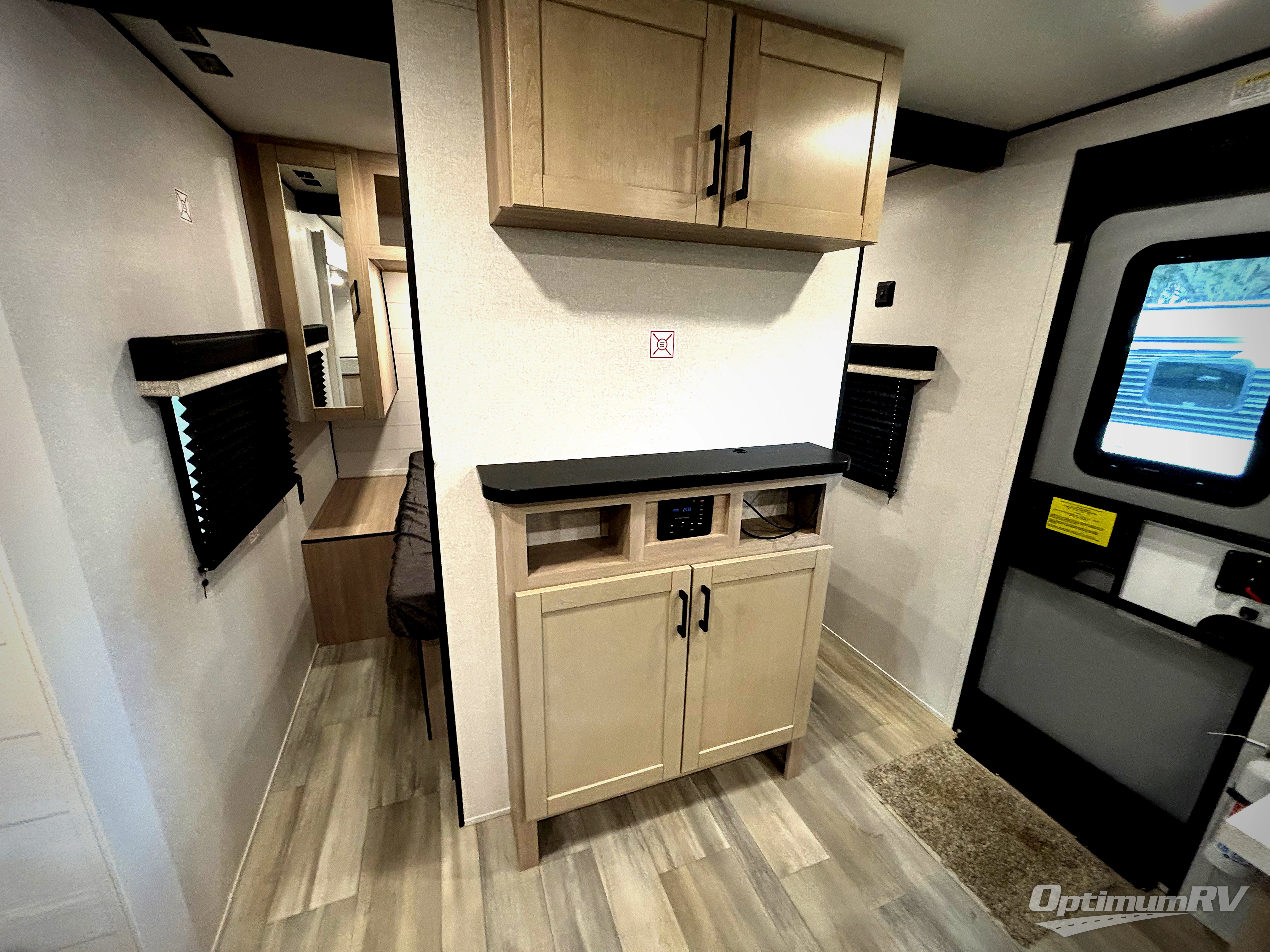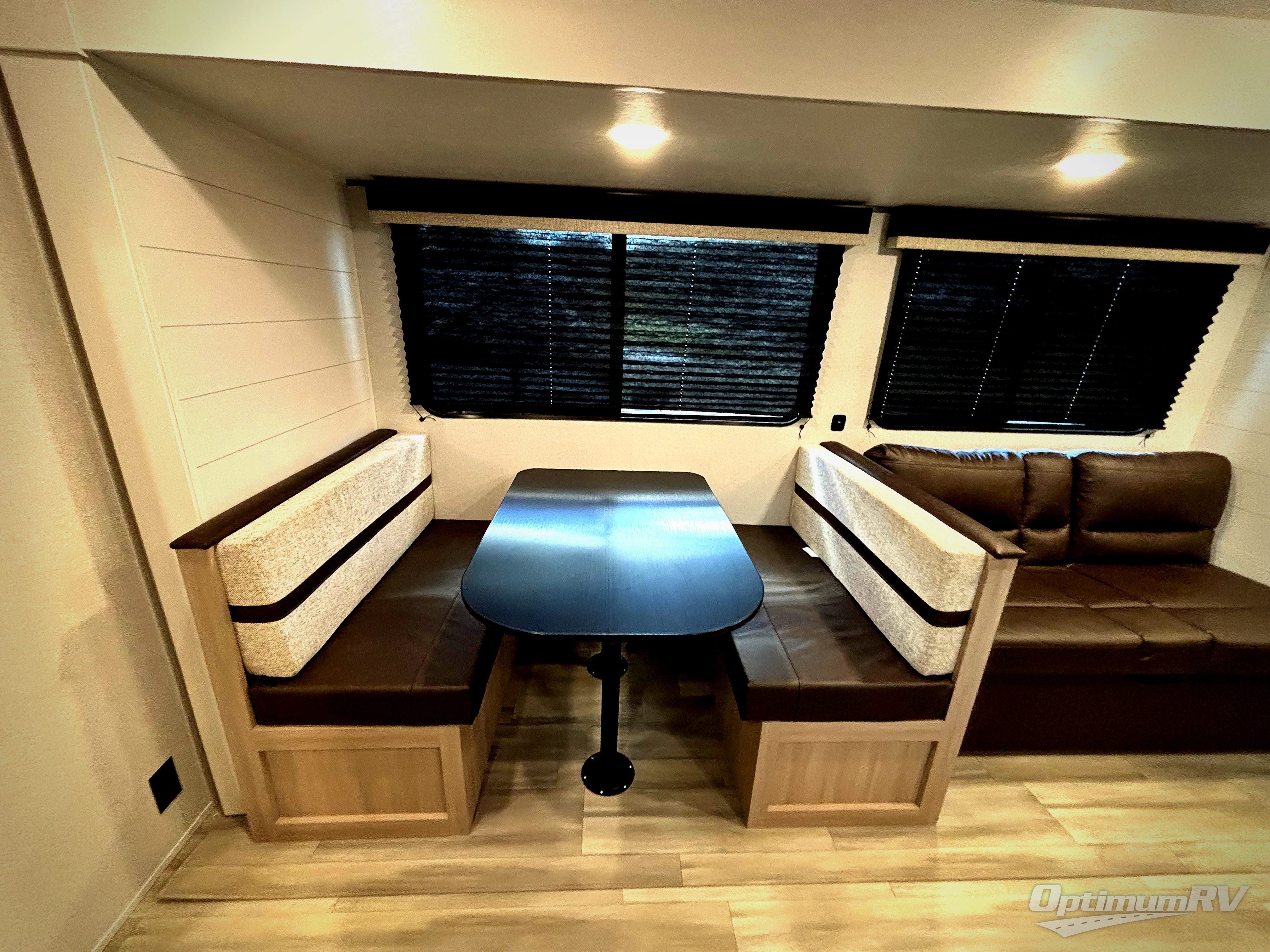 The whole gang will love weekends in the woods with this travel trailer in tow! There is a large slide out for added space, and here you'll find the jack-knife sofa and booth dinette. You can claim the front private bedroom to yourselves, while your guests or little ones take the double-size bunks. A full kitchen is complete with a three-burner cooktop and microwave oven to make meals each day, plus a 12V refrigerator and pantry for food storage. This unit also includes an outdoor kitchen with a refrigerator to keep cold drinks ready to enjoy!