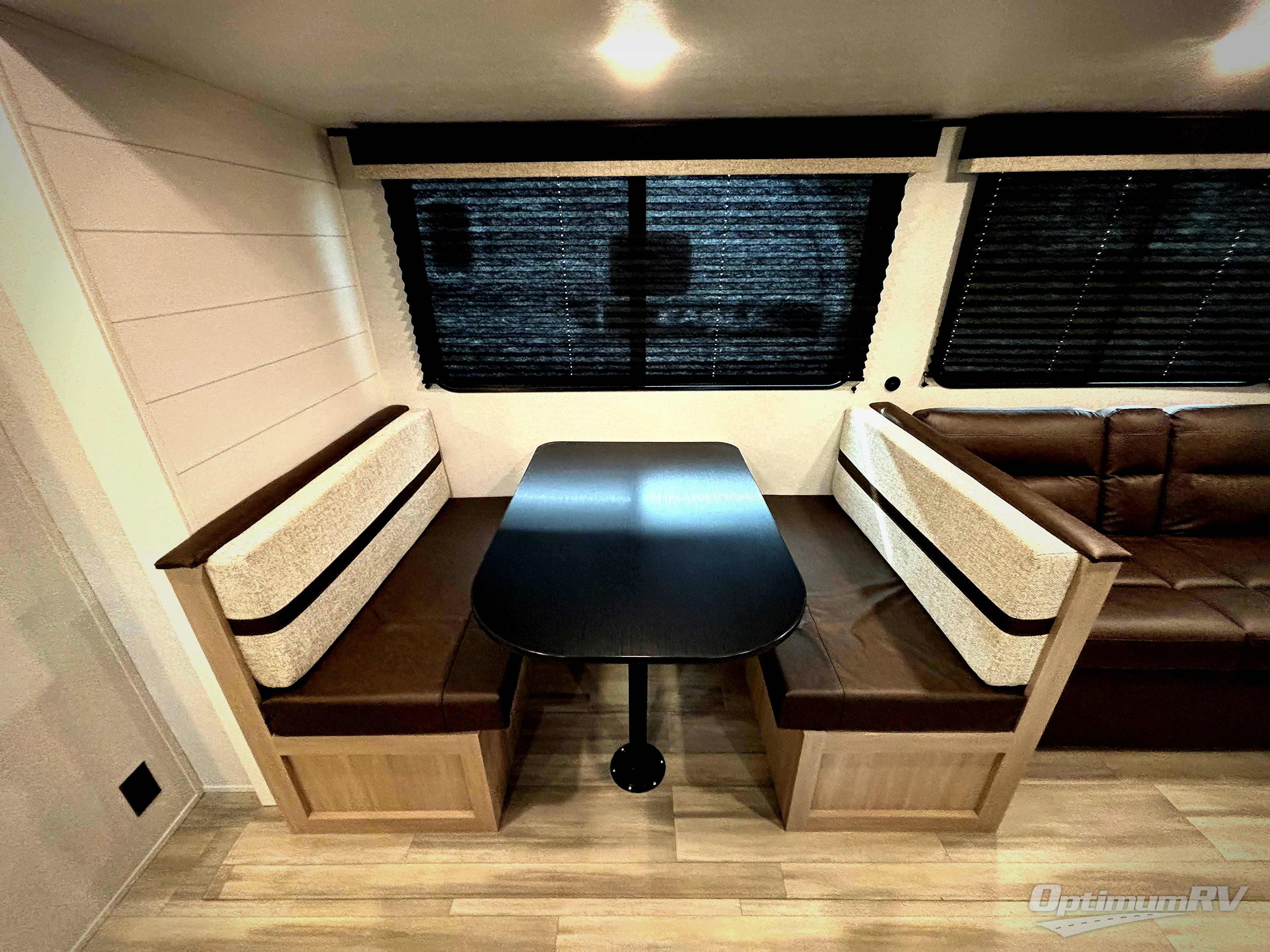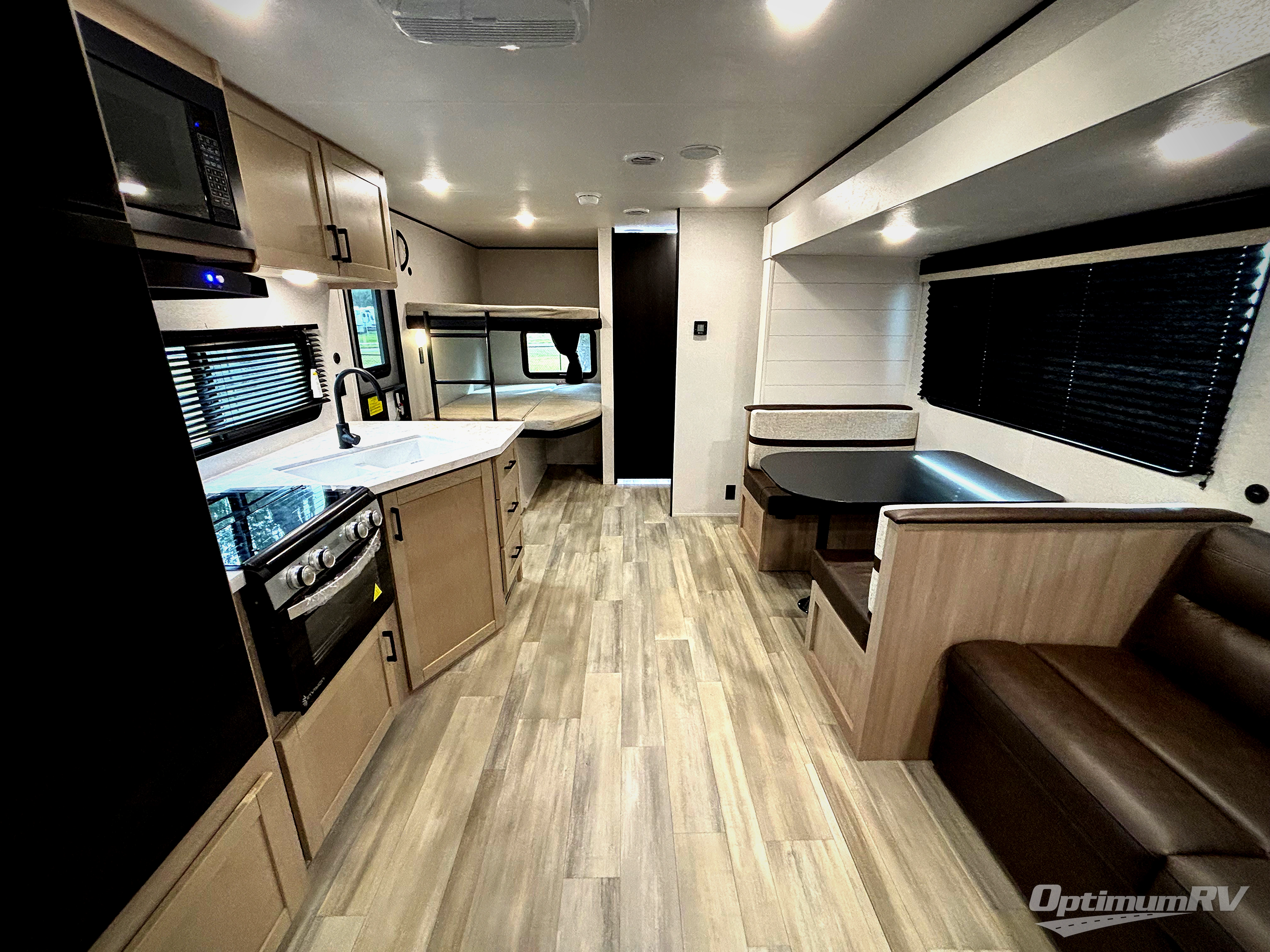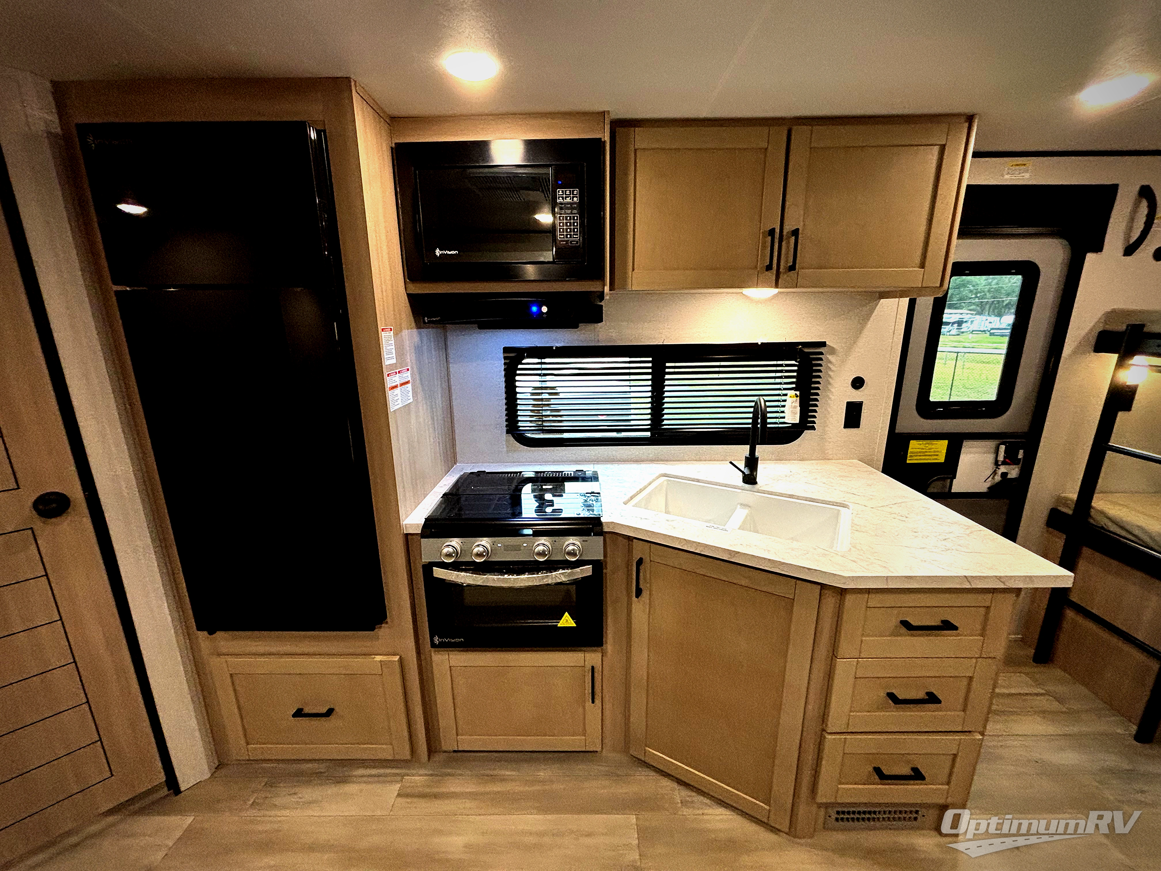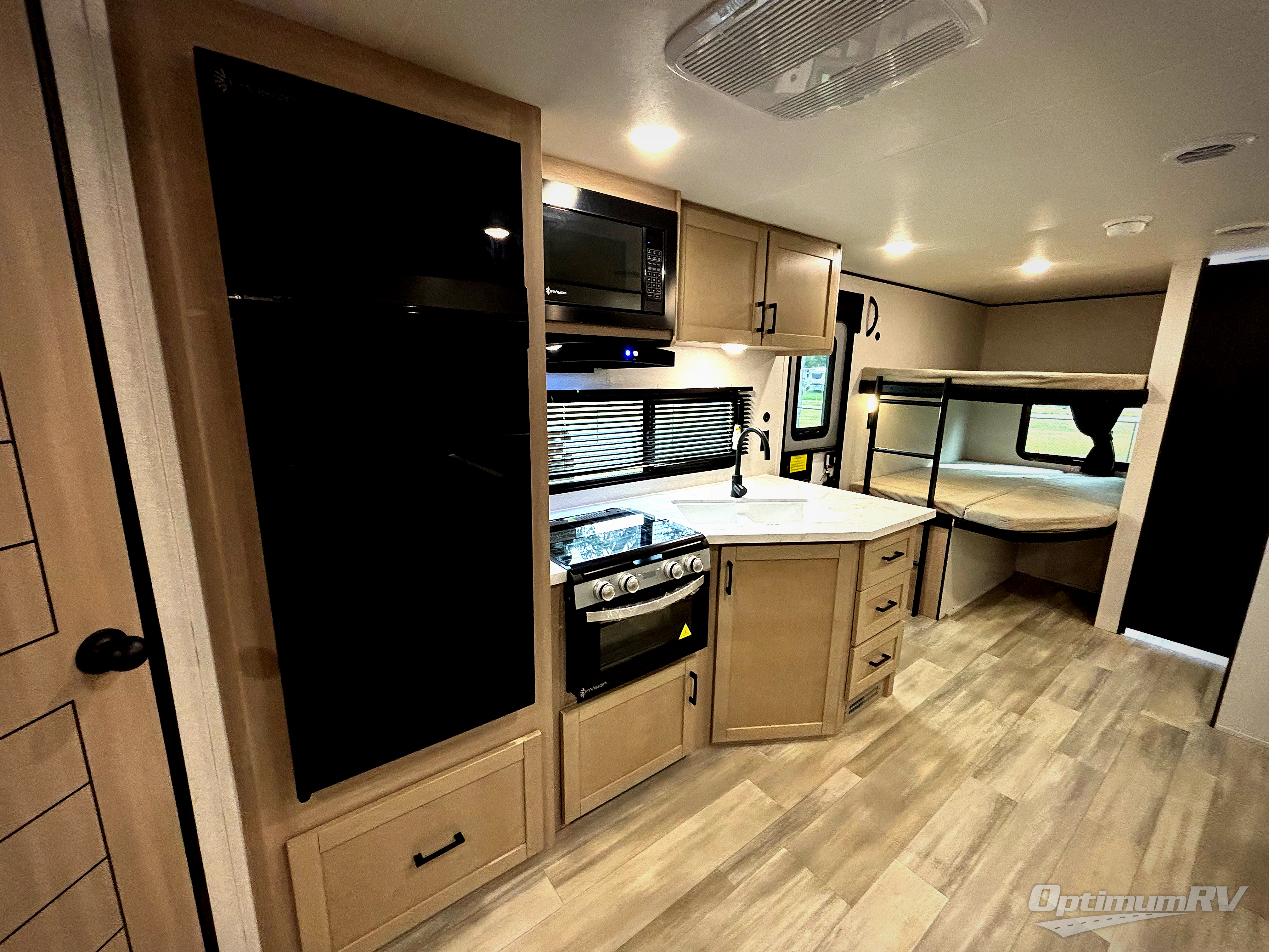The whole gang will love weekends in the woods with this travel trailer in tow! There is a large slide out for added space, and here you'll find the jack-knife sofa and booth dinette. There is also an entertainment center with a fireplace with a hidden pantry behind, along with storage shelves for snacks, board games and more! You can claim the front private bedroom to yourselves, while your guests or little ones take the double-size bunks. A full kitchen is complete with a three-burner cooktop and microwave oven to make meals each day, plus a 12V refrigerator and pantry for food storage. This unit also includes an outdoor kitchen with a refrigerator to keep cold drinks ready to enjoy!