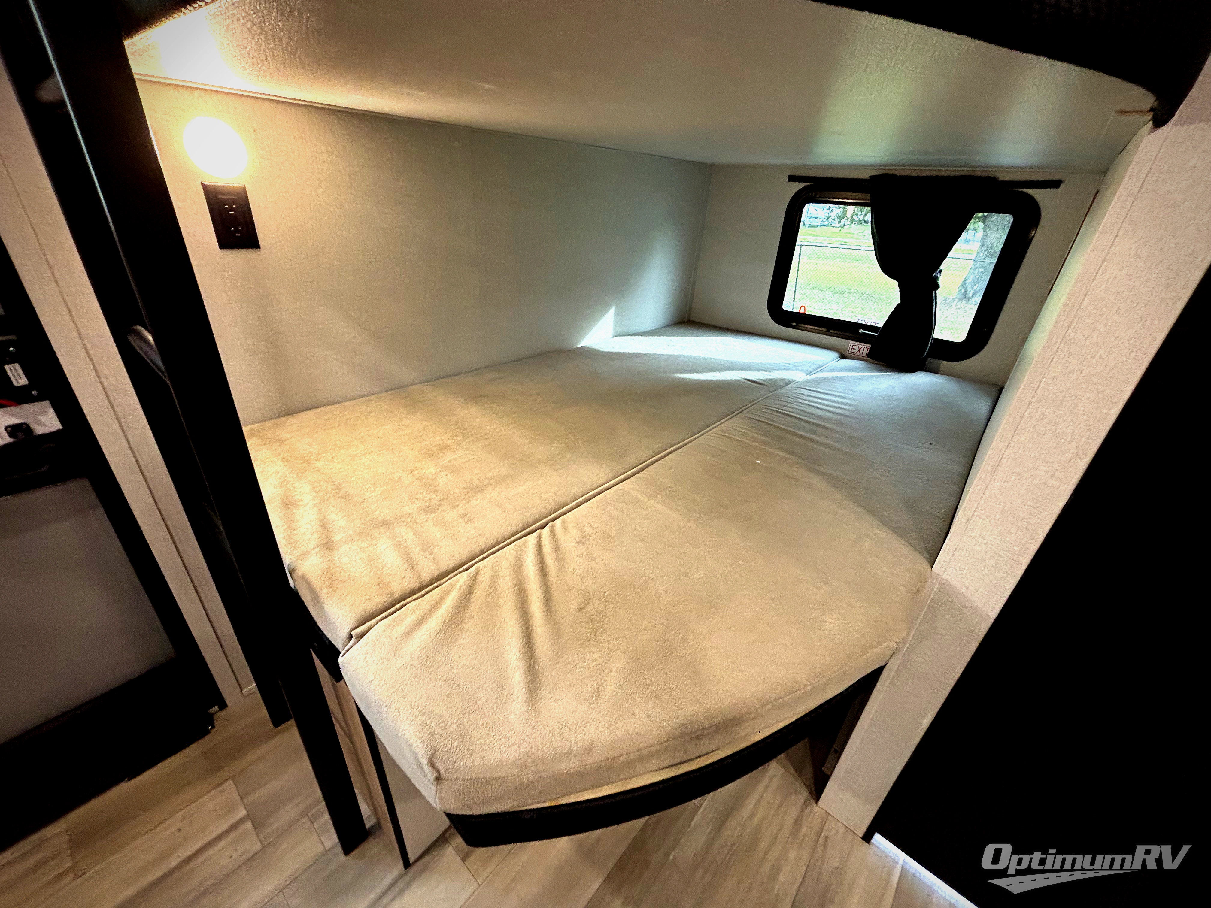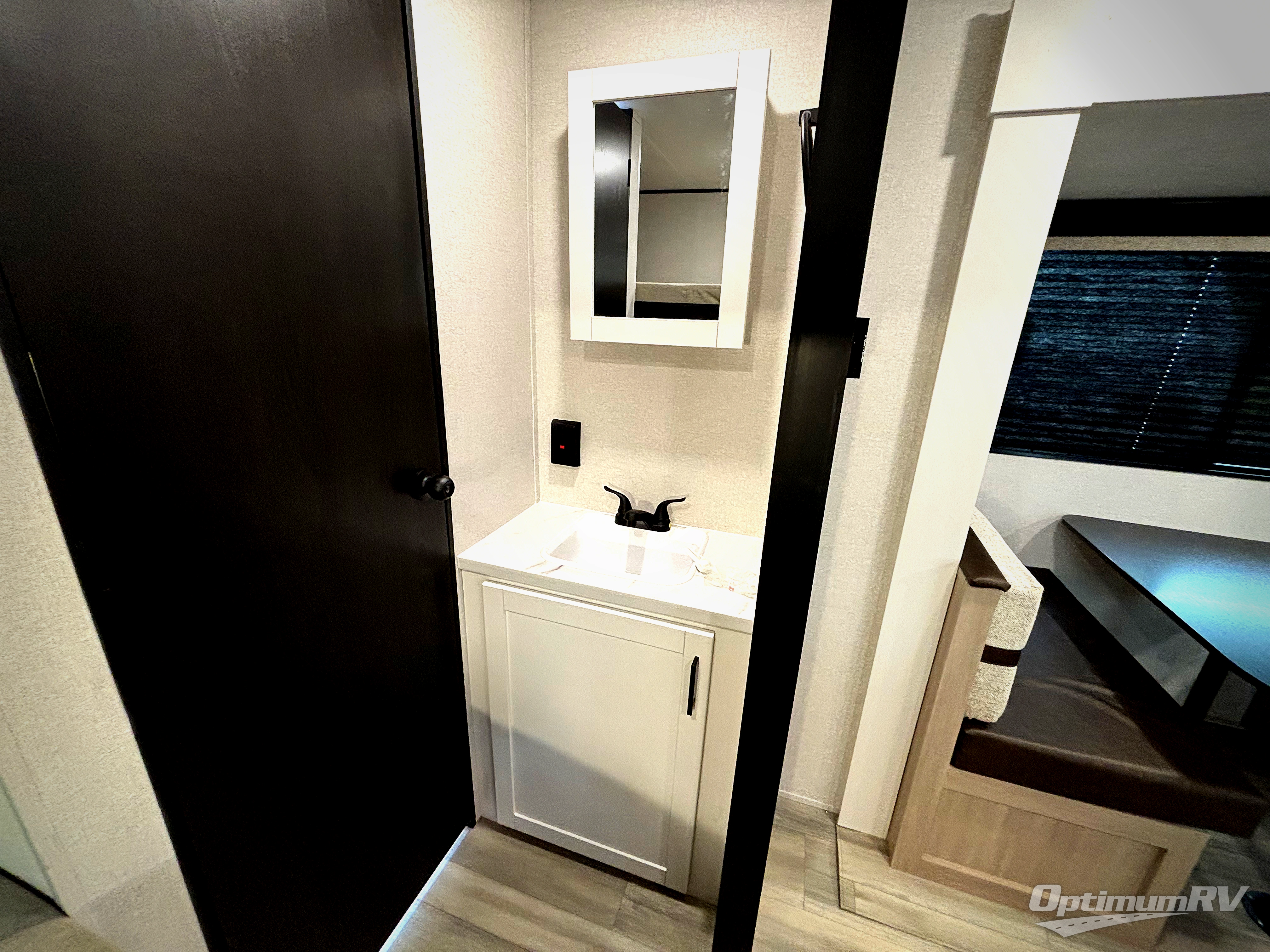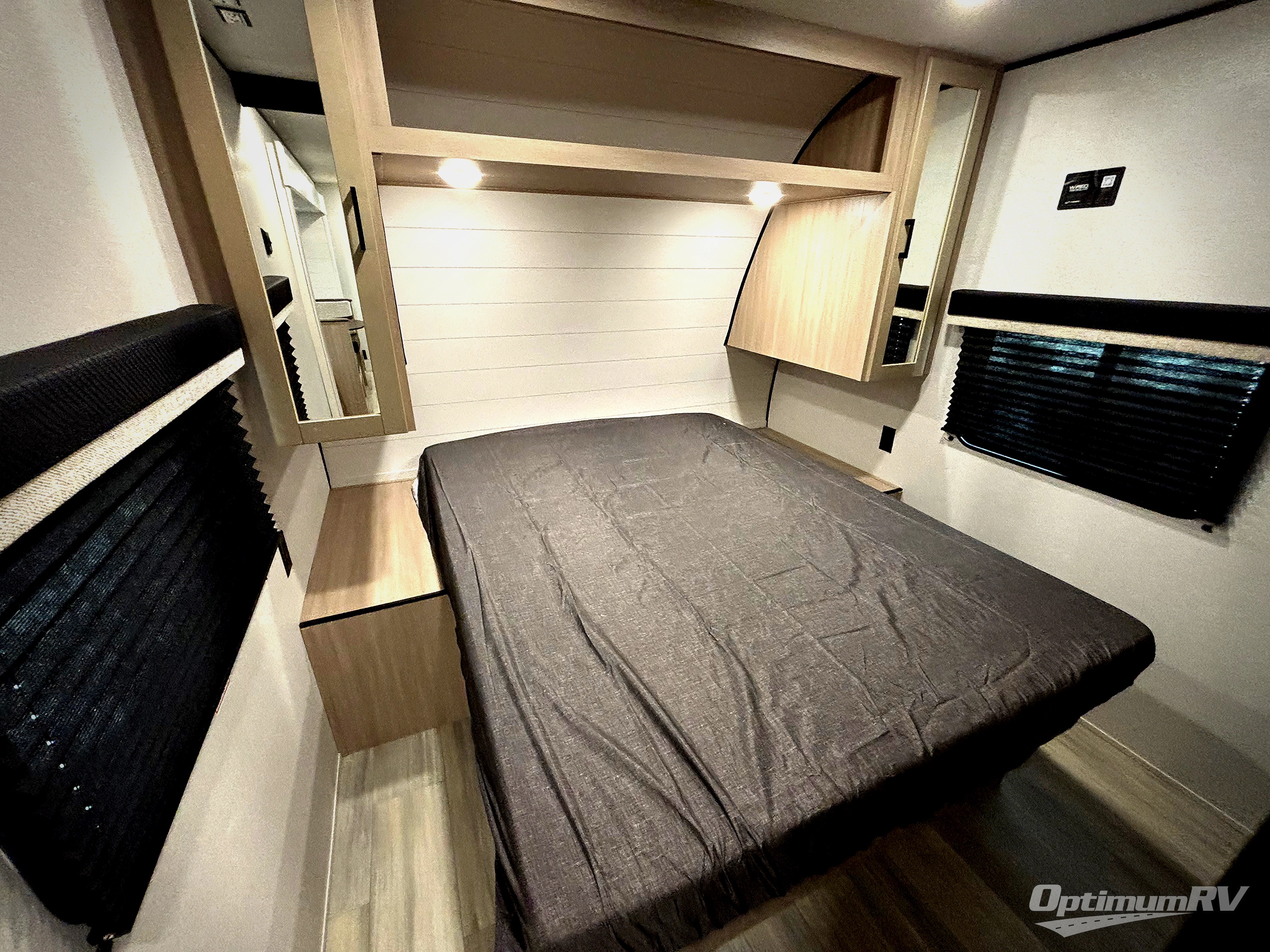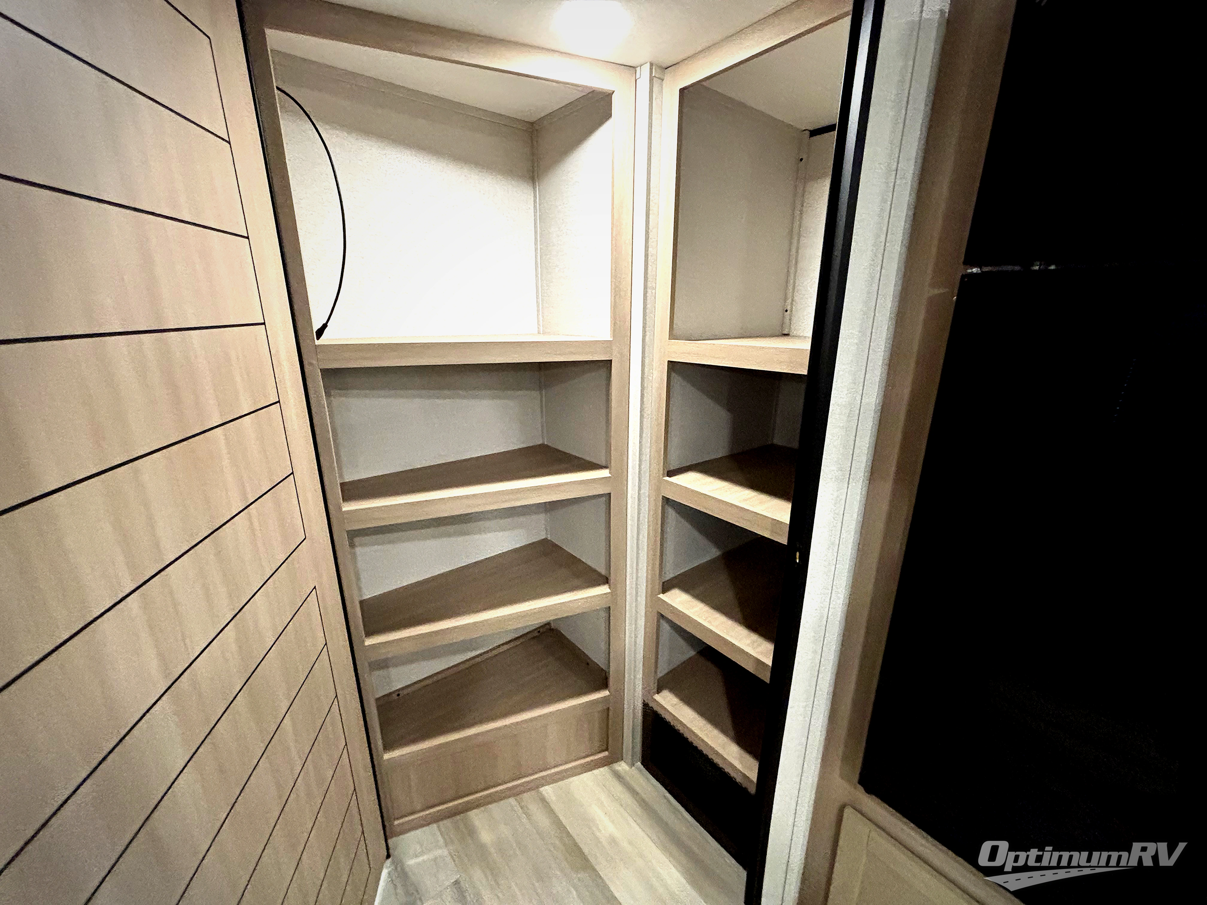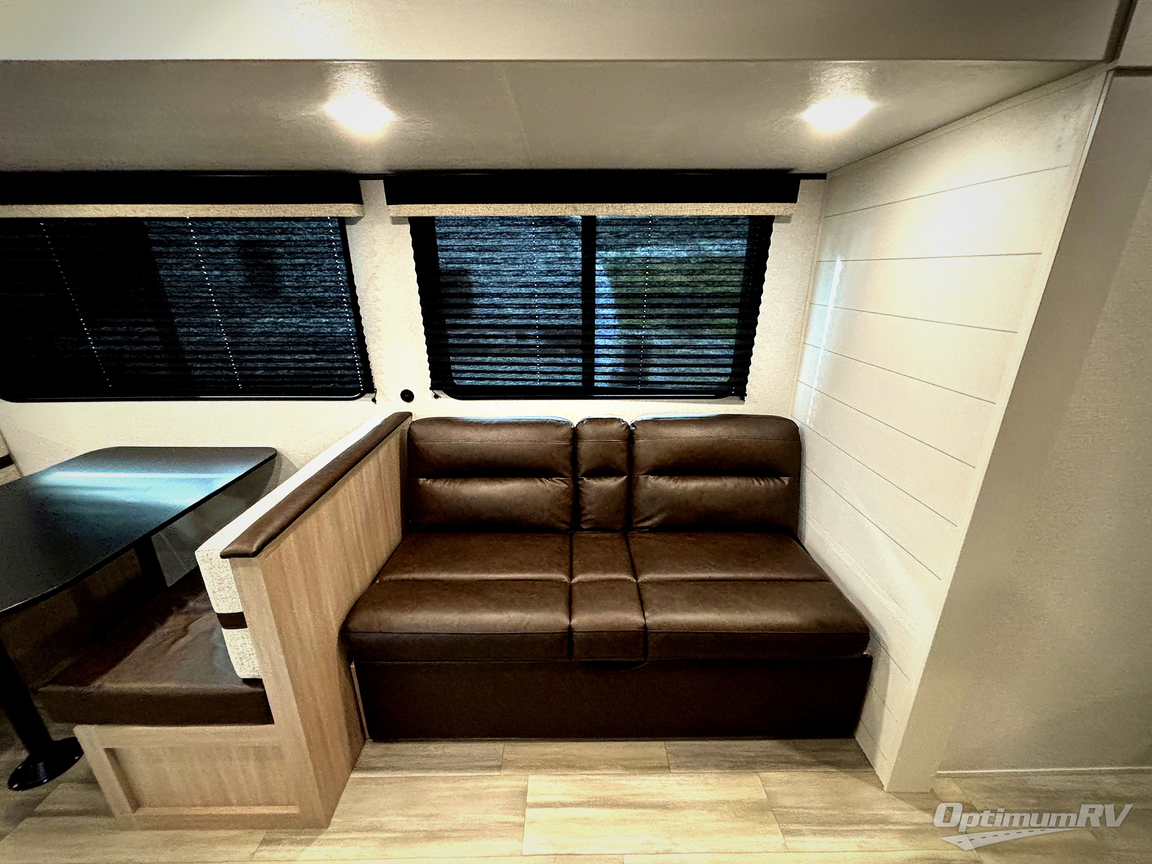 The whole gang will love weekends in the woods with this travel trailer in tow! There is a large slide out for added space, and here you'll find the jack-knife sofa and booth dinette. There is also an entertainment center with a fireplace with a hidden pantry behind, along with storage shelves for snacks, board games and more! You can claim the front private bedroom to yourselves, while your guests or little ones take the double-size bunks. A full kitchen is complete with a three-burner cooktop and microwave oven to make meals each day, plus a 12V refrigerator and pantry for food storage. This unit also includes an outdoor kitchen with a refrigerator to keep cold drinks ready to enjoy!