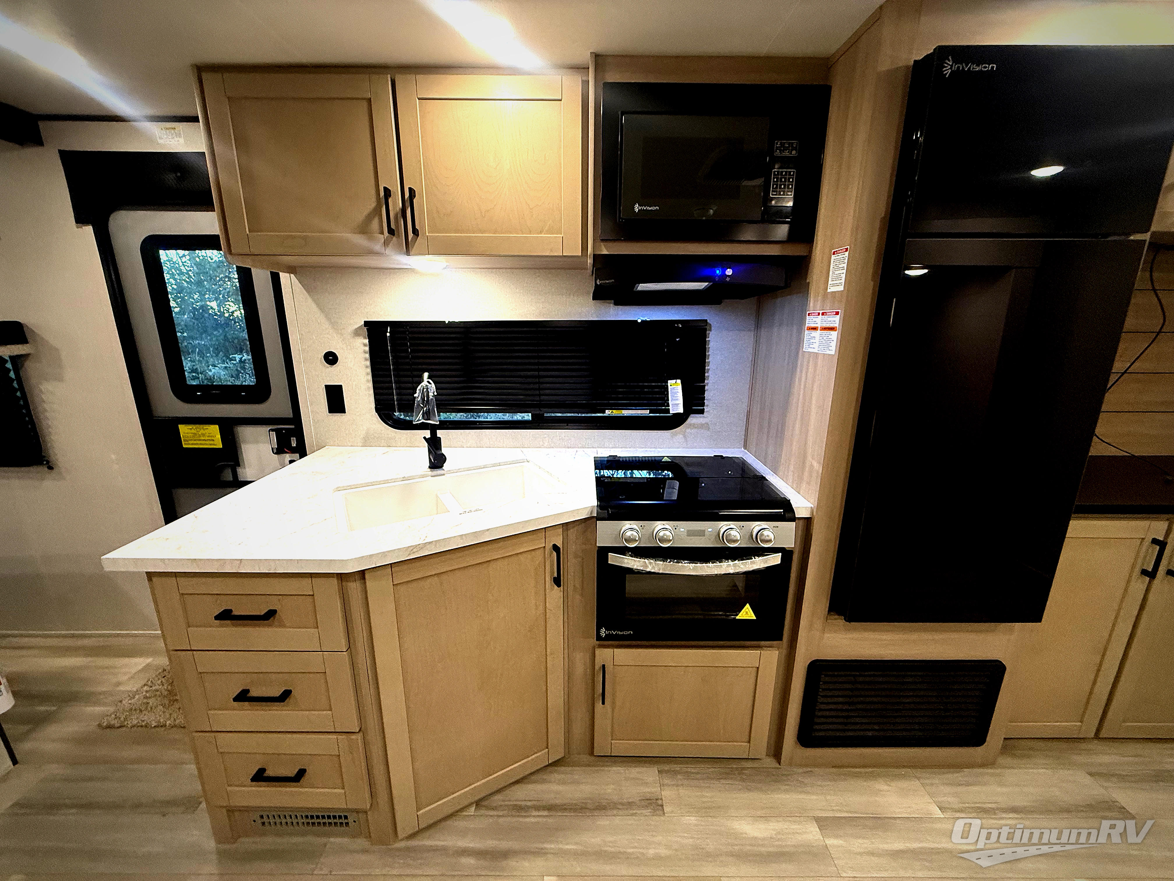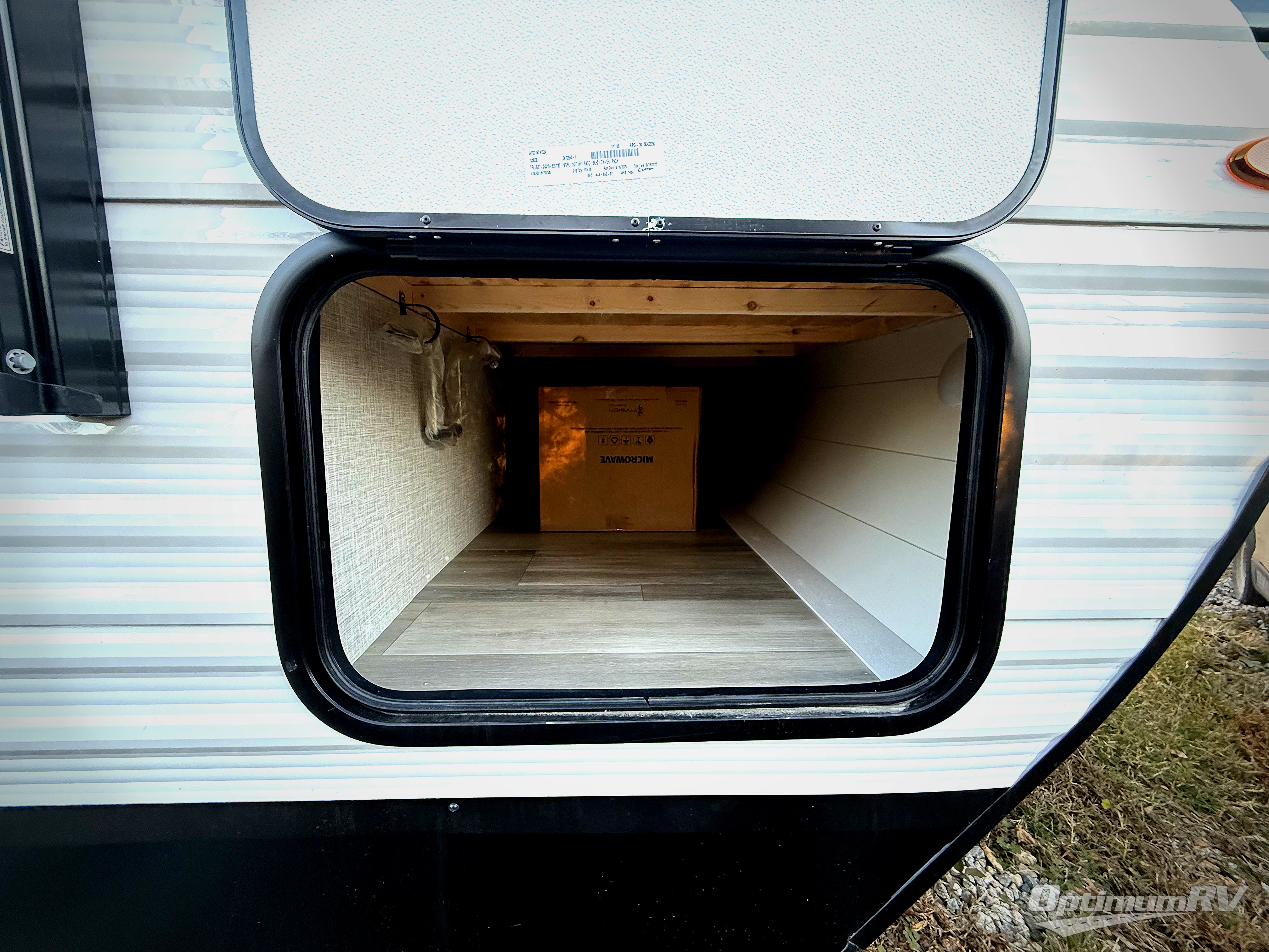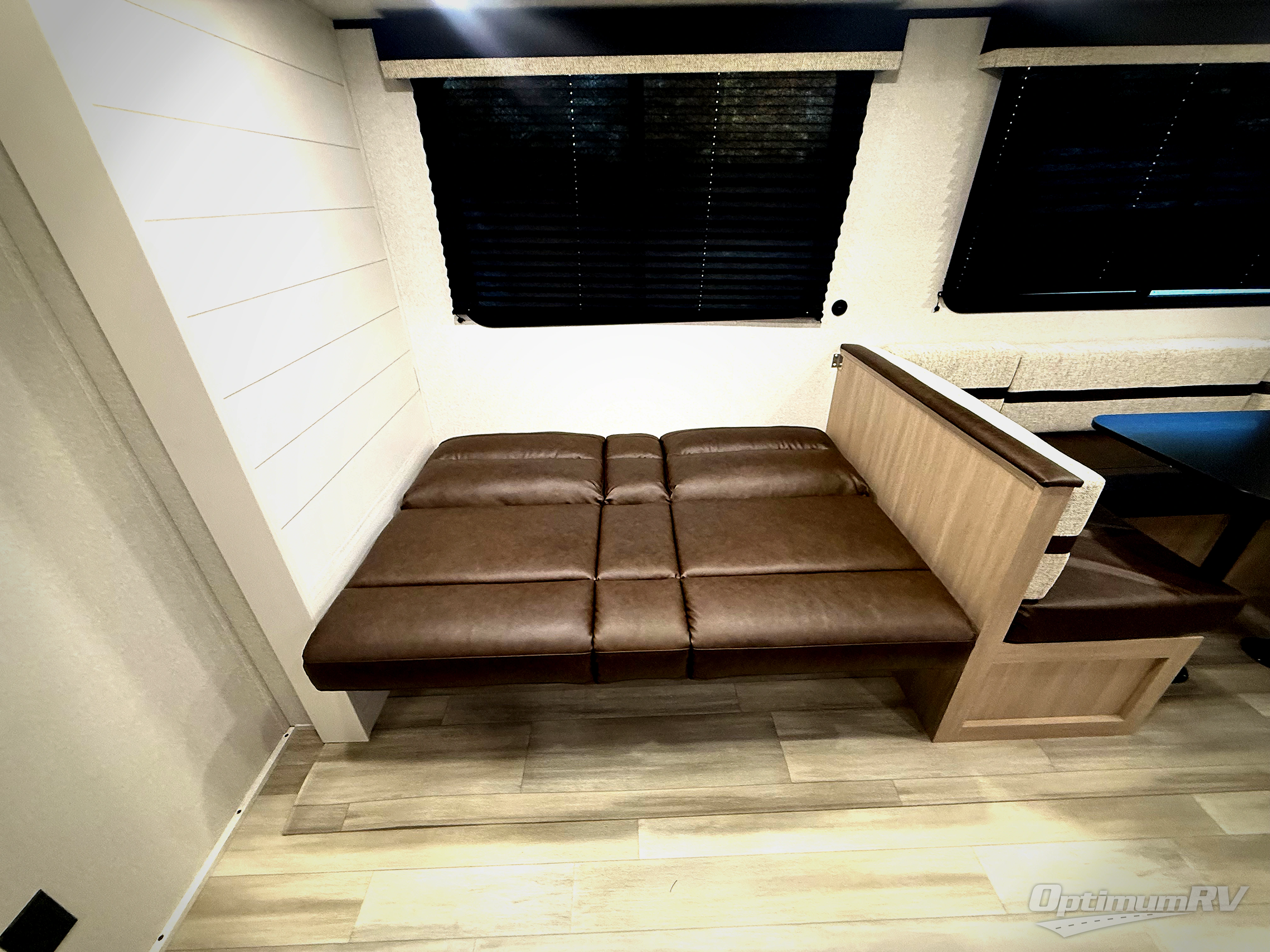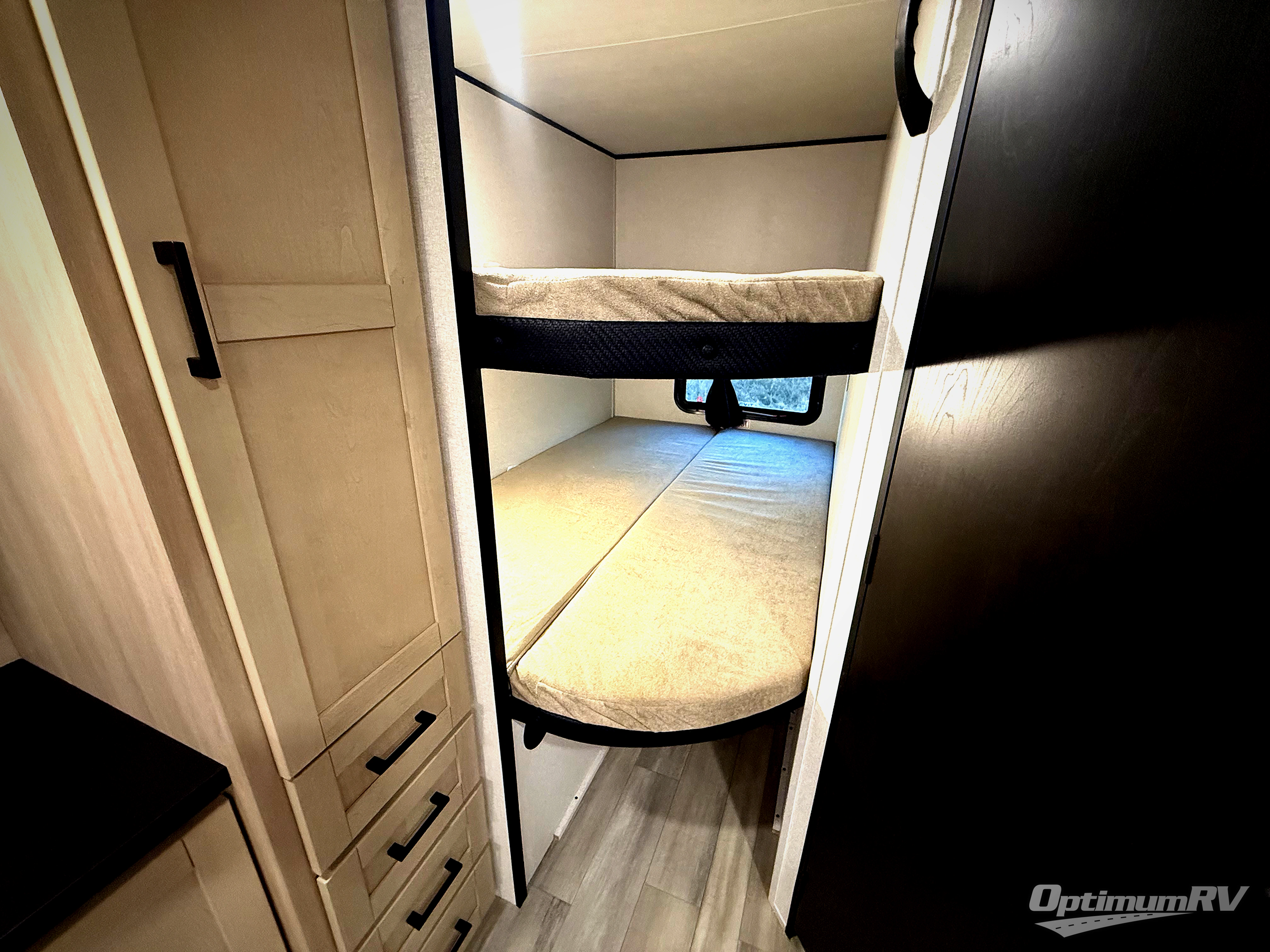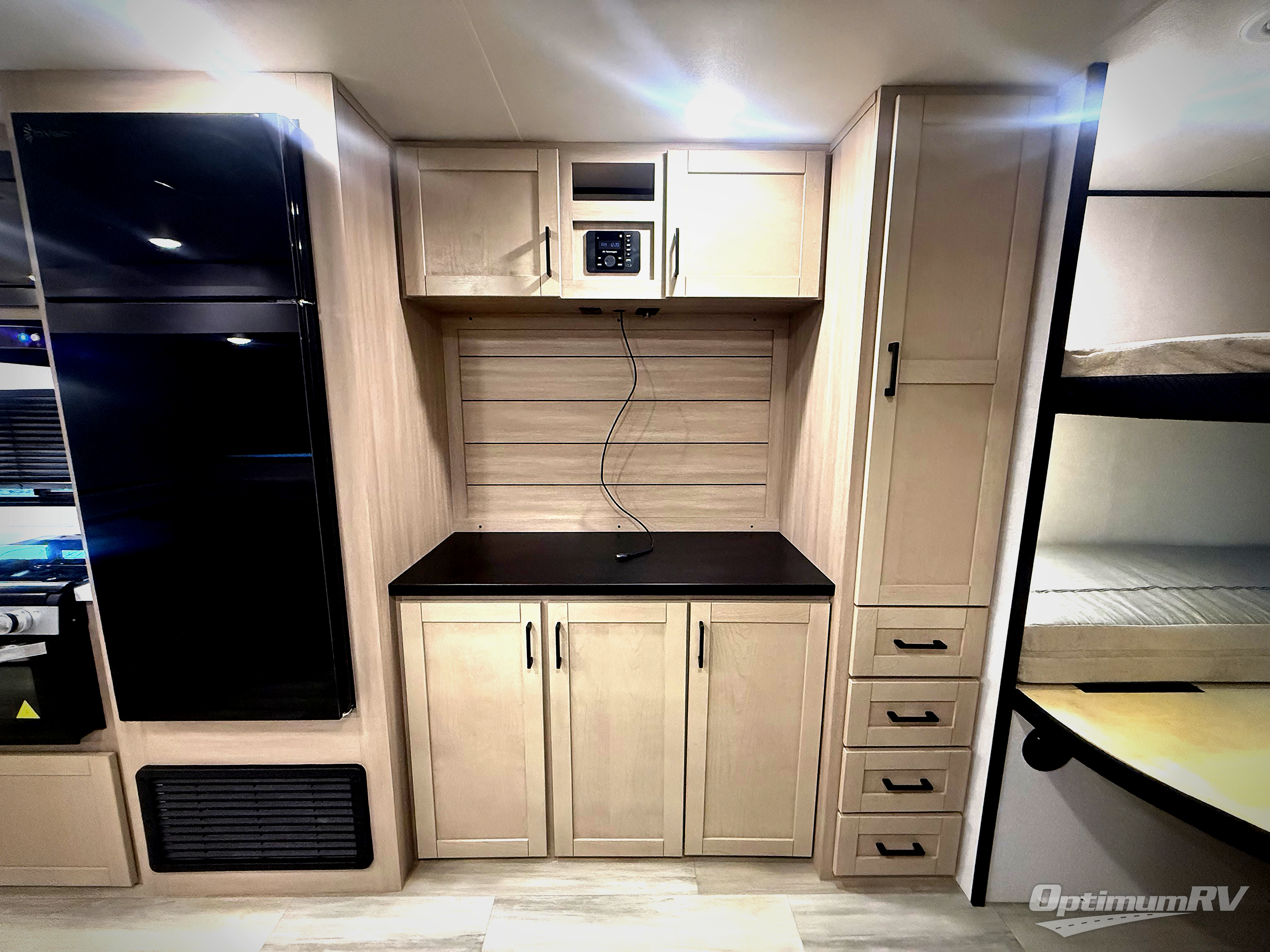 The whole gang will love weekends in the woods with this travel trailer in tow! There is a large slide out for added space, and here you'll find the jack-knife sofa and U-shaped dinette. There is also an entertainment center with a fireplace for cozy evenings indoors, and you'll appreciate the storage cabinet and shelves for board games, movies and more! You can claim the front private bedroom to yourselves, while your guests or little ones take the double-size bunks. A full kitchen is complete with a three-burner cooktop and microwave oven to make meals each day, plus a 12V refrigerator for food storage. This unit also includes an outdoor kitchen with a refrigerator to keep cold drinks ready to enjoy!