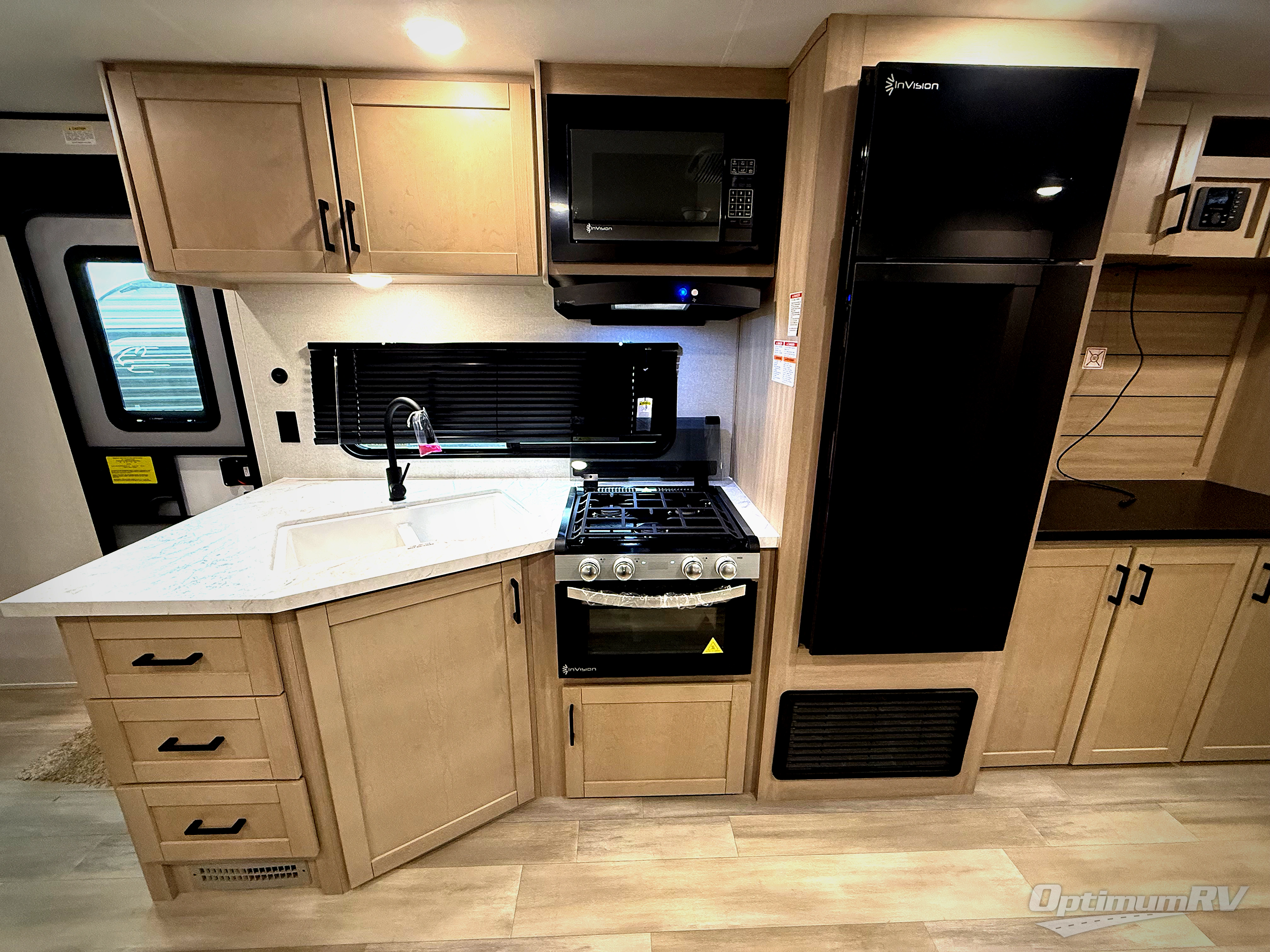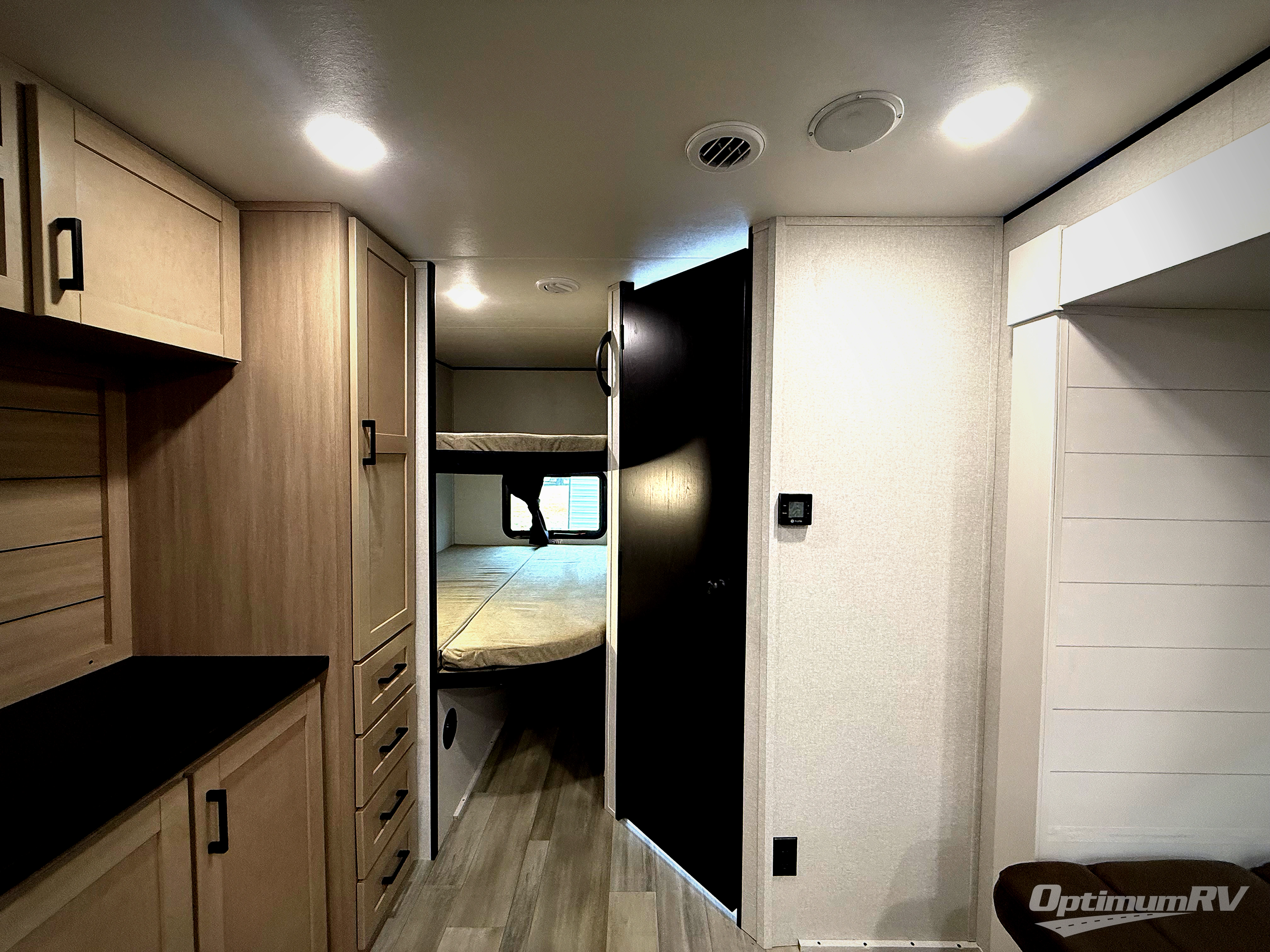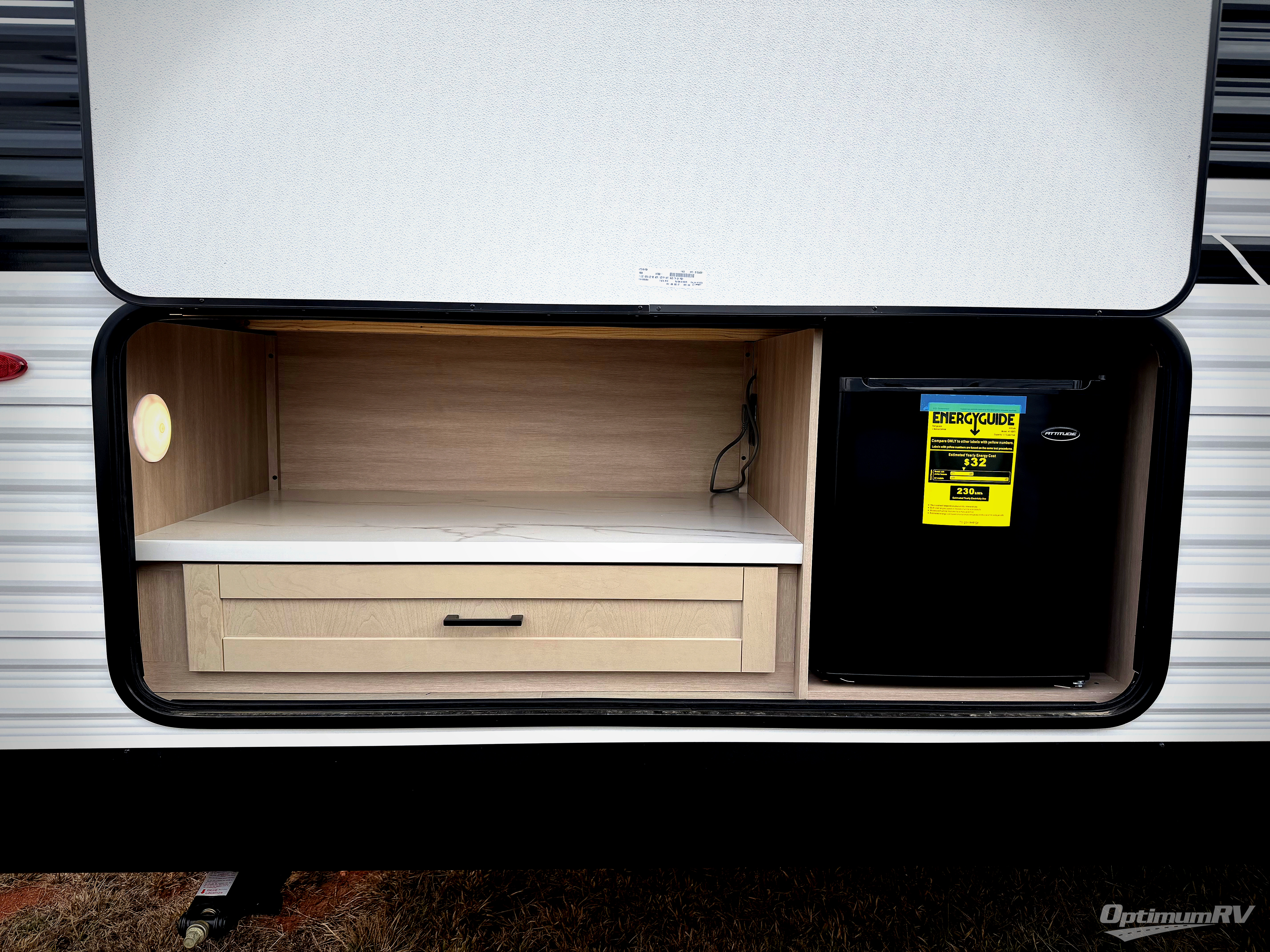 The whole gang will love weekends in the woods with this travel trailer in tow! There is a large slide out for added space, and here you'll find the jack-knife sofa and U-shaped dinette. There is also an entertainment center with a fireplace for cozy evenings indoors, and you'll appreciate the storage cabinet and shelves for board games, movies and more! You can claim the front private bedroom to yourselves, while your guests or little ones take the double-size bunks. A full kitchen is complete with a three-burner cooktop and microwave oven to make meals each day, plus a 12V refrigerator for food storage. This unit also includes an outdoor kitchen with a refrigerator to keep cold drinks ready to enjoy!