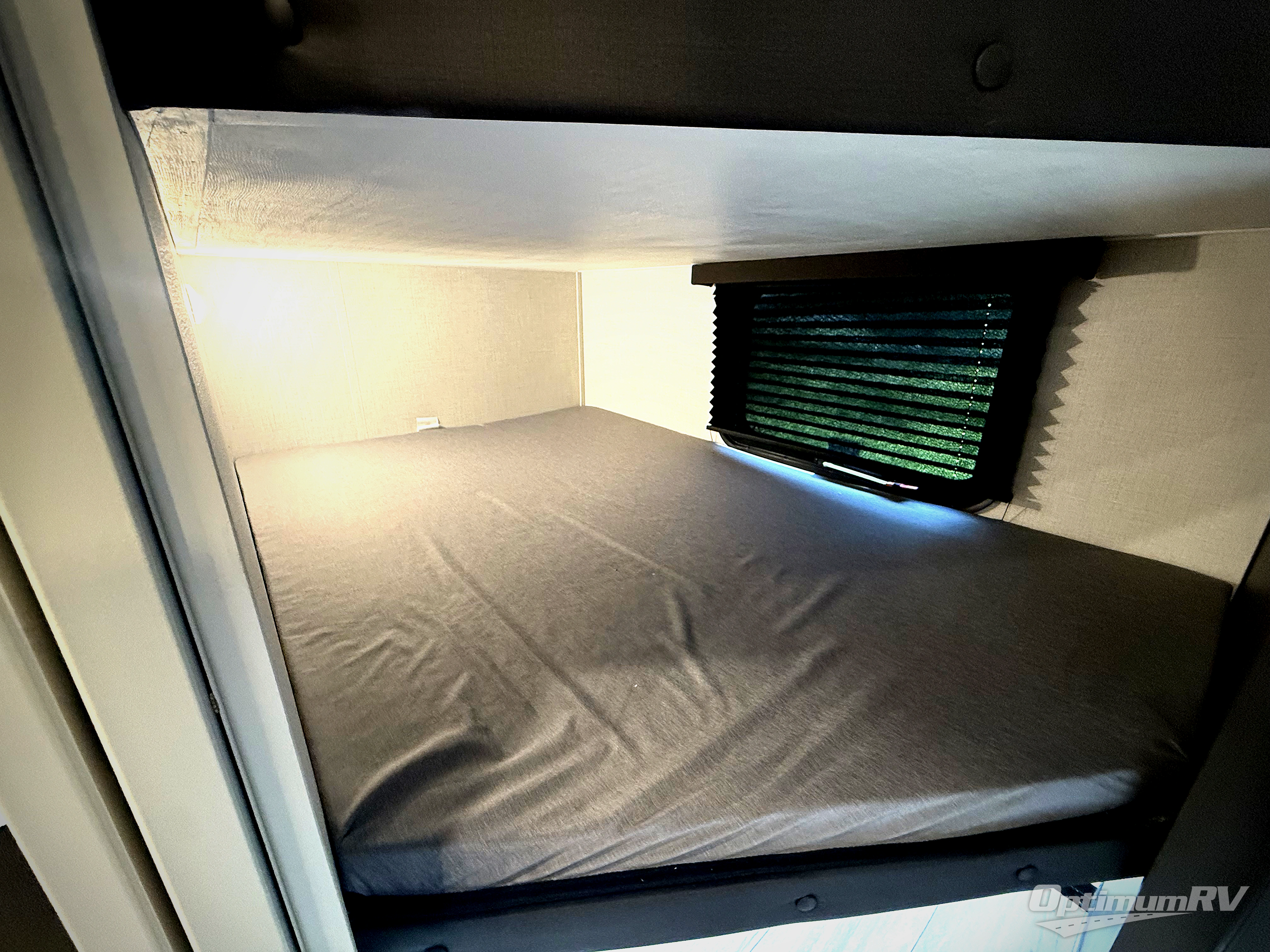 This fifth wheel with an open concept kitchen and living area is sure to feel just like home! You can relax with friends and family around the U-shaped dinette or on the tri-fold sleeper sofa, and there is a TV/radio in this space for entertainment. The rear private bunkhouse includes double-size triple bunks and a wardrobe for your guests' things, and you'll have your own wardrobes up front in the private bedroom. There is also a queen bed here and dual nightstands to keep your phone and glasses close by. And don't overlook the exterior with its 20' electric awning and LCI Solid Steps!