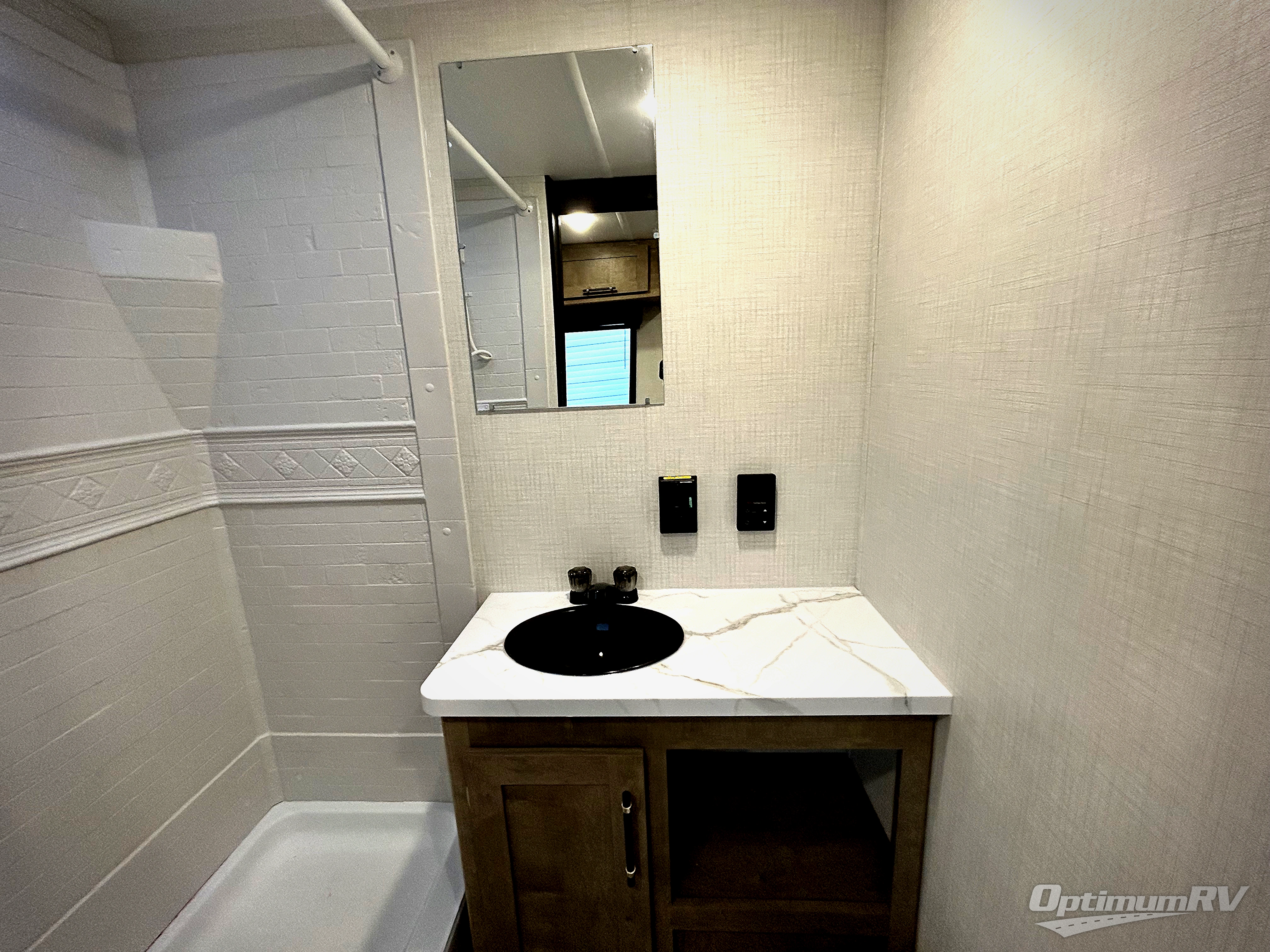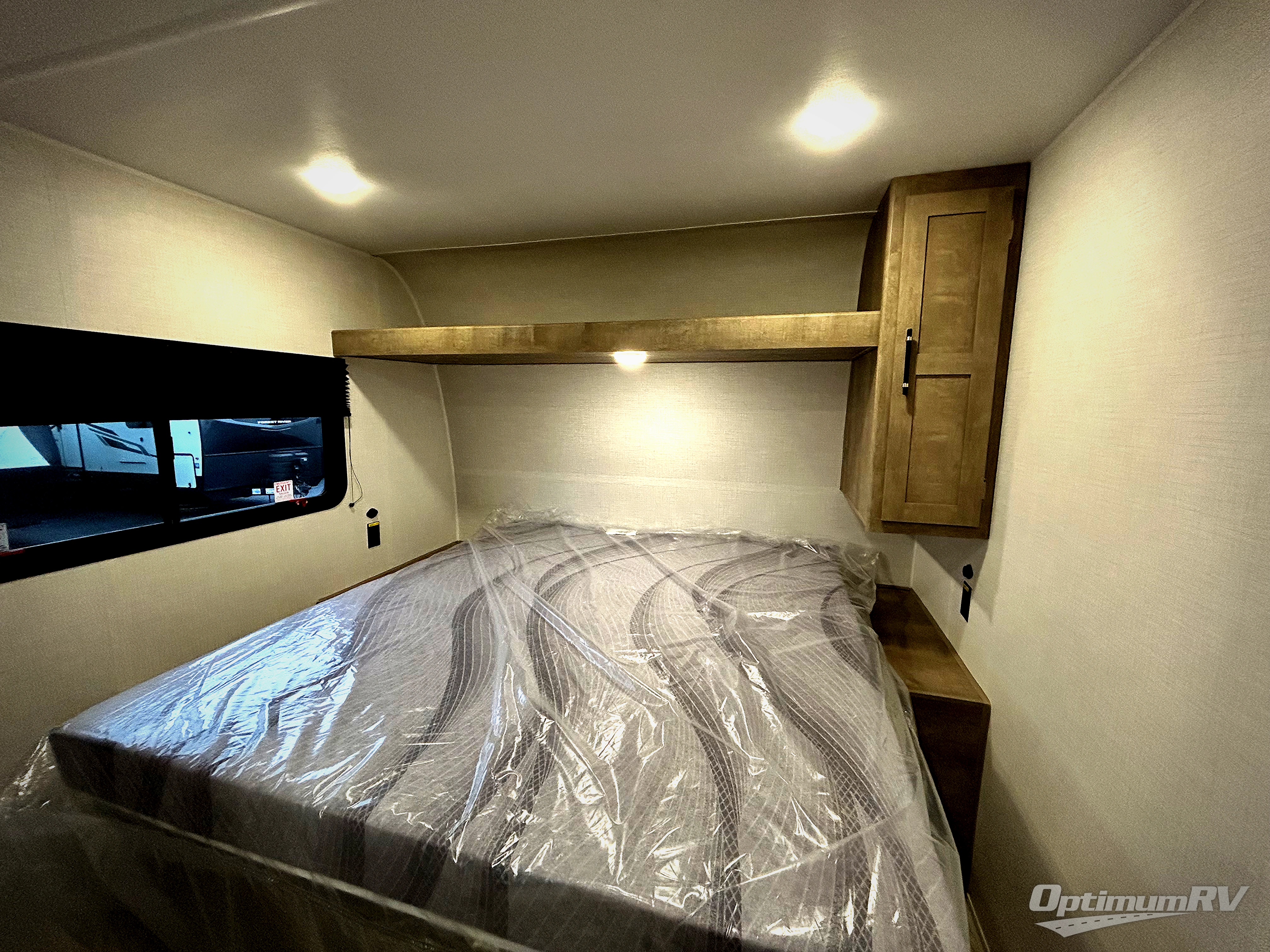 This trailer is perfect for your crew of four to six. There is a queen bed in the front bedroom, along with dual closets and nightstands to keep your things tidy. You can dine each day on the booth dinette, relax on the sofa, and house additional guests here at night. The kitchen includes everything you need to prepare meals each day, including a gas range, microwave, and a 10-cu. ft. 12V refrigerator for cold items. And the full bath on board lets you stay clean throughout each camping trip!