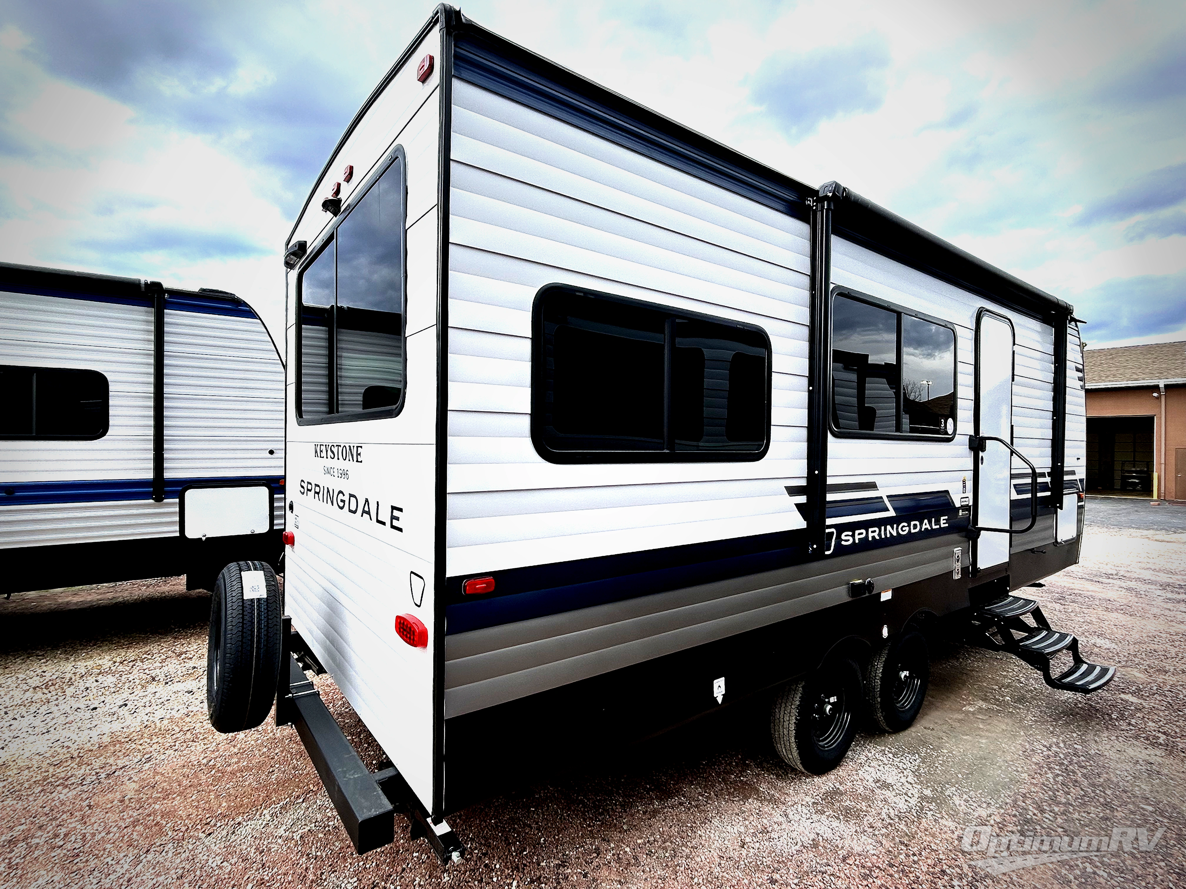 The Springdale Classic travel trailers by Keystone will provide you and your family many great outdoor experiences and it will also be kind to your pocketbook. Each one is constructed with a walkable roof and an I-beam frame with stamped steel cross-members and outriggers for added strength. There are also heavy-duty stabilizer jacks and power tongue jacks outside, along with an XL entry assist handle for added convenience. Each travel trailer includes LED lighting, bedside outlets, and blackout night shades inside that will provide you with more privacy at night.