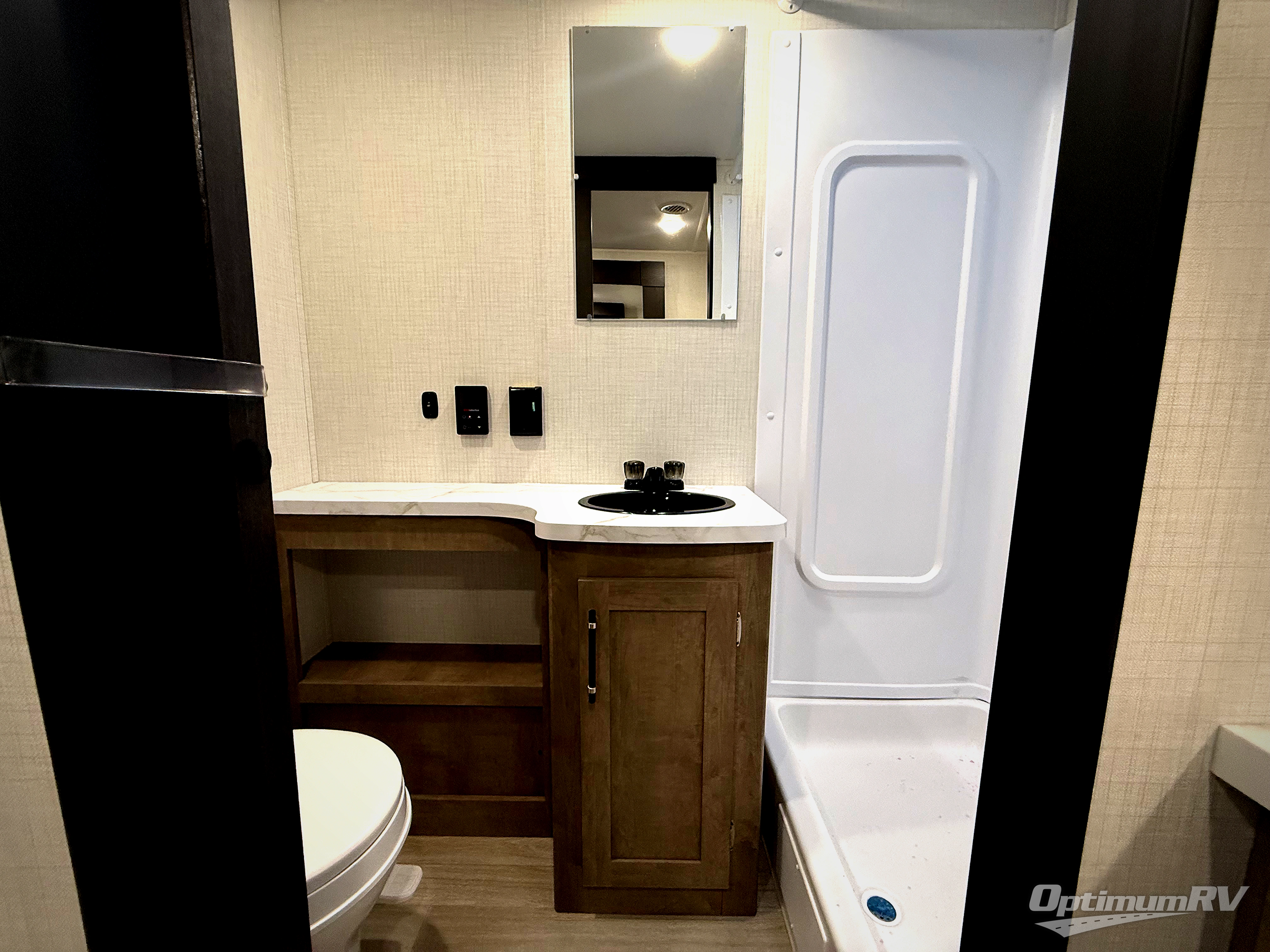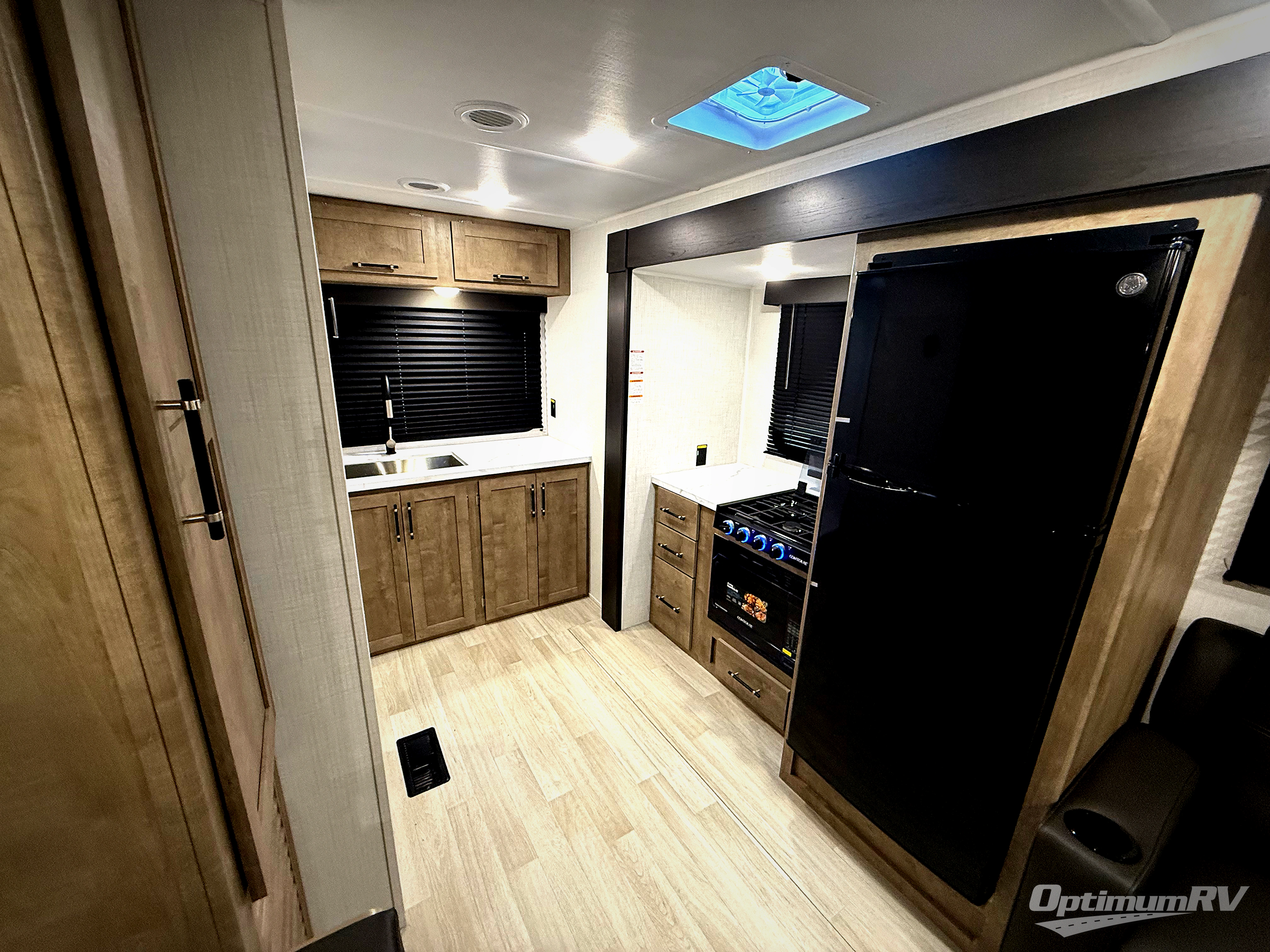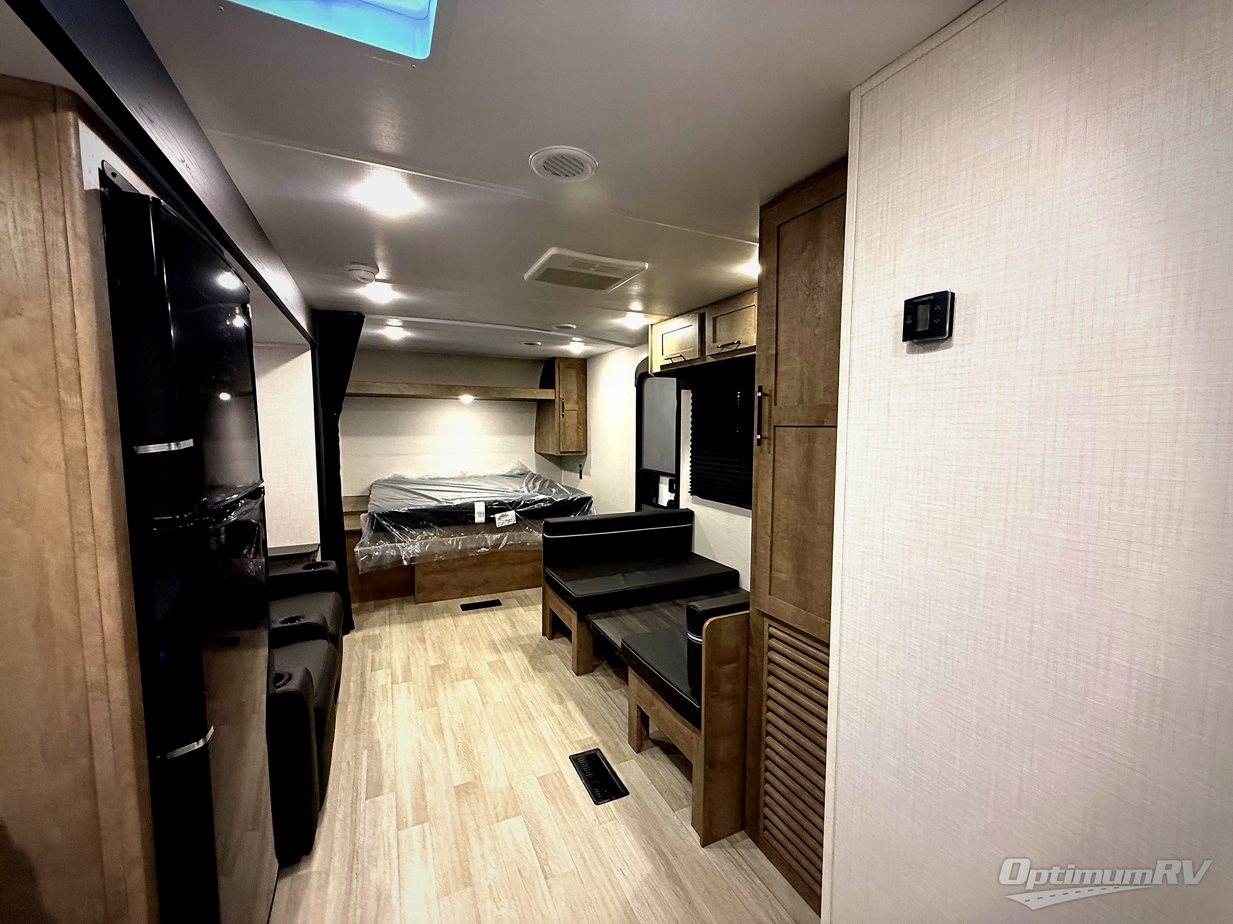 You'll love the added space in this travel trailer thanks to the large slide out. Here, you'll find the sofa with an end table, plus the 12V refrigerator and three burner gas range. There is kitchen counter space in the rear corner, and you'll find the full bath in the other rear corner for easy use. The front queen bed includes a privacy curtain for when you have guests staying over on the sofa and booth dinette, plus there are dual bedside closets and nightstands for your things!