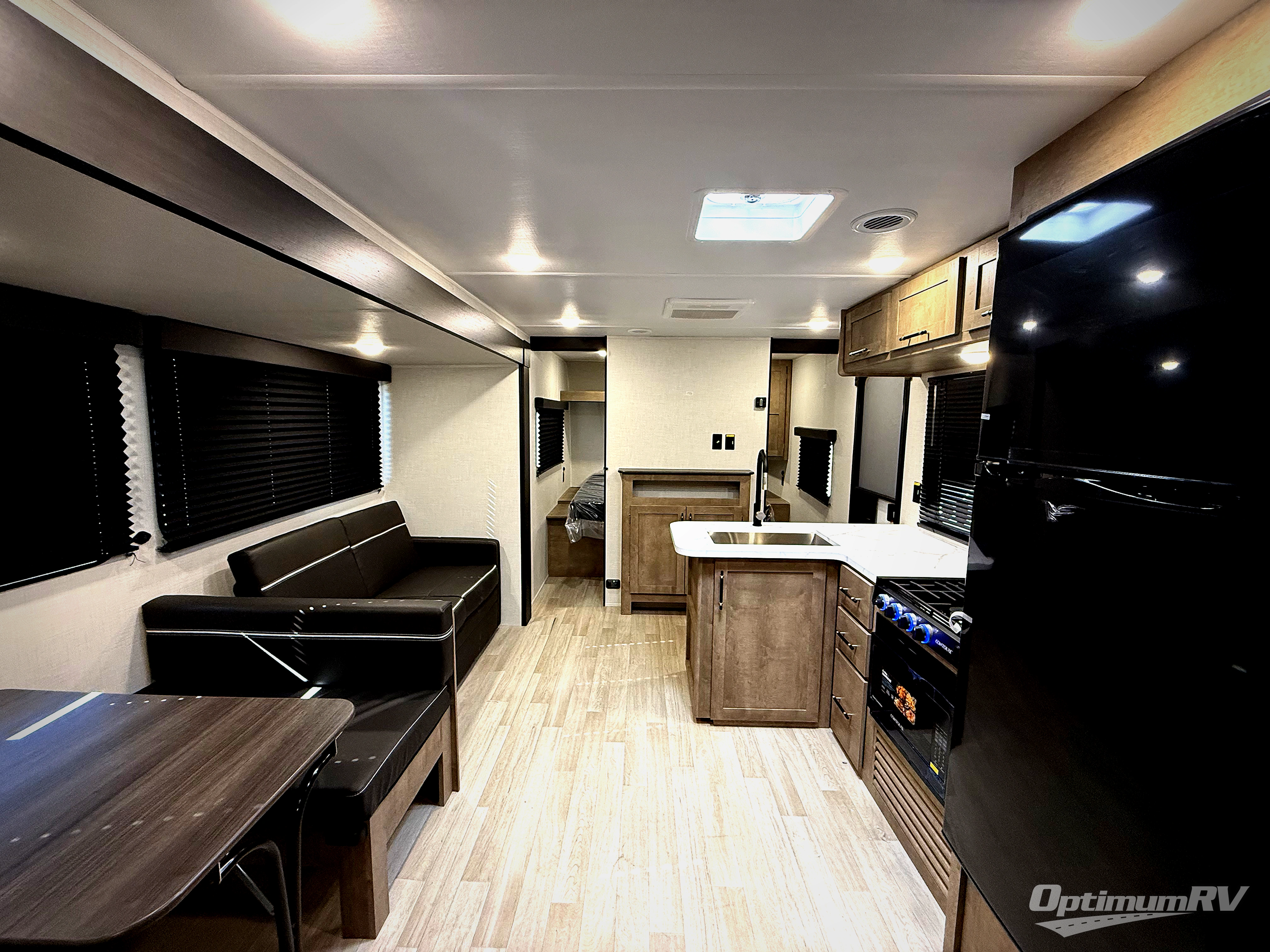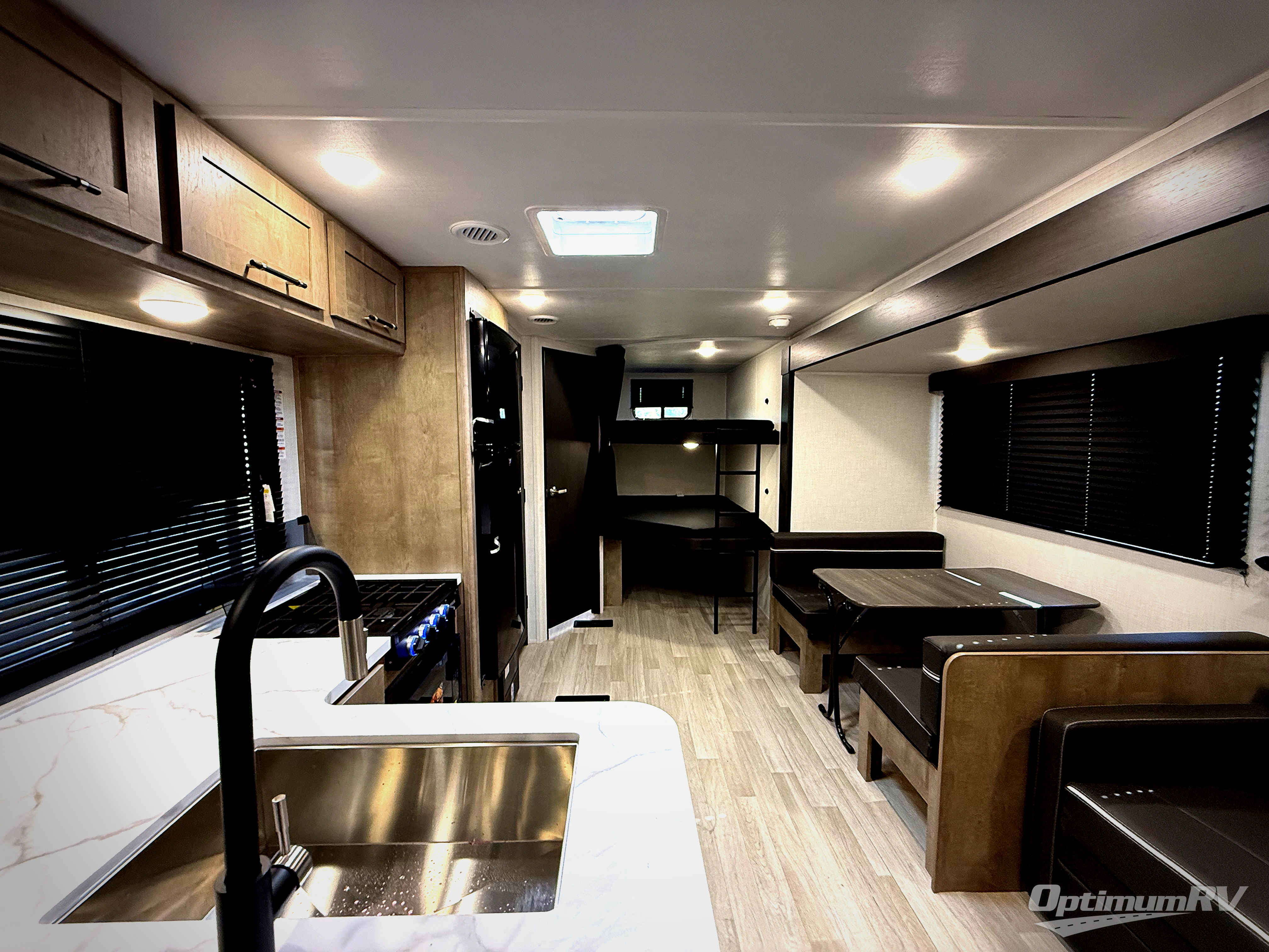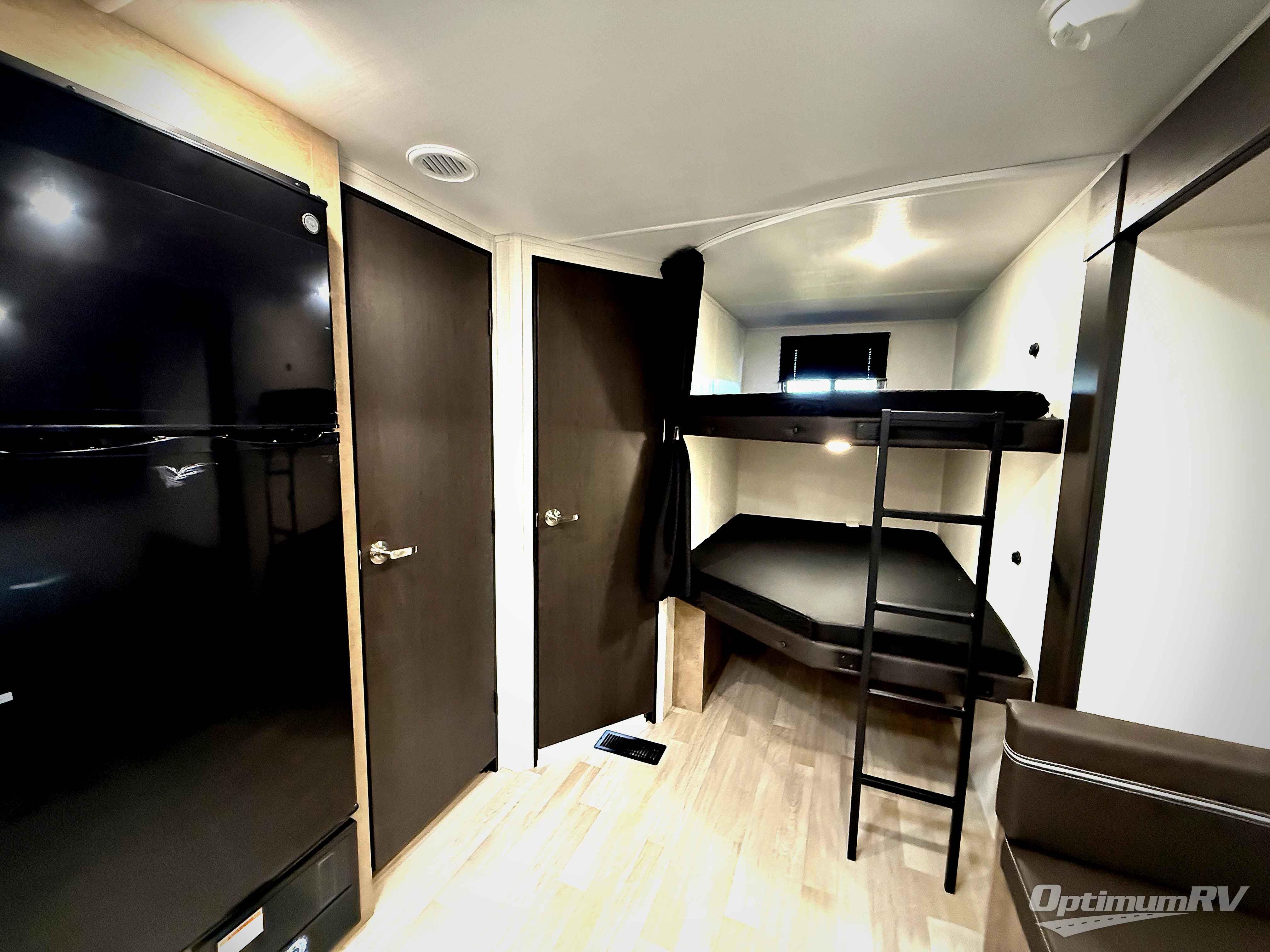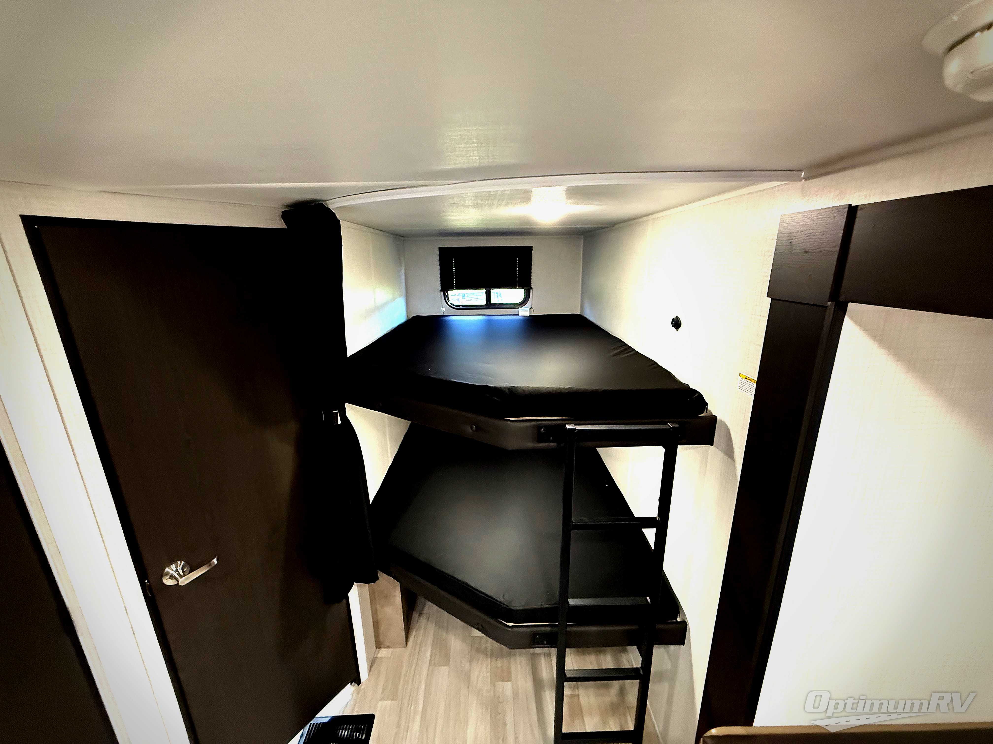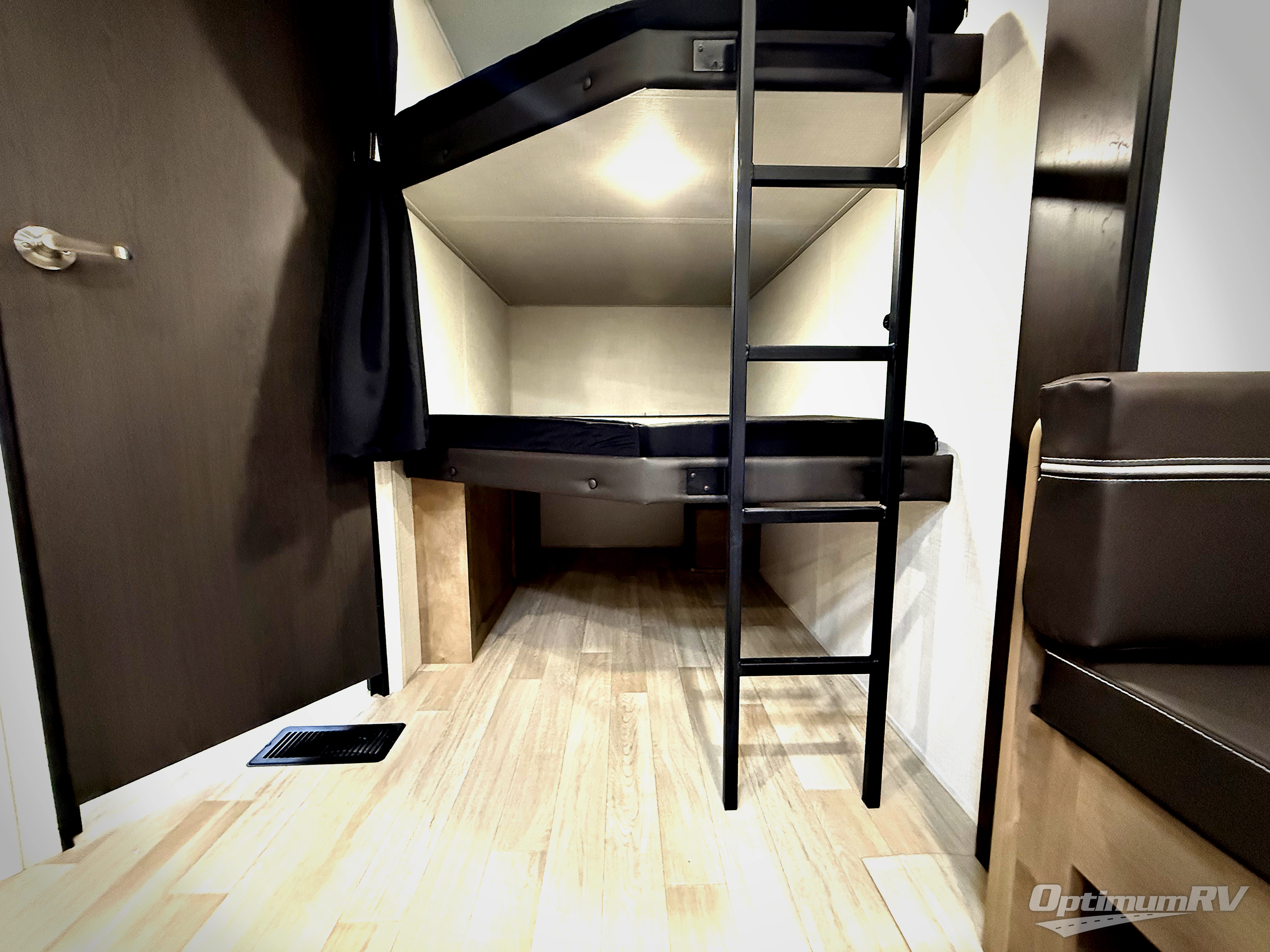 You'll have additional space to stretch out in this travel trailer for eight to ten! Within the slide you'll find the booth dinette and sofa that will be perfect for mealtimes, relaxing, and sleeping more guests, and there is an entertainment with TV prep for movie nights. The little ones will love the double-size bunks, and the full bath is close by for easy nighttime use, and one of the dual entry doors is found here for convenience. You'll have the front private bedroom with a queen bed all to yourselves, plus there are dual closets and nightstands for your things. This model also includes an exterior pass-through storage outside and a 16' power awning for protection against the sun!
