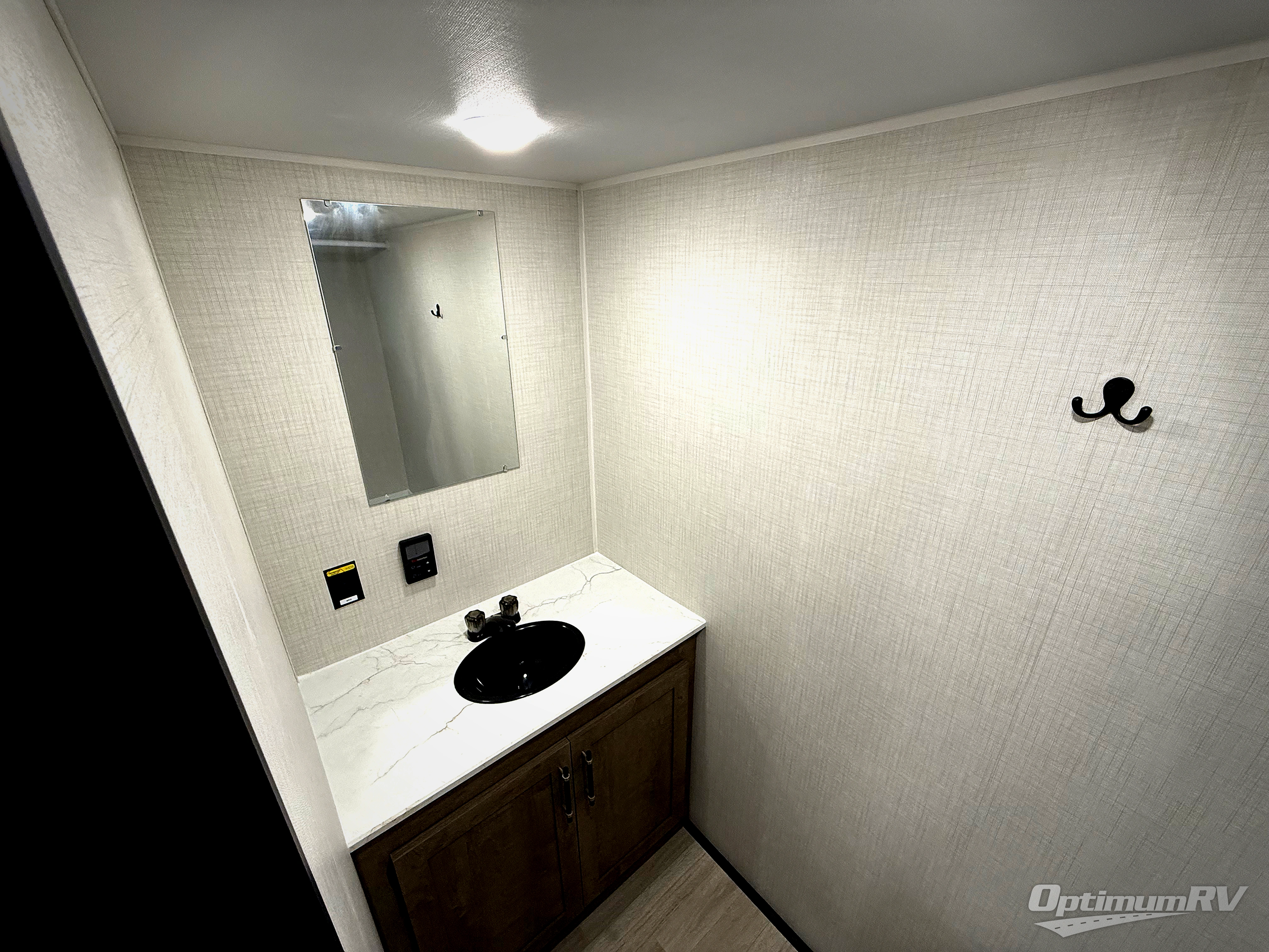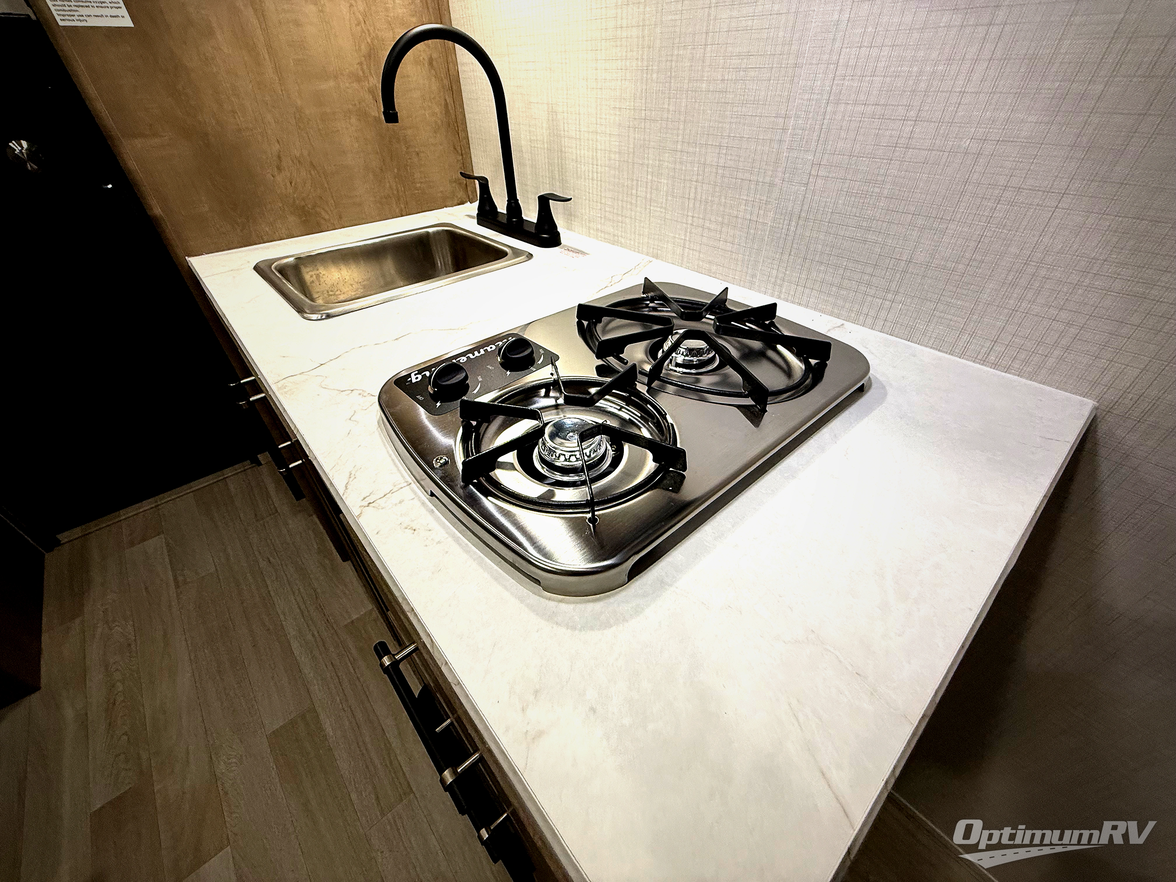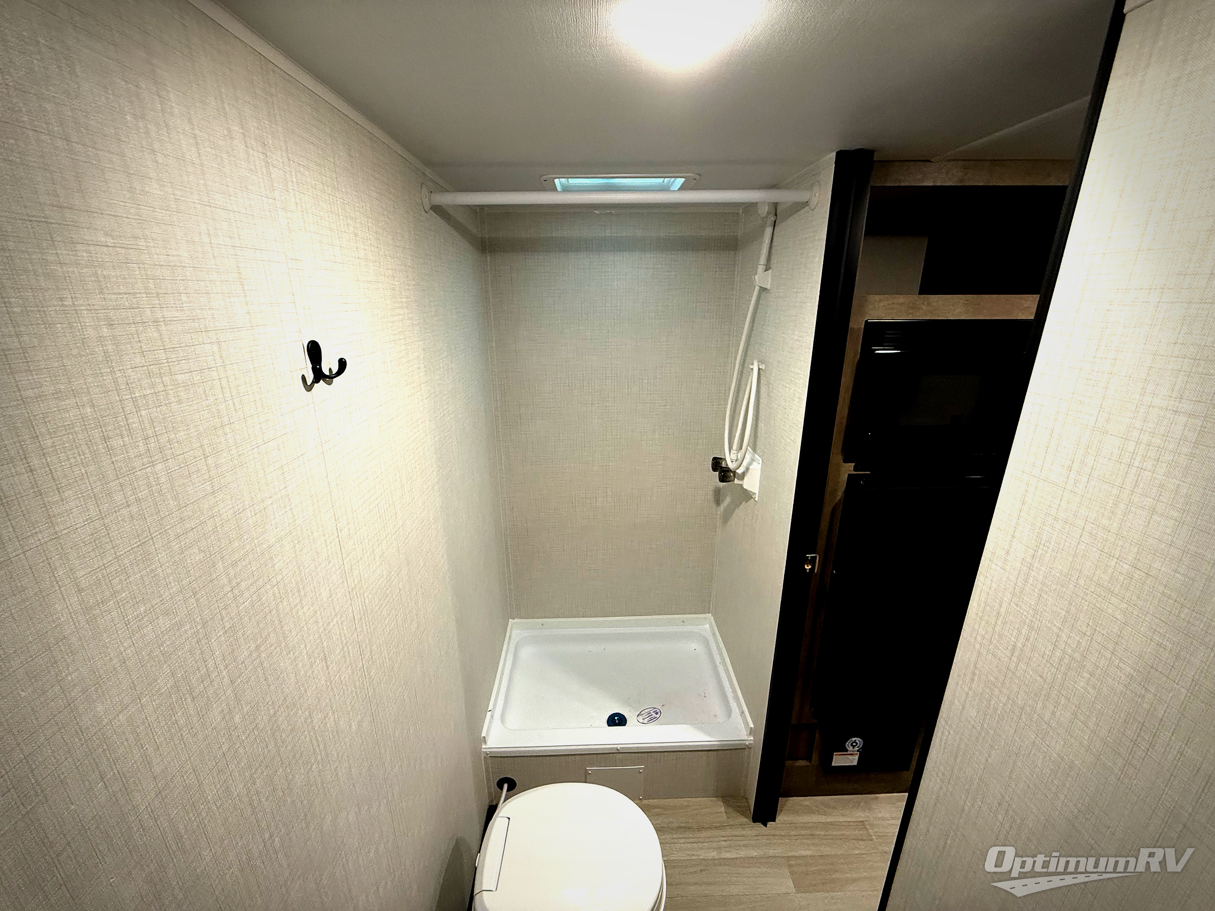 This cozy trailer for two or four will have you out enjoying nature easily. There is a queen bed for you, and the booth dinette can easily transform into a bed for one or two more campers if needed at night. The rear private bath features a shower and vanity with sink, plus toilet so no late night trips to the campground bathroom. There is ample storage in overhead cabinets on both sides of the trailer, as well as dual closets and nightstands on either side of the bed. A 10' awning offers even more living space outside. Grab a couple of camp chairs and enjoy hanging out with your campground neighbors or enjoying a campfire.