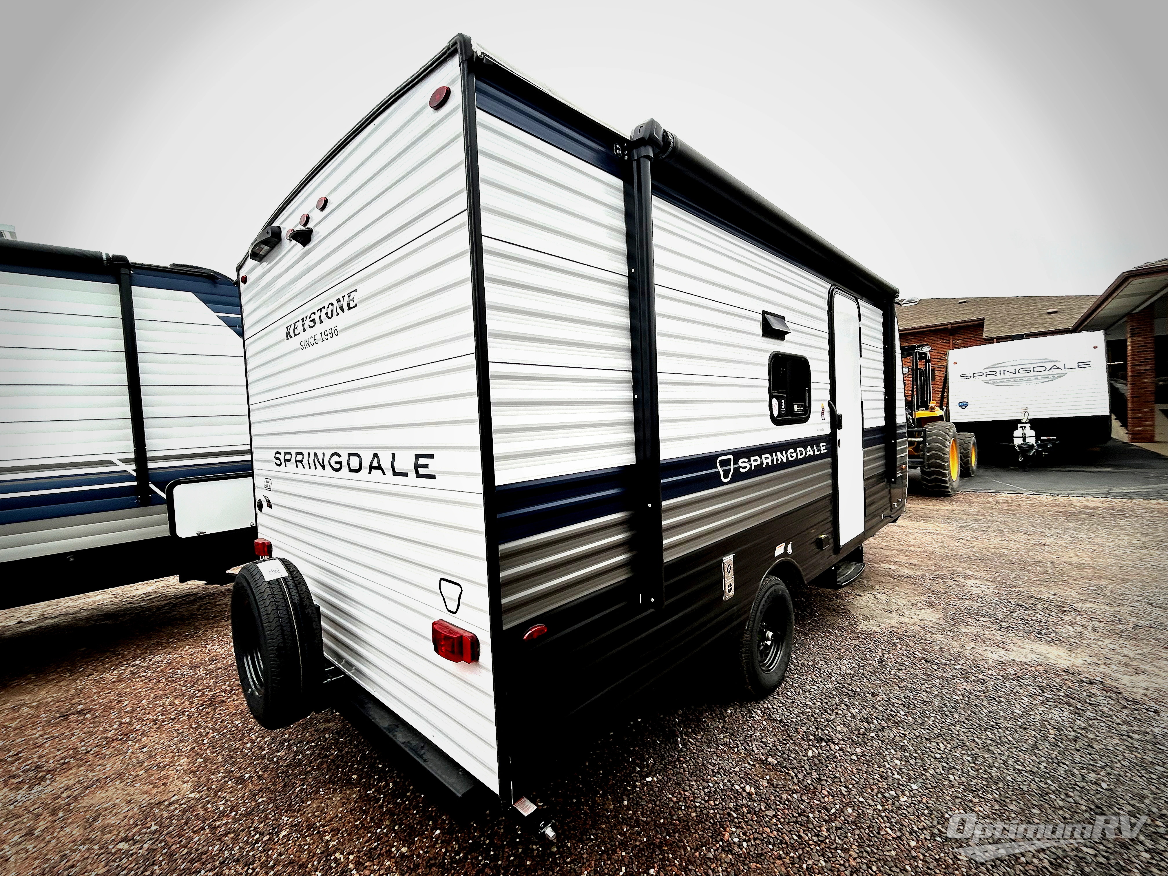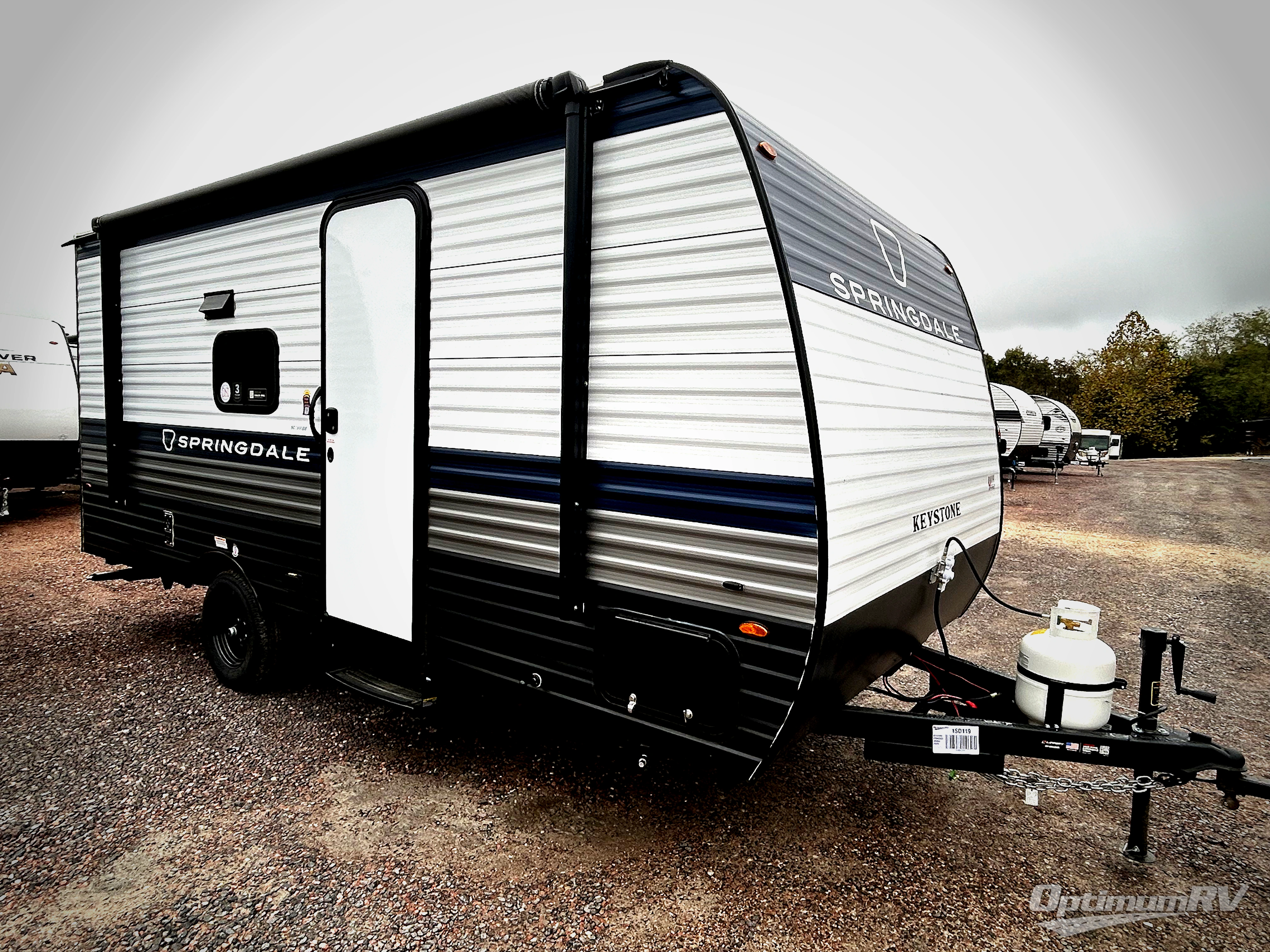 With any Springdale Mini travel trailer by Keystone, you will enjoy lightweight towing thanks to their single-axle! The AlphaPly TPO roof membrane is ultra durable, and the power awning will provide protection from the sun as you relax in your camp chairs outside. Each model includes blackout night shades, LED lighting, plus many more interior comforts. There is also a roof A/C and 20K BTU furnace to keep you comfortable, plus a tankless water heater for endless hot showers!