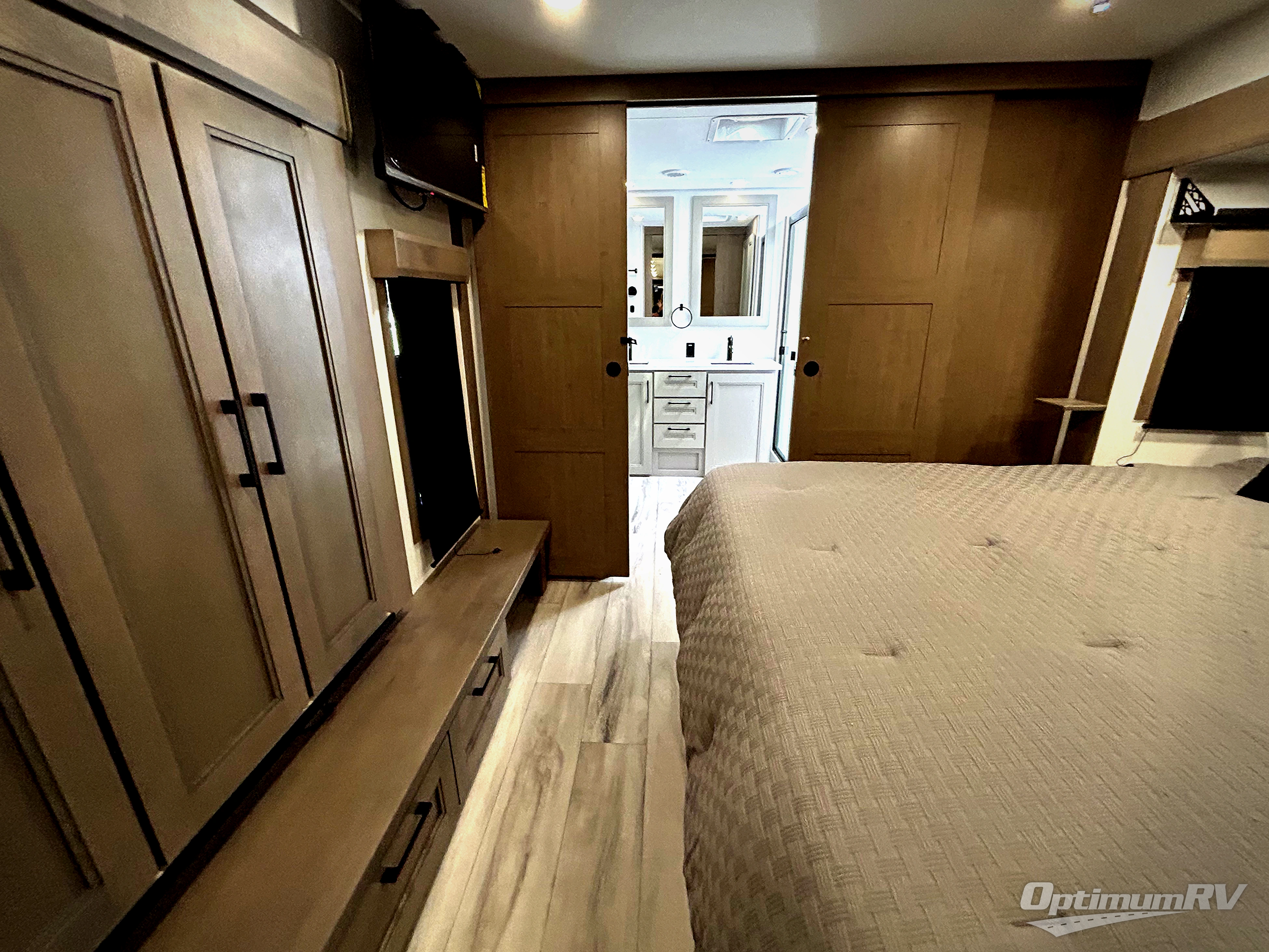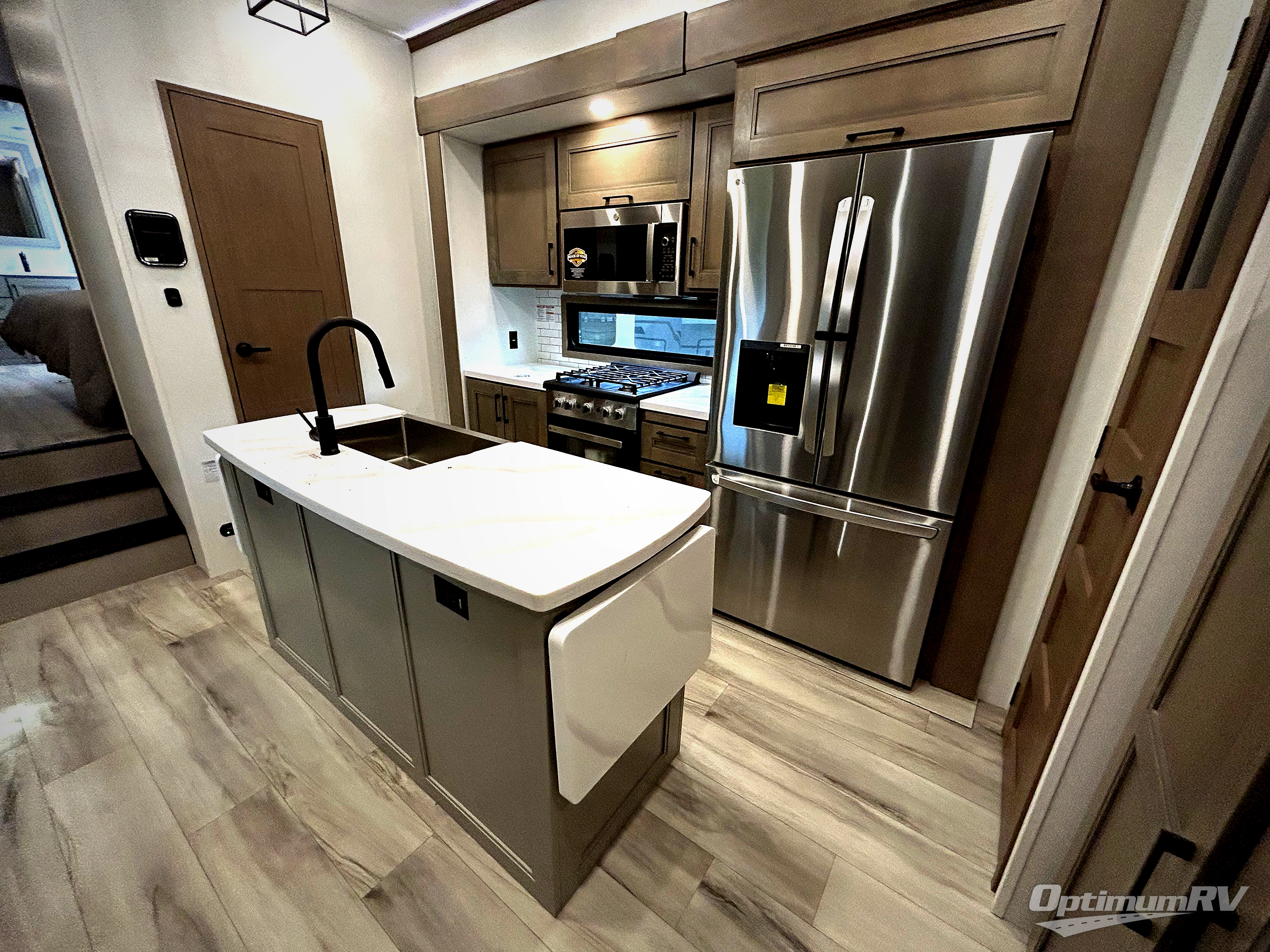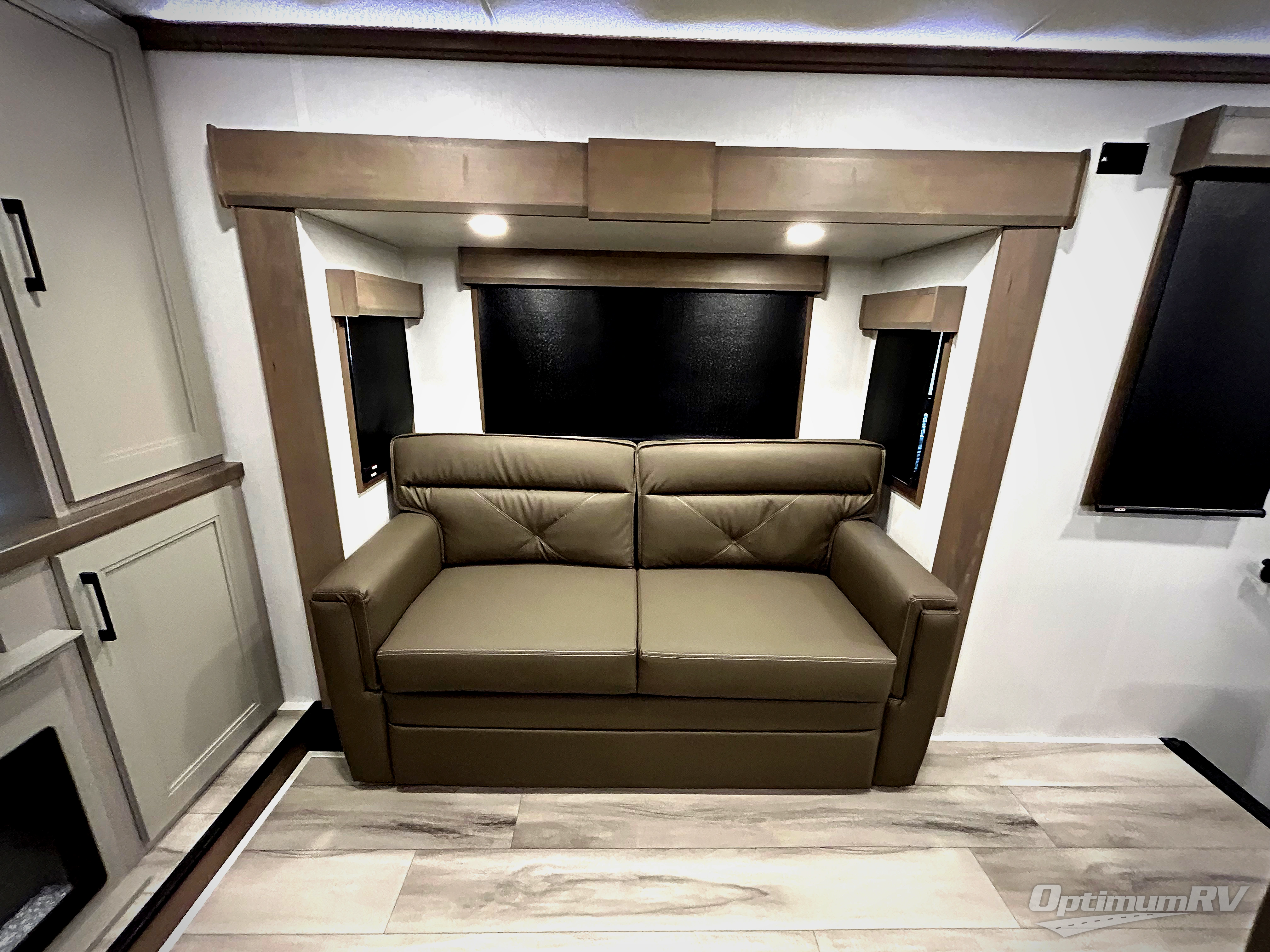 Fall in love with this unit's kitchen with residential appliances, a farmhouse stainless steel sink, a dishwasher, pantry, 26 cu refrigerator, and a sliding table/desk with chairs. Spend cozy entertainment nights watching the 65" LED TV with a fireplace below, a theater seating with USB ports, and two hide-a-bed sofa slides that widen this area so everyone can stretch out and relax. At night, retire to your private bedroom with a king electric tilt bed with drawers underneath, a 32" Smart LED TV, and, a closet, perfect for easy organization. Also, the full rear bathroom provides a residential shower with a seat plus linen storage, washer and dryer prep, and two sinks for more convenience. This model is also fitted with an exterior pass-through storage ideal for storing your things.
