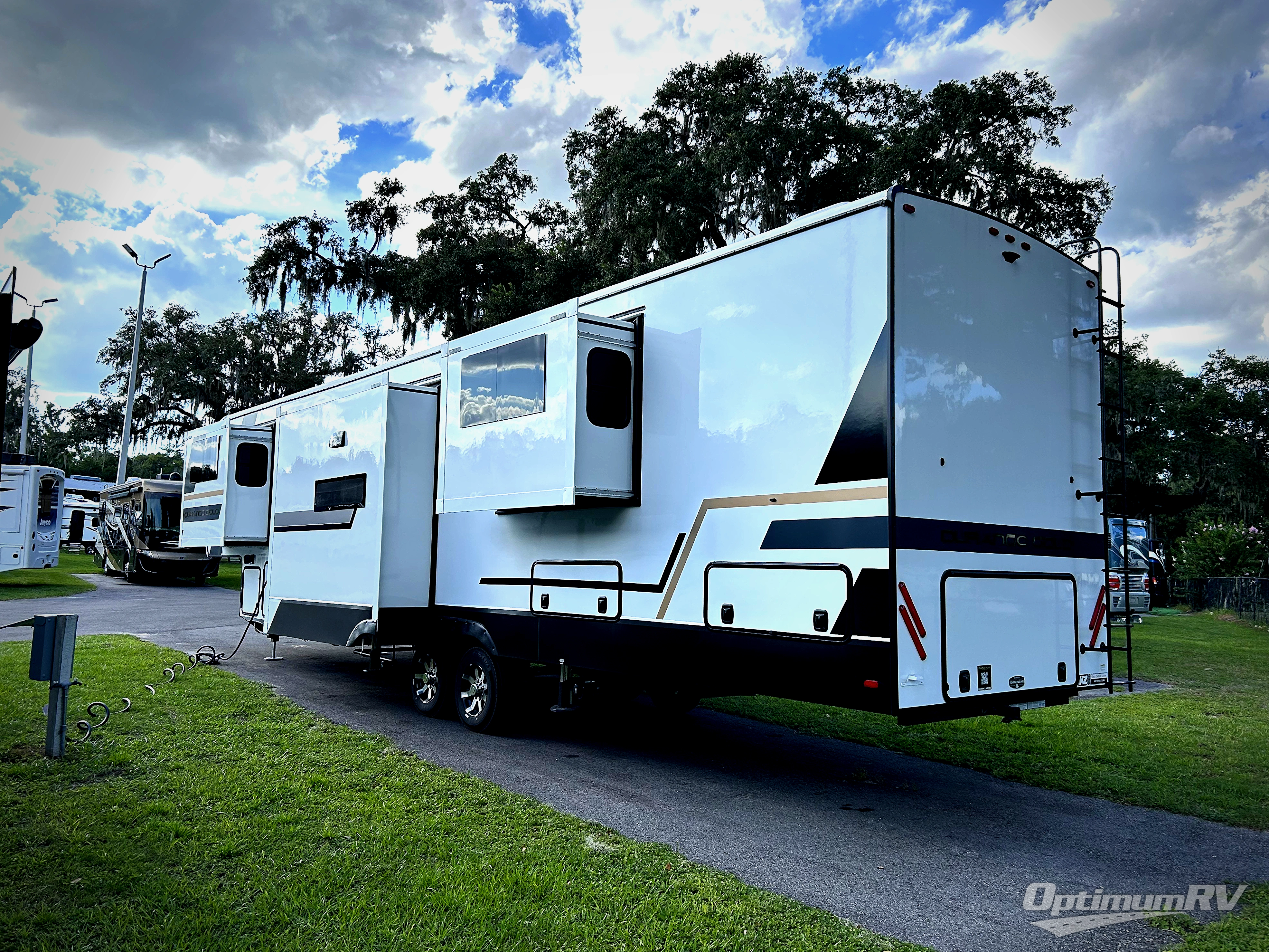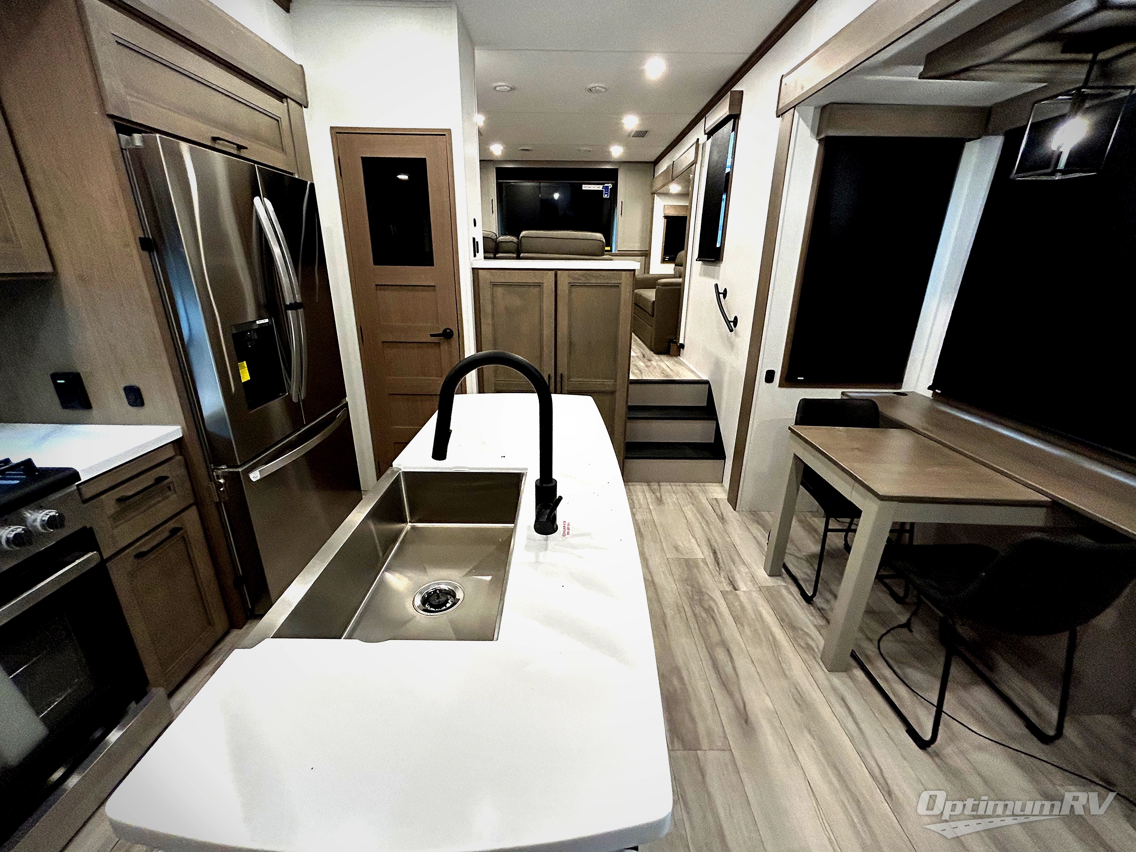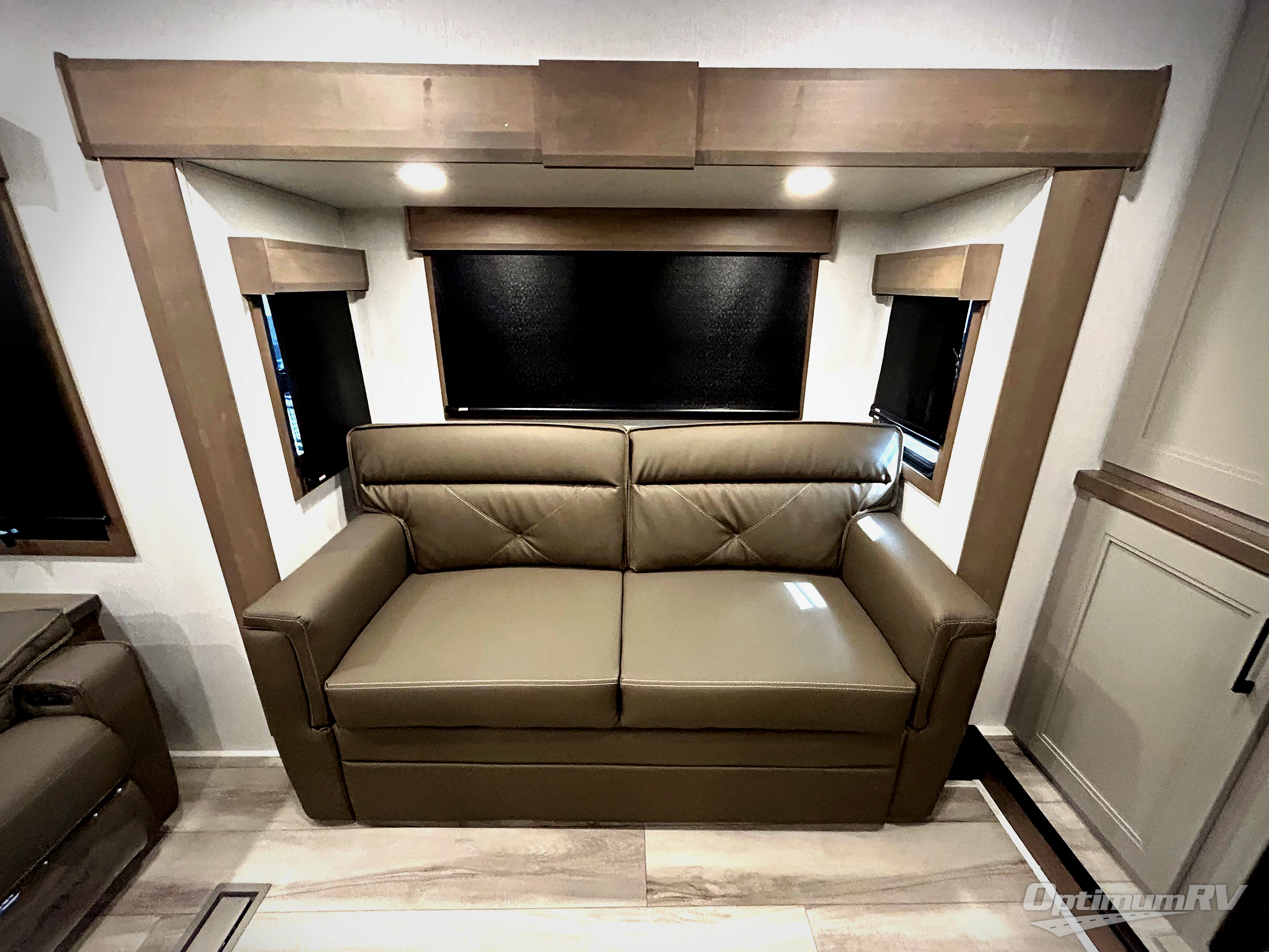 Fall in love with this unit's kitchen with residential appliances, a farmhouse stainless steel sink, a dishwasher, pantry, 26 cu refrigerator, and a sliding table/desk with chairs. Spend cozy entertainment nights watching the 65" LED TV with a fireplace below, a theater seating with USB ports, and two hide-a-bed sofa slides that widen this area so everyone can stretch out and relax. At night, retire to your private bedroom with a king electric tilt bed with drawers underneath, a 32" Smart LED TV, and, a closet, perfect for easy organization. Also, the full rear bathroom provides a residential shower with a seat plus linen storage, washer and dryer prep, and two sinks for more convenience. This model is also fitted with an exterior pass-through storage ideal for storing your things.