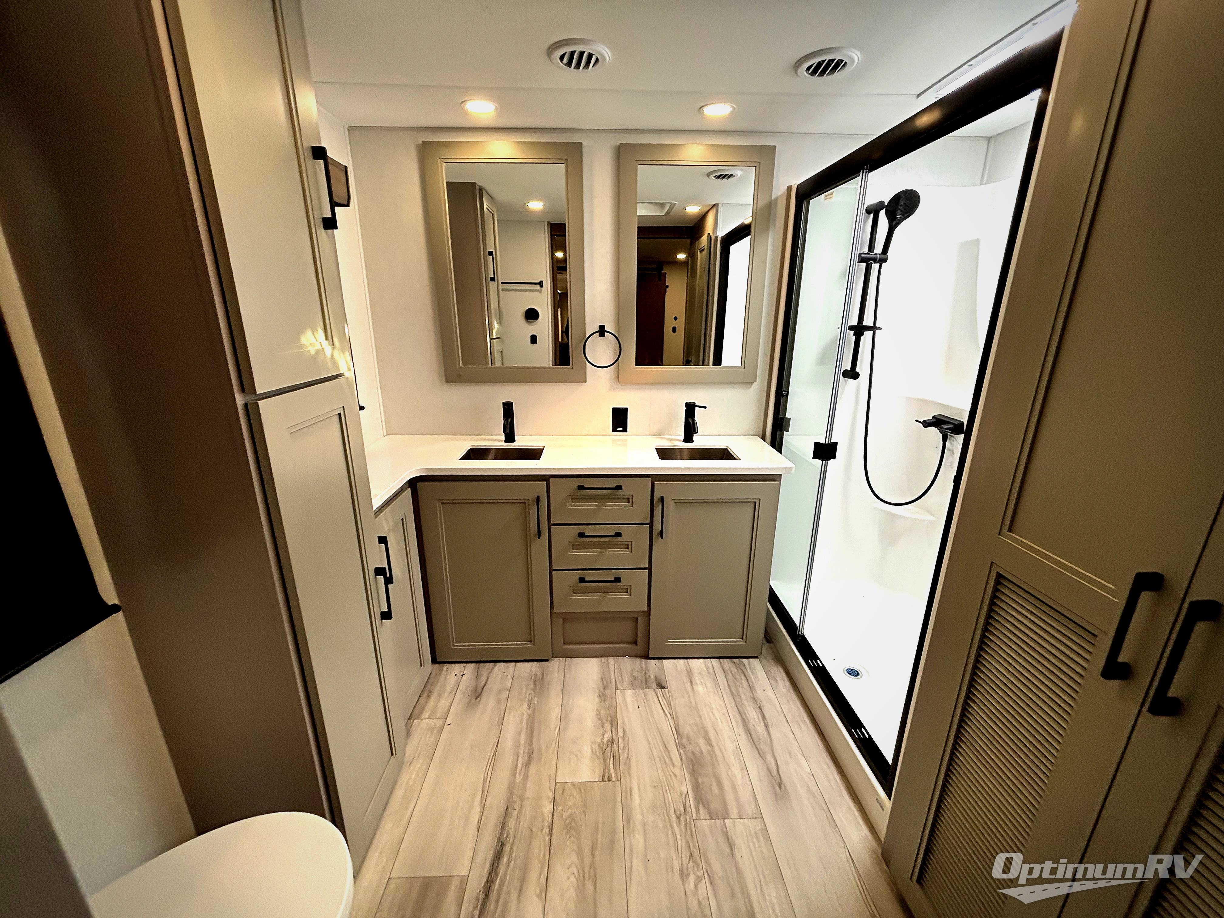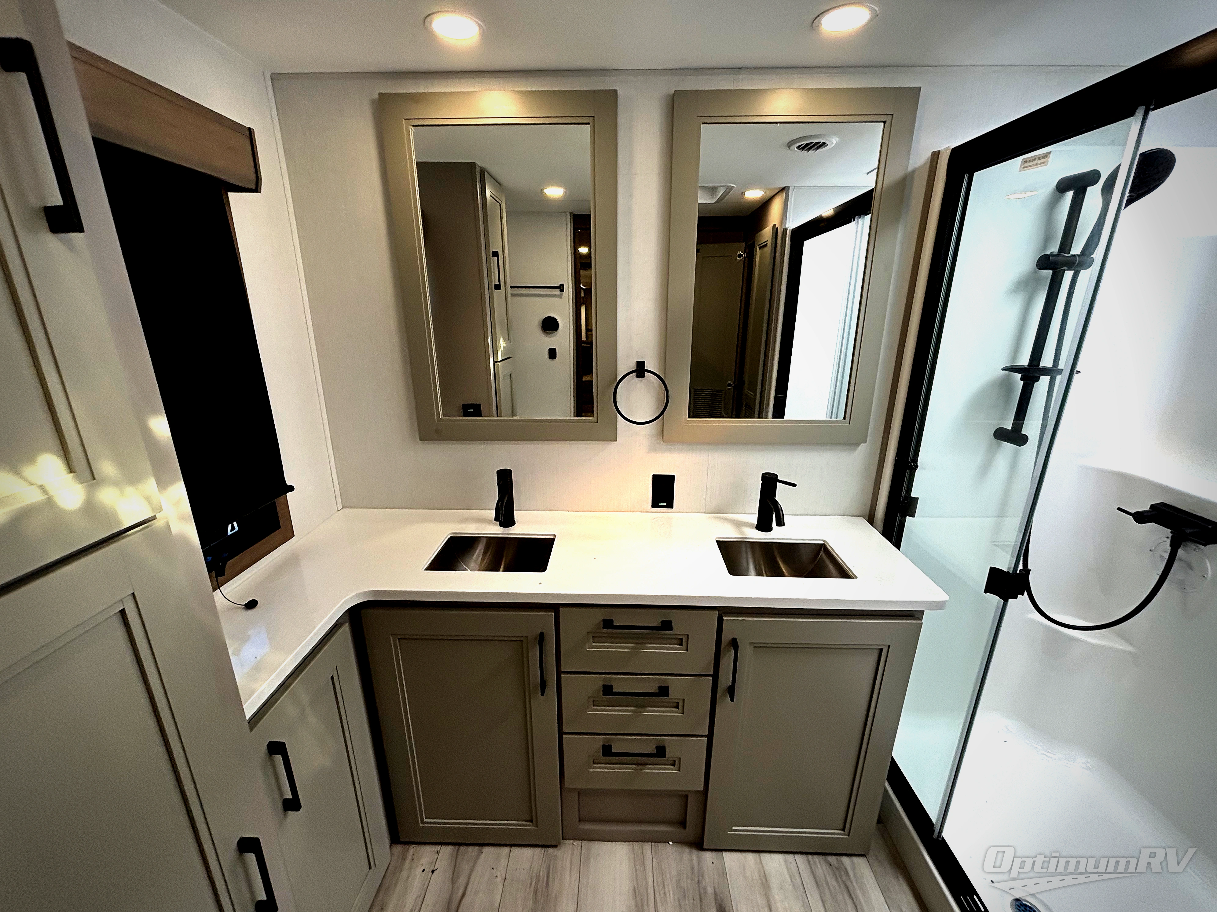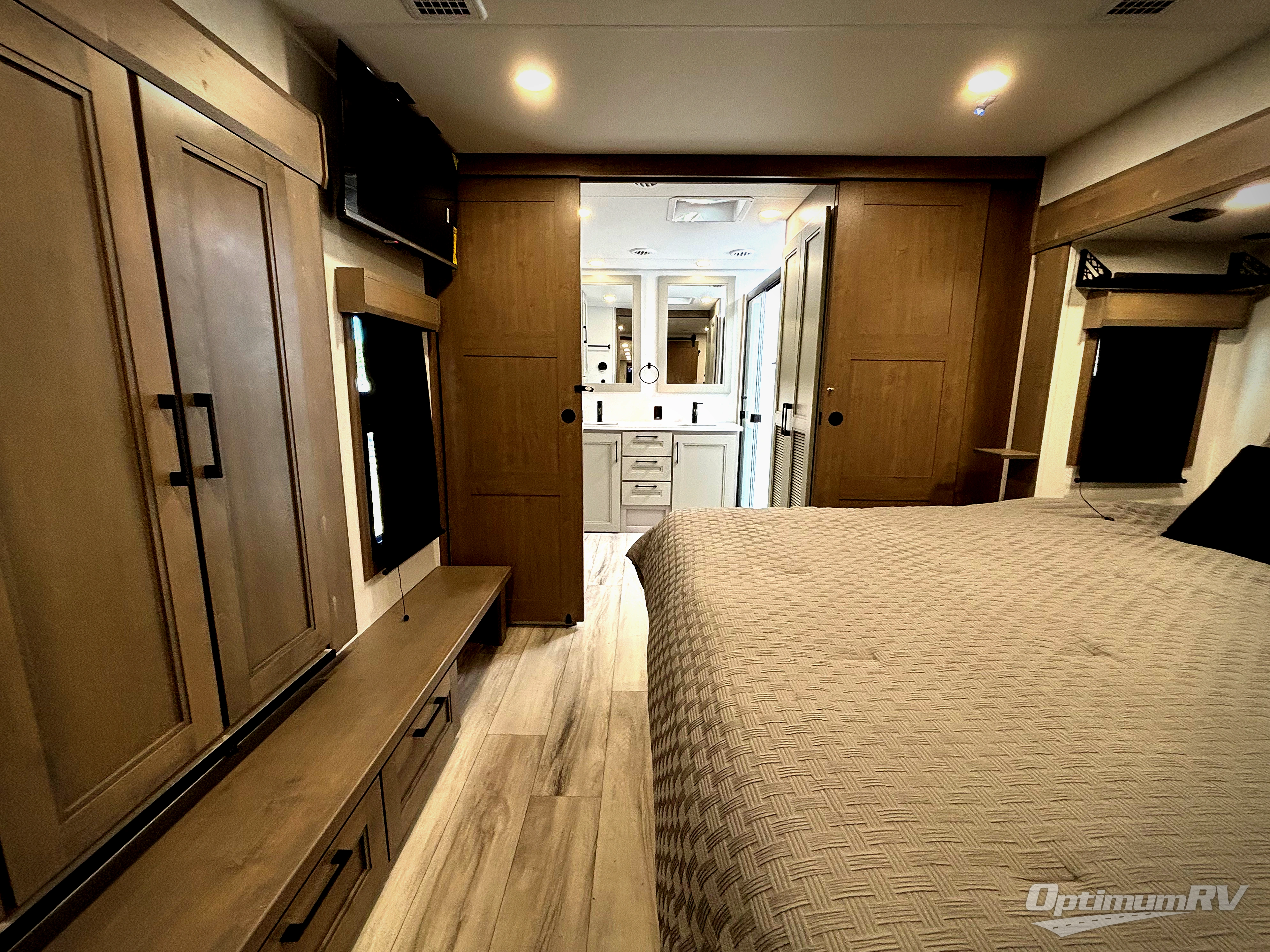 Fall in love with this unit's kitchen with residential appliances, a farmhouse stainless steel sink, a dishwasher, pantry, 26 cu refrigerator, and a sliding table/desk with chairs. Spend cozy entertainment nights watching the 65" LED TV with a fireplace below, a theater seating with USB ports, and two hide-a-bed sofa slides that widen this area so everyone can stretch out and relax. At night, retire to your private bedroom with a king electric tilt bed with drawers underneath, a 32" Smart LED TV, and, a closet, perfect for easy organization. Also, the full rear bathroom provides a residential shower with a seat plus linen storage, washer and dryer prep, and two sinks for more convenience. This model is also fitted with an exterior pass-through storage ideal for storing your things.