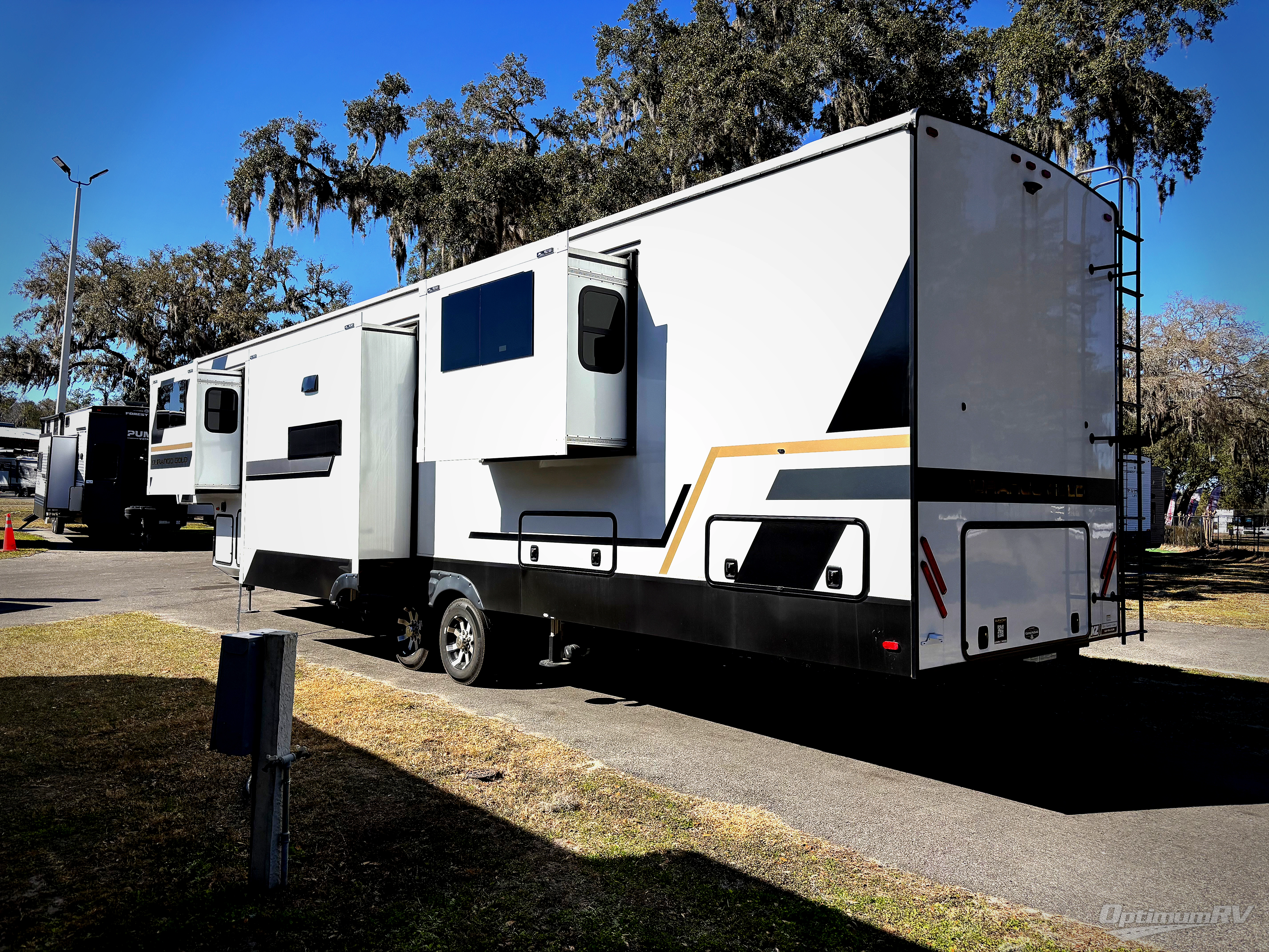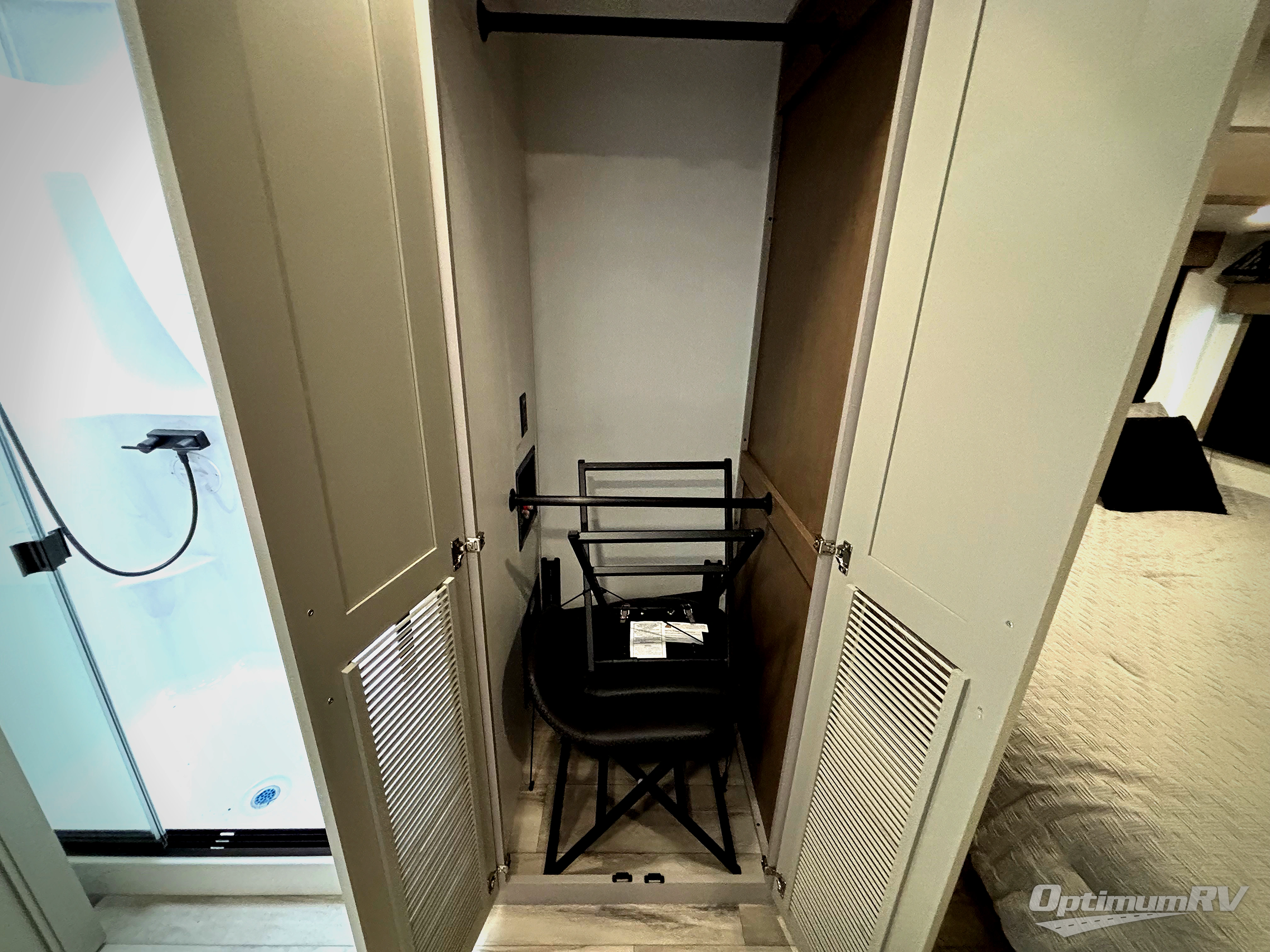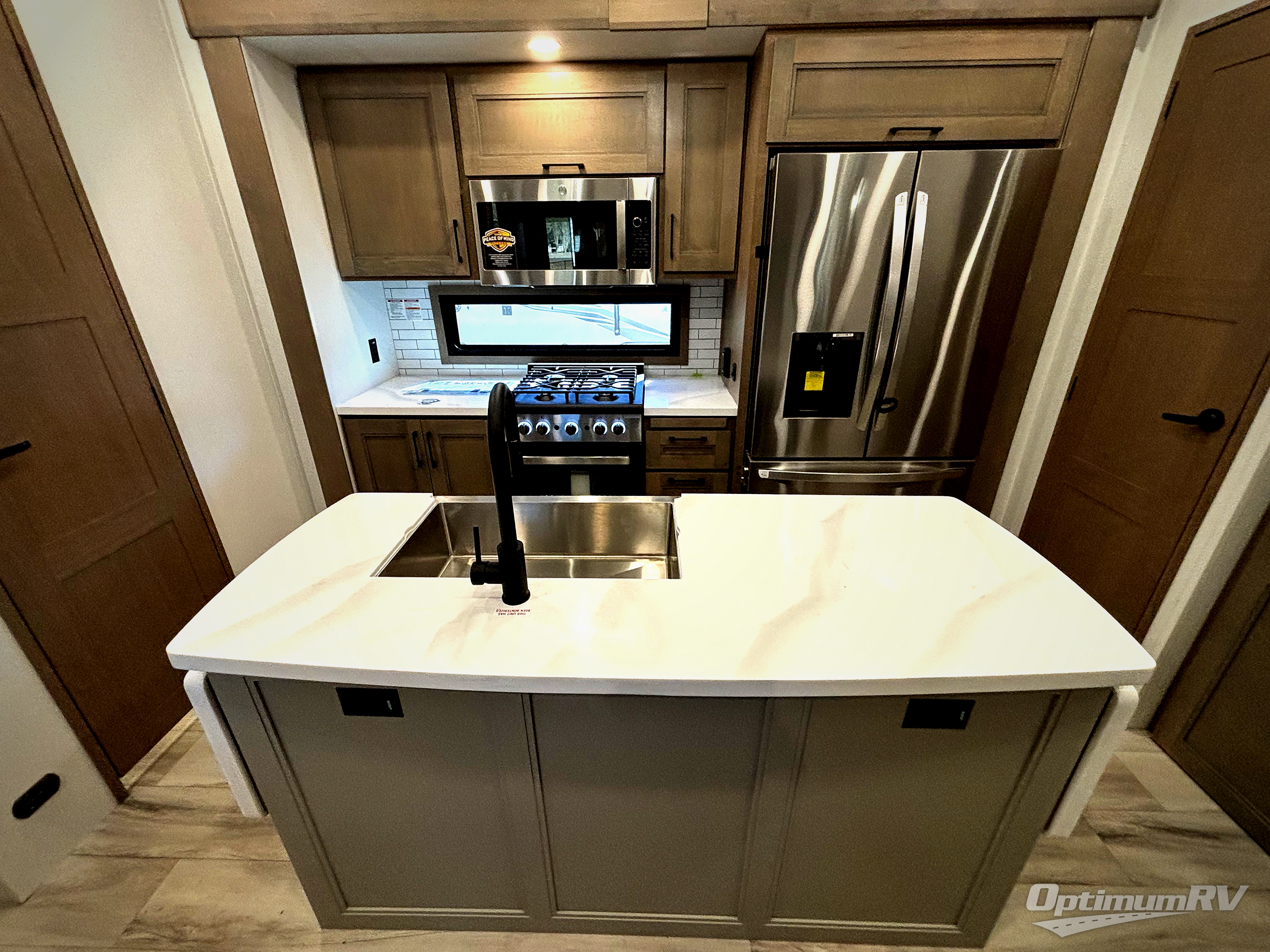 Fall in love with this unit's kitchen with residential appliances, a farmhouse stainless steel sink, a dishwasher, pantry, 26 cu refrigerator, and a sliding table/desk with chairs. Spend cozy entertainment nights watching the 65" LED TV with a fireplace below, a theater seating with USB ports, and two hide-a-bed sofa slides that widen this area so everyone can stretch out and relax. At night, retire to your private bedroom with a king electric tilt bed with drawers underneath, a 32" Smart LED TV, and, a closet, perfect for easy organization. Also, the full rear bathroom provides a residential shower with a seat plus linen storage, washer and dryer prep, and two sinks for more convenience. This model is also fitted with an exterior pass-through storage ideal for storing your things.