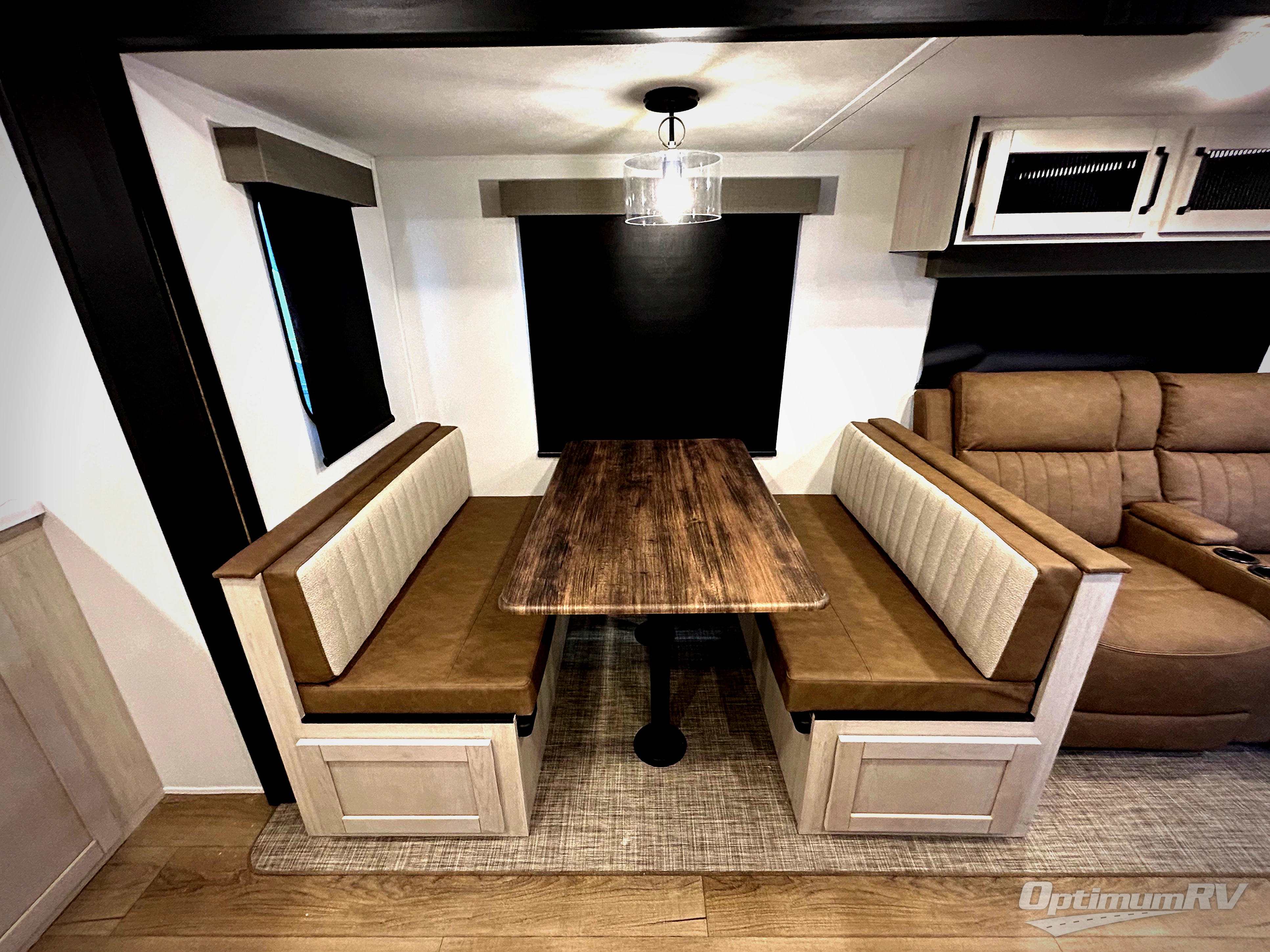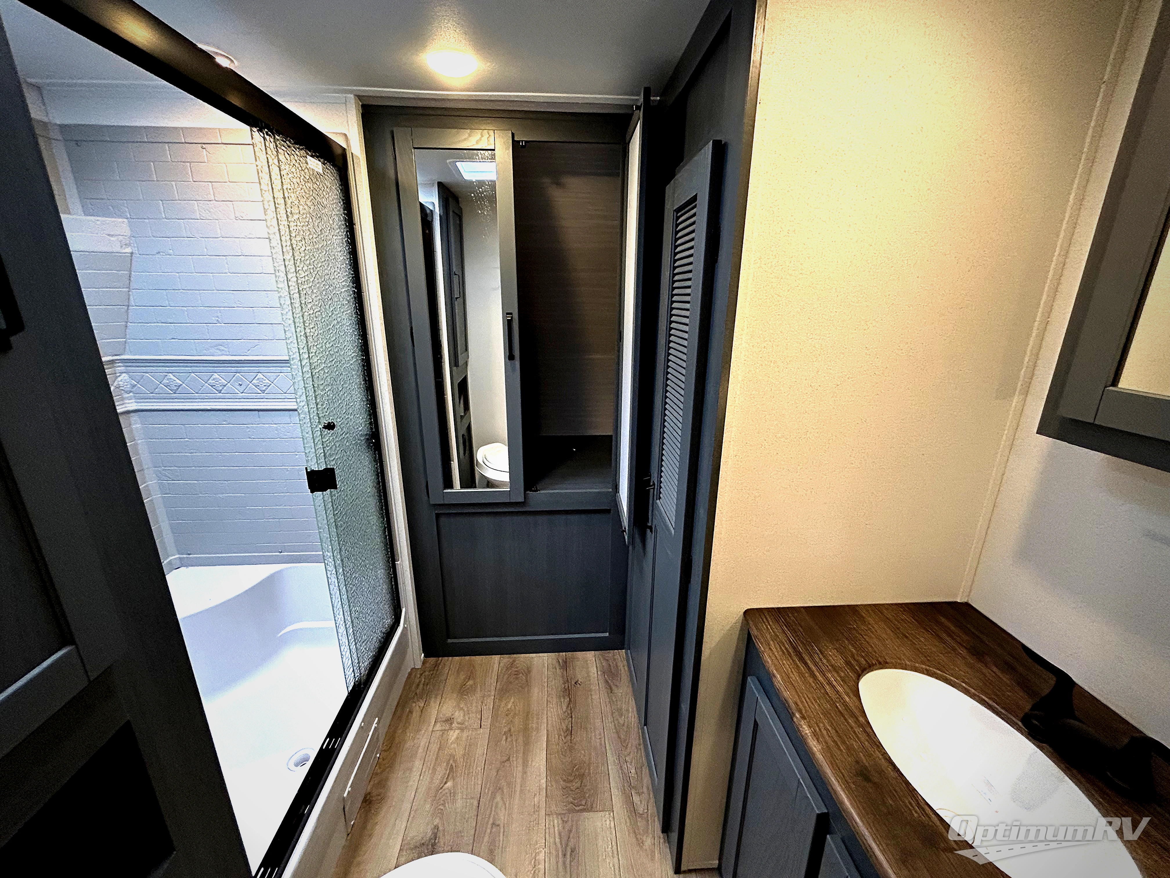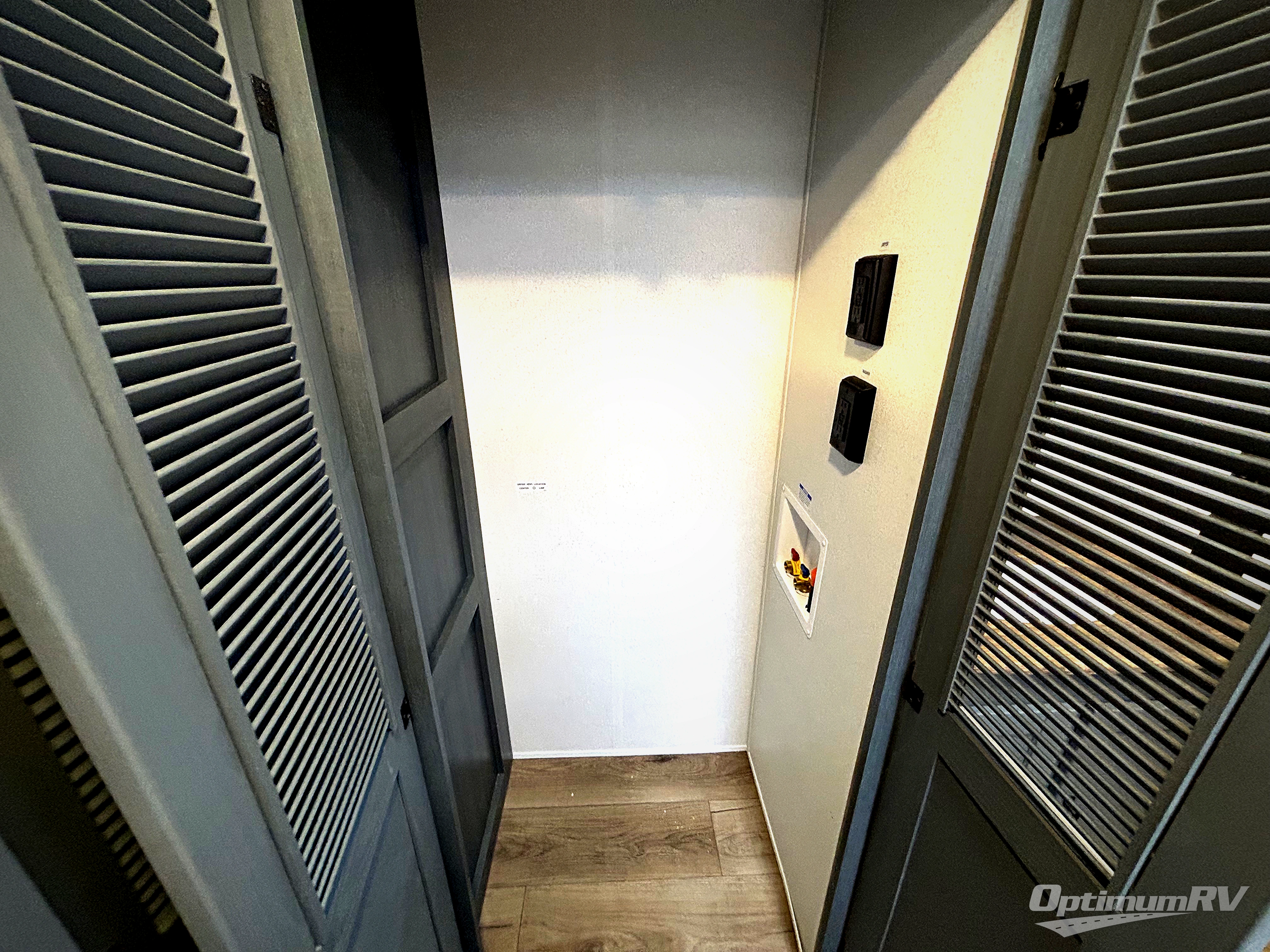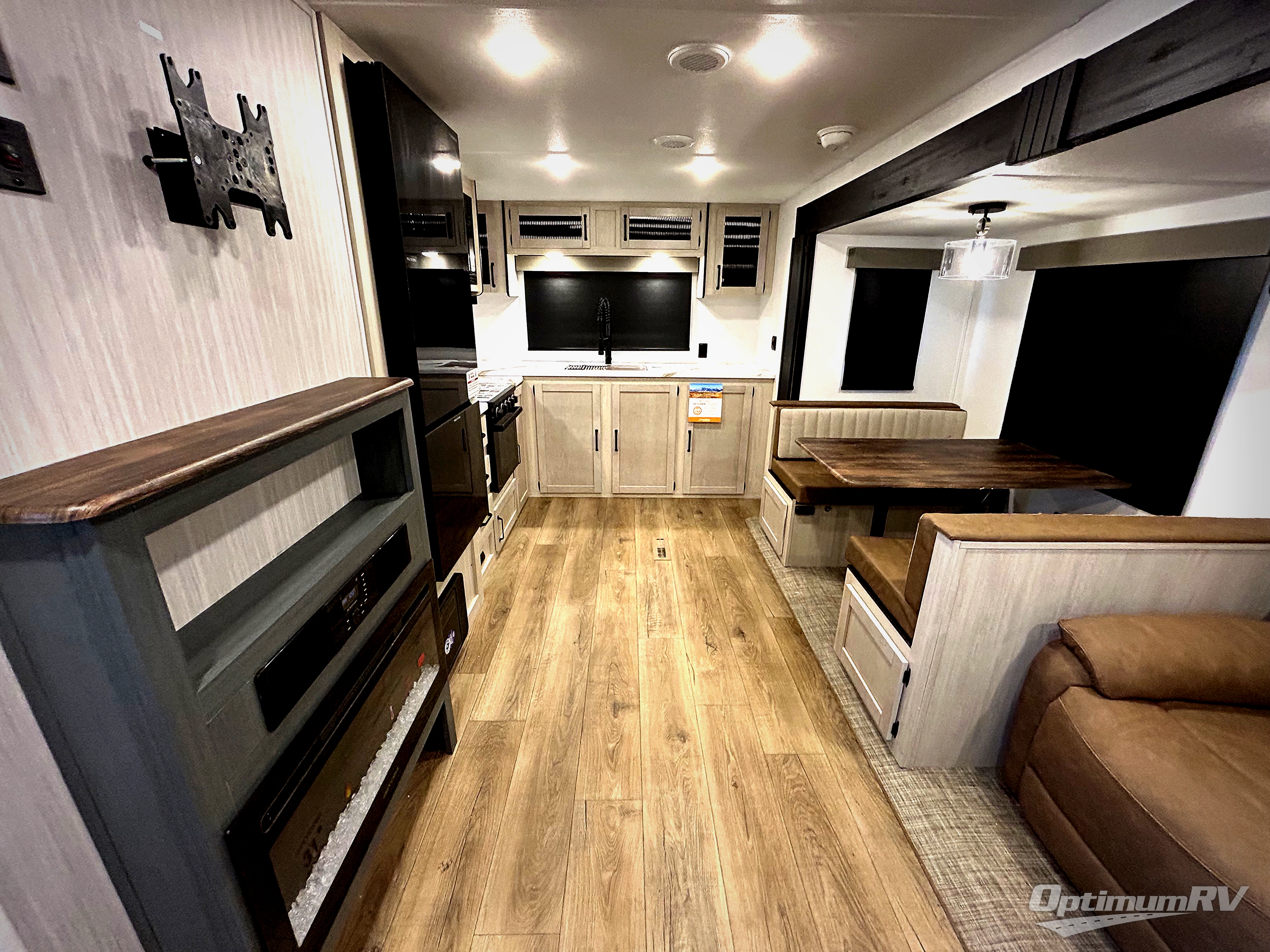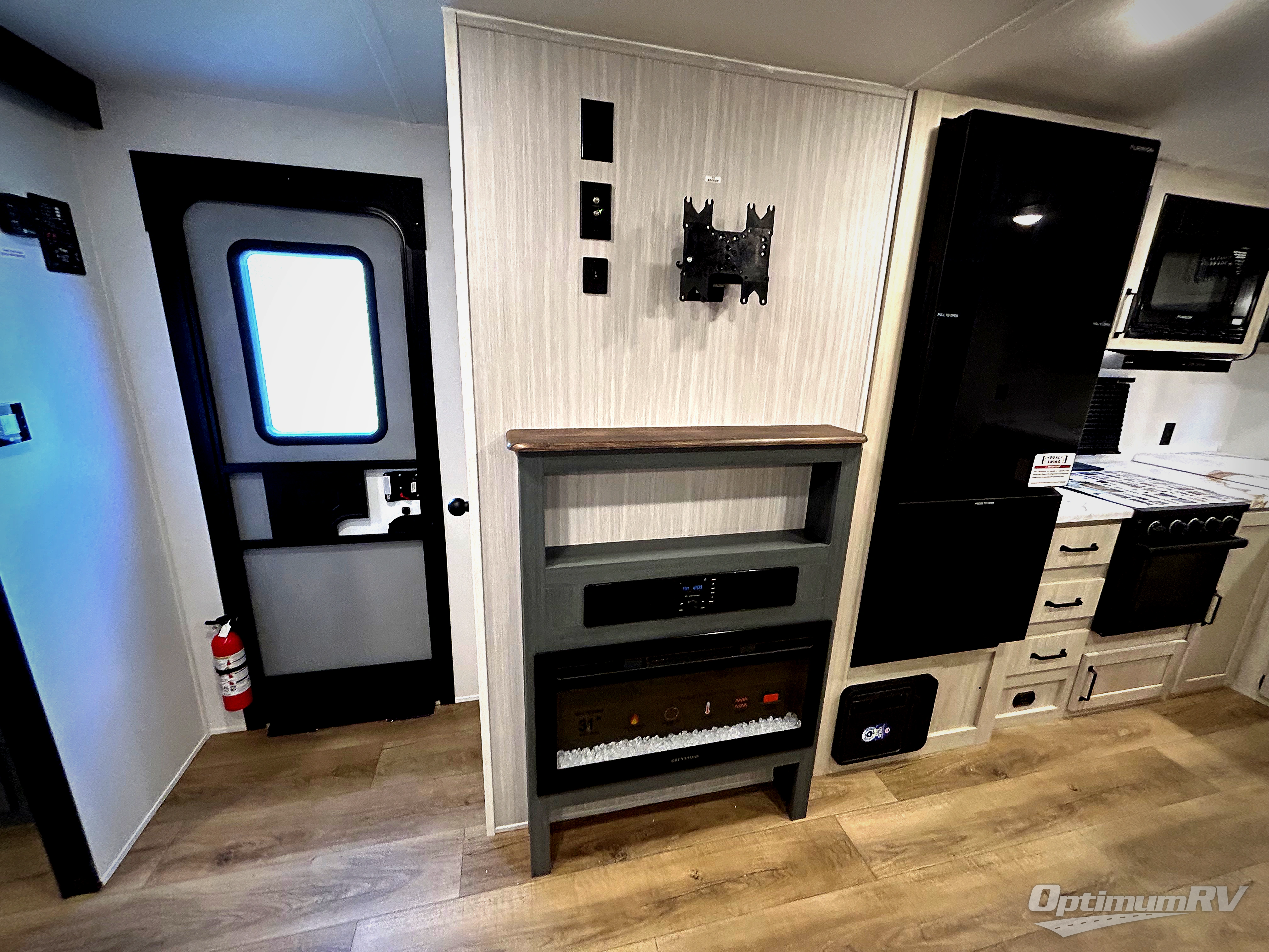 You'll love camping in this double slide out travel trailer with a rear kitchen and a spacious front bath! There is a 40" shower here, along with a linen closet, shirt closet, plus a closet with washer/dryer prep. The master bedroom includes a king bed slide out, dual bedroom dressers, a desk and a TV hookup if you want the option to watch movies in bed. The combined kitchen and living area is made open by the large slide out, which houses the sofa and booth dinette. These pieces of furniture area conveniently across from the entertainment center and fireplace to make it feel more like home. The chef of your group will appreciate generous counter space in the rear kitchen, and if they like to cook outdoors, and optional mini kitchen with a griddle can be added!