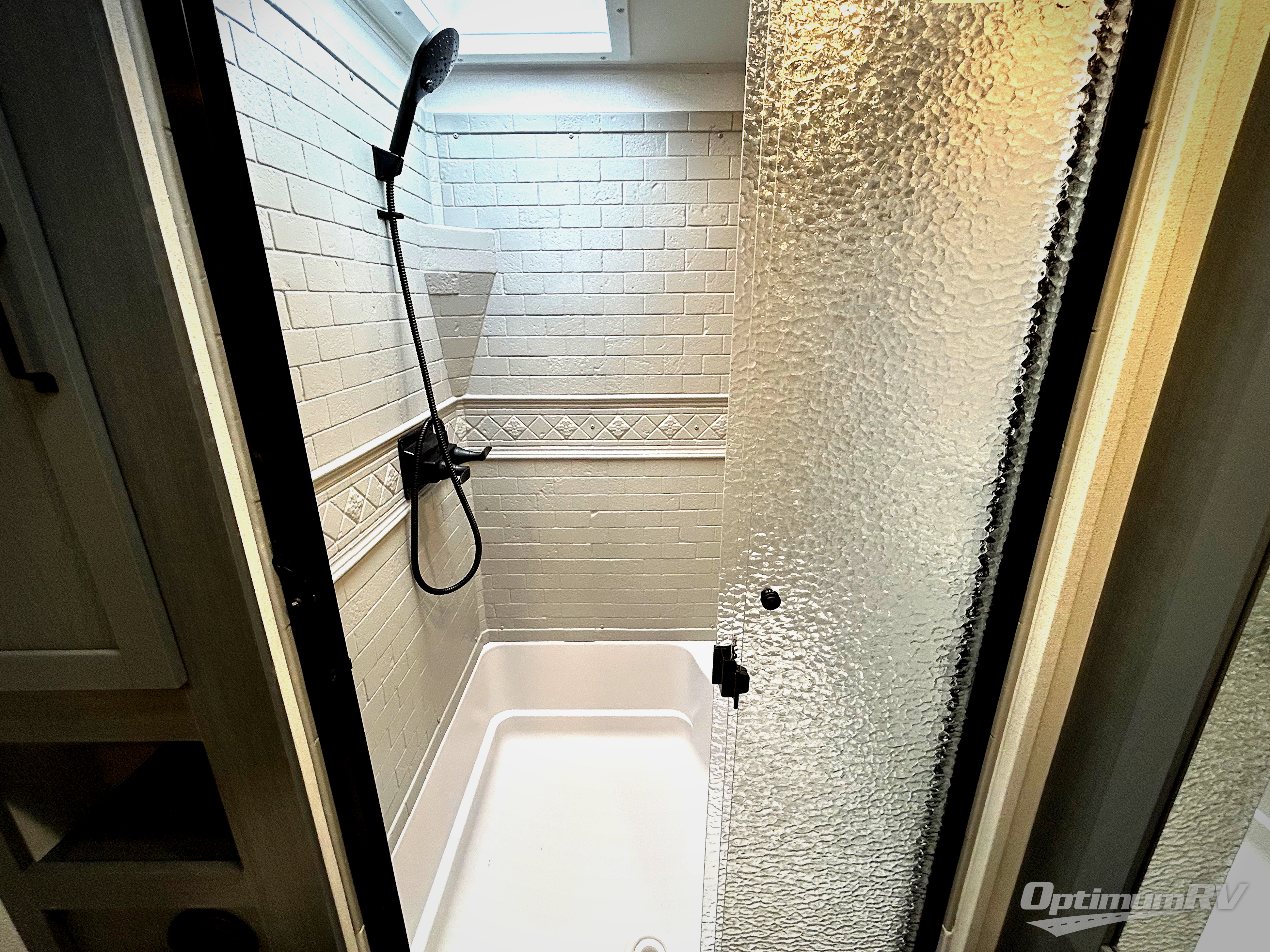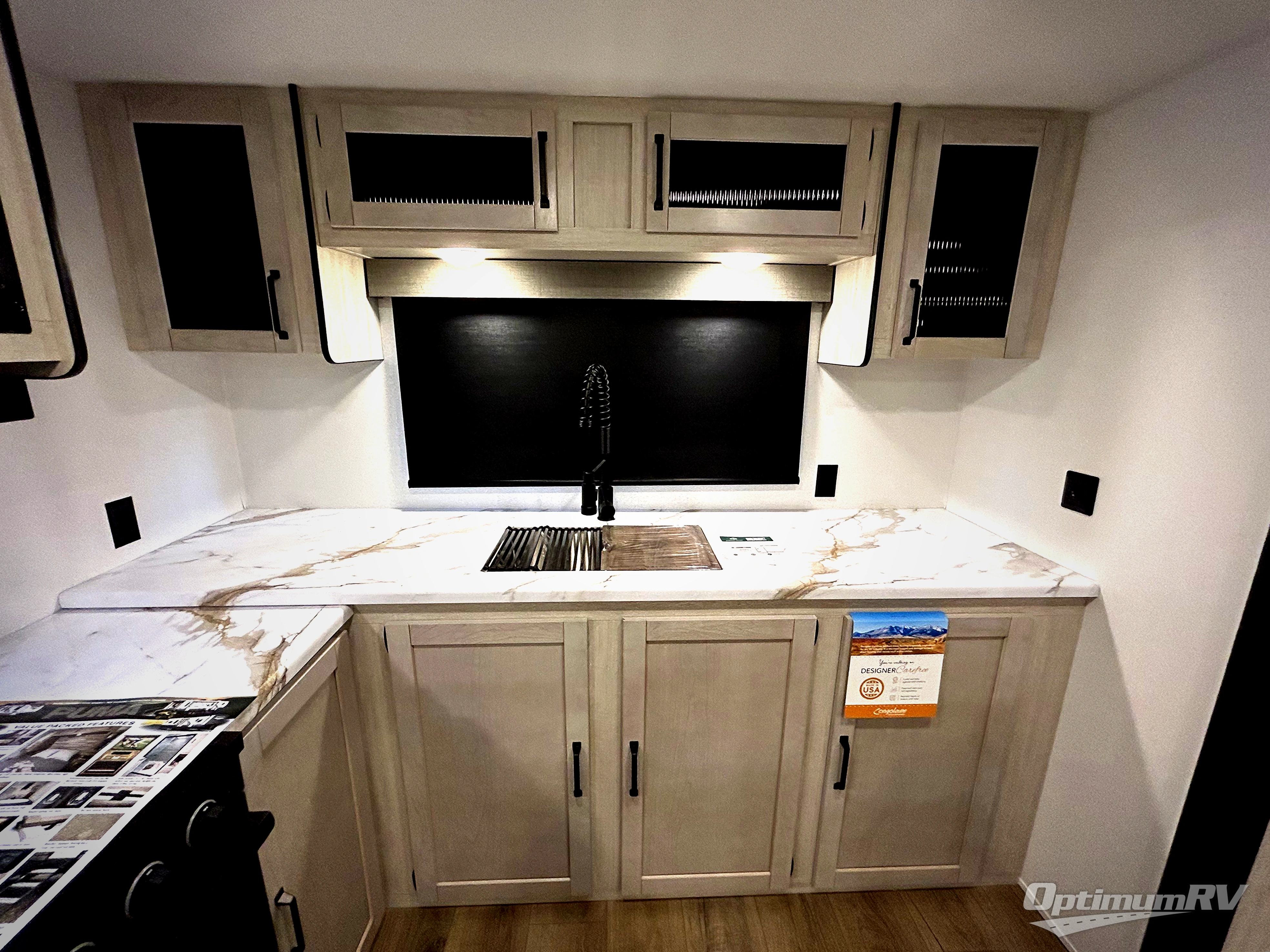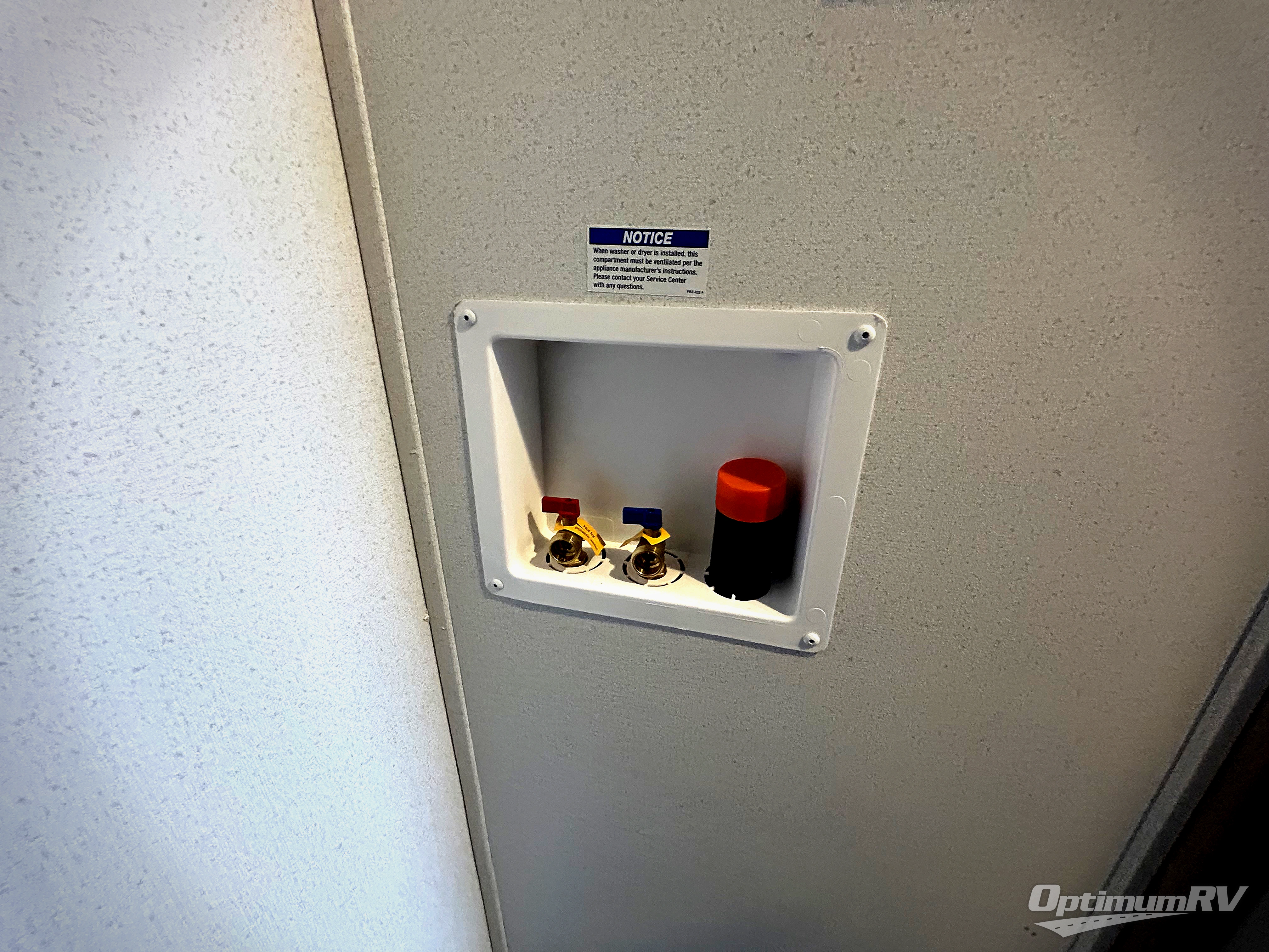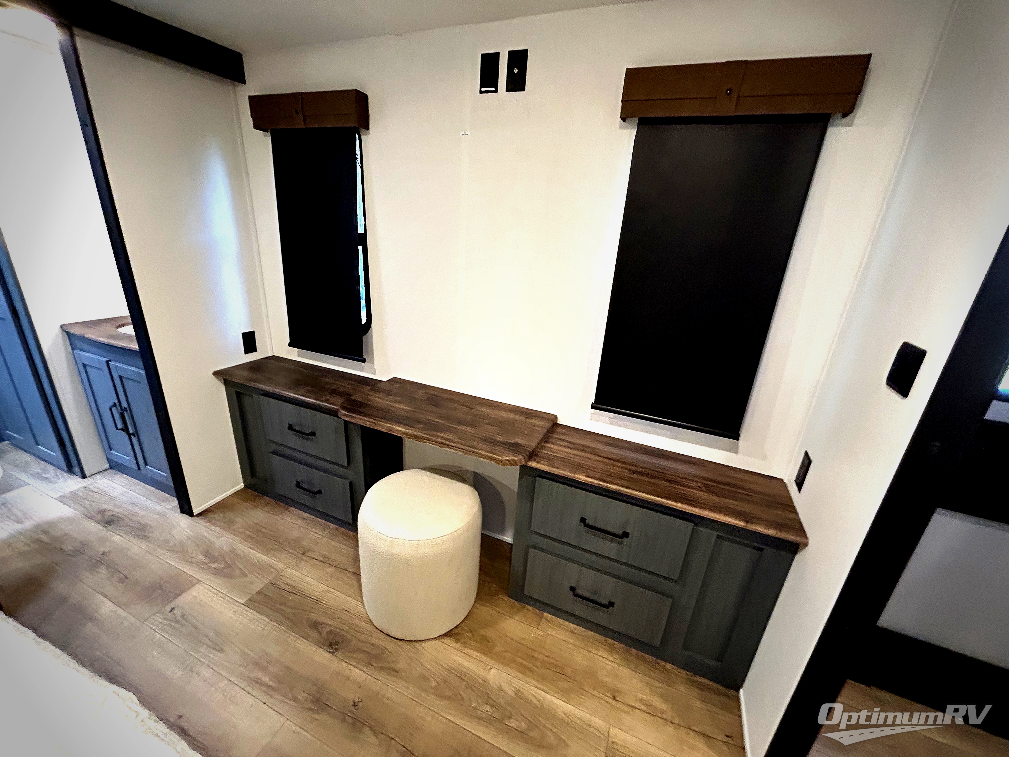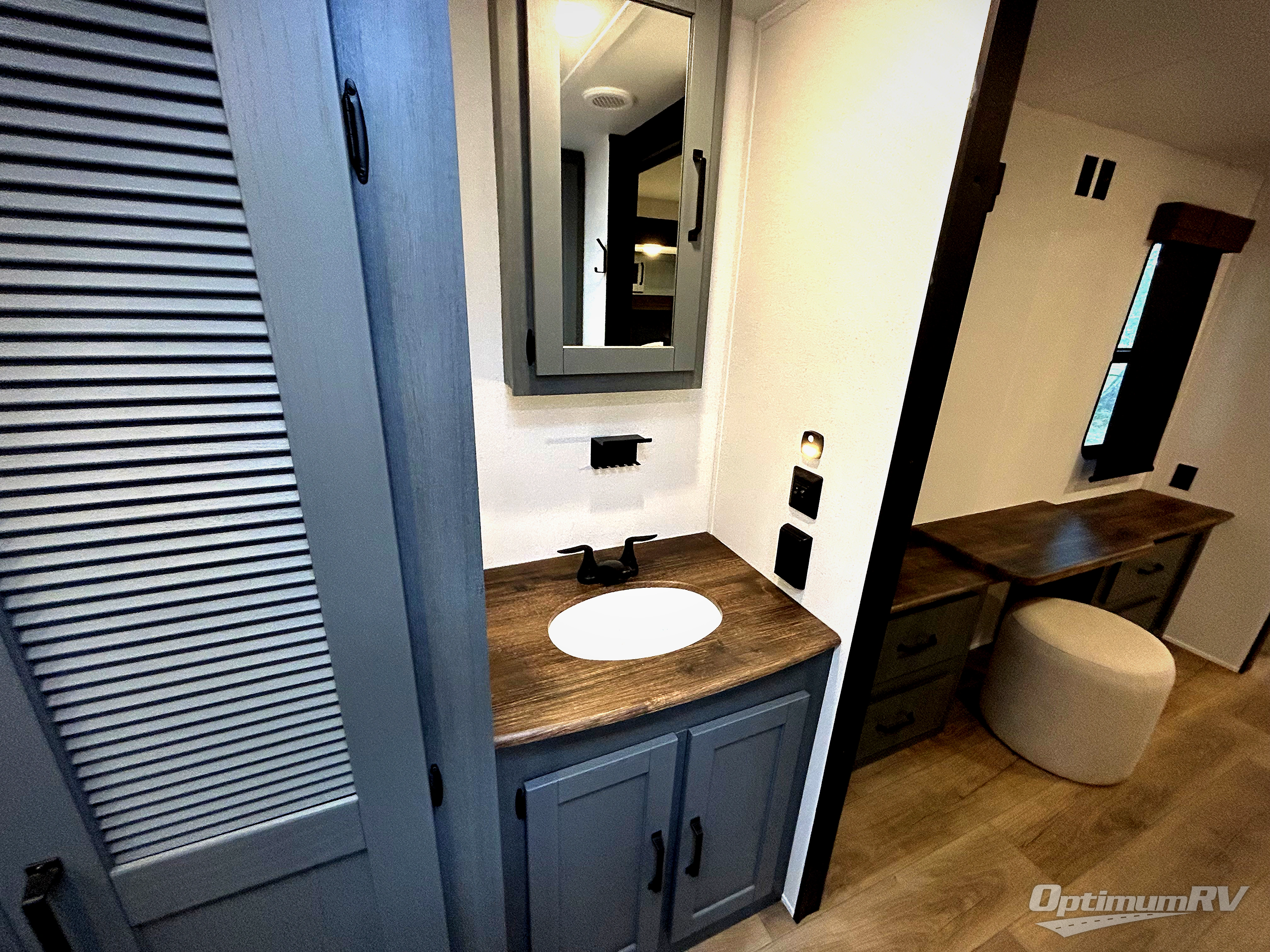 You'll love camping in this double slide out travel trailer with a rear kitchen and a spacious front bath! There is a 40" shower here, along with a linen closet, shirt closet, plus a closet with washer/dryer prep. The master bedroom includes a king bed slide out, dual bedroom dressers, a desk and a TV hookup if you want the option to watch movies in bed. The combined kitchen and living area is made open by the large slide out, which houses the sofa and booth dinette. These pieces of furniture area conveniently across from the entertainment center and fireplace to make it feel more like home. The chef of your group will appreciate generous counter space in the rear kitchen, and if they like to cook outdoors, and optional mini kitchen with a griddle can be added!