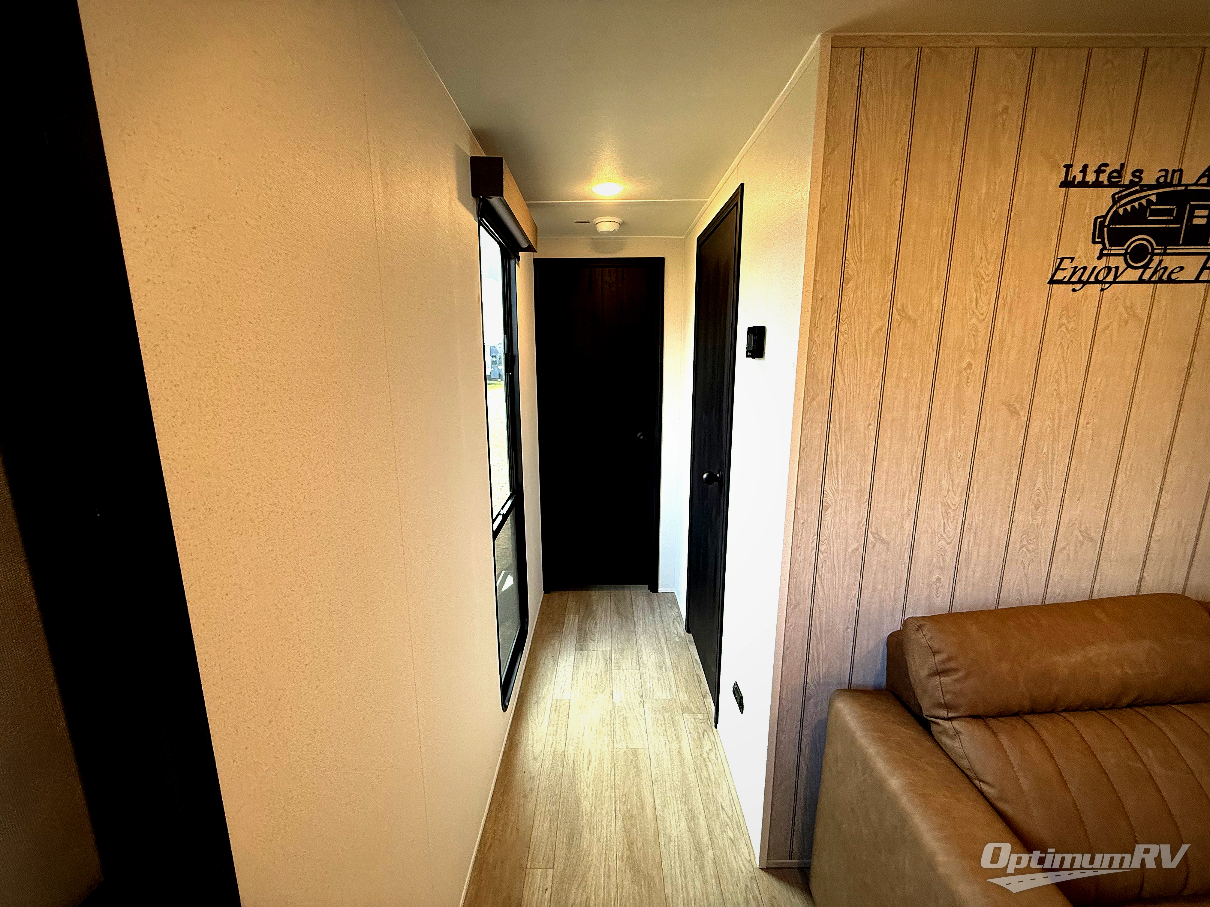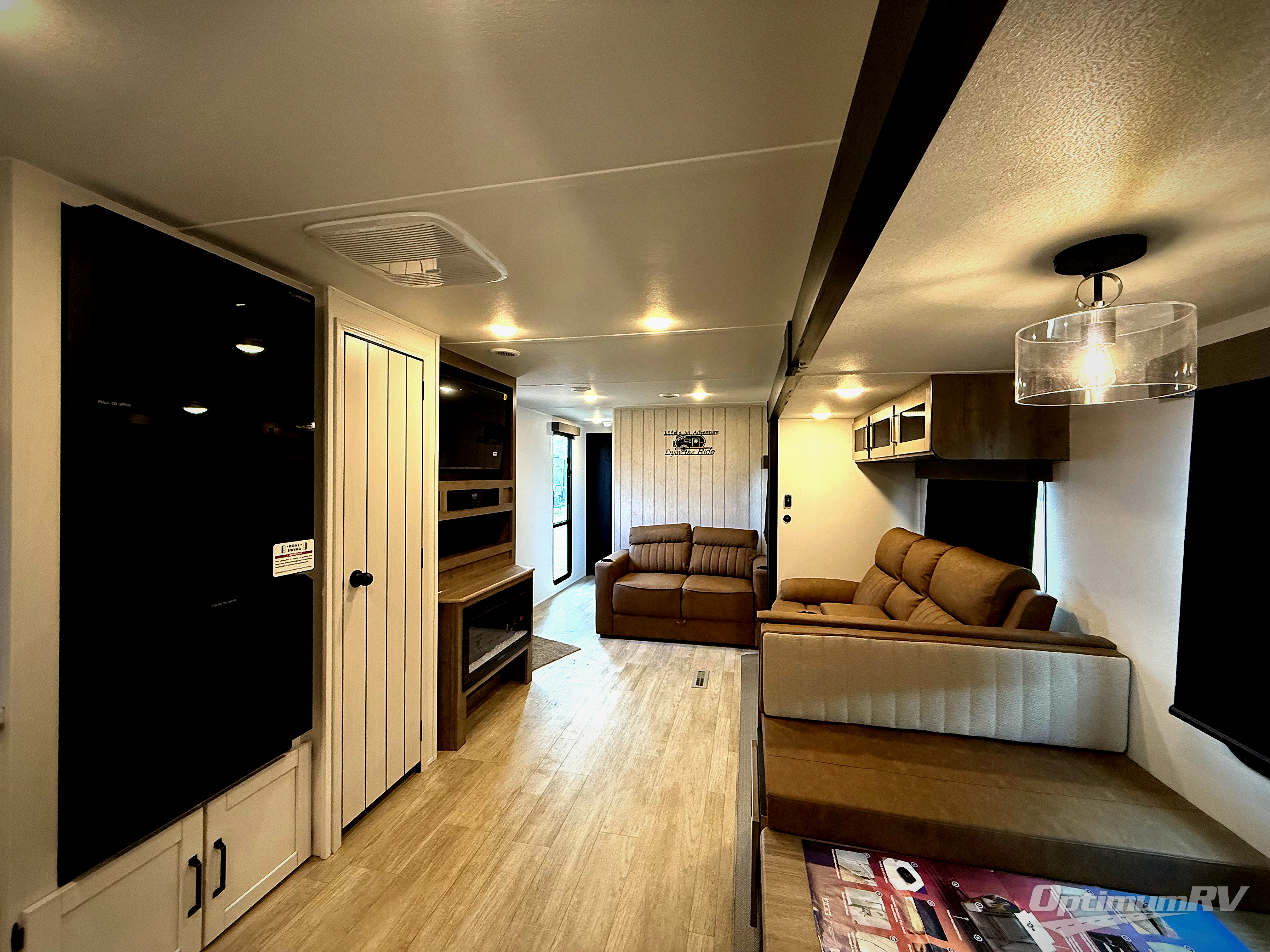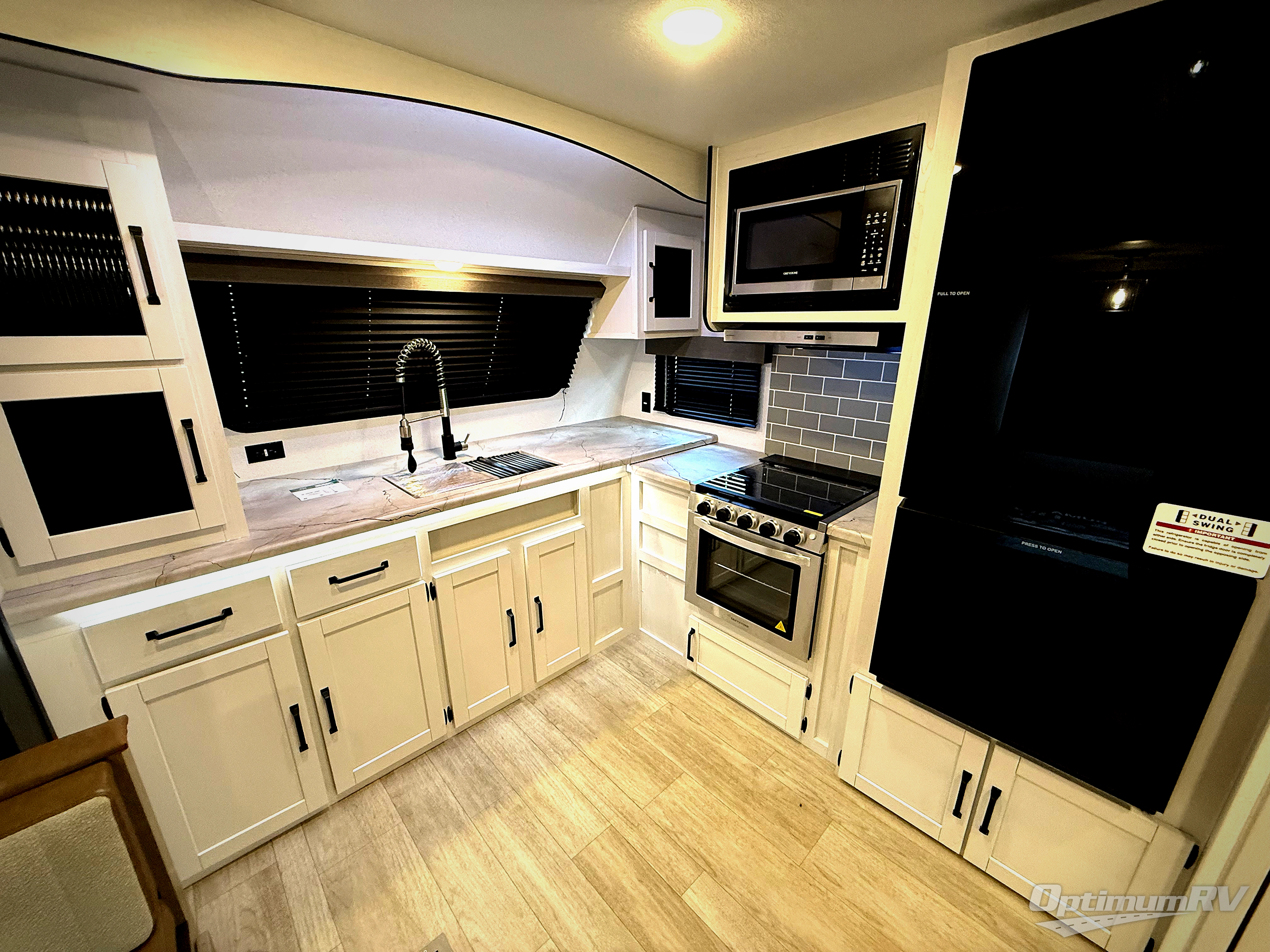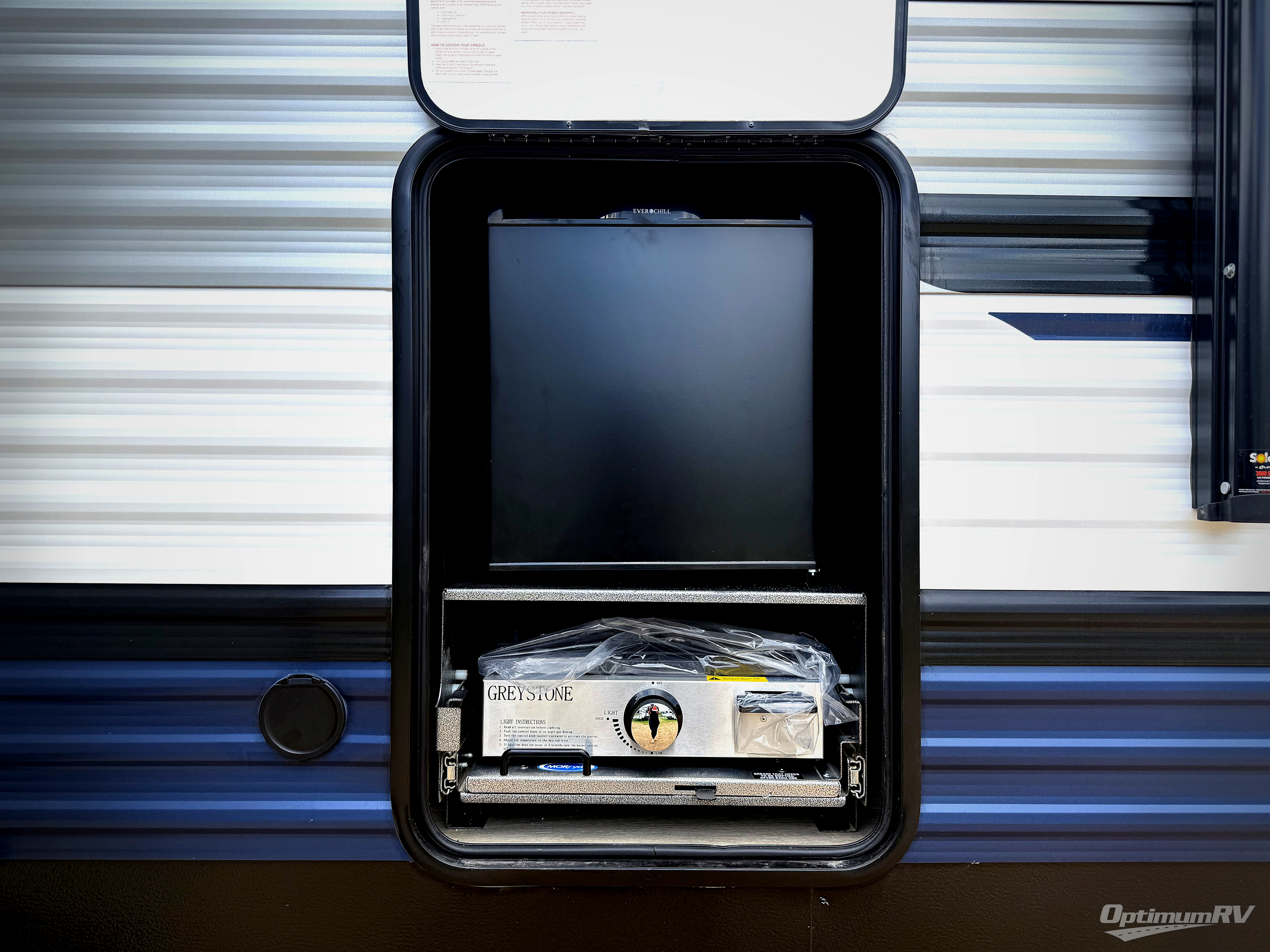 Experience a home away from home with this travel trailer! The front kitchen has everything you will need to prepare your best meals and you can enjoy them at the booth dinette. The rear private bedroom has a 72" x 80" king bed slide across from a dresser, a wardrobe, and a closet with washer and dryer prep. Freshen up in the full bathroom with the 32" x 40" shower and then enjoy a cup of coffee relaxing in one of the two recliners or on the sofa! Choose the optional outside micro kitchen with a griddle for even more convenience!