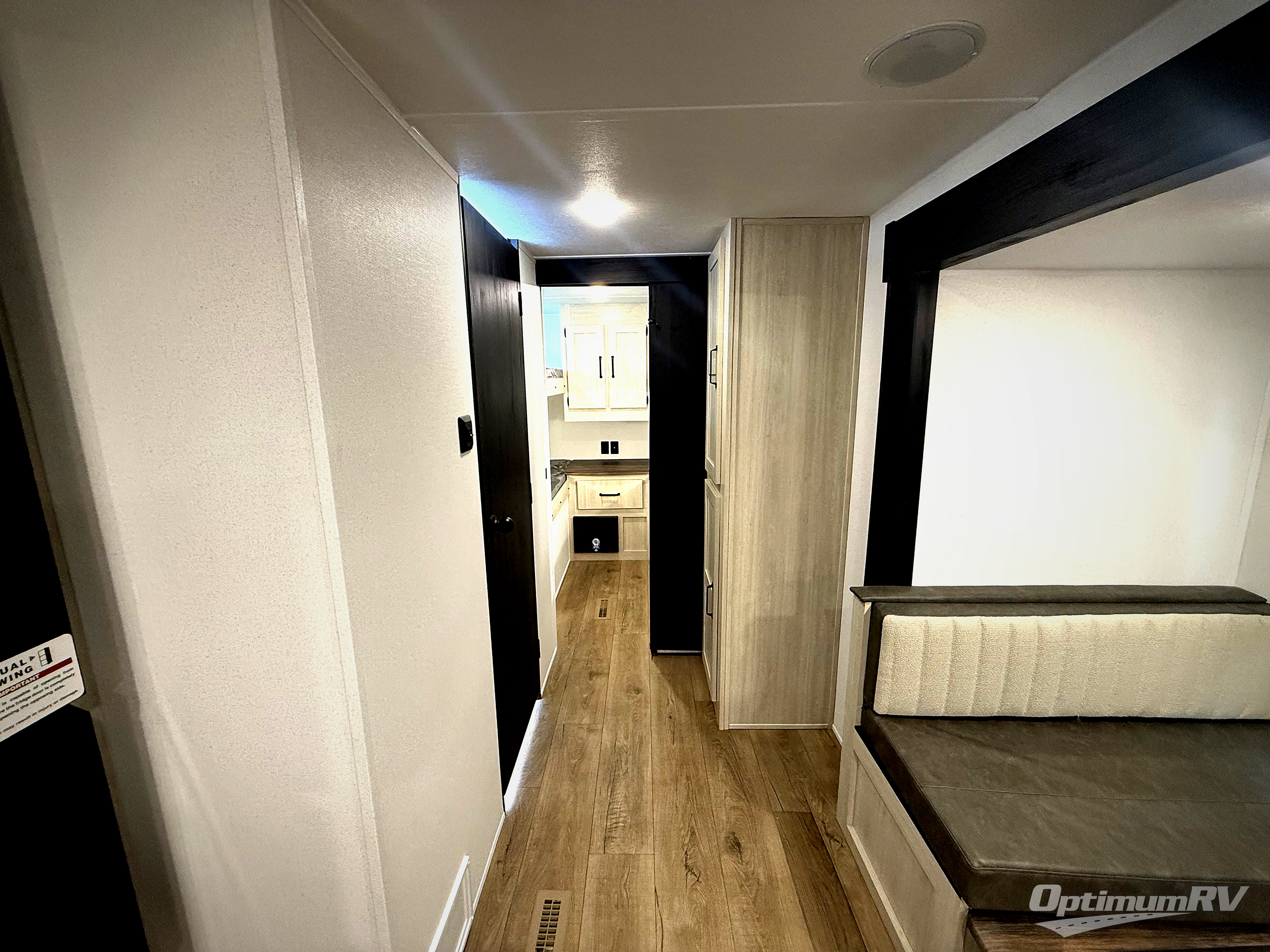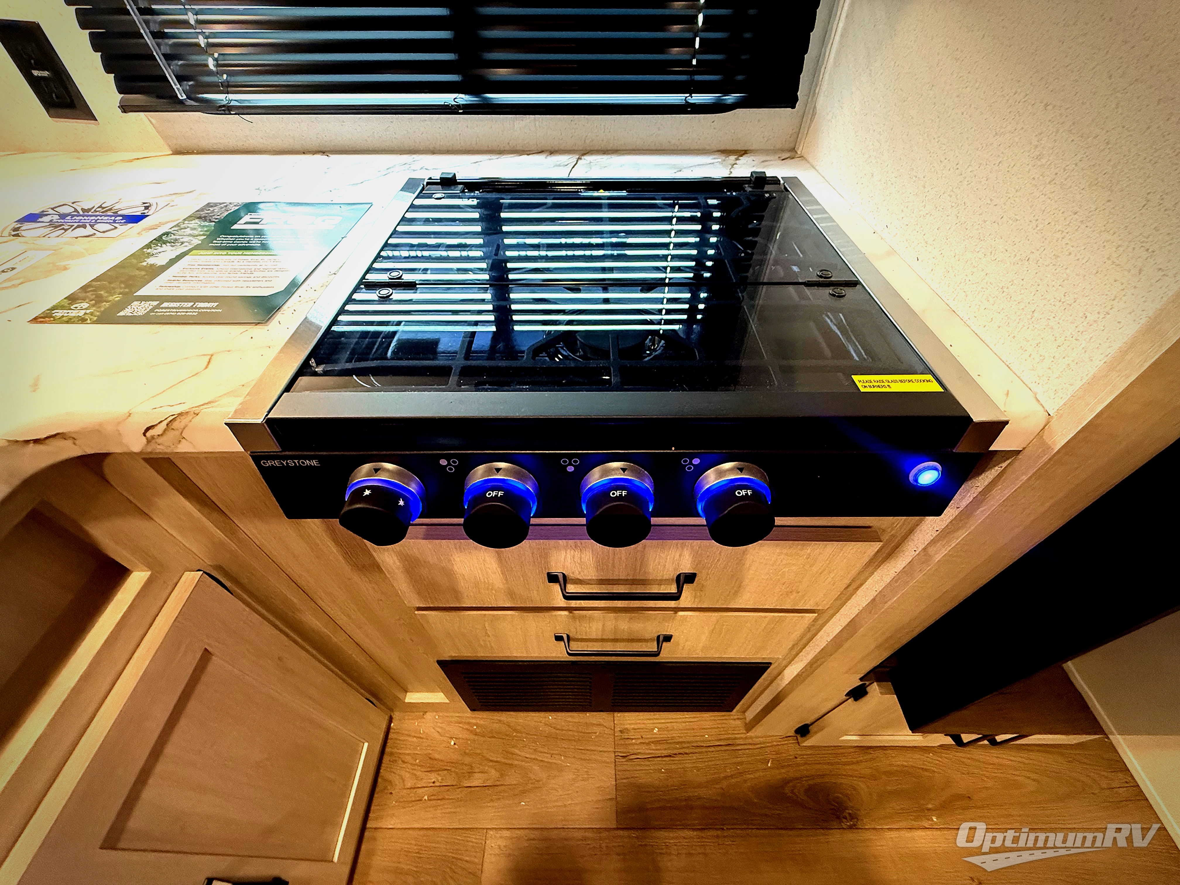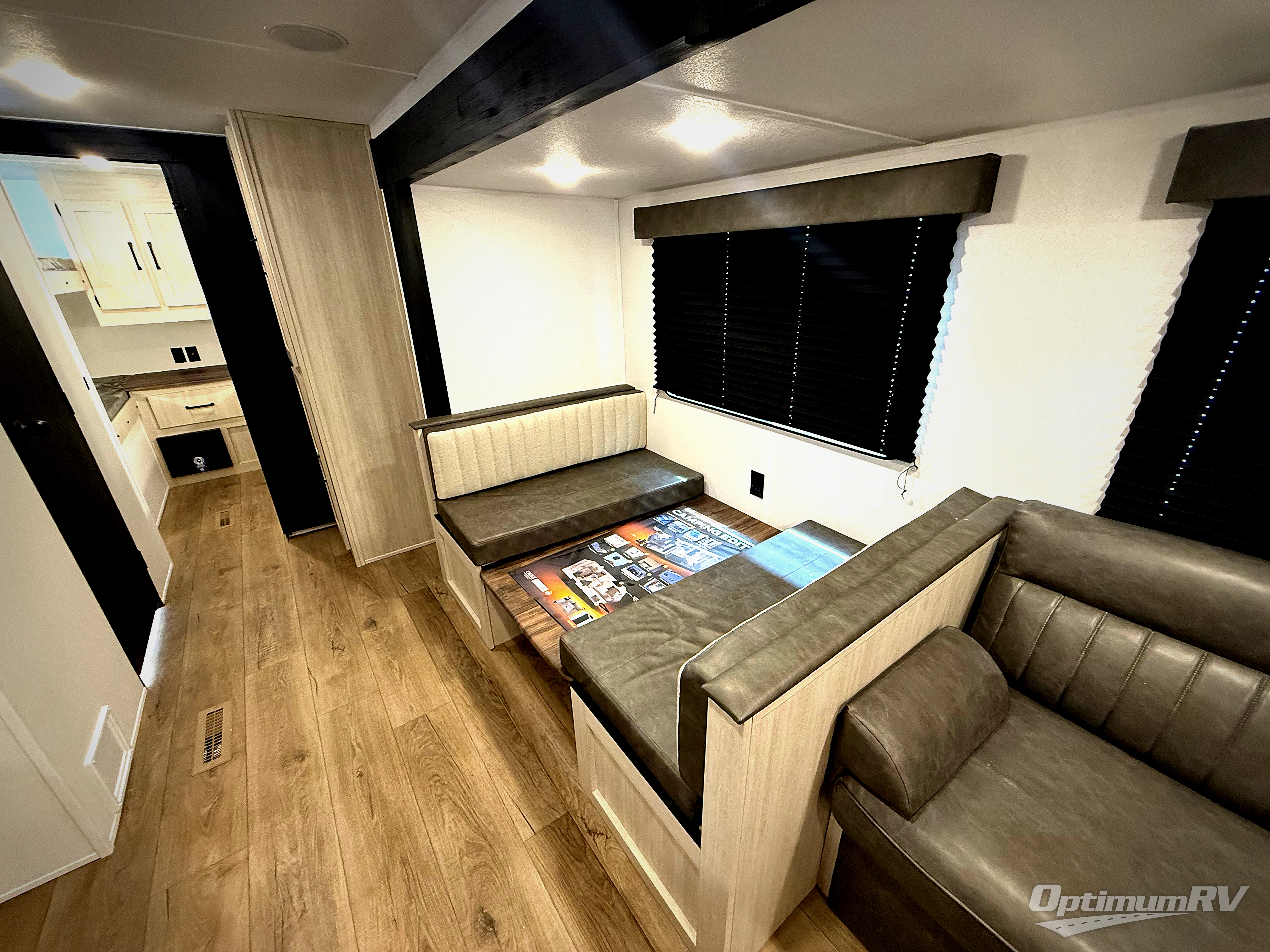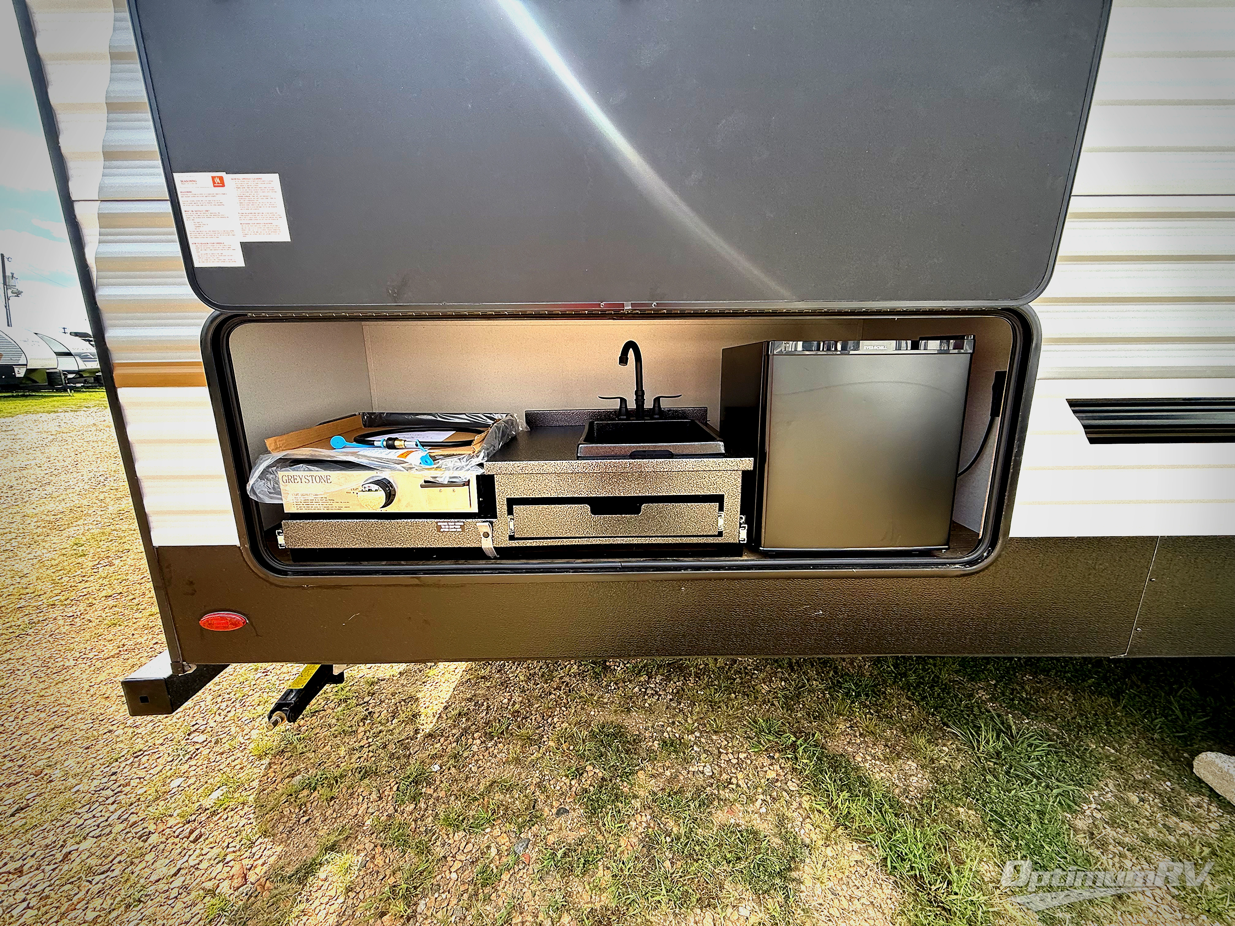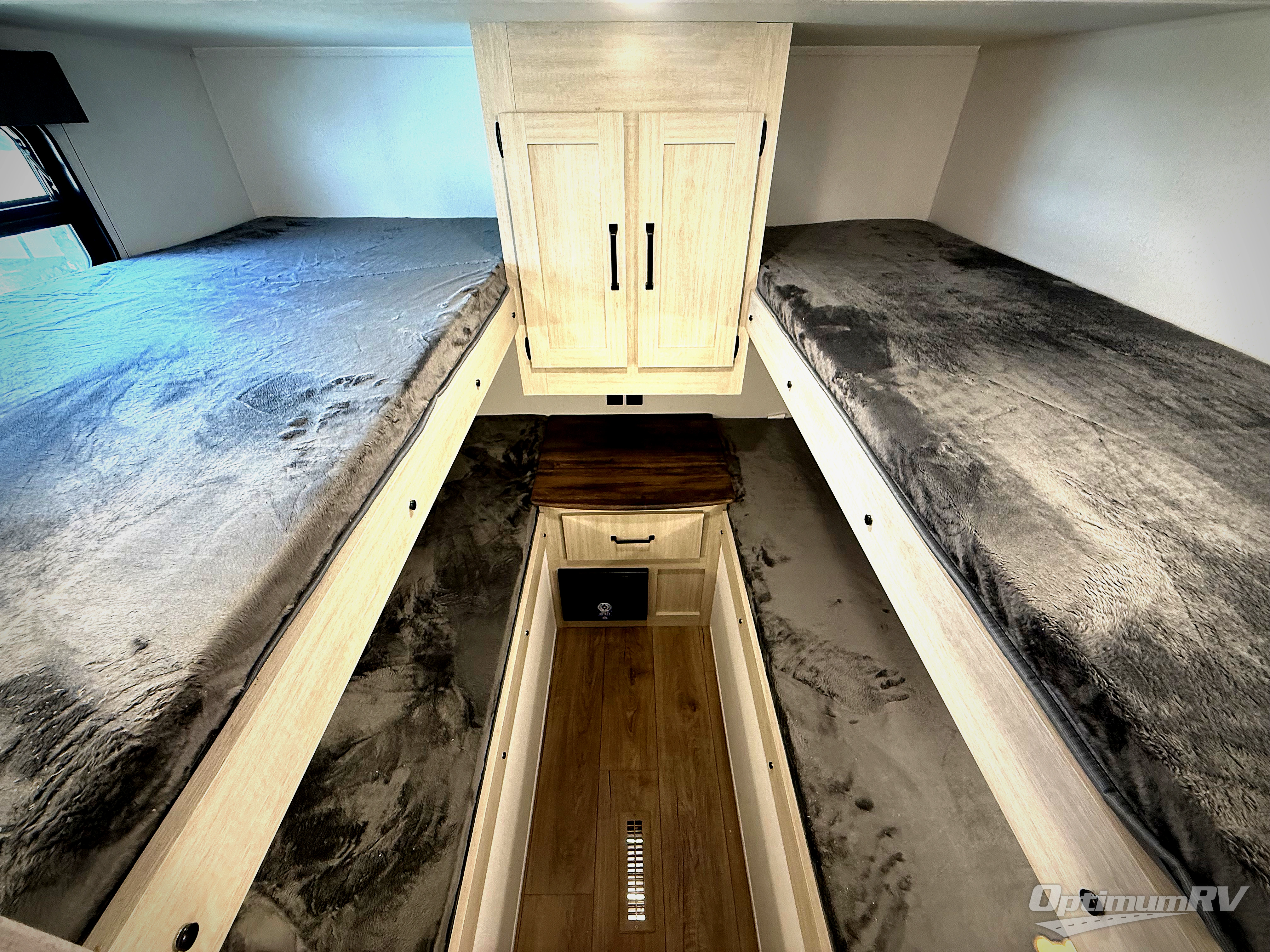 If you're looking for more space, this double axle unit features a large slide so you can walk about freely. Here, you'll find the booth dinette and sofa, which sit across from the optional TV if you want to enjoy movie nights. The full kitchen includes a stainless microwave and three burner cooktop to make meals, plus a pantry and 12V refrigerator for food storage. And an optional outside kitchen with a griddle can be added if you enjoy cooking outdoors! Your guests or littles are sure to enjoy the rear private bunkhouse with four bunk beds and a wardrobe for their things!