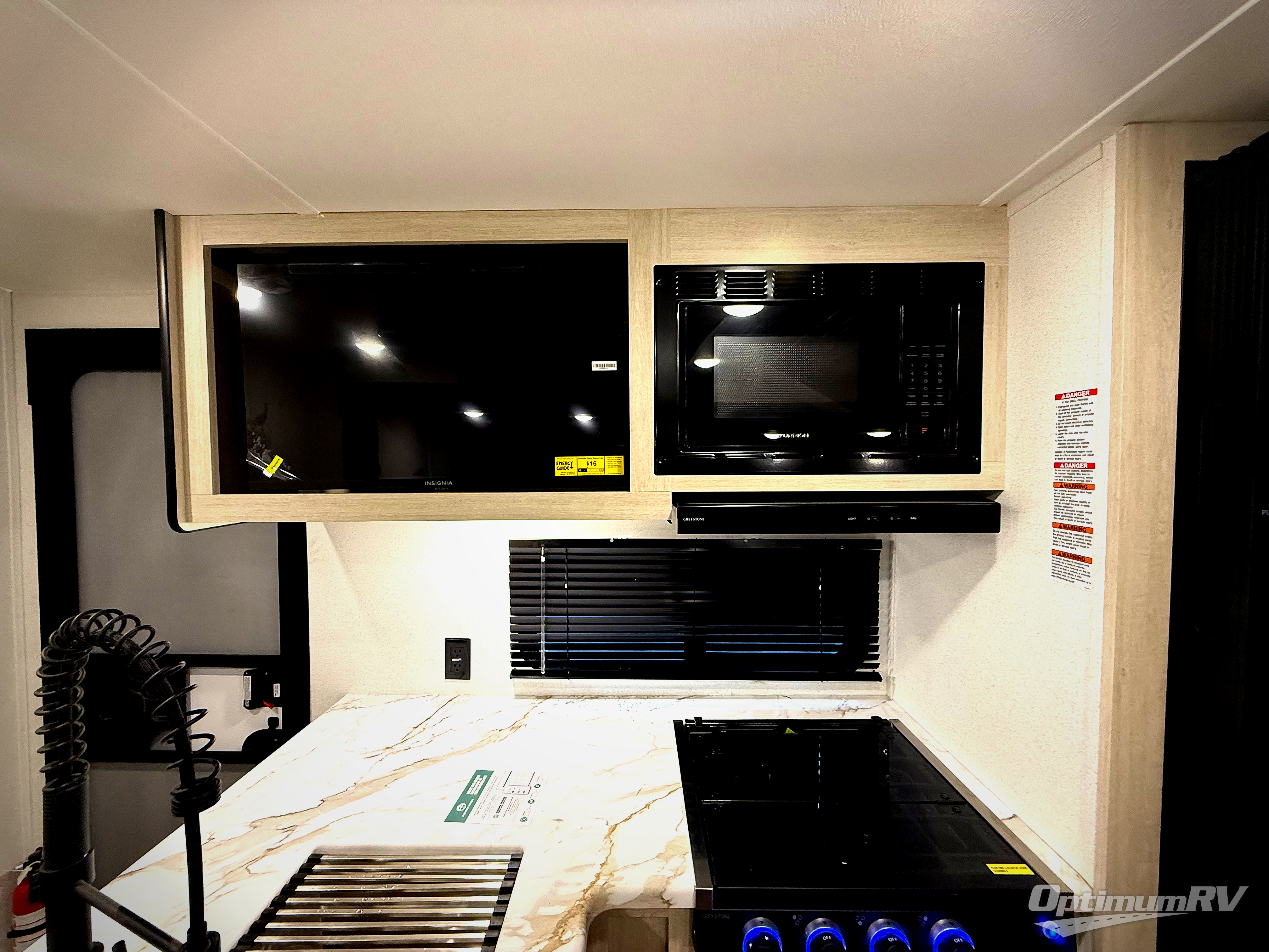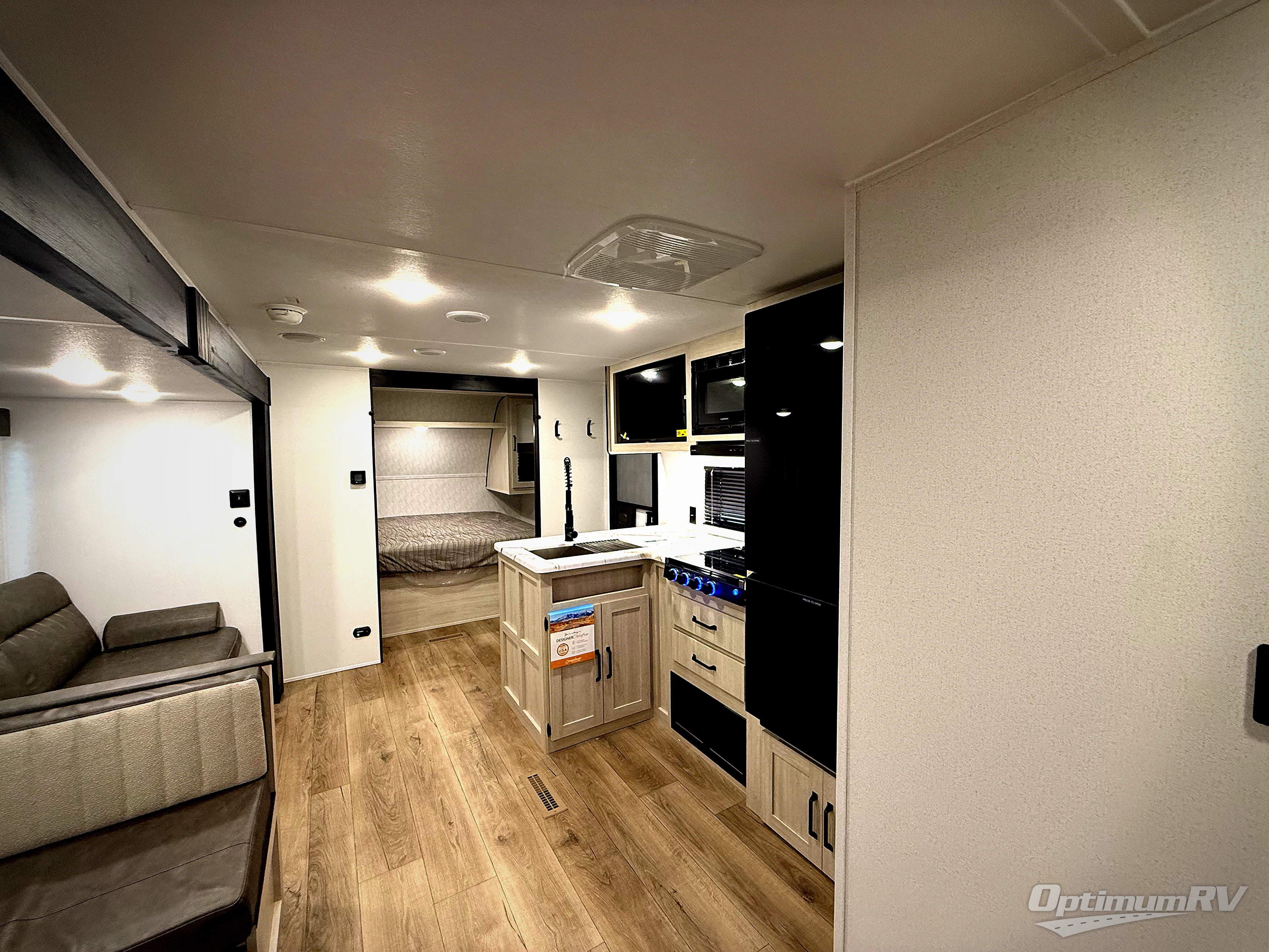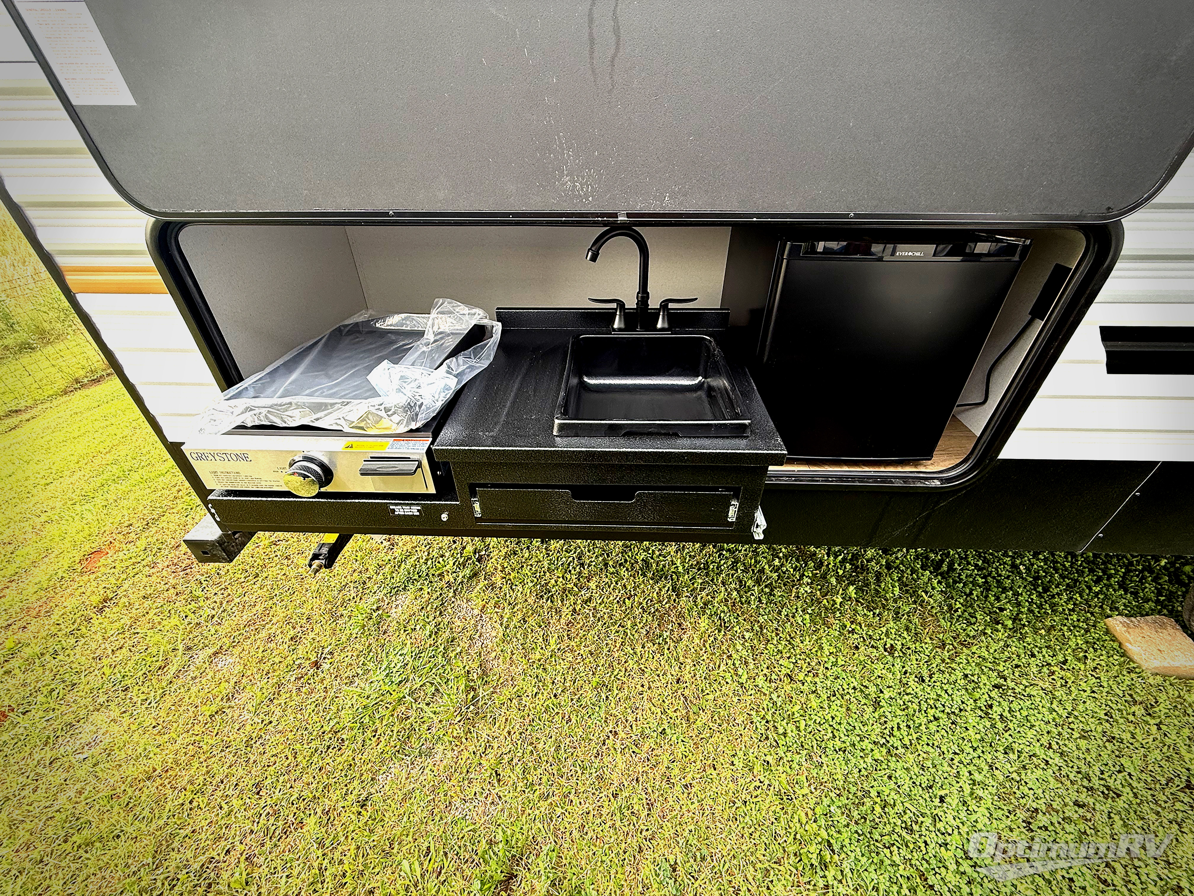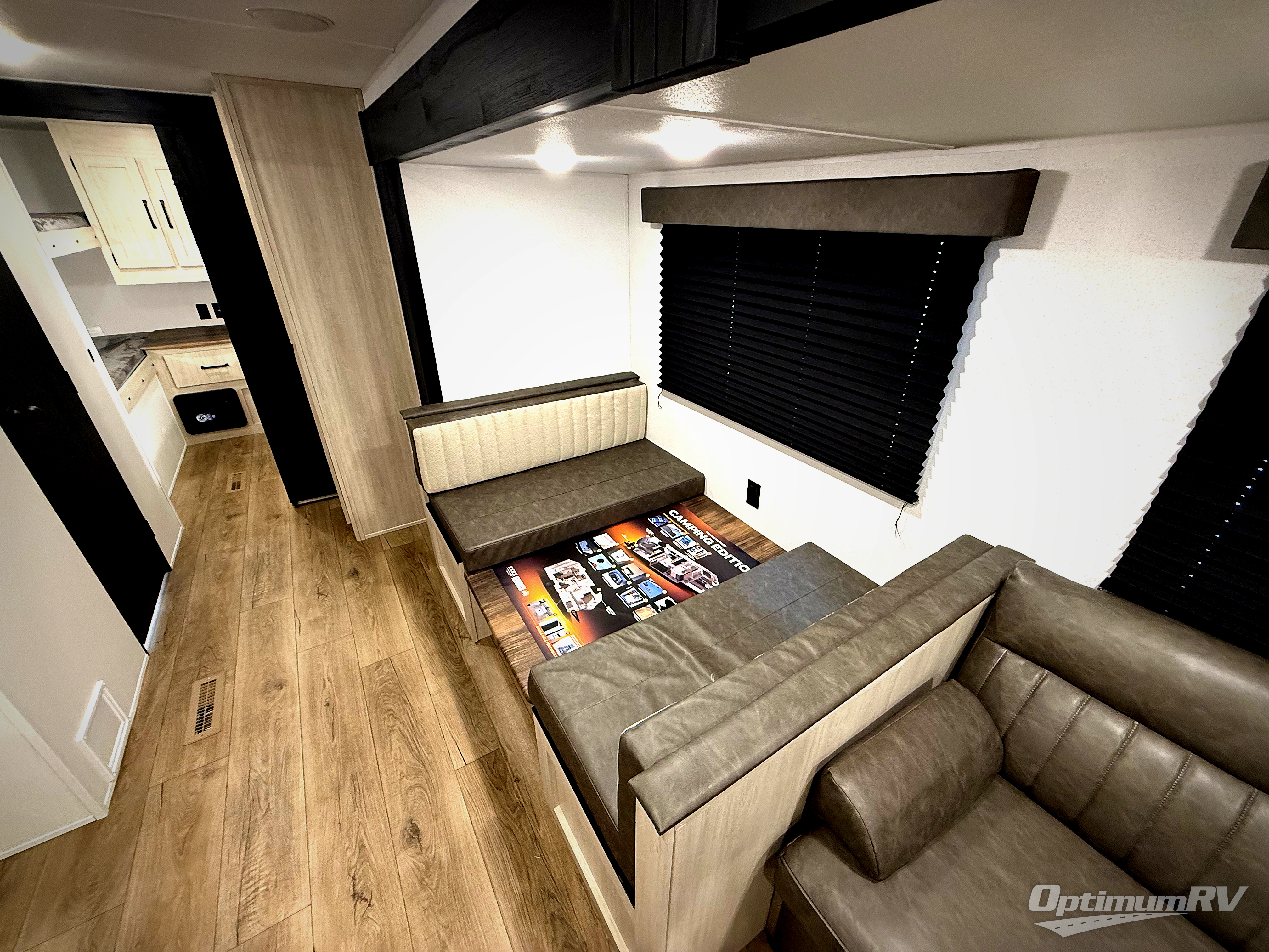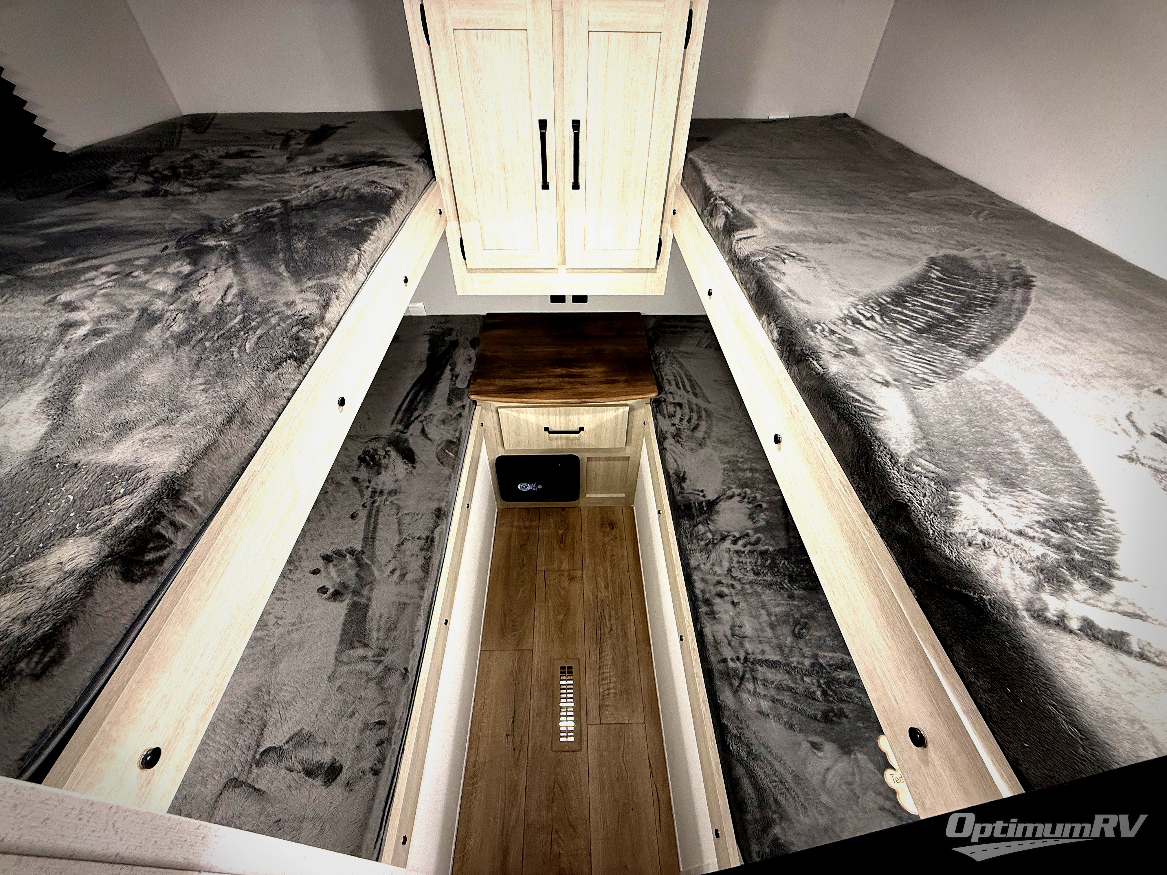 If you're looking for more space, this double axle unit features a large slide so you can walk about freely. Here, you'll find the booth dinette and sofa, which sit across from the optional TV if you want to enjoy movie nights. The full kitchen includes a stainless microwave and three burner cooktop to make meals, plus a pantry and 12V refrigerator for food storage. And an optional outside kitchen with a griddle can be added if you enjoy cooking outdoors! Your guests or littles are sure to enjoy the rear private bunkhouse with four bunk beds and a wardrobe for their things!