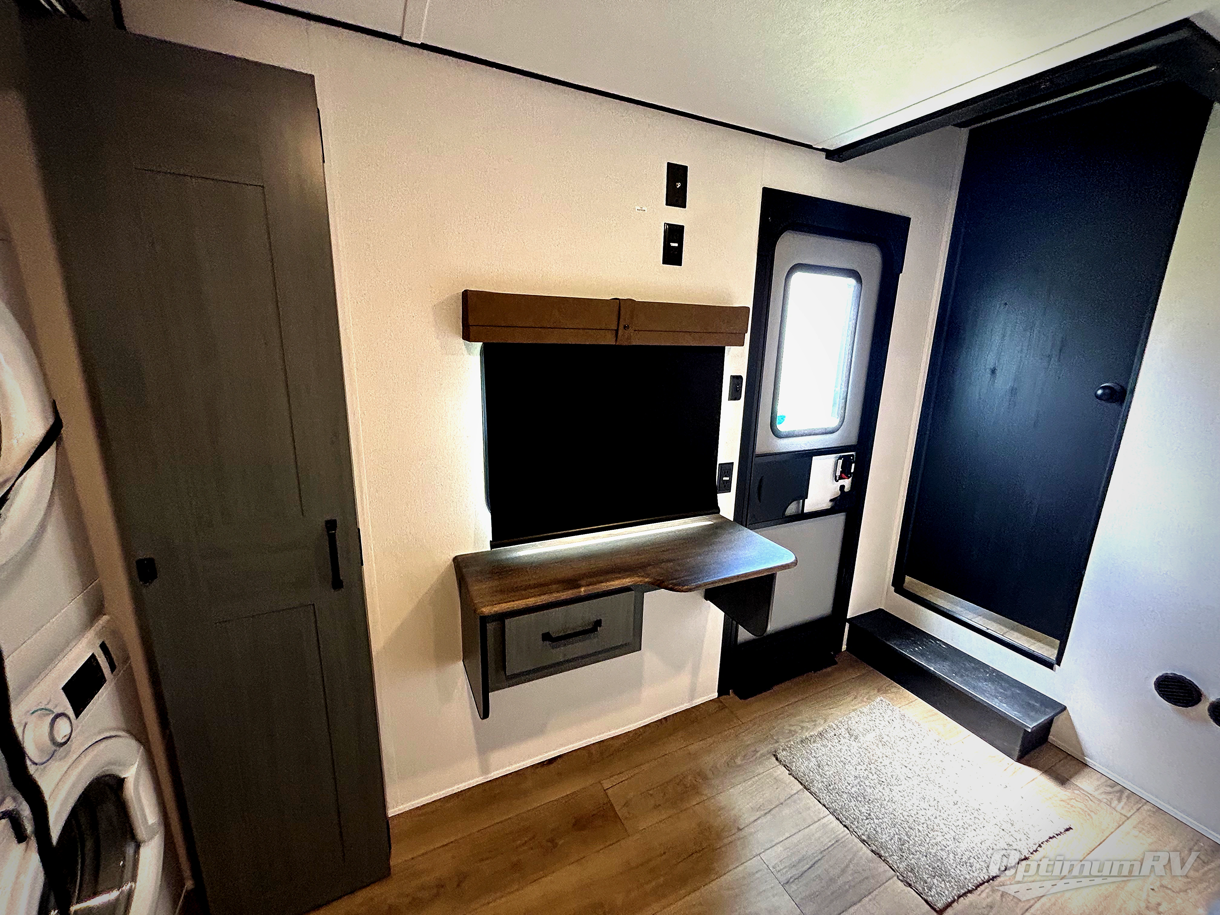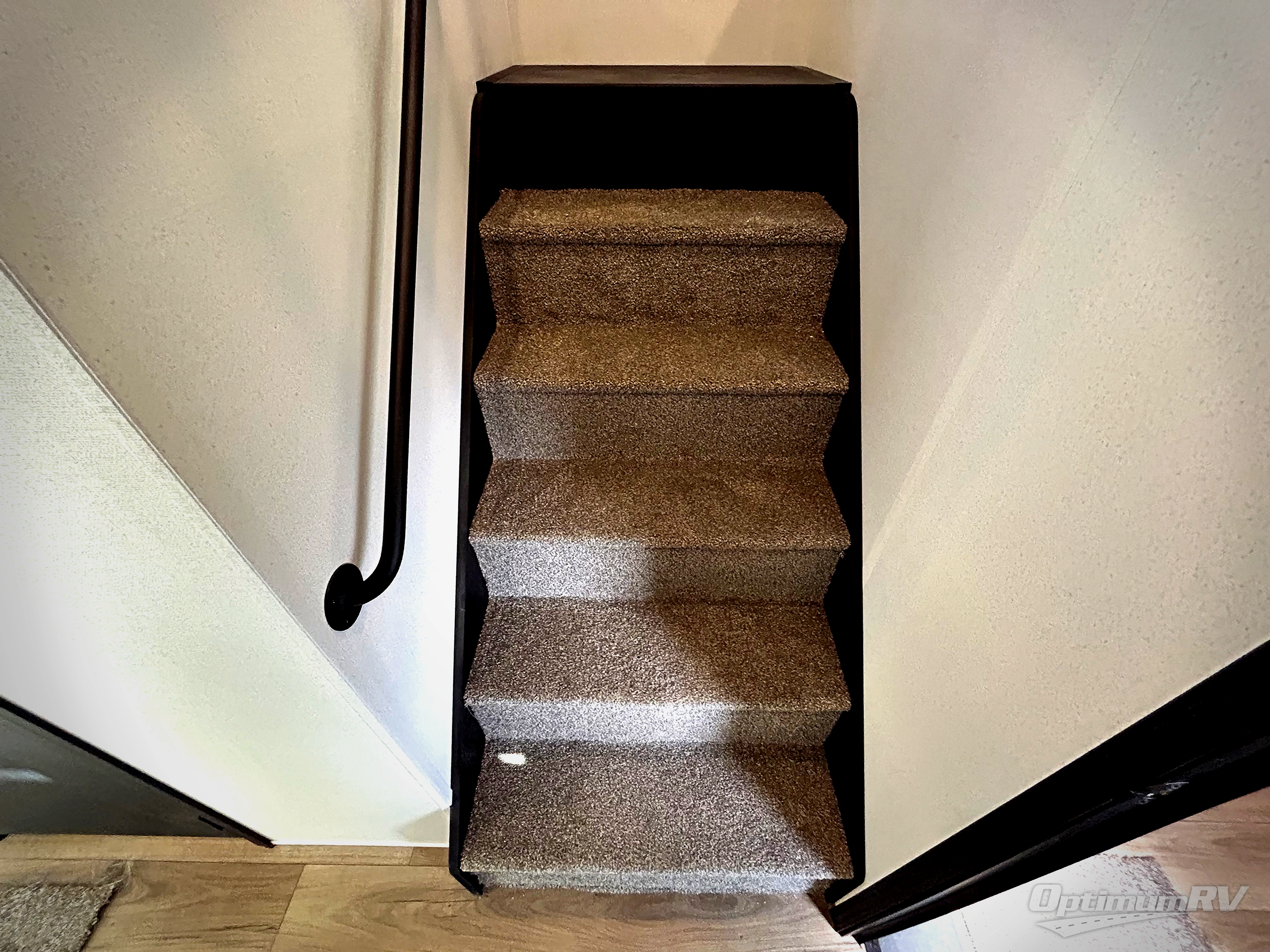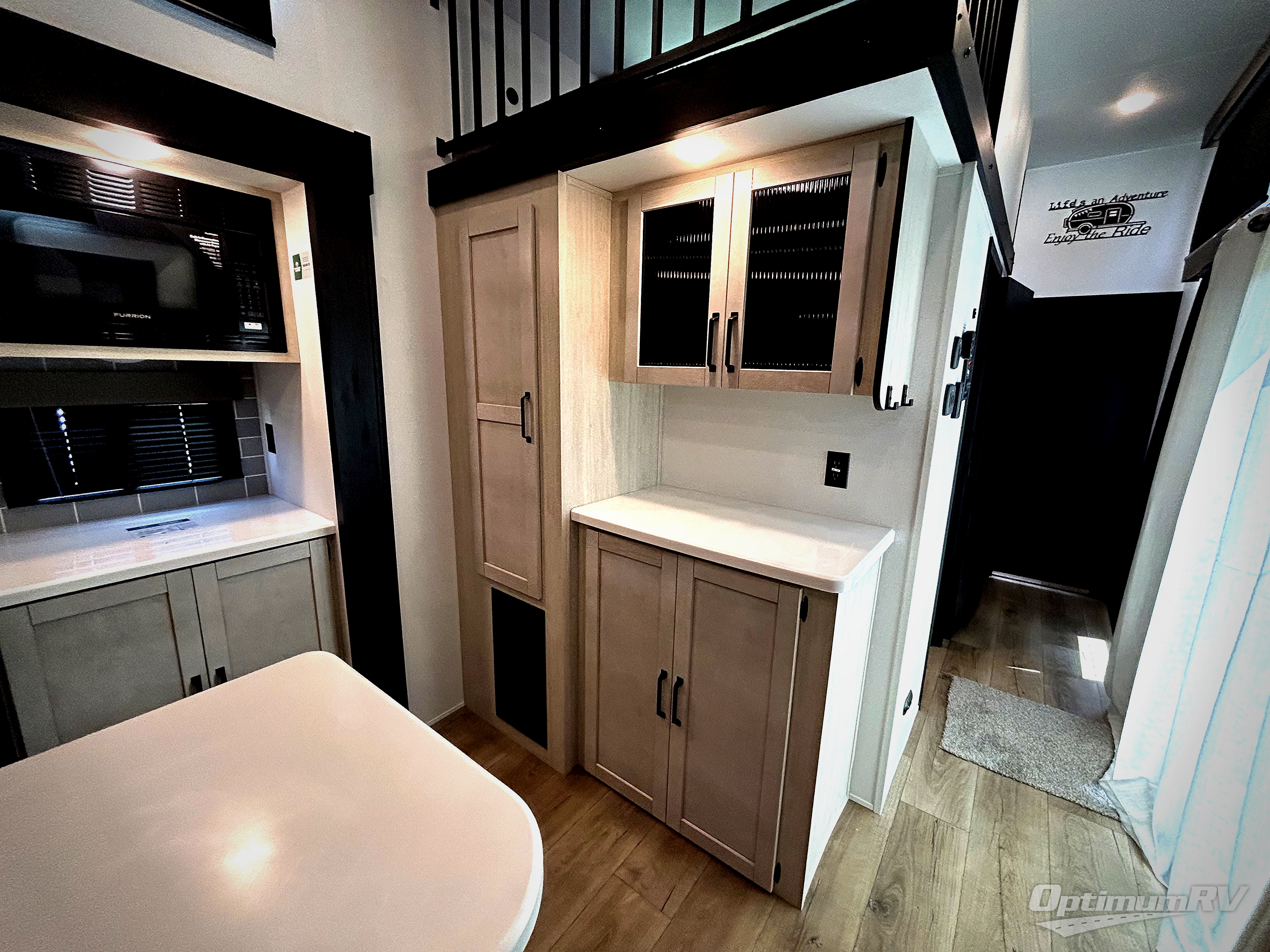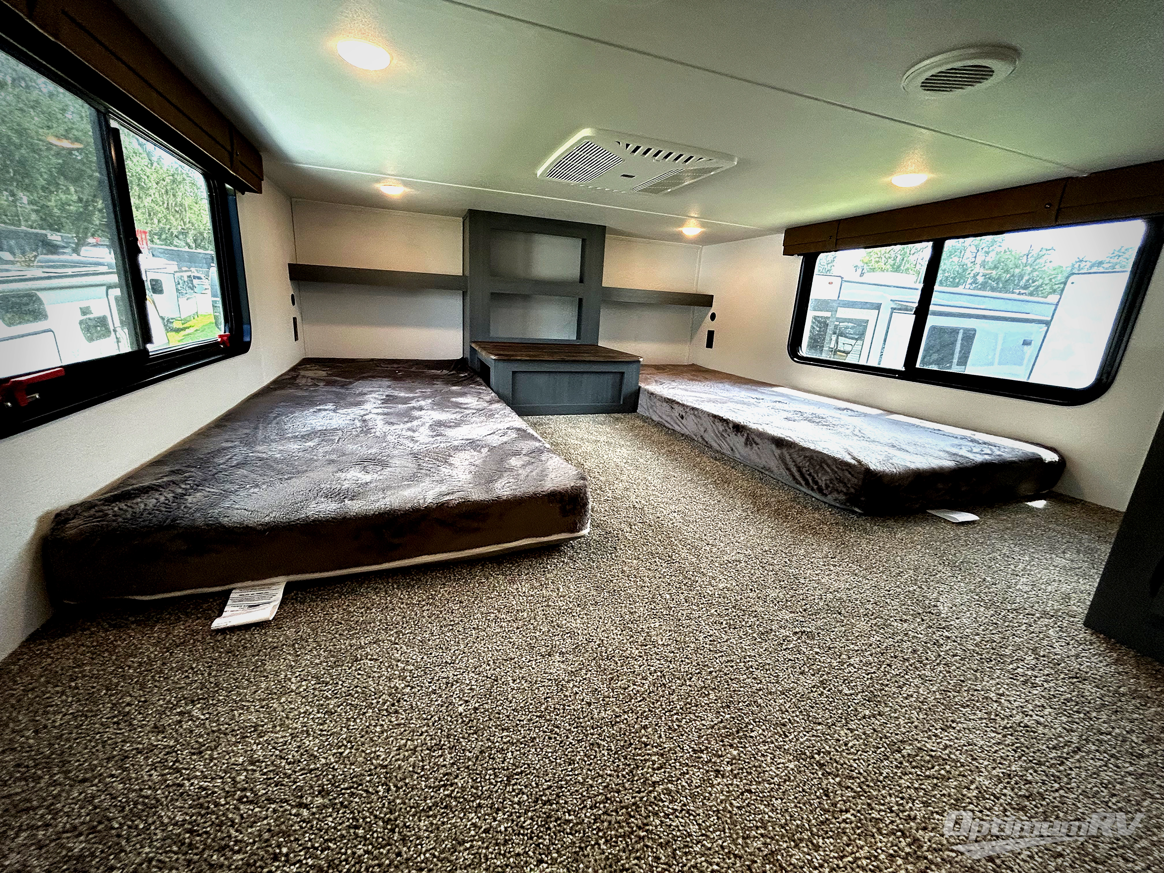 Wherever your destination may be, you can be sure to enjoy it to the fullest with this trailer in tow! With two entry doors, you can enter in through the front private bedroom or the main living area. The bedroom includes a king bed slide out, a desktop if you need to work from home, and a wardrobe/closet to keep your clothes organized. There is also a closet with the option to add washer and dryer prep. Just outside this room are steps that lead to the large loft area with a 58" x 58" bunk mat and a cabinet on one side, plus two 32" x 80" bunk mats on the other. There is also a front cabinet and a wardrobe/closet for plenty of storage space. Once you've headed back downstairs, you can relax on the dual recliners, rear sofa, or free-standing table with a bench and two seats. And the chef of your group will love the kitchen with its residential style refrigerator and pantry, kitchen island, and four burner cooktop!