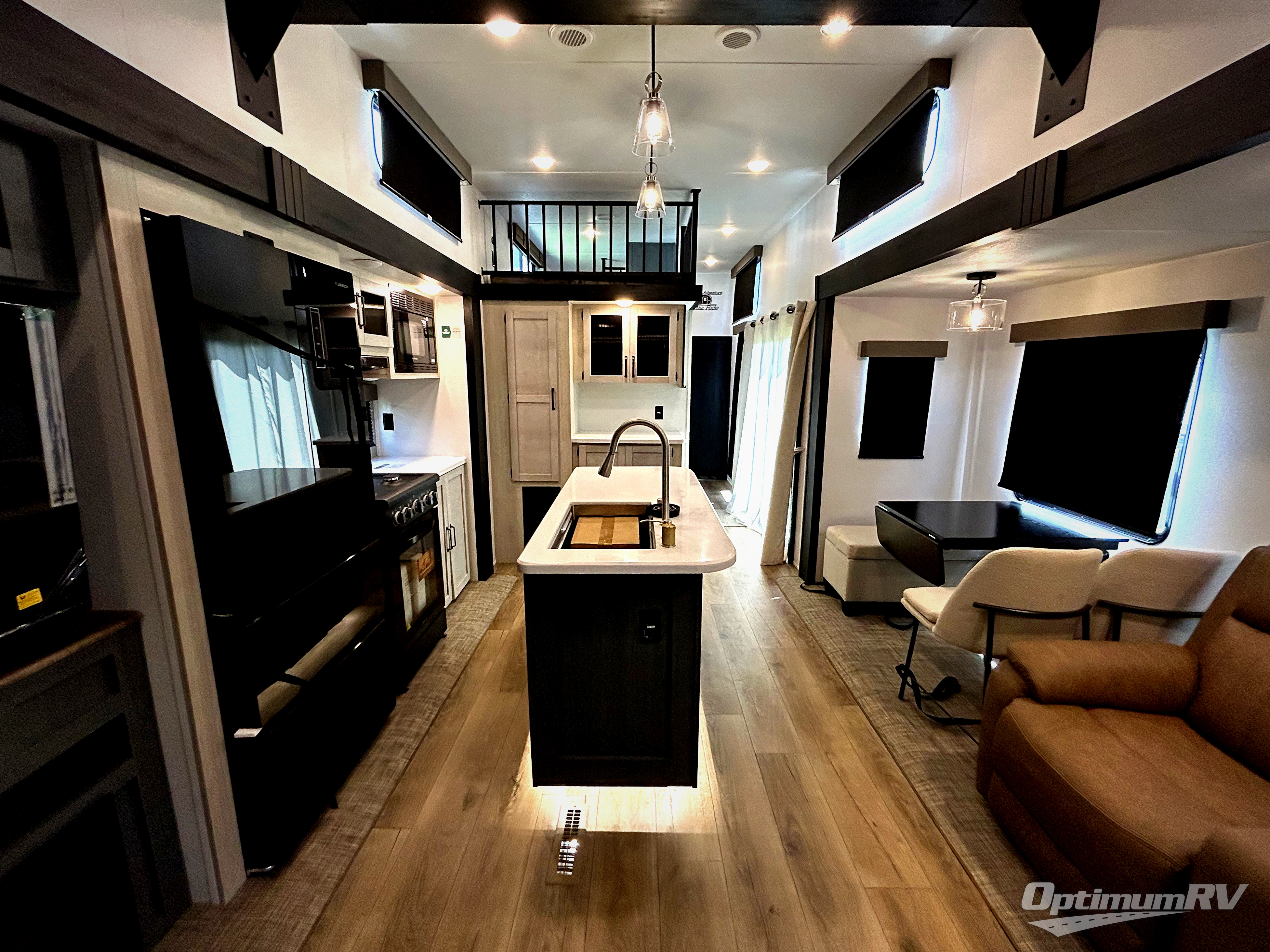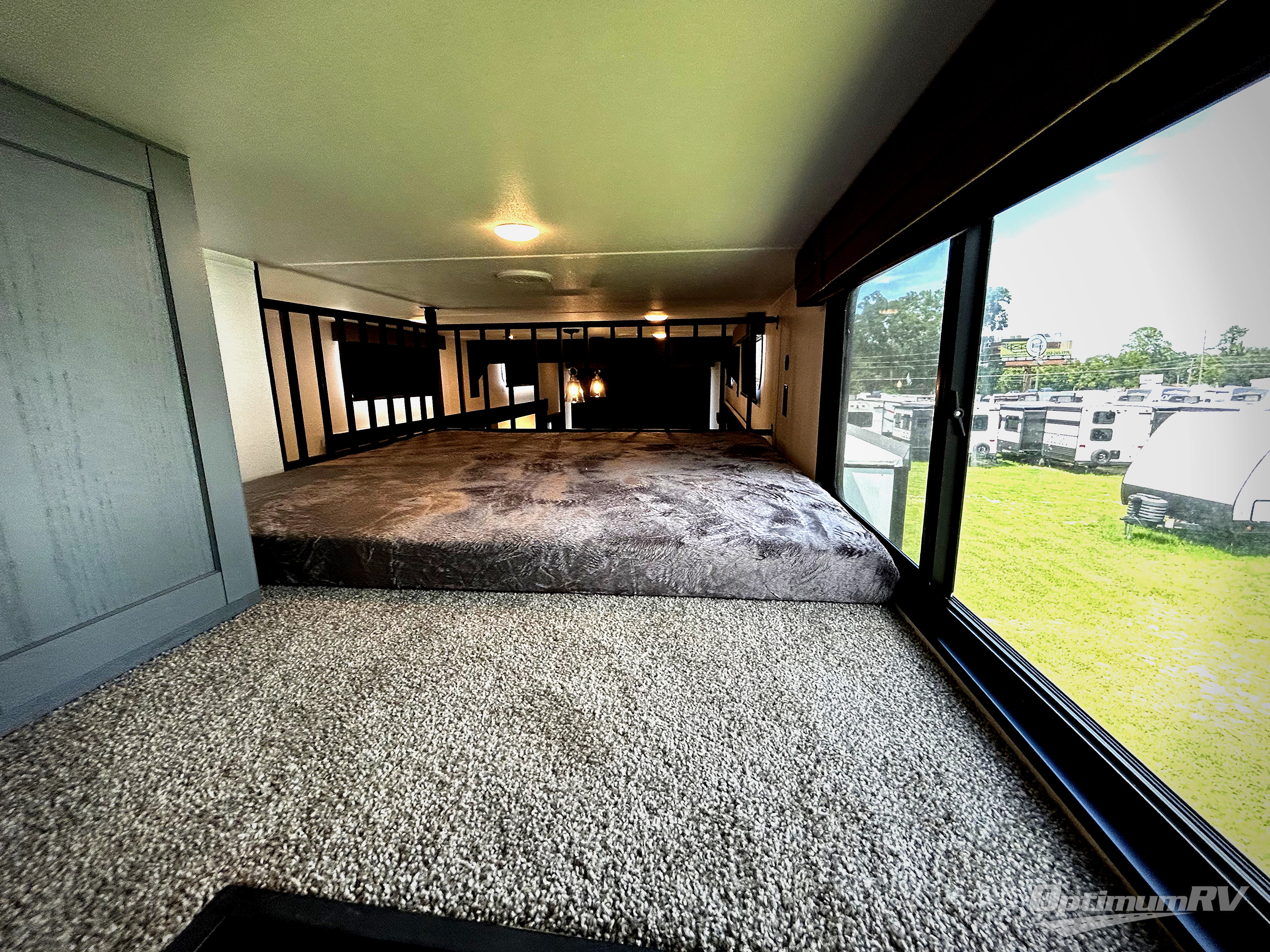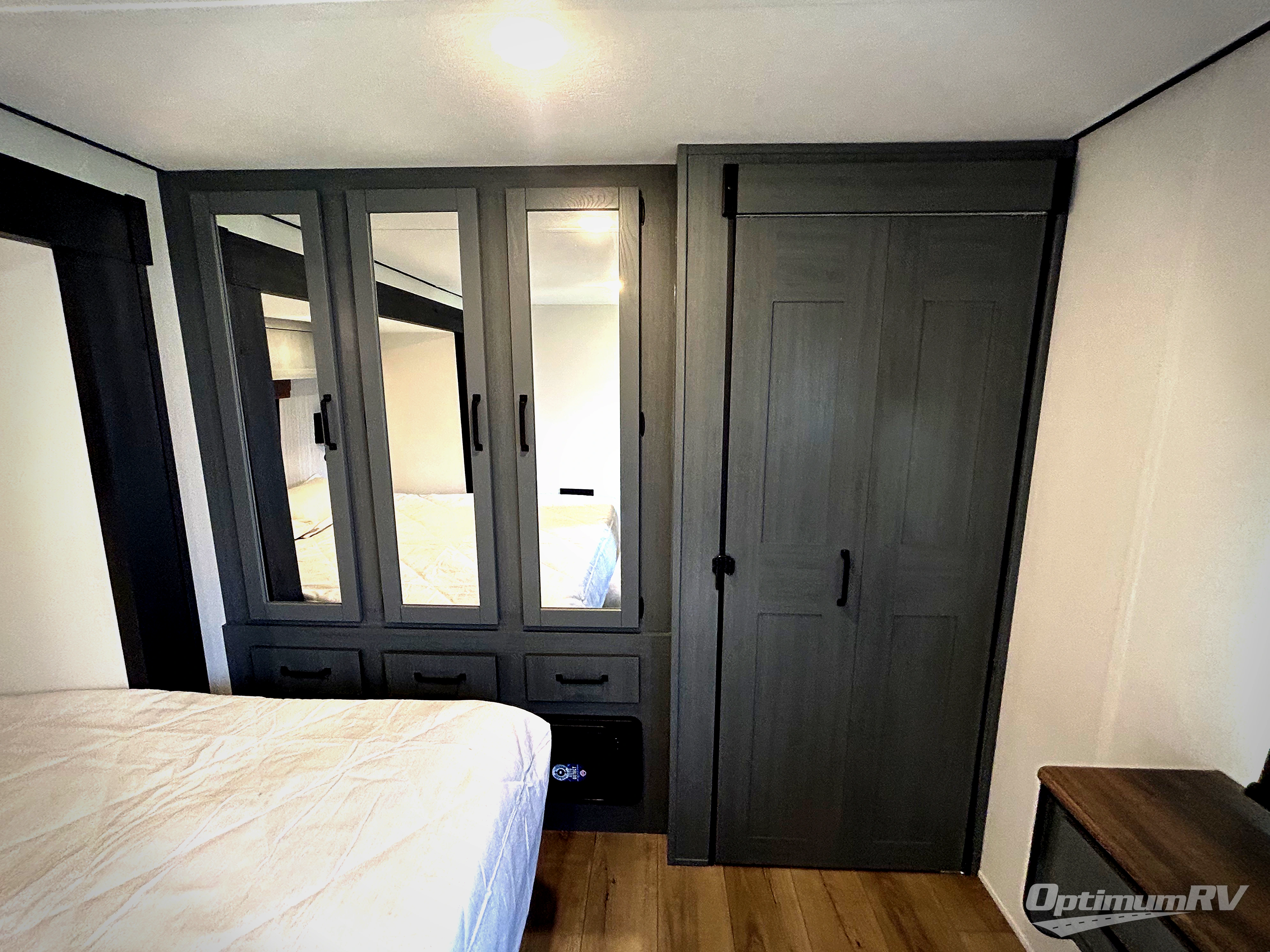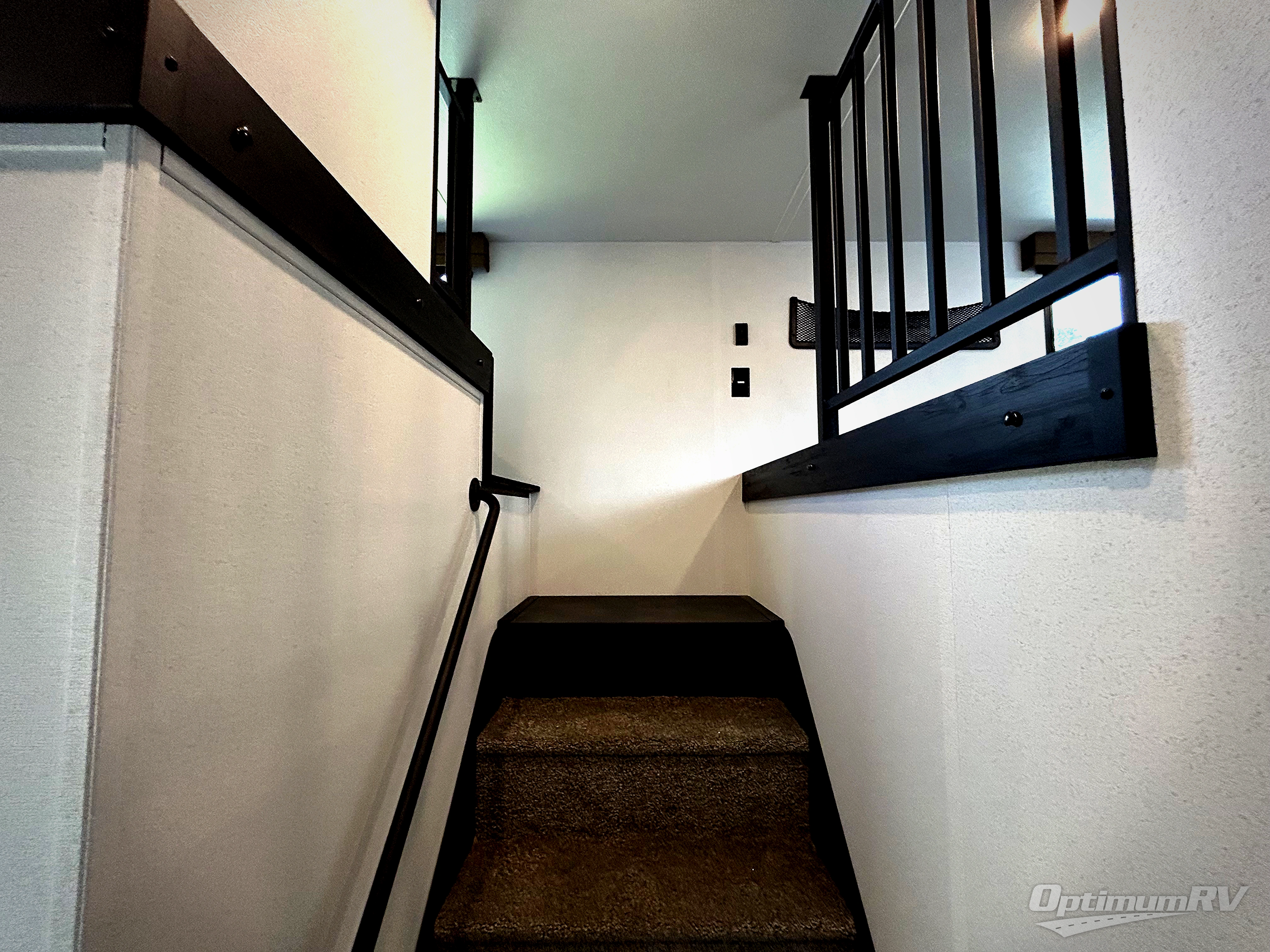 Wherever your destination may be, you can be sure to enjoy it to the fullest with this trailer in tow! With two entry doors, you can enter in through the front private bedroom or the main living area. The bedroom includes a king bed slide out, a desktop if you need to work from home, and a wardrobe/closet to keep your clothes organized. There is also a closet with the option to add washer and dryer prep. Just outside this room are steps that lead to the large loft area with a 58" x 58" bunk mat and a cabinet on one side, plus two 32" x 80" bunk mats on the other. There is also a front cabinet and a wardrobe/closet for plenty of storage space. Once you've headed back downstairs, you can relax on the dual recliners, rear sofa, or free-standing table with a bench and two seats. And the chef of your group will love the kitchen with its residential style refrigerator and pantry, kitchen island, and four burner cooktop!