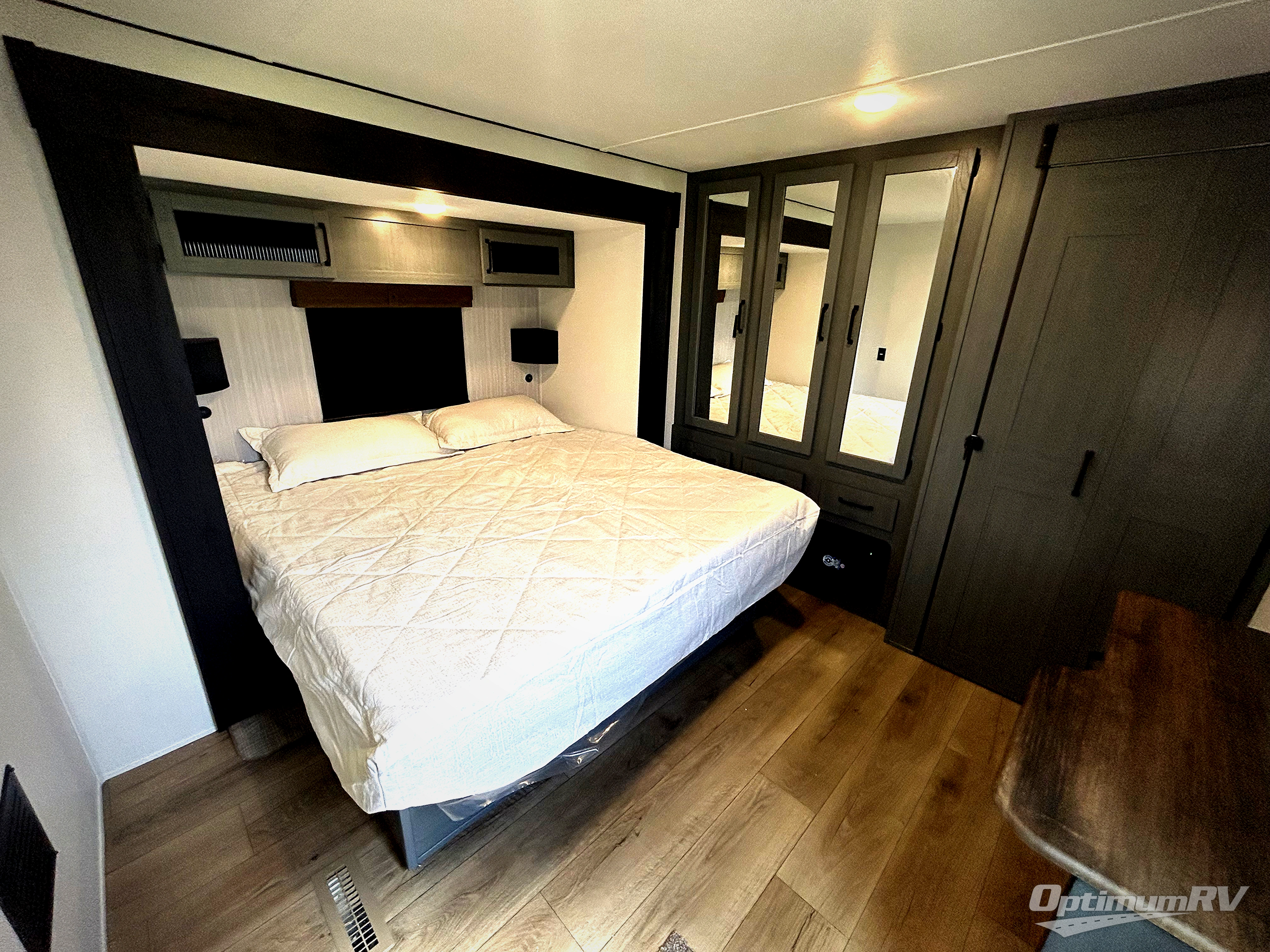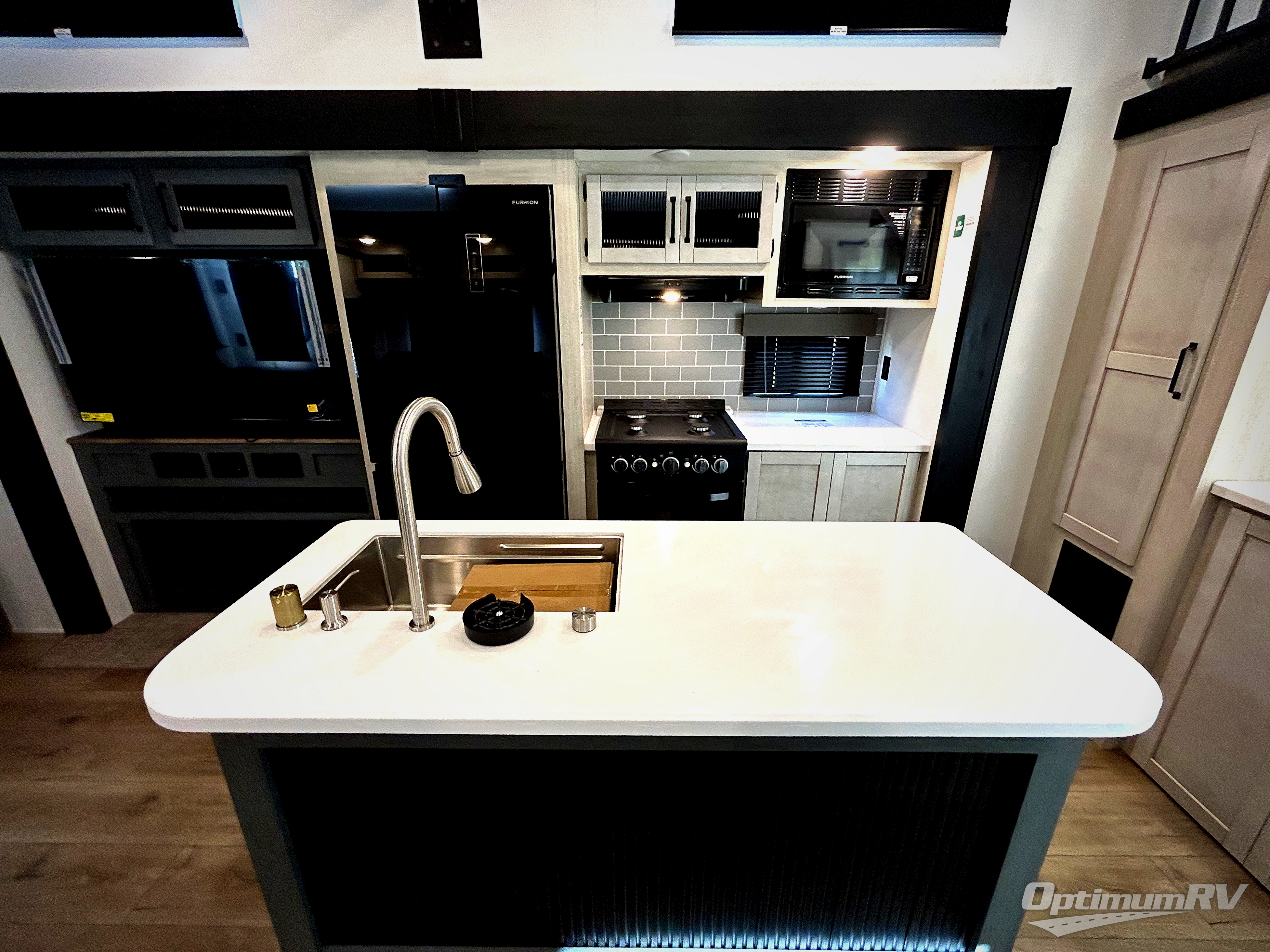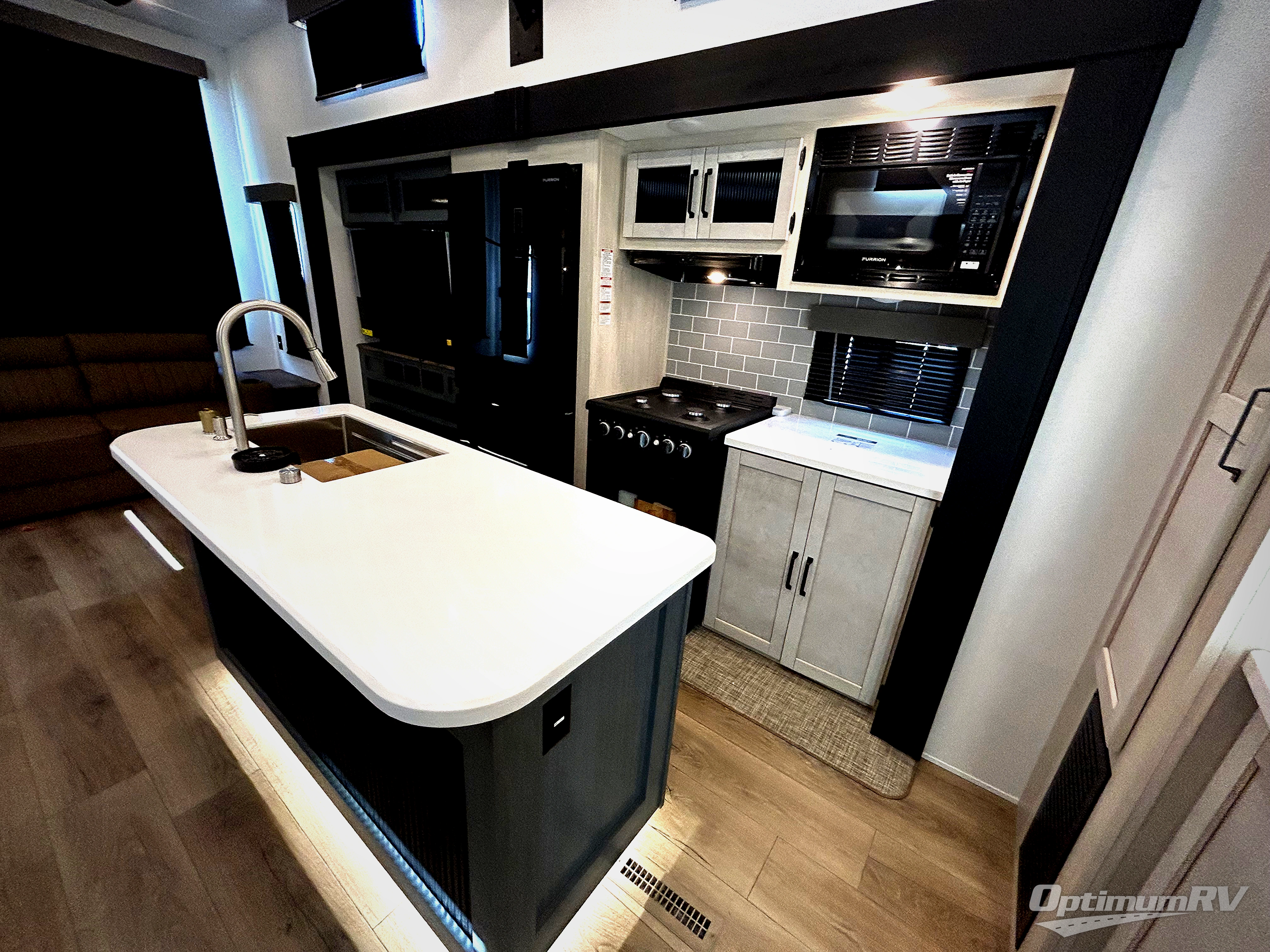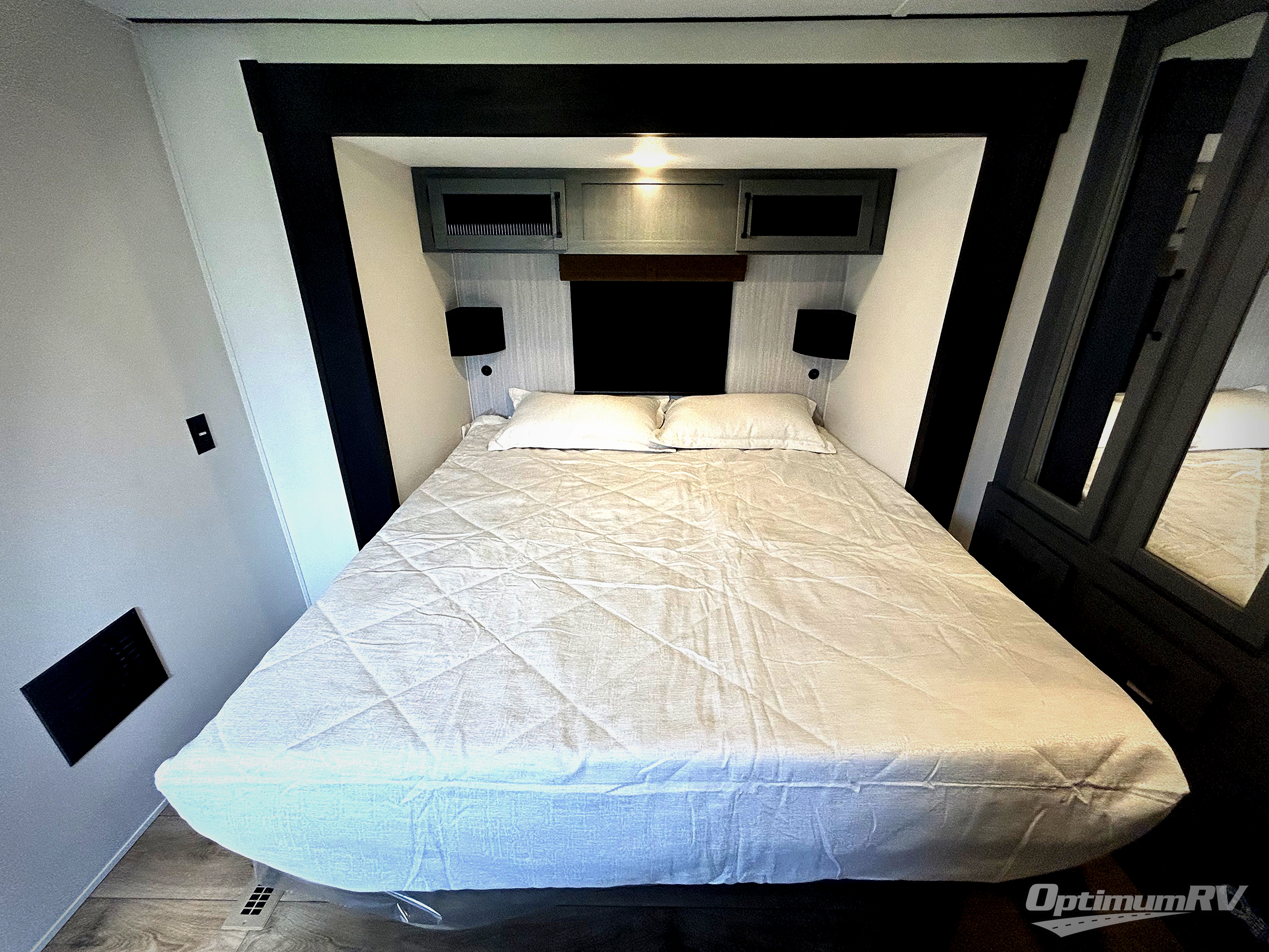 Wherever your destination may be, you can be sure to enjoy it to the fullest with this trailer in tow! With two entry doors, you can enter in through the front private bedroom or the main living area. The bedroom includes a king bed slide out, a desktop if you need to work from home, and a wardrobe/closet to keep your clothes organized. There is also a closet with the option to add washer and dryer prep. Just outside this room are steps that lead to the large loft area with a 58" x 58" bunk mat and a cabinet on one side, plus two 32" x 80" bunk mats on the other. There is also a front cabinet and a wardrobe/closet for plenty of storage space. Once you've headed back downstairs, you can relax on the dual recliners, rear sofa, or free-standing table with a bench and two seats. And the chef of your group will love the kitchen with its residential style refrigerator and pantry, kitchen island, and four burner cooktop!