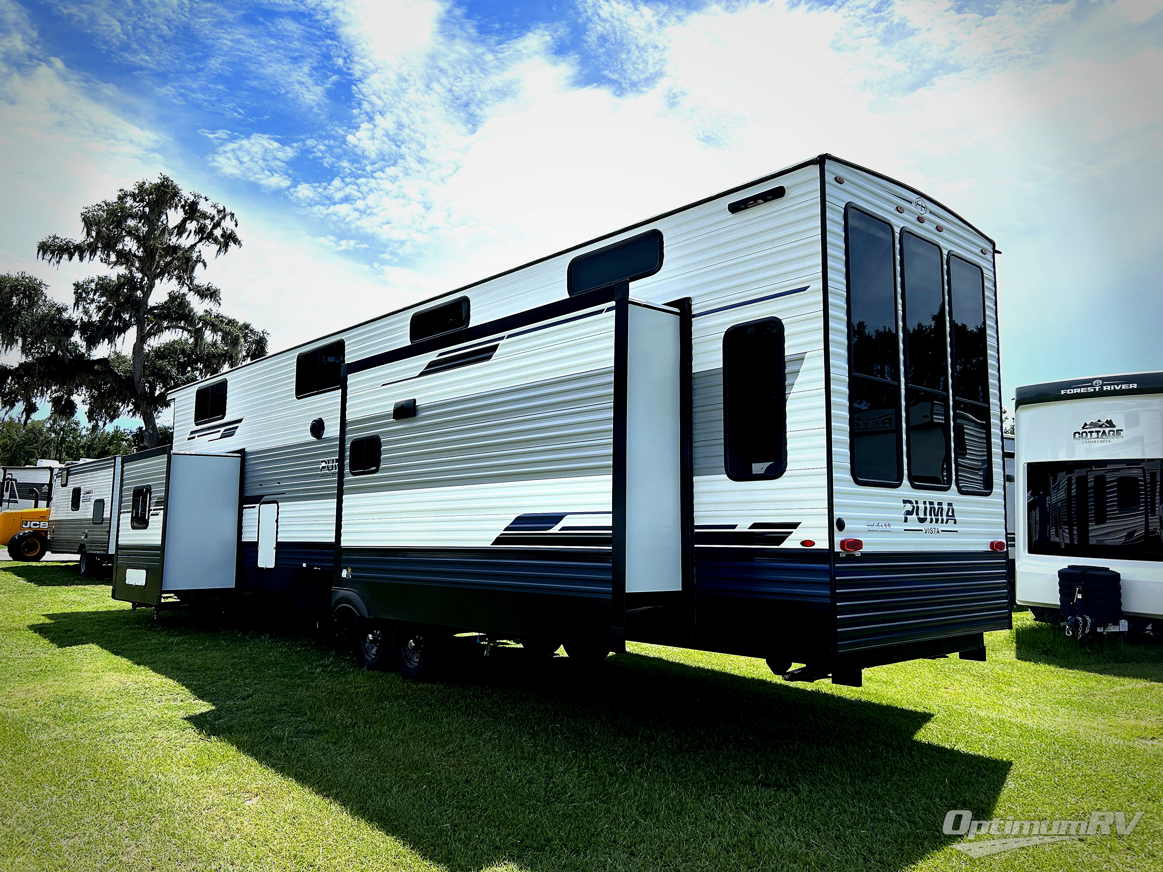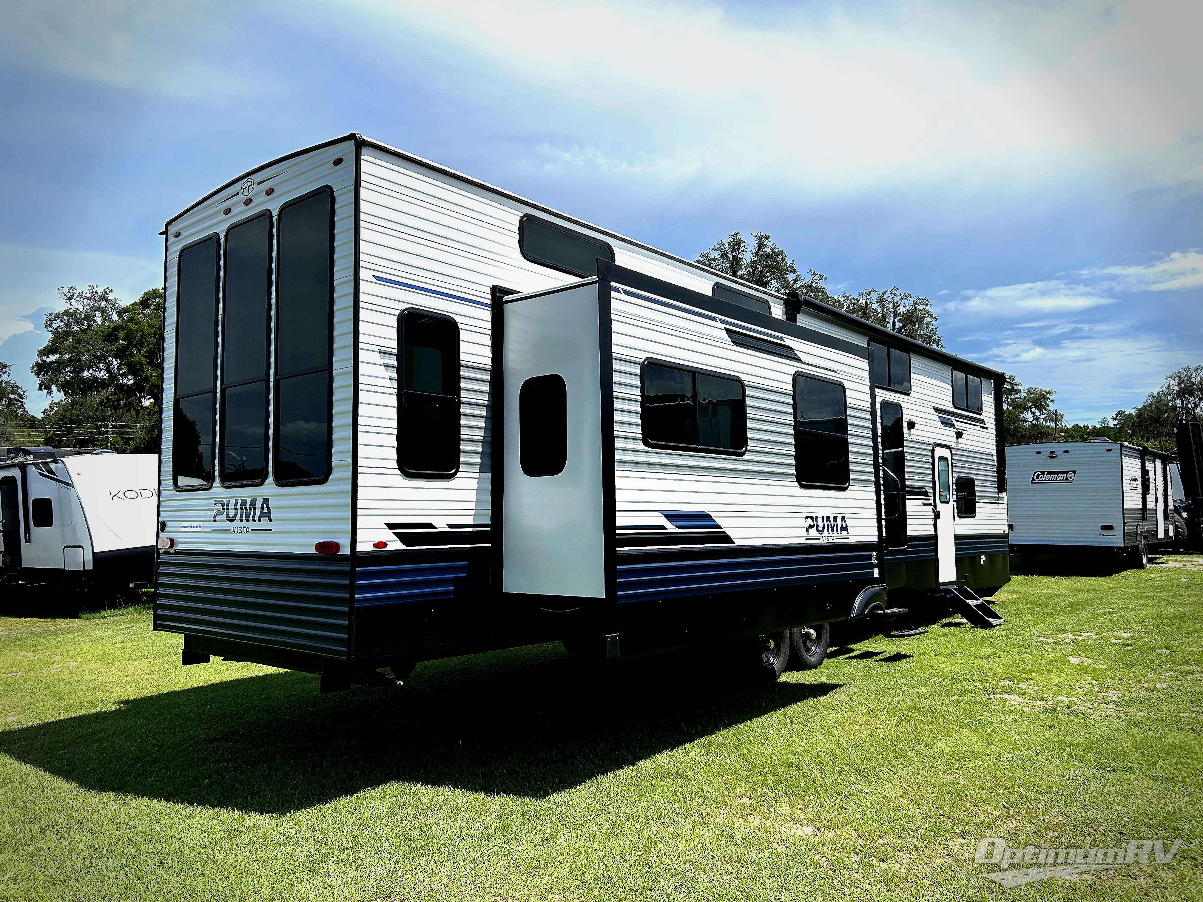 Each Puma Destination trailer by Palomino is designed to give you unforgettable getaways to the destination of your choice! The required Value Shopper Loft Package includes Congoleum designer linoleum, night roller shades, LED lighting, and a 24" stainless steel oven with a four burner stove so you can make meals just like you would at home. The tankless water heater is another feature you won't want to camp without, and there is WiFi prep, solar prep, plus optional washer and dryer prep for the option to further customize your trailer. An outside shower is included with the required Loft Package, along with two exterior speakers, solid surface countertops, four stabilizer jacks, and more!