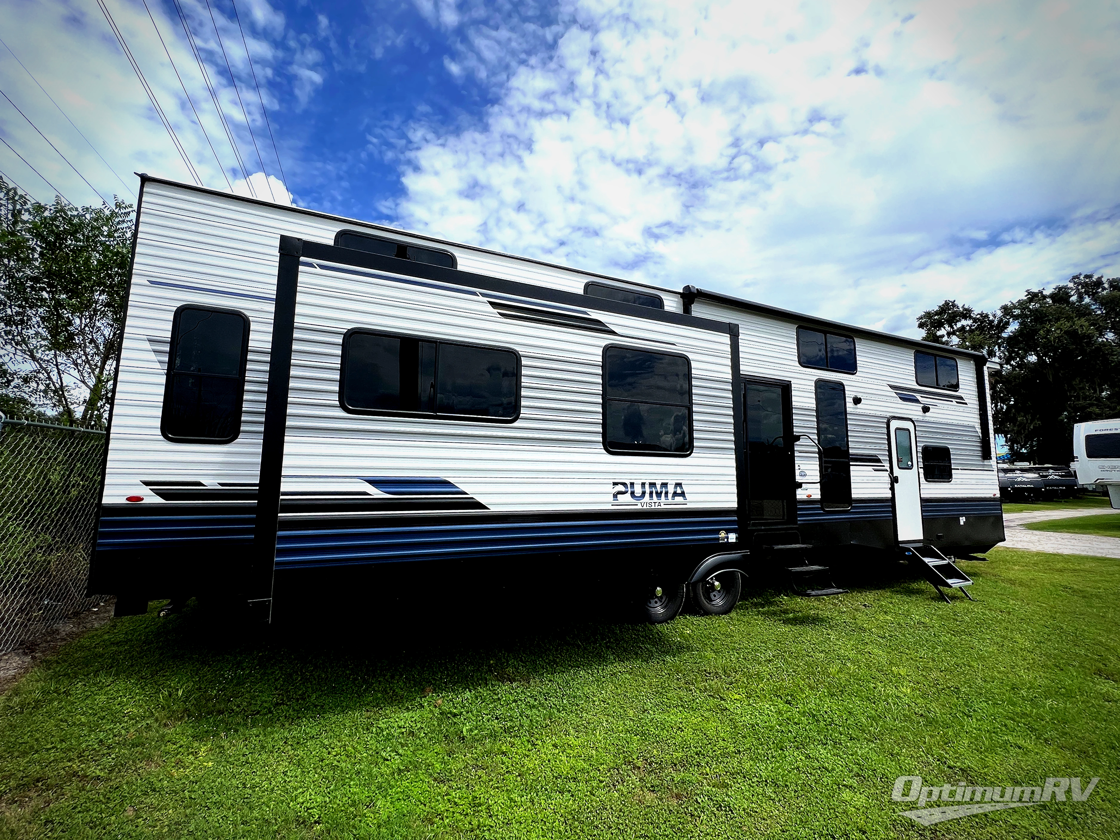 Each Puma Destination trailer by Palomino is designed to give you unforgettable getaways to the destination of your choice! The required Value Shopper Loft Package includes Congoleum designer linoleum, night roller shades, LED lighting, and a 24" stainless steel oven with a four burner stove so you can make meals just like you would at home. The tankless water heater is another feature you won't want to camp without, and there is WiFi prep, solar prep, plus optional washer and dryer prep for the option to further customize your trailer. An outside shower is included with the required Loft Package, along with two exterior speakers, solid surface countertops, four stabilizer jacks, and more!