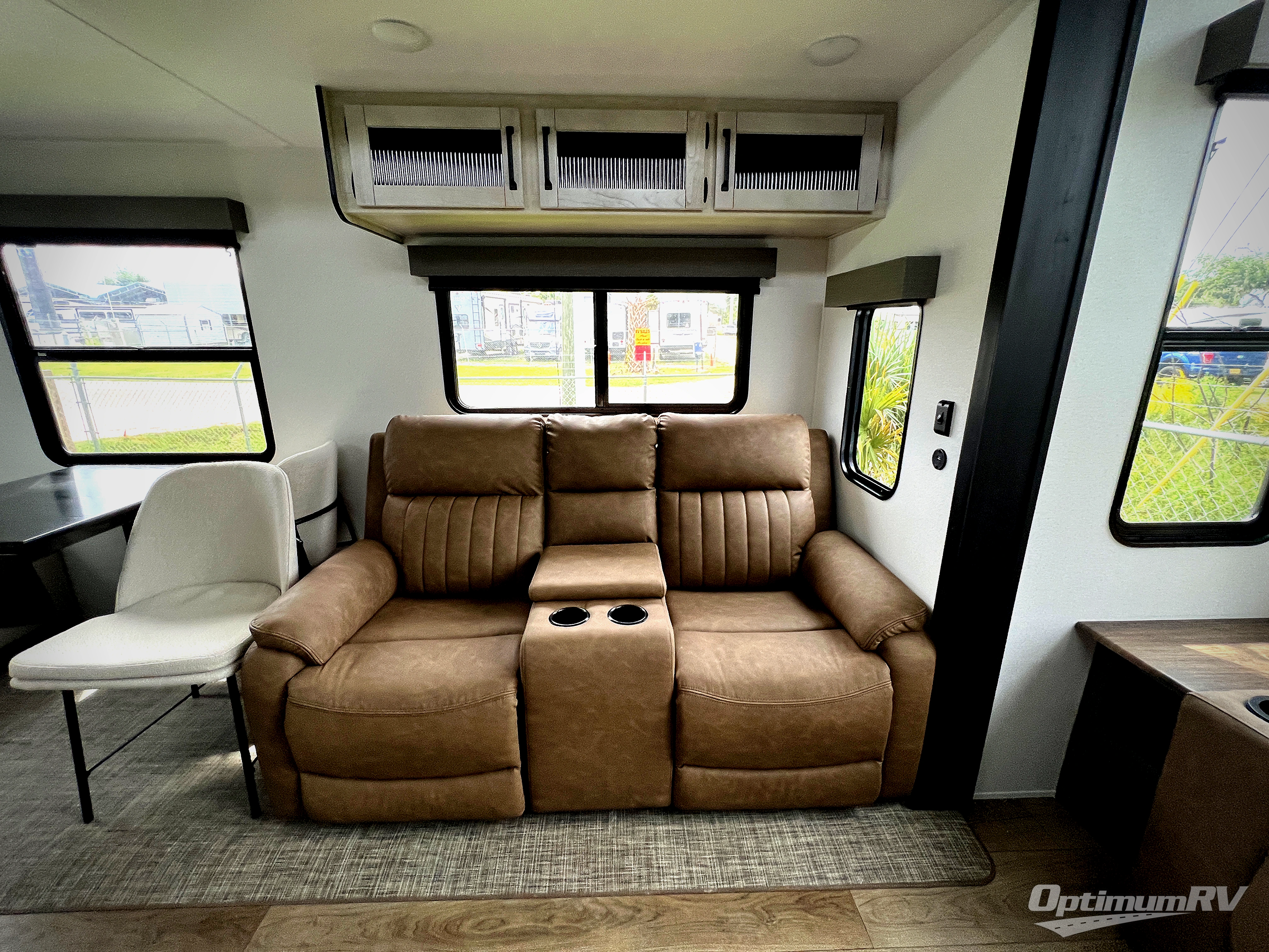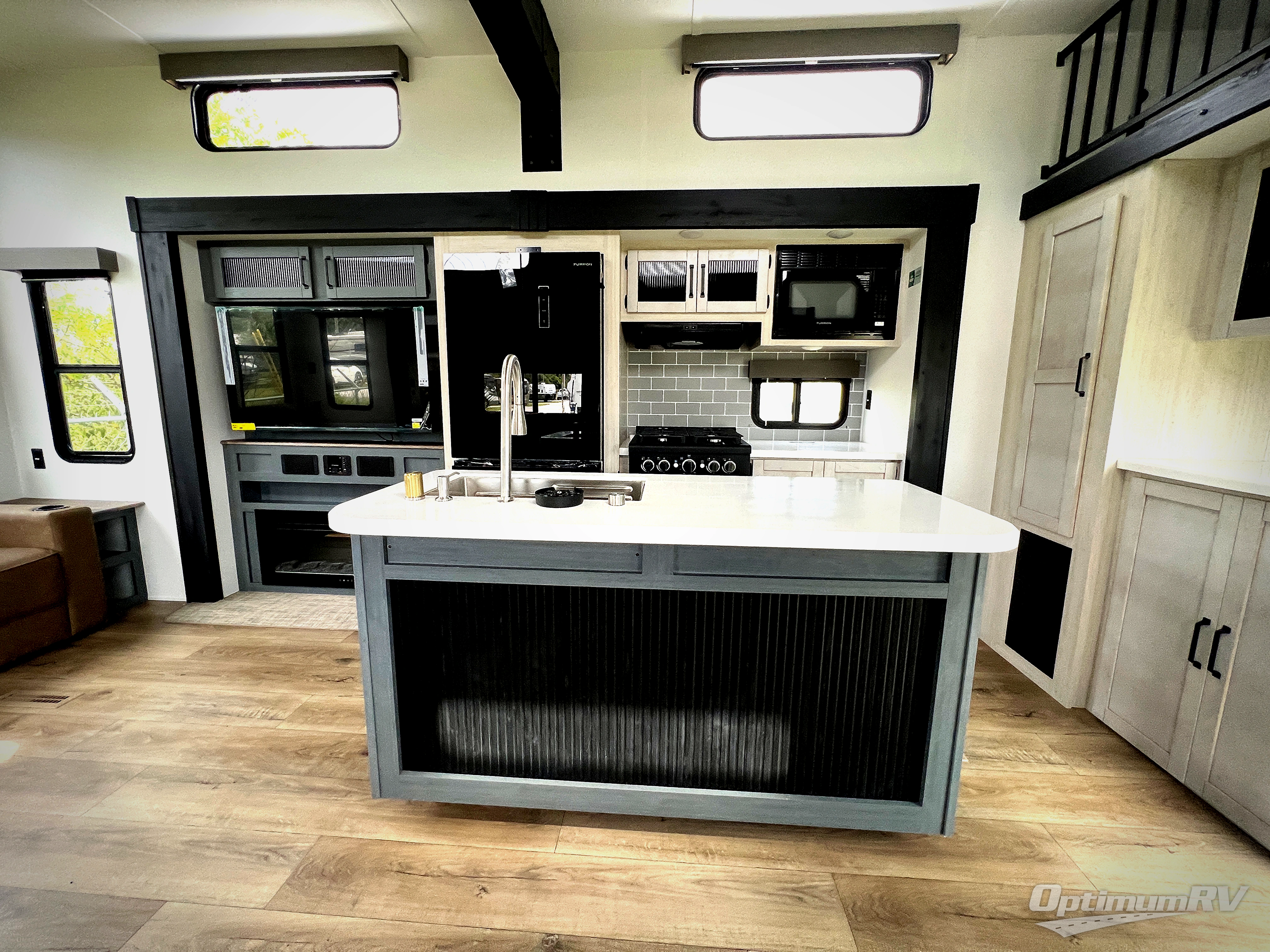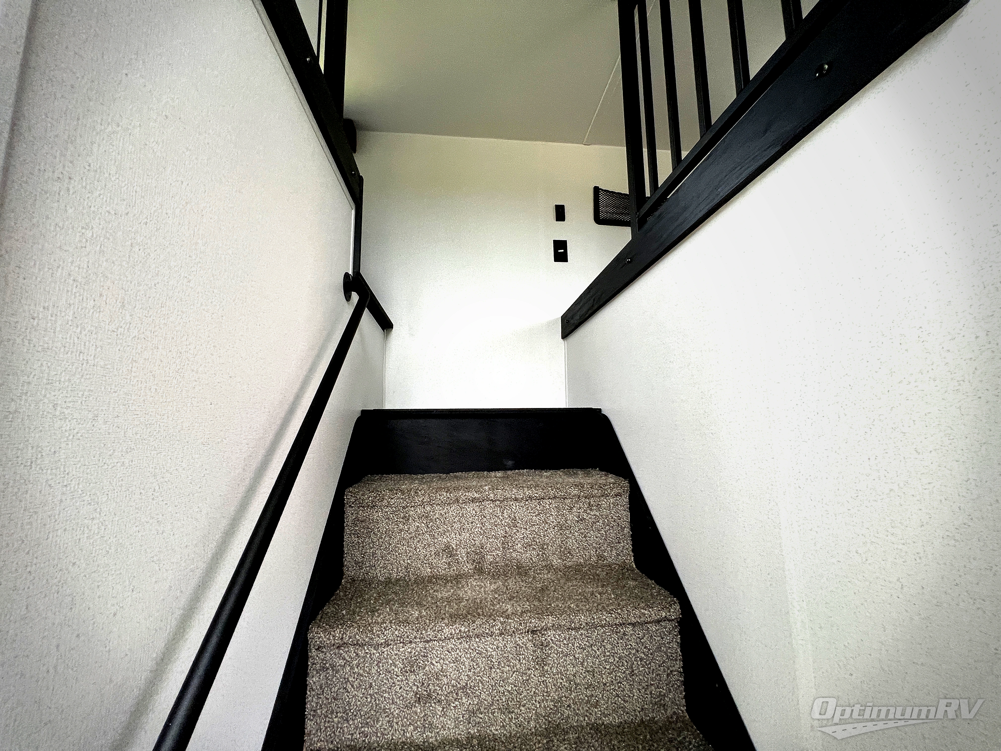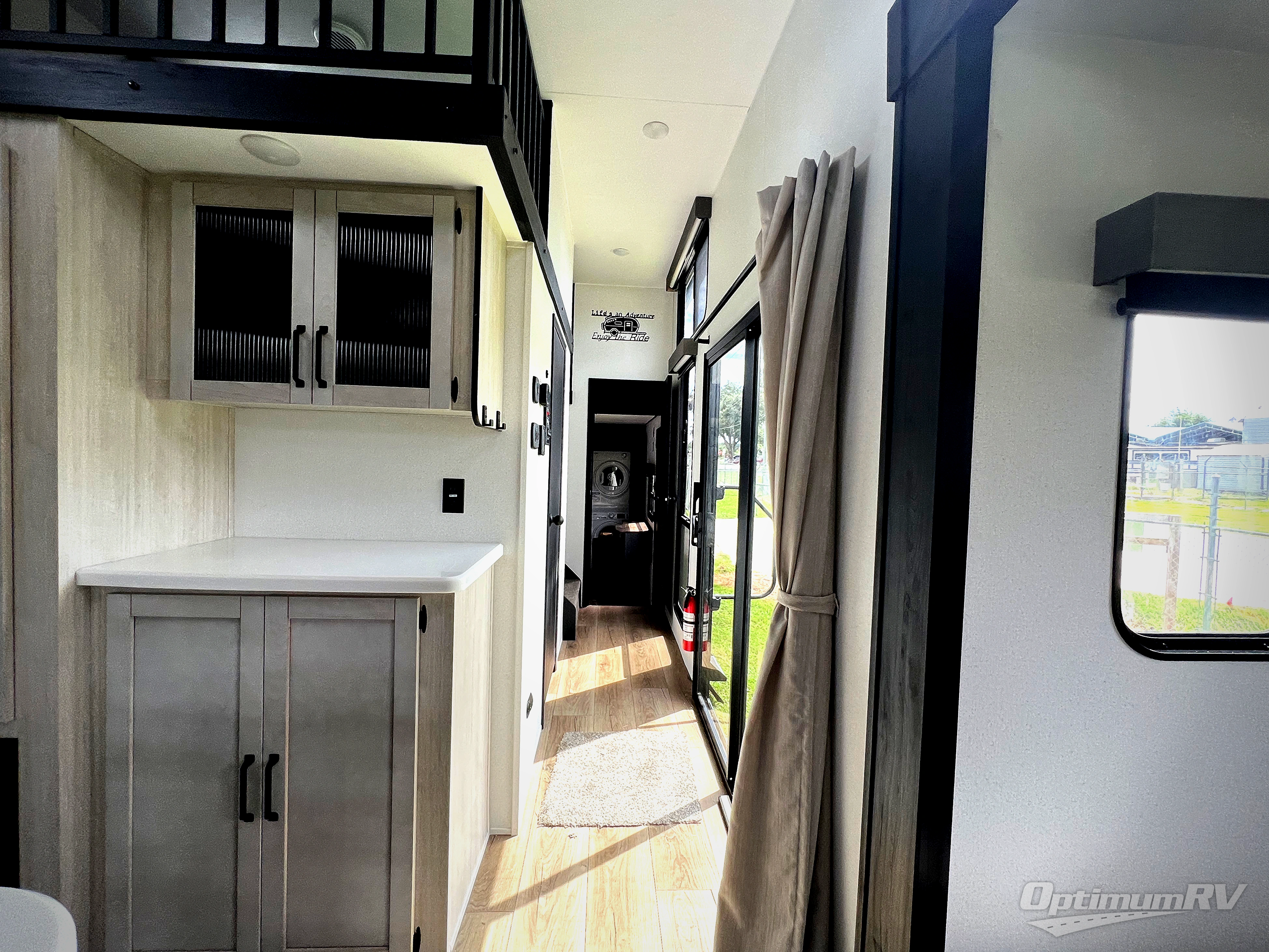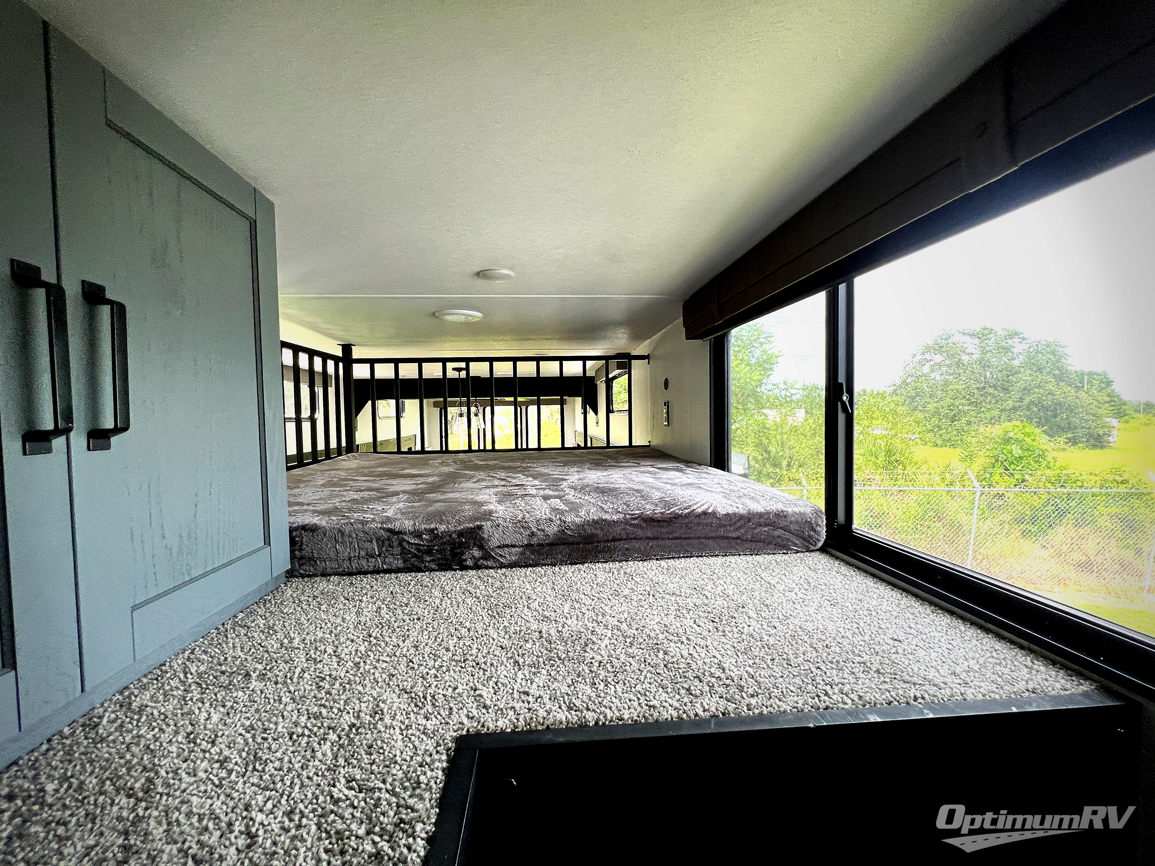 Wherever your destination may be, you can be sure to enjoy it to the fullest with this trailer in tow! With two entry doors, you can enter in through the front private bedroom or the main living area. The bedroom includes a king bed slide out, a desktop if you need to work from home, and a wardrobe/closet to keep your clothes organized. There is also a closet with the option to add washer and dryer prep. Just outside this room are steps that lead to the large loft area with a 58" x 58" bunk mat and a cabinet on one side, plus two 32" x 80" bunk mats on the other. There is also a front cabinet and a wardrobe/closet for plenty of storage space. Once you've headed back downstairs, you can relax on the dual recliners, rear sofa, or free-standing table with a bench and two seats. And the chef of your group will love the kitchen with its residential style refrigerator and pantry, kitchen island, and four burner cooktop!