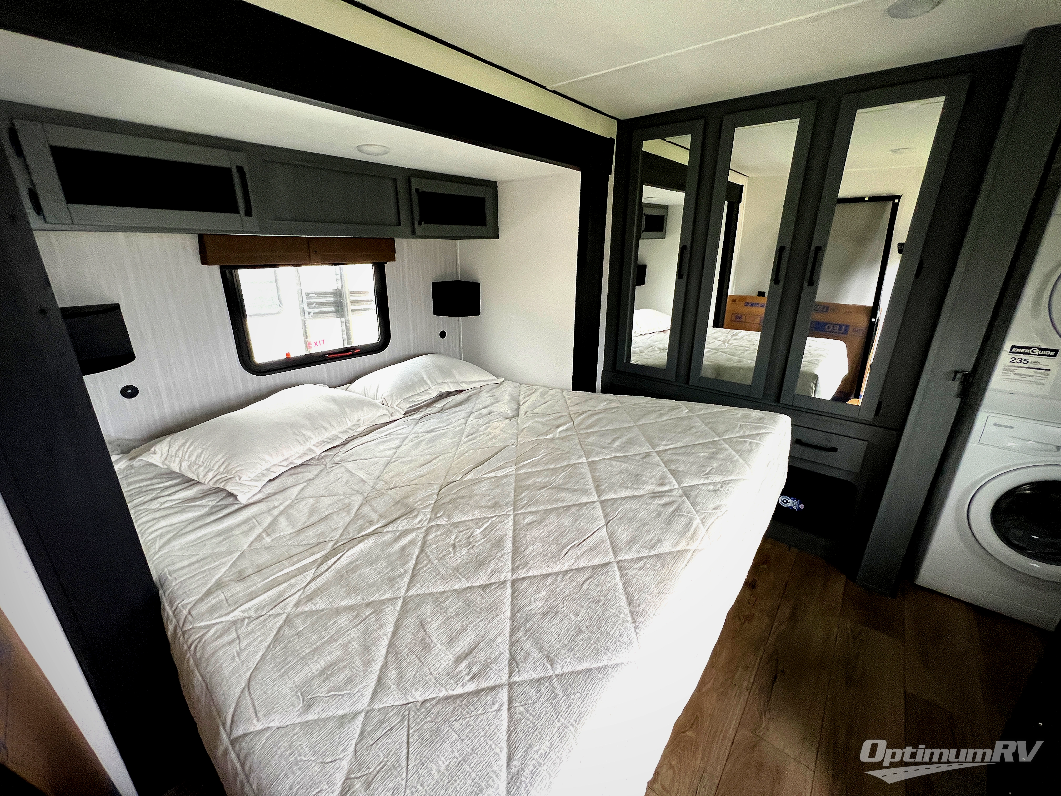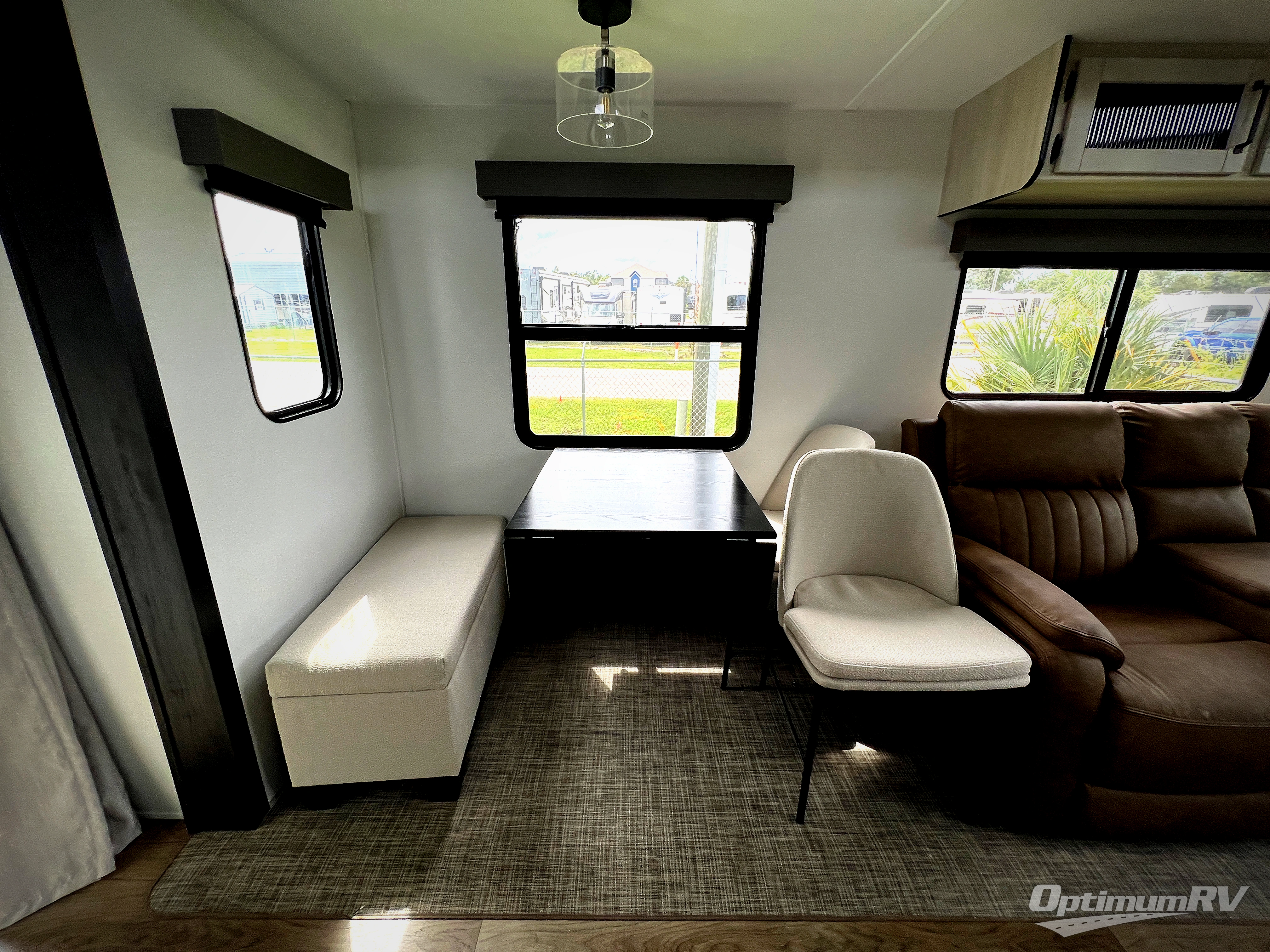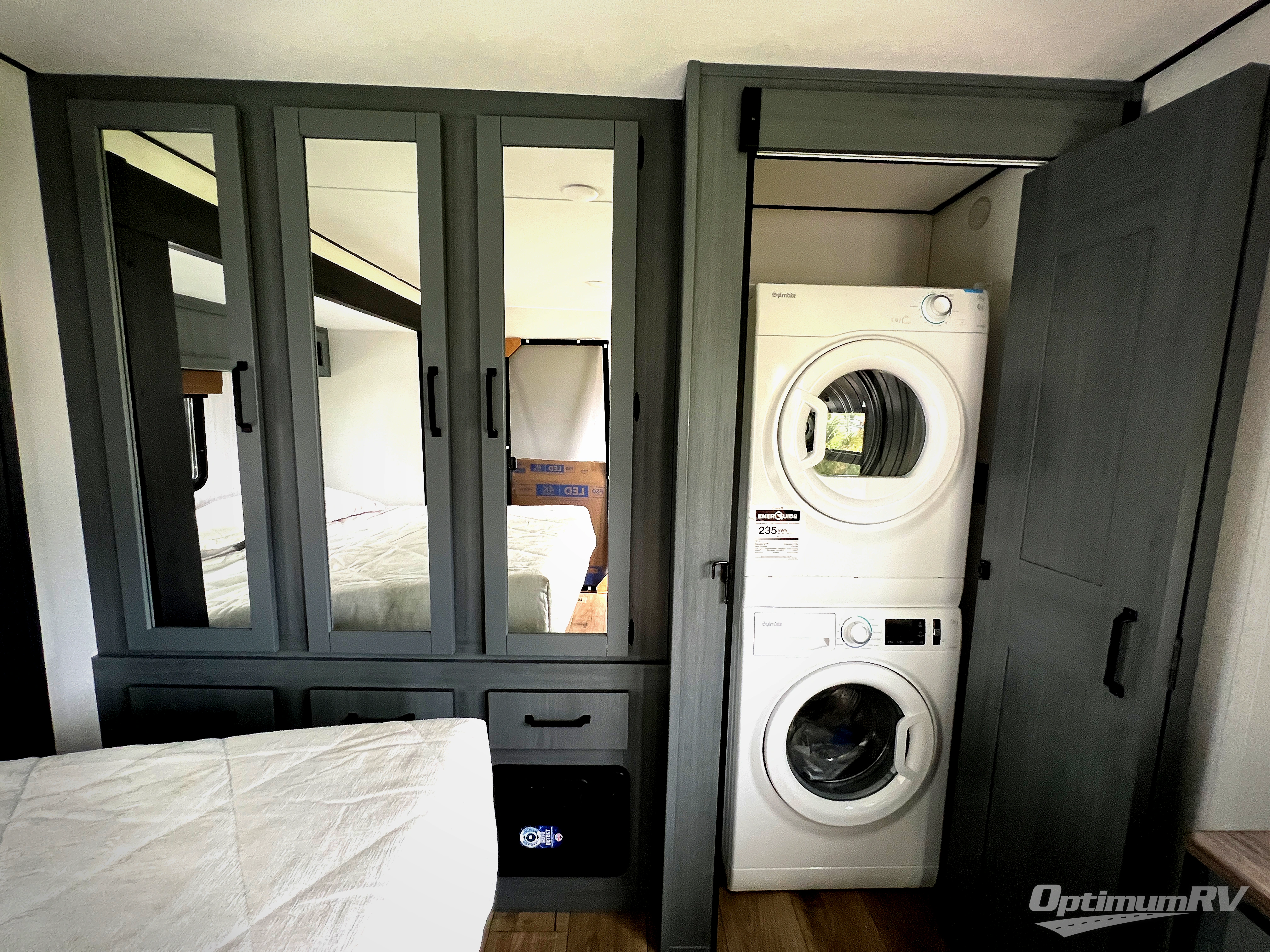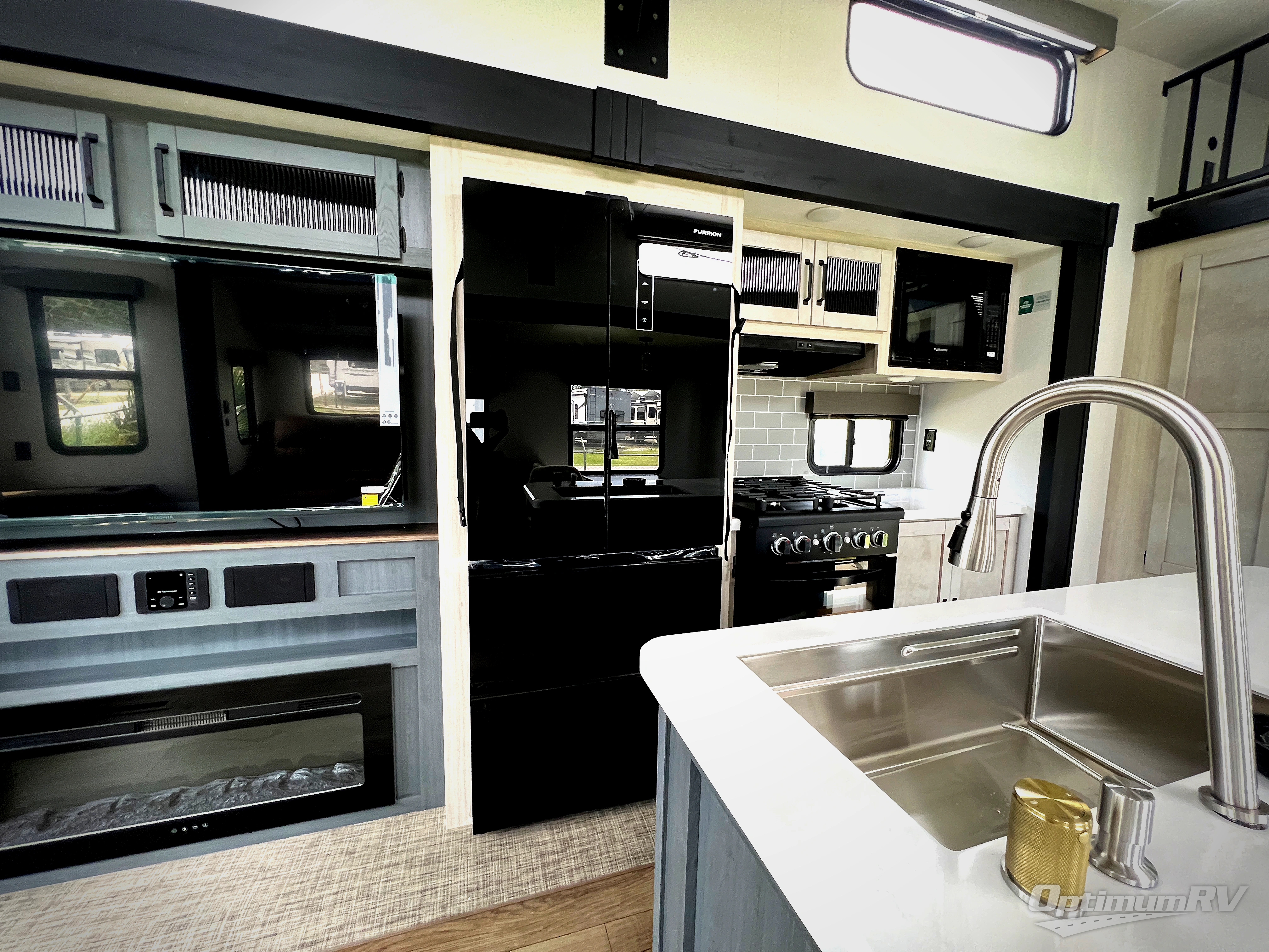 Wherever your destination may be, you can be sure to enjoy it to the fullest with this trailer in tow! With two entry doors, you can enter in through the front private bedroom or the main living area. The bedroom includes a king bed slide out, a desktop if you need to work from home, and a wardrobe/closet to keep your clothes organized. There is also a closet with the option to add washer and dryer prep. Just outside this room are steps that lead to the large loft area with a 58" x 58" bunk mat and a cabinet on one side, plus two 32" x 80" bunk mats on the other. There is also a front cabinet and a wardrobe/closet for plenty of storage space. Once you've headed back downstairs, you can relax on the dual recliners, rear sofa, or free-standing table with a bench and two seats. And the chef of your group will love the kitchen with its residential style refrigerator and pantry, kitchen island, and four burner cooktop!