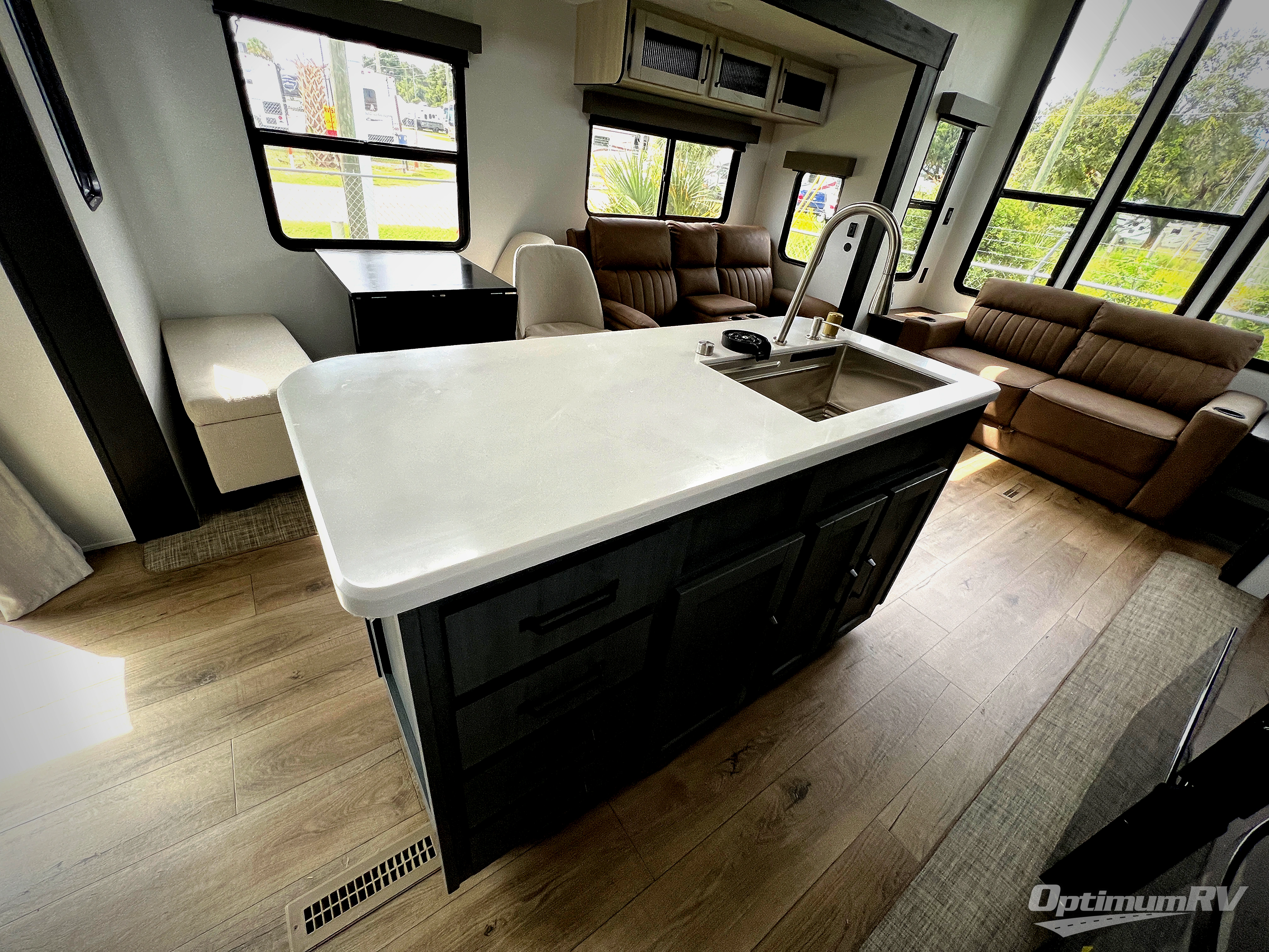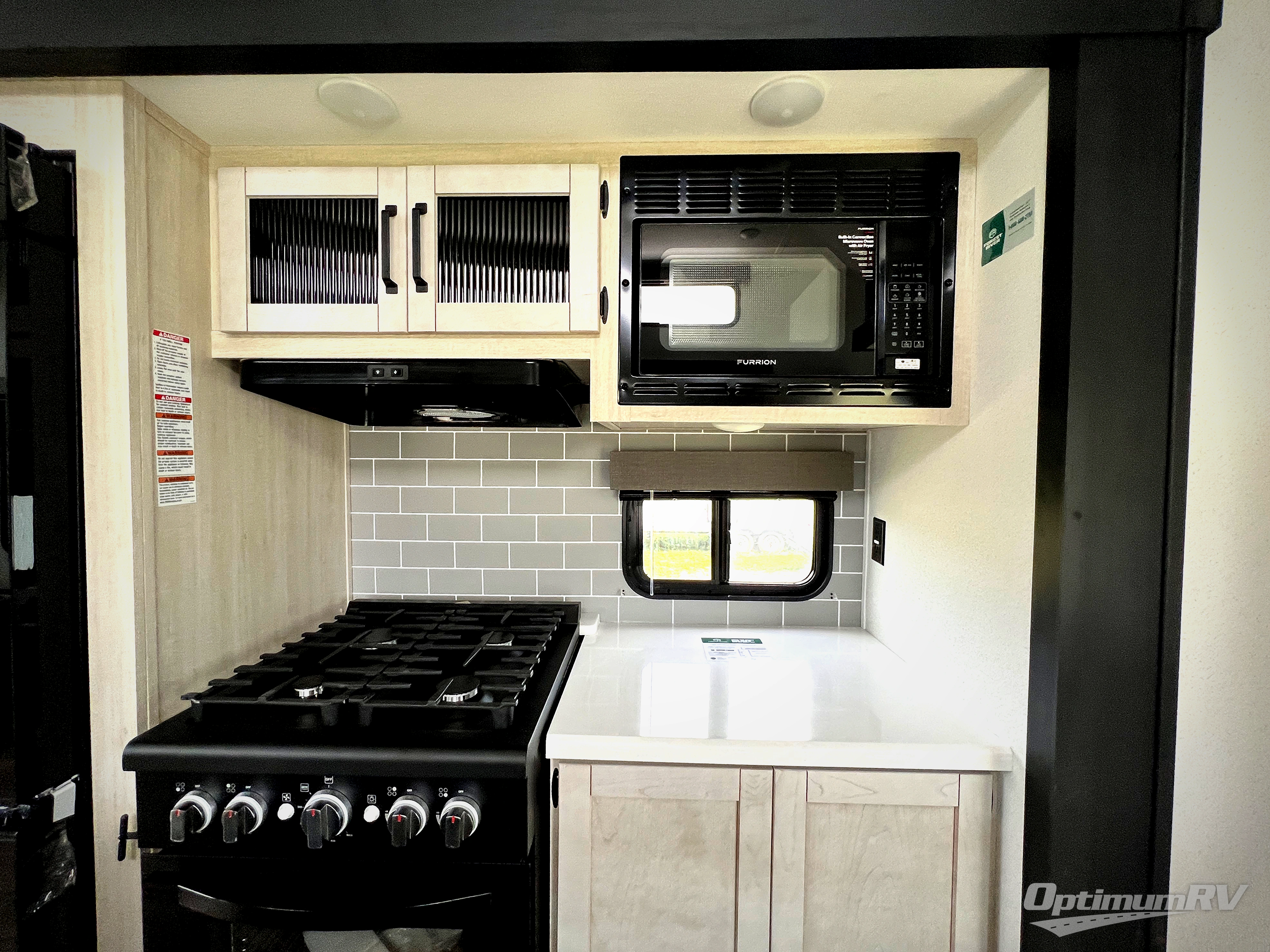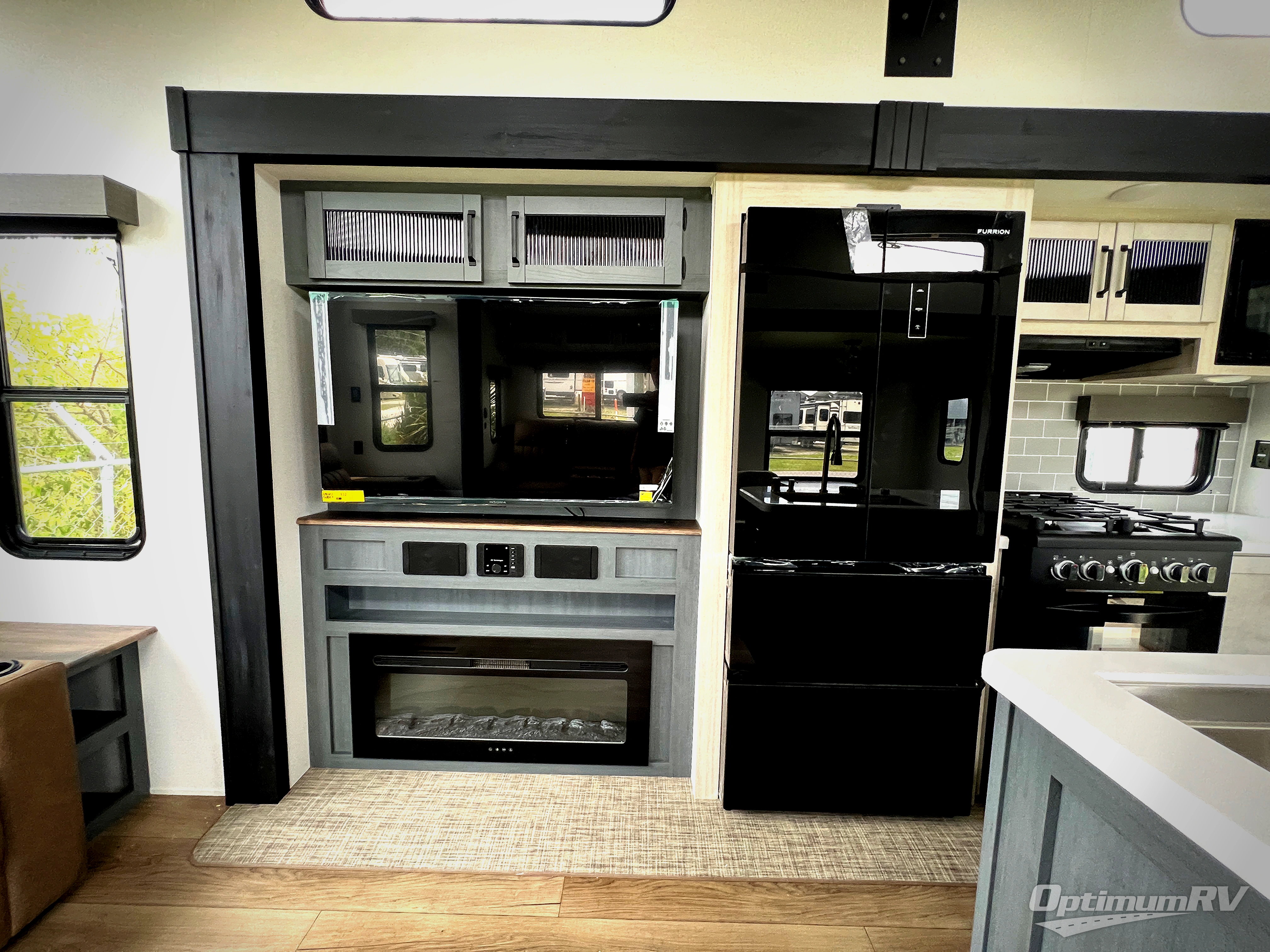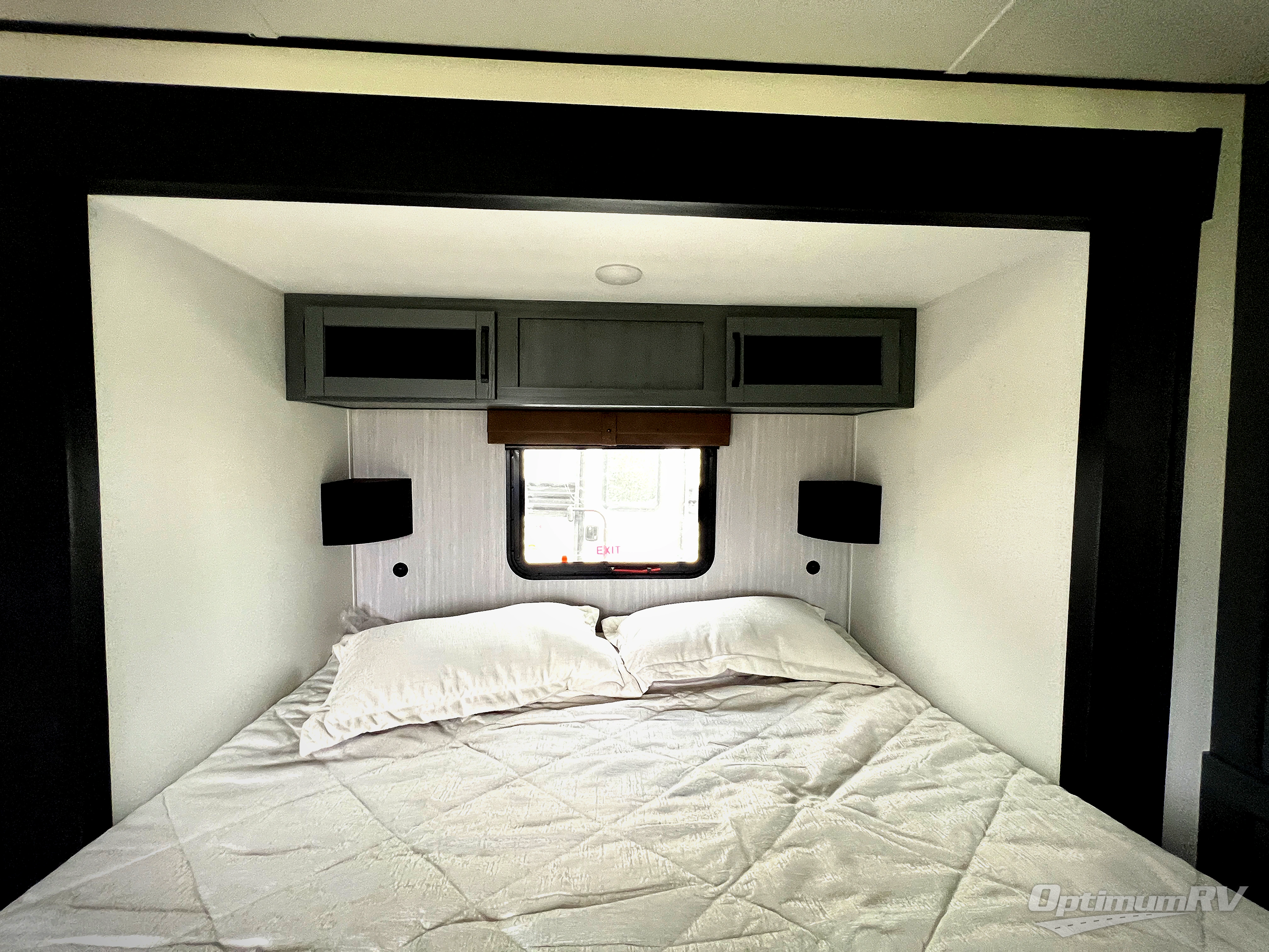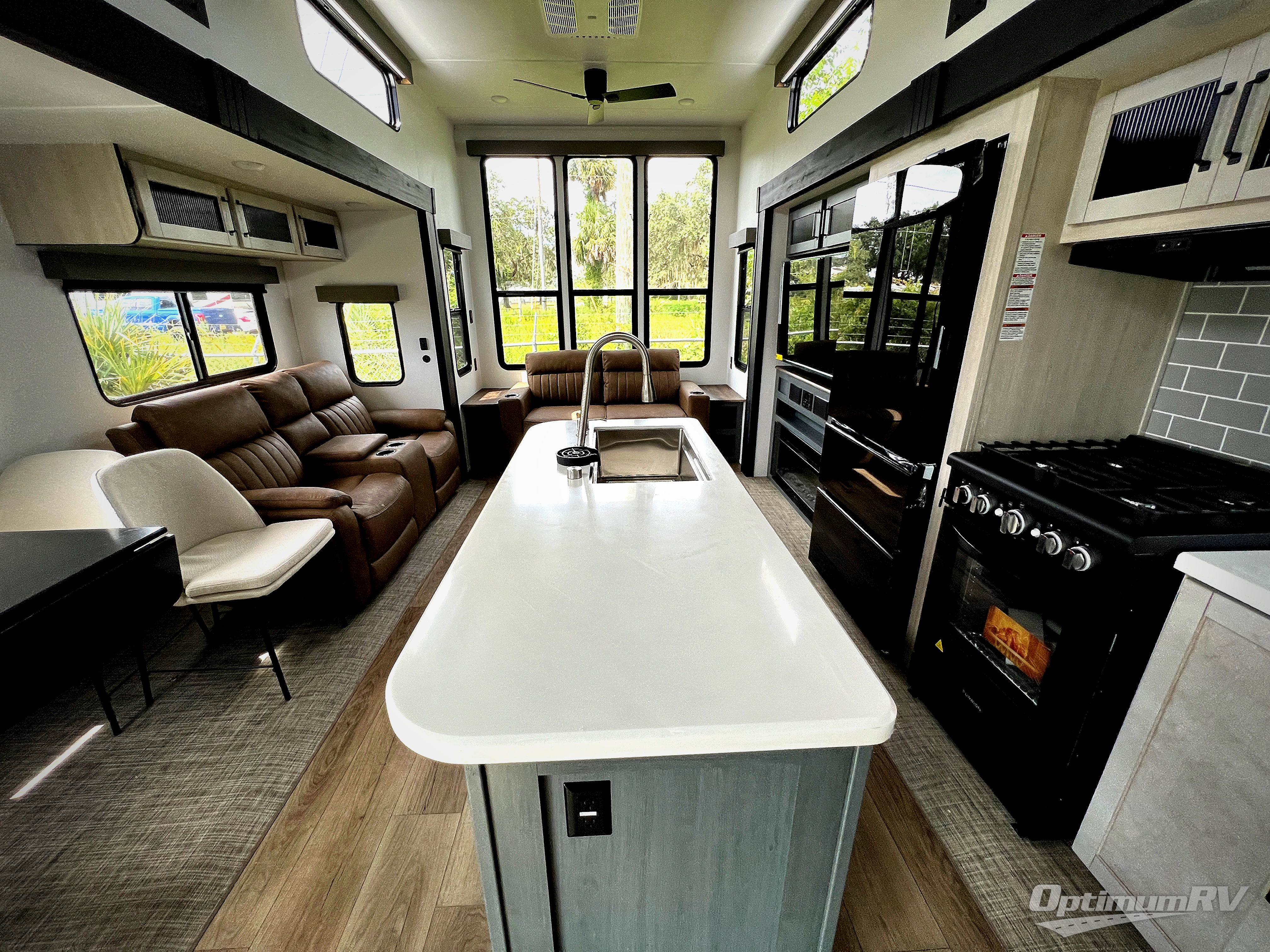 Wherever your destination may be, you can be sure to enjoy it to the fullest with this trailer in tow! With two entry doors, you can enter in through the front private bedroom or the main living area. The bedroom includes a king bed slide out, a desktop if you need to work from home, and a wardrobe/closet to keep your clothes organized. There is also a closet with the option to add washer and dryer prep. Just outside this room are steps that lead to the large loft area with a 58" x 58" bunk mat and a cabinet on one side, plus two 32" x 80" bunk mats on the other. There is also a front cabinet and a wardrobe/closet for plenty of storage space. Once you've headed back downstairs, you can relax on the dual recliners, rear sofa, or free-standing table with a bench and two seats. And the chef of your group will love the kitchen with its residential style refrigerator and pantry, kitchen island, and four burner cooktop!