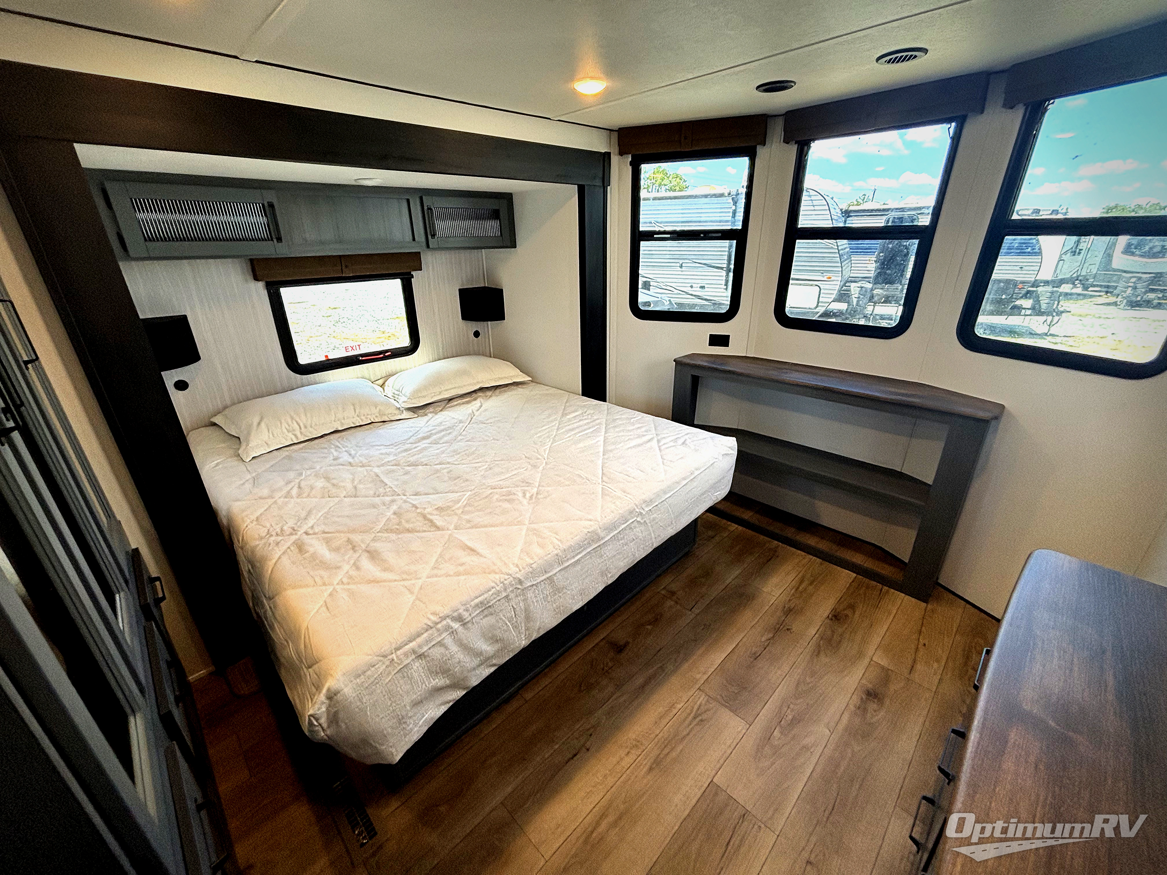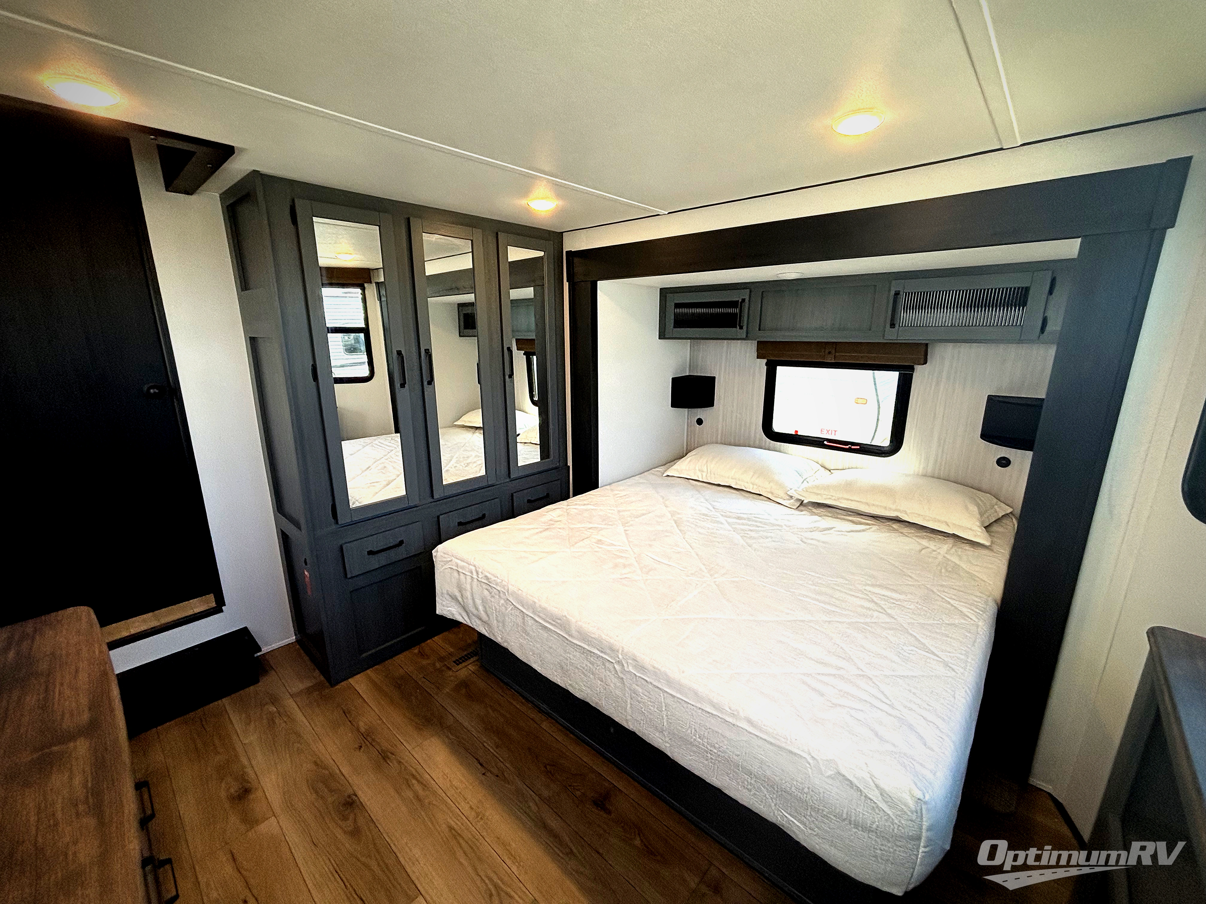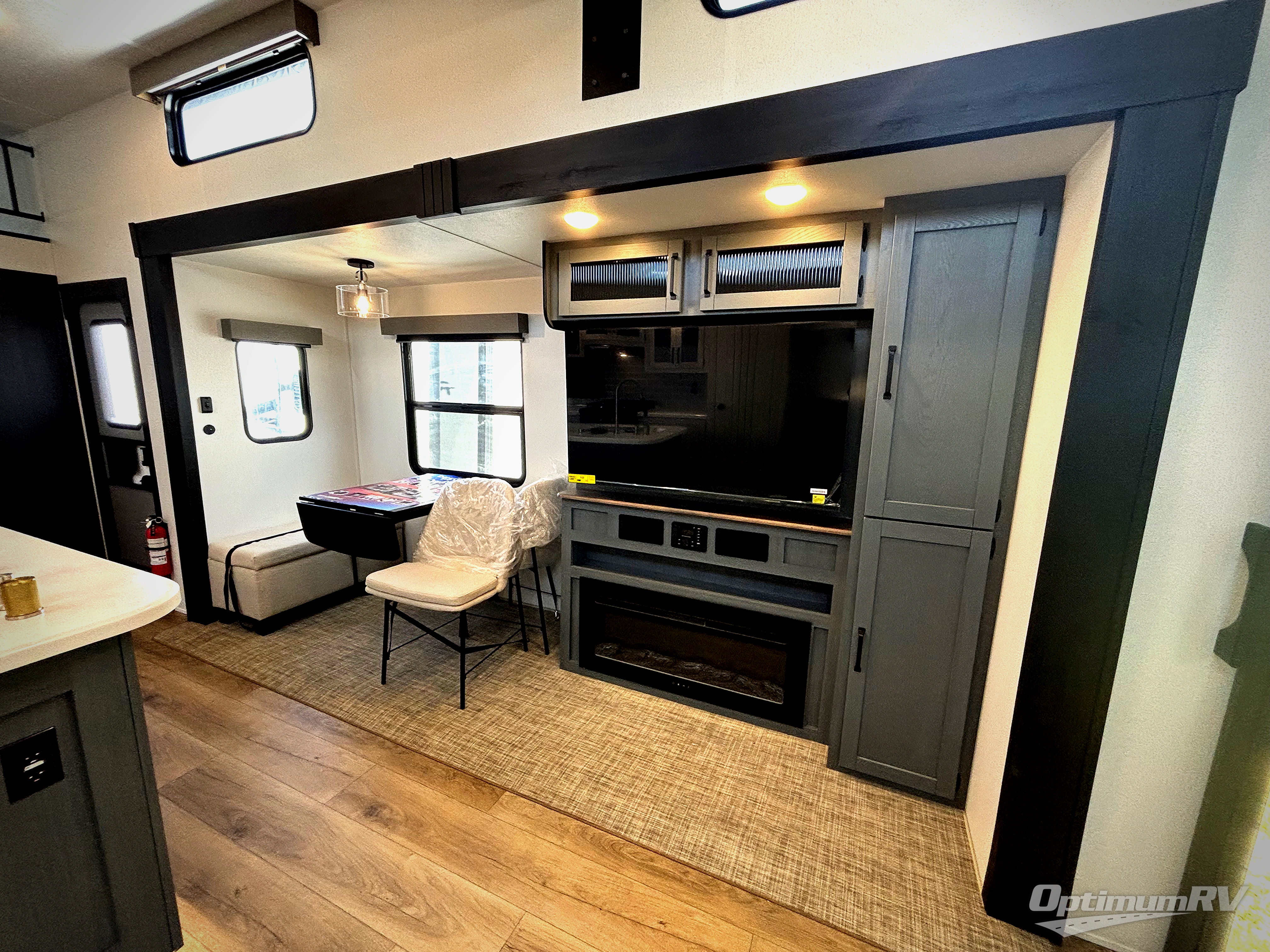 Head to your favorite spots with this destination trailer! With two entry doors, you can easily enter or exit the unit. The front private bedroom includes a king bed slide out, a wardrobe and dresser to keep your clothes organized, plus a countertop for your books or jewelry. Just outside this room is the ladder that leads to the large loft area with two 32" x 80" bunk mats, a cubby, a counter, a nightstand, and cabinets. Once you've headed back downstairs, you can relax on the L-shaped sofa across from the entertainment center with a fireplace and slide-out cabinet or the free-standing table with a bench and two seats. And the chef of your group will love the kitchen with its residential style refrigerator and pantry, kitchen island, and four burner cooktop. The full rear bathroom not only has a 32" x 40" shower with a seat to freshen up in and a closet prepped to add the optional washer and dryer, but is also below the second loft with a 32" x 80" bunk mat and closet for storage!