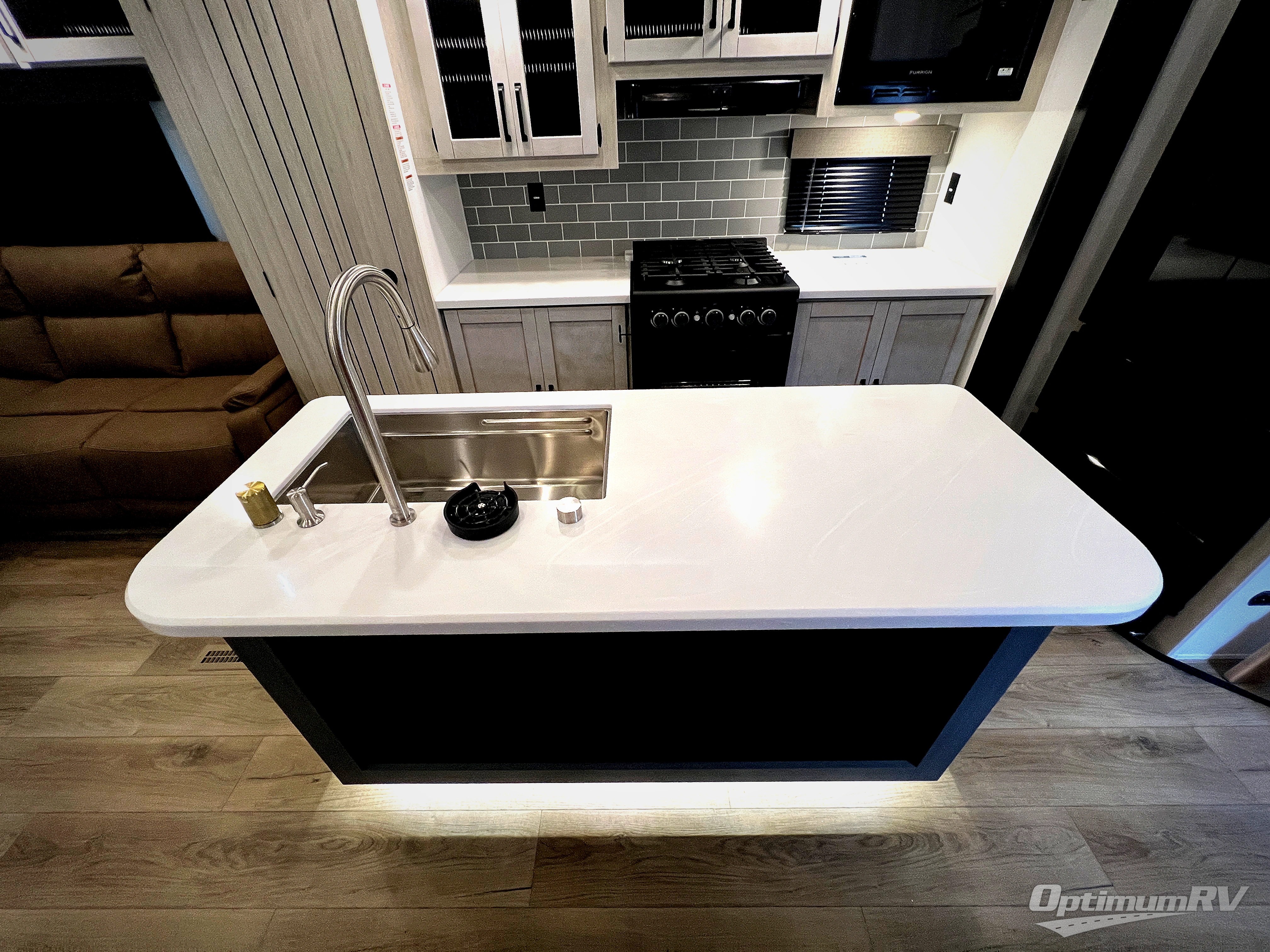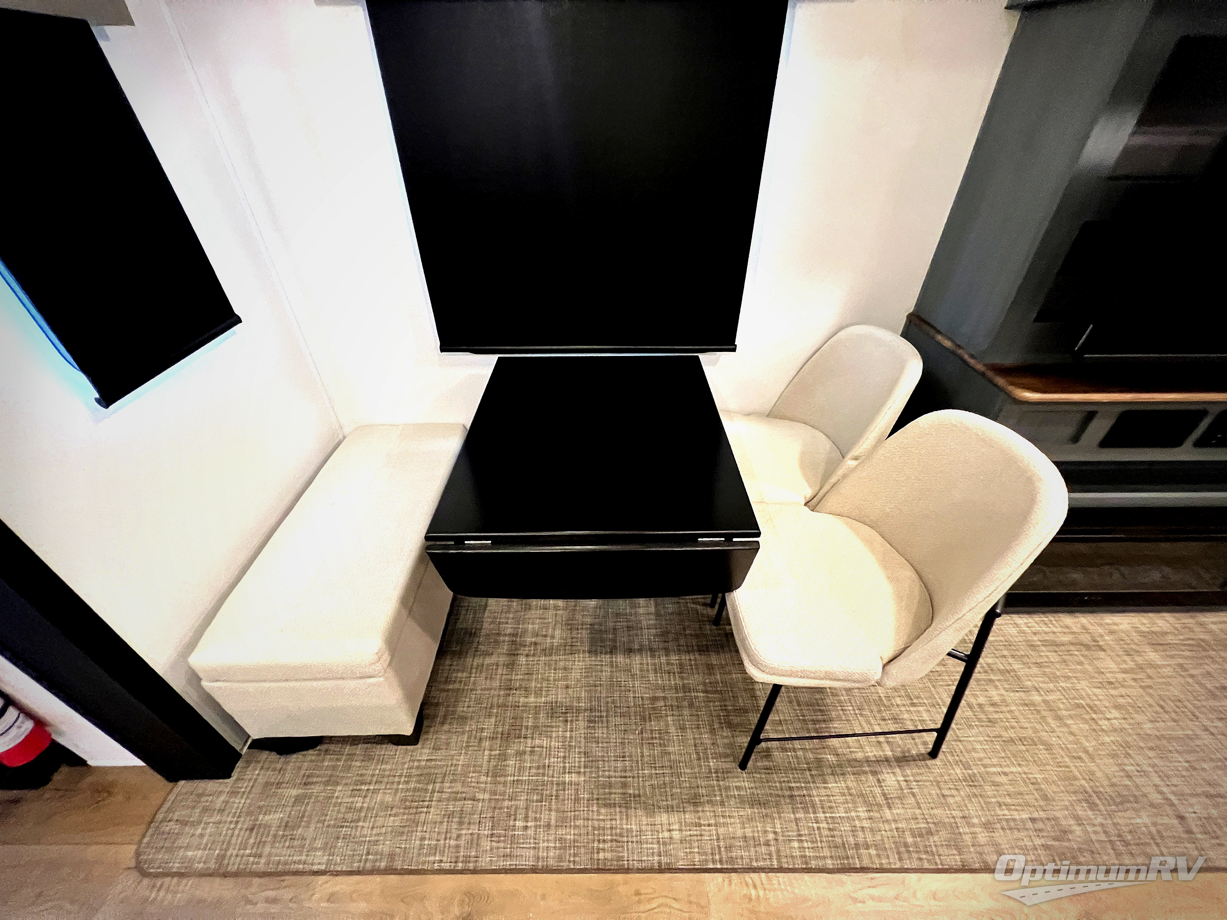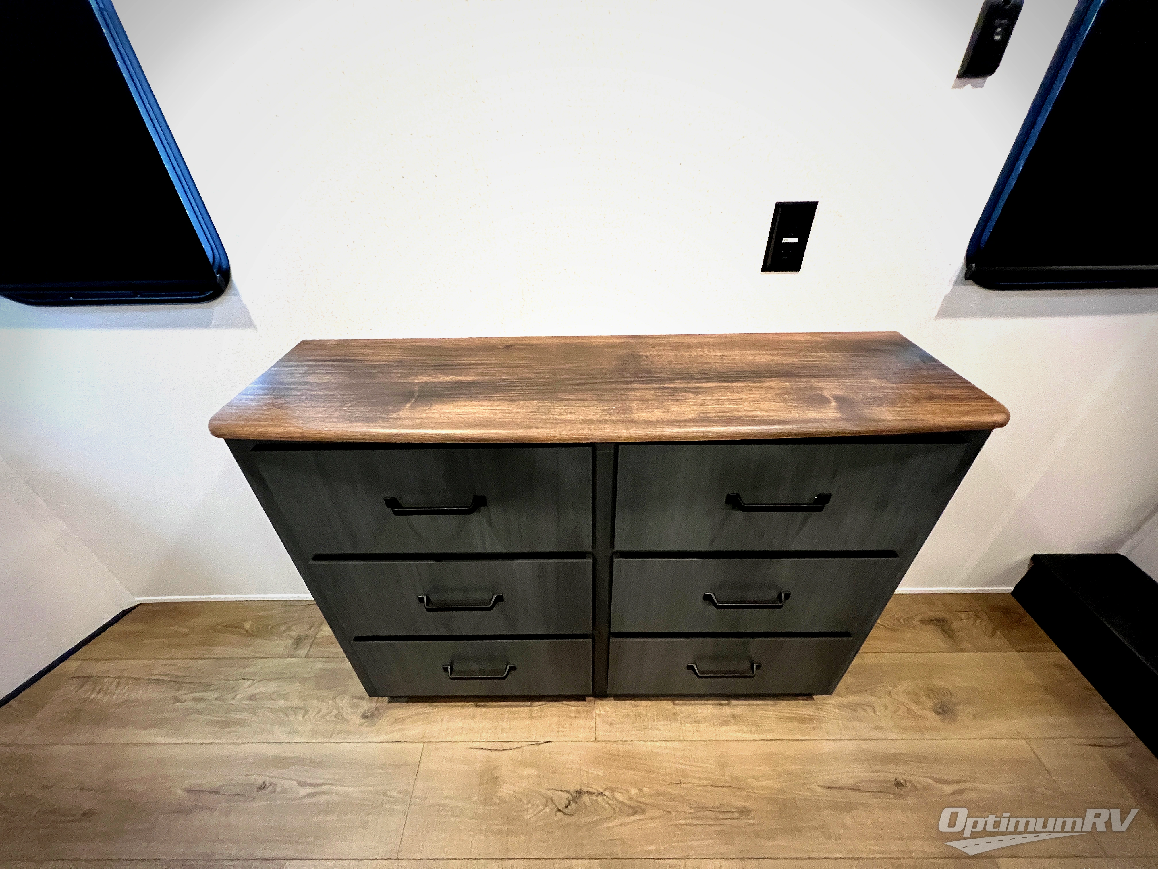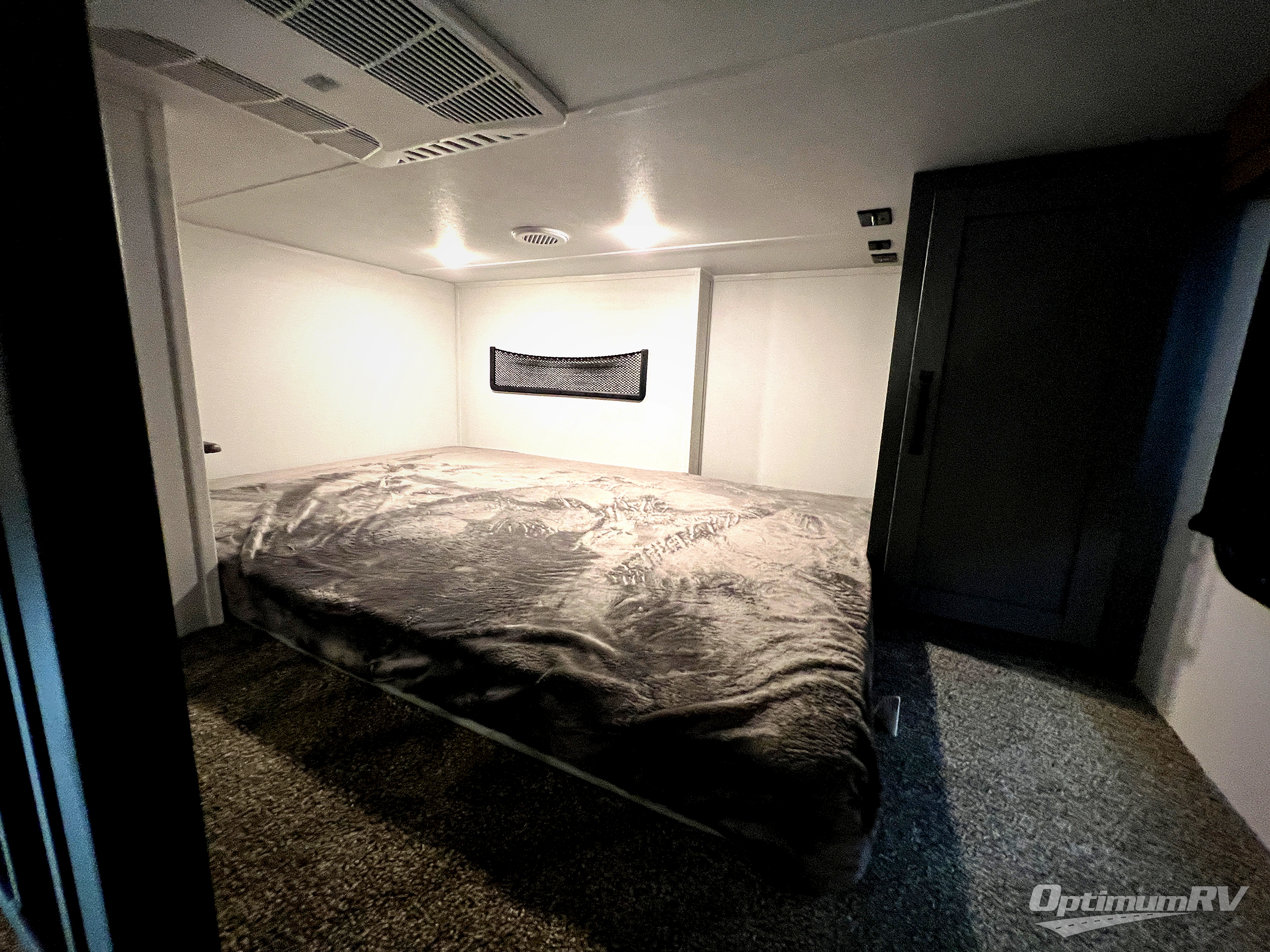 Head to your favorite spots with this destination trailer! With two entry doors, you can easily enter or exit the unit. The front private bedroom includes a king bed slide out, a wardrobe and dresser to keep your clothes organized, plus a countertop for your books or jewelry. Just outside this room is the ladder that leads to the large loft area with two 32" x 80" bunk mats, a cubby, a counter, a nightstand, and cabinets. Once you've headed back downstairs, you can relax on the L-shaped sofa across from the entertainment center with a fireplace and slide-out cabinet or the free-standing table with a bench and two seats. And the chef of your group will love the kitchen with its residential style refrigerator and pantry, kitchen island, and four burner cooktop. The full rear bathroom not only has a 32" x 40" shower with a seat to freshen up in and a closet prepped to add the optional washer and dryer, but is also below the second loft with a 32" x 80" bunk mat and closet for storage!