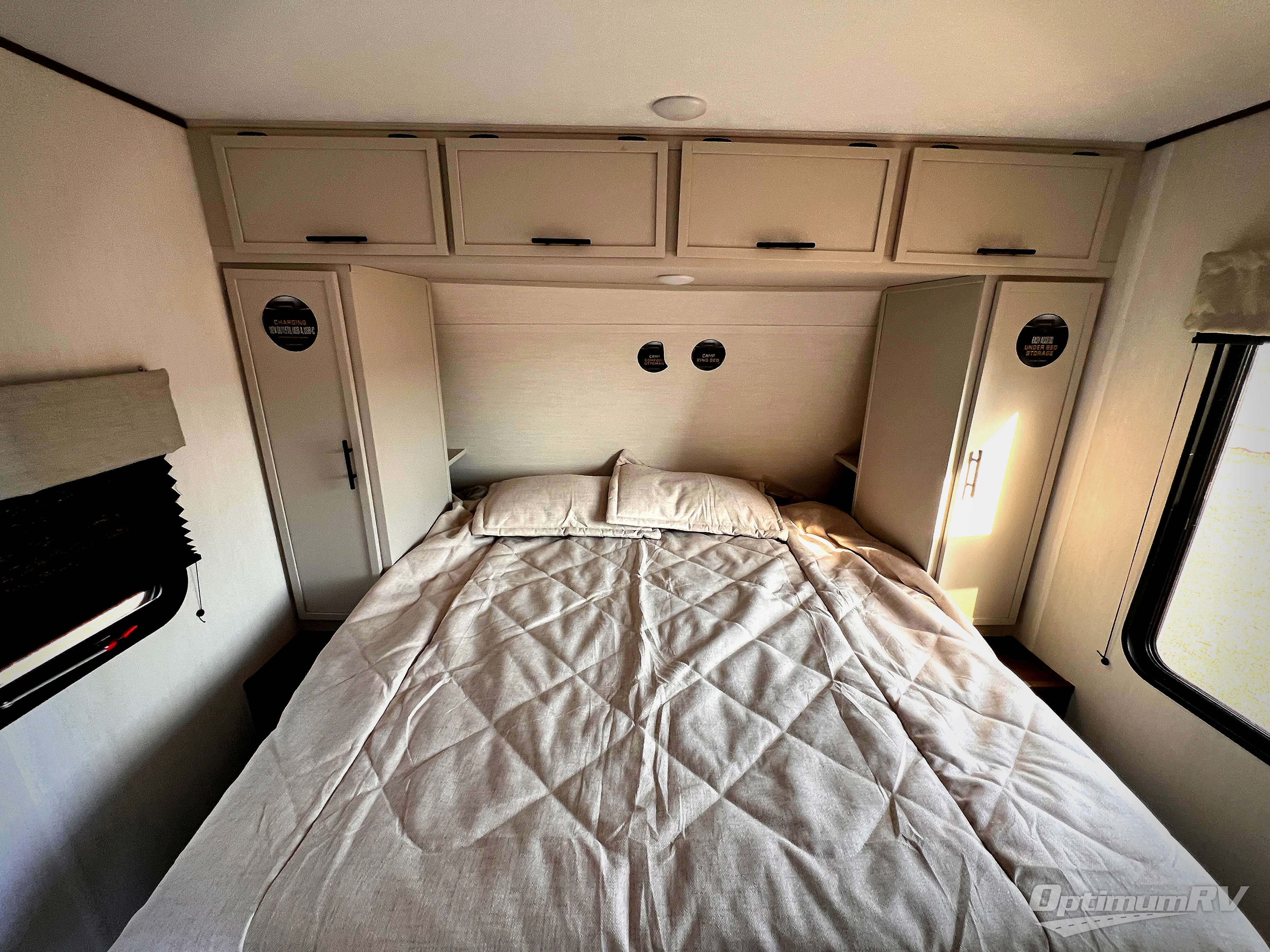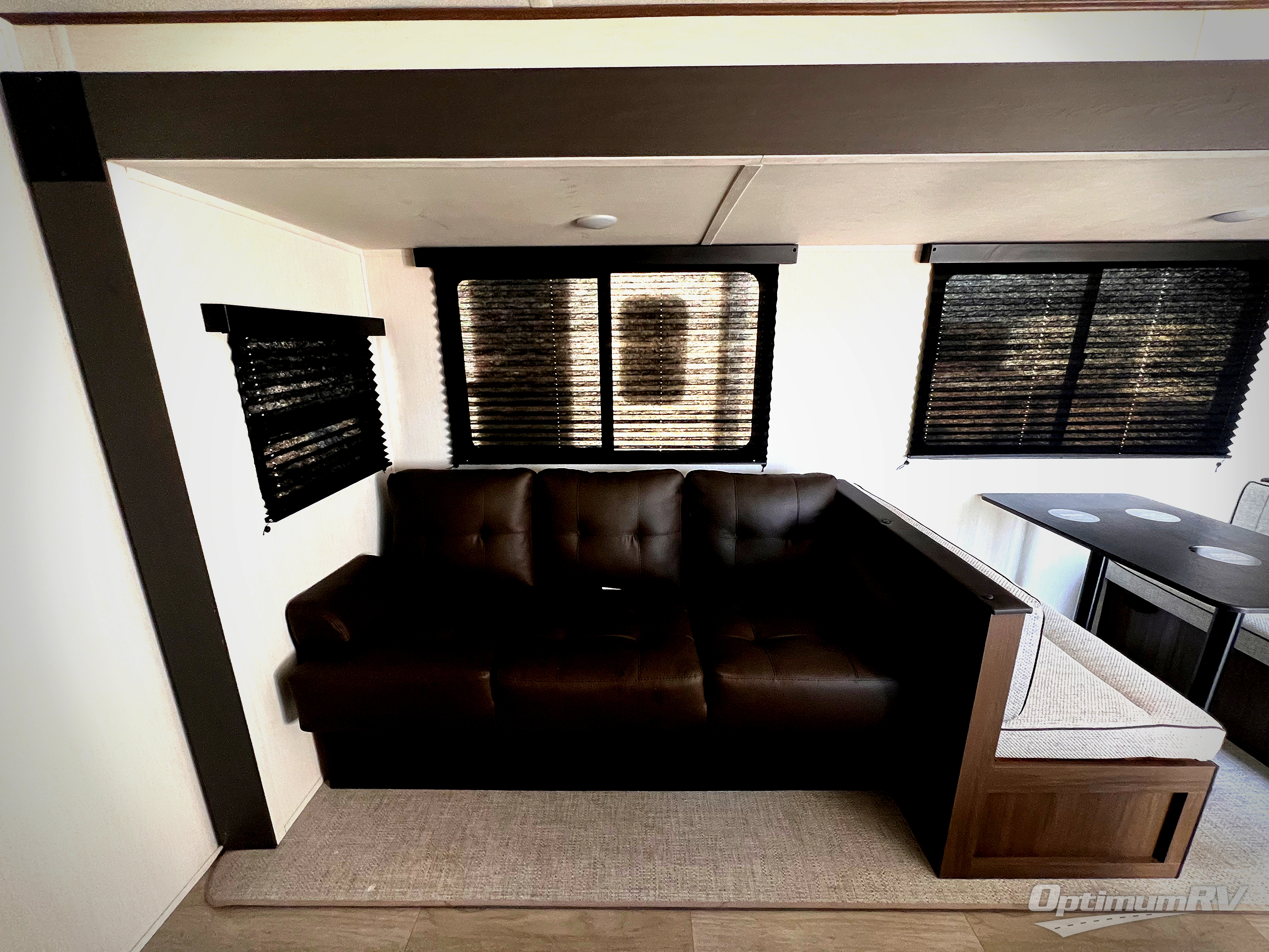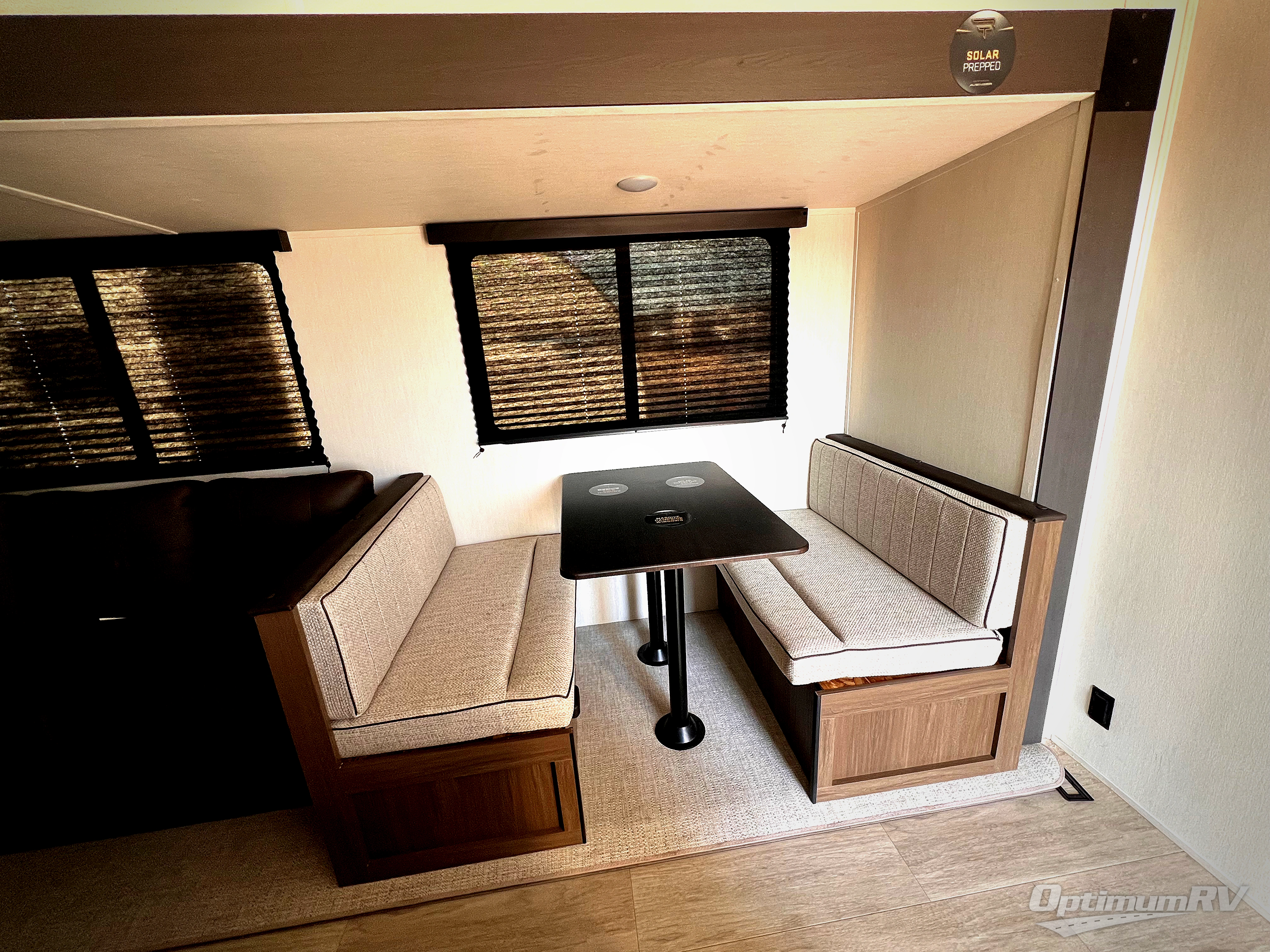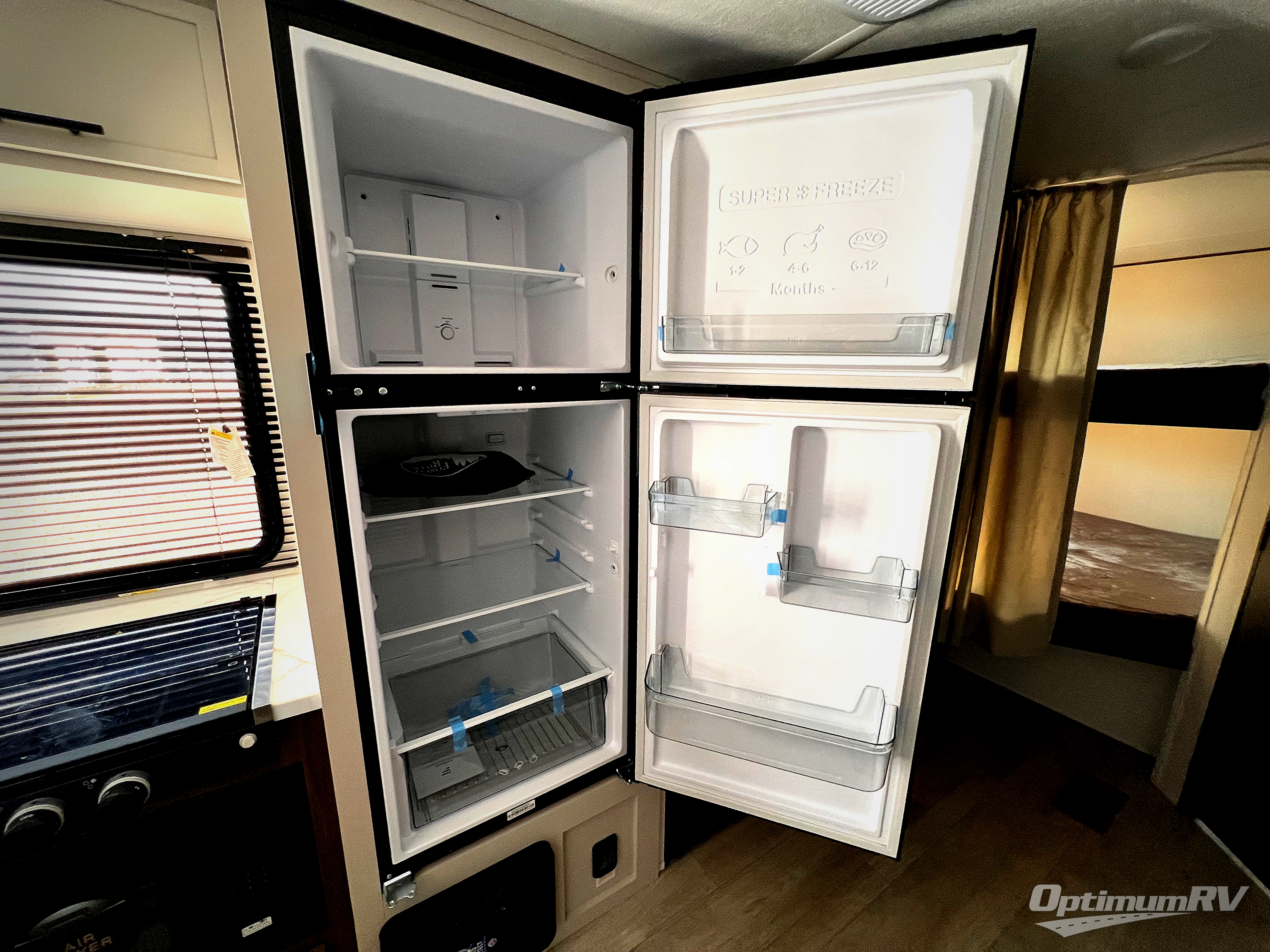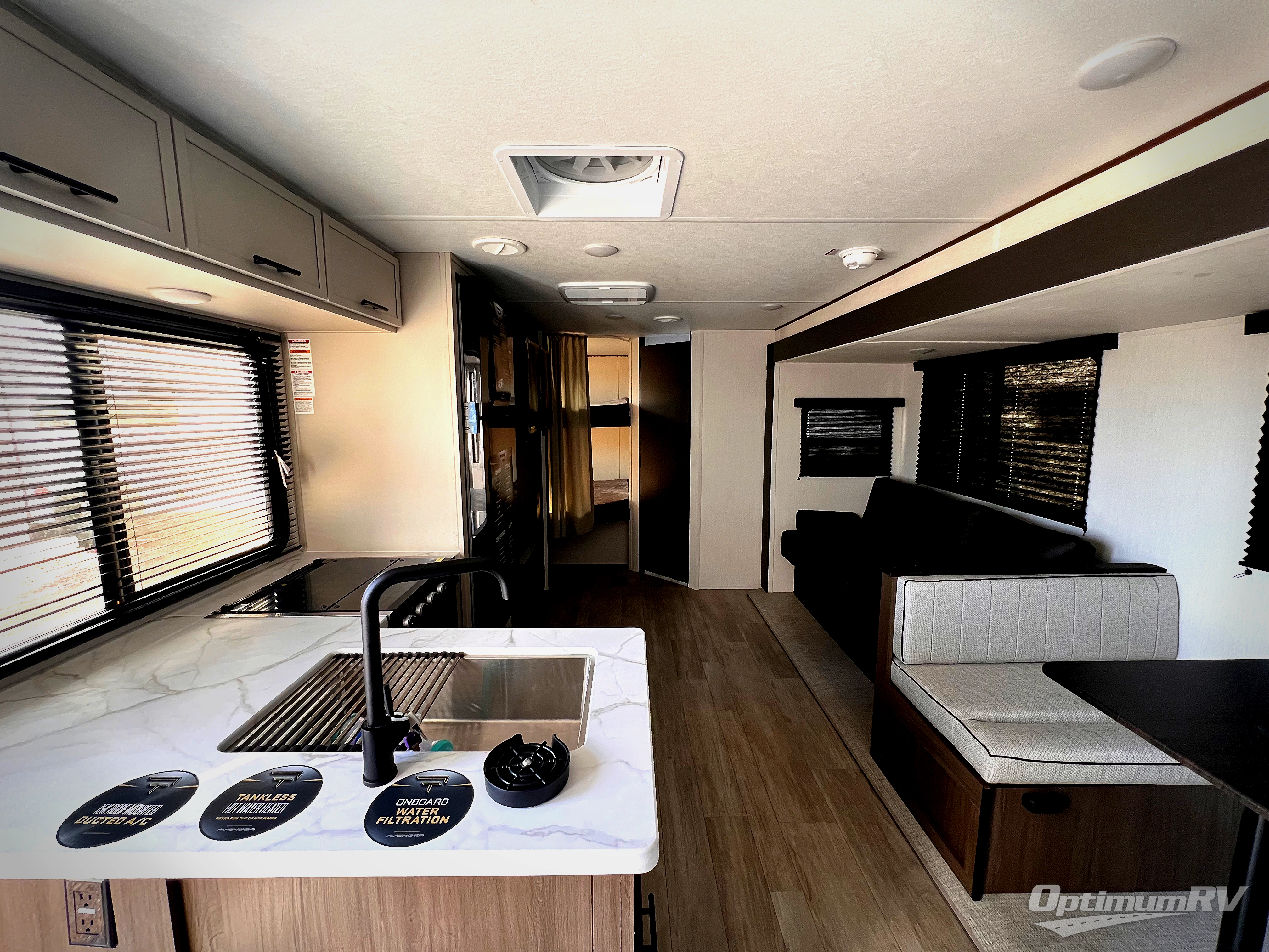 You'll appreciate the added space in this travel trailer thanks to the large slide out! The booth dinette and sofa are found here, and there is a moveable storage ottoman for extra blankets or board games. You'll have your own space up front in the private bedroom, complete with a camp king bed and storage for your things, while your guests take the double-size bunk beds towards the back. The chef of your group will find a three burner cooktop and a built-in convection microwave with an air fryer to cook meals, plus there is a 12V refrigerator and large hidden pantry for food storage. This unit also includes a power awning outdoors and an outside refrigerator to keep cold drinks close by.