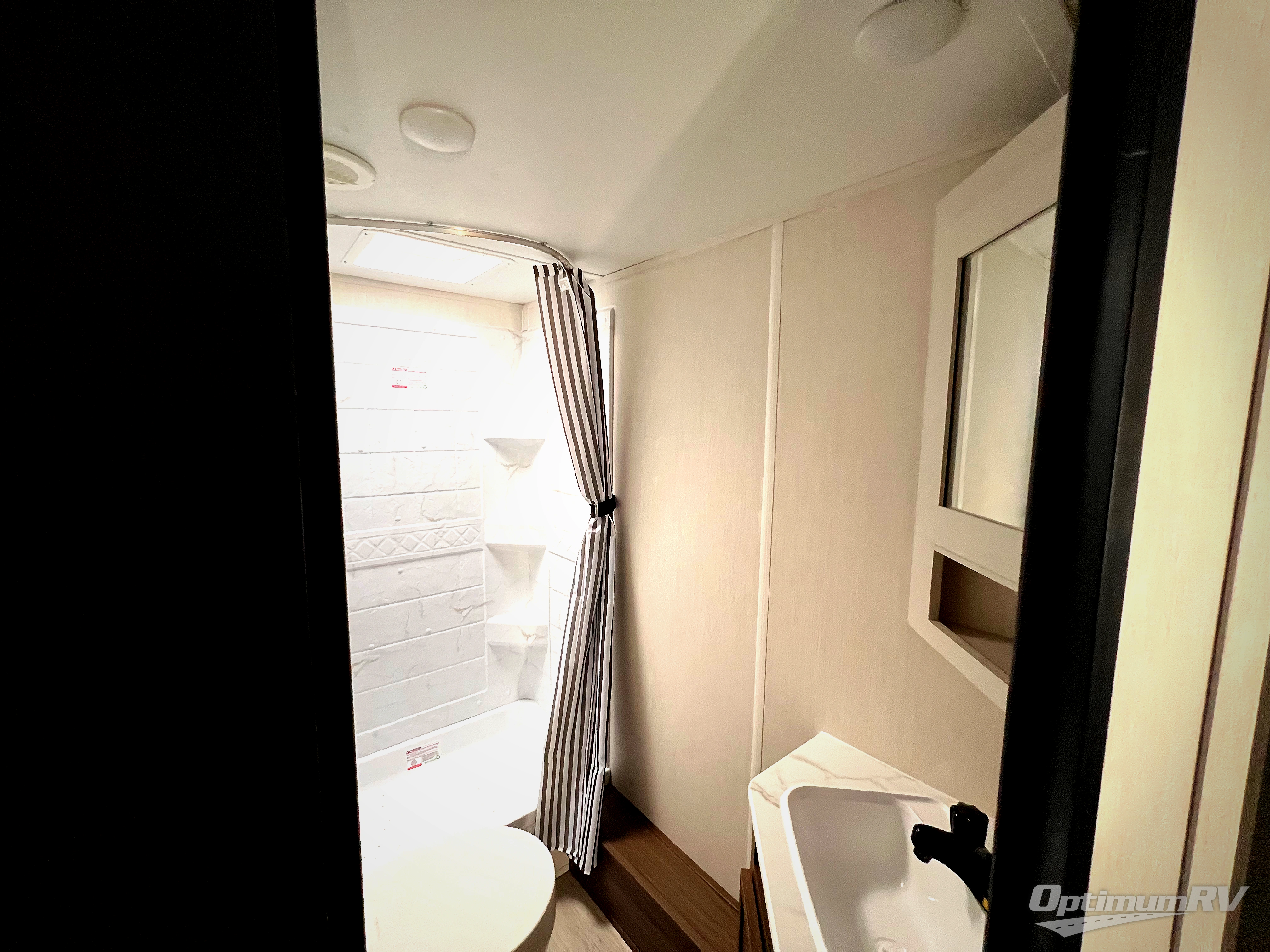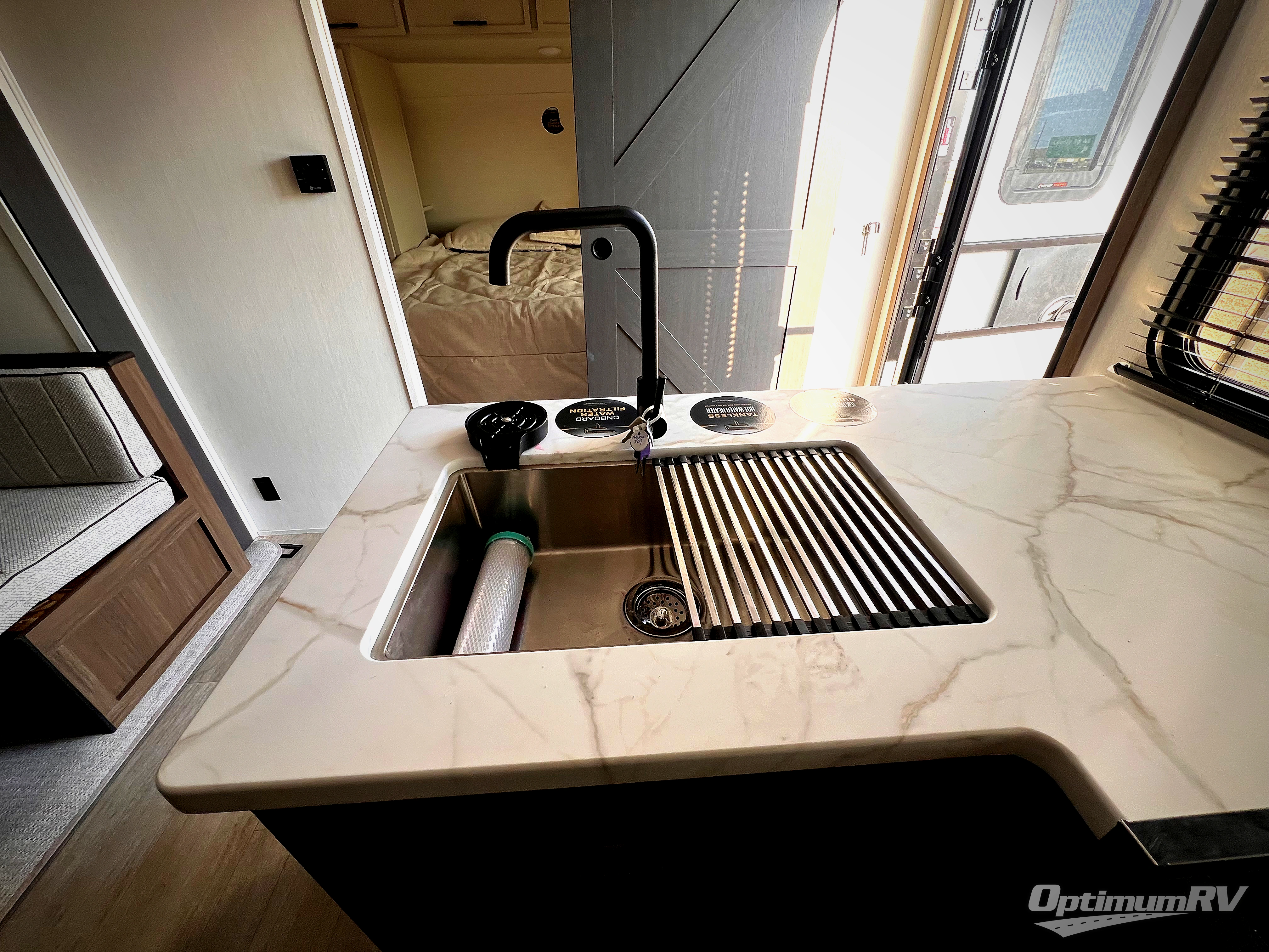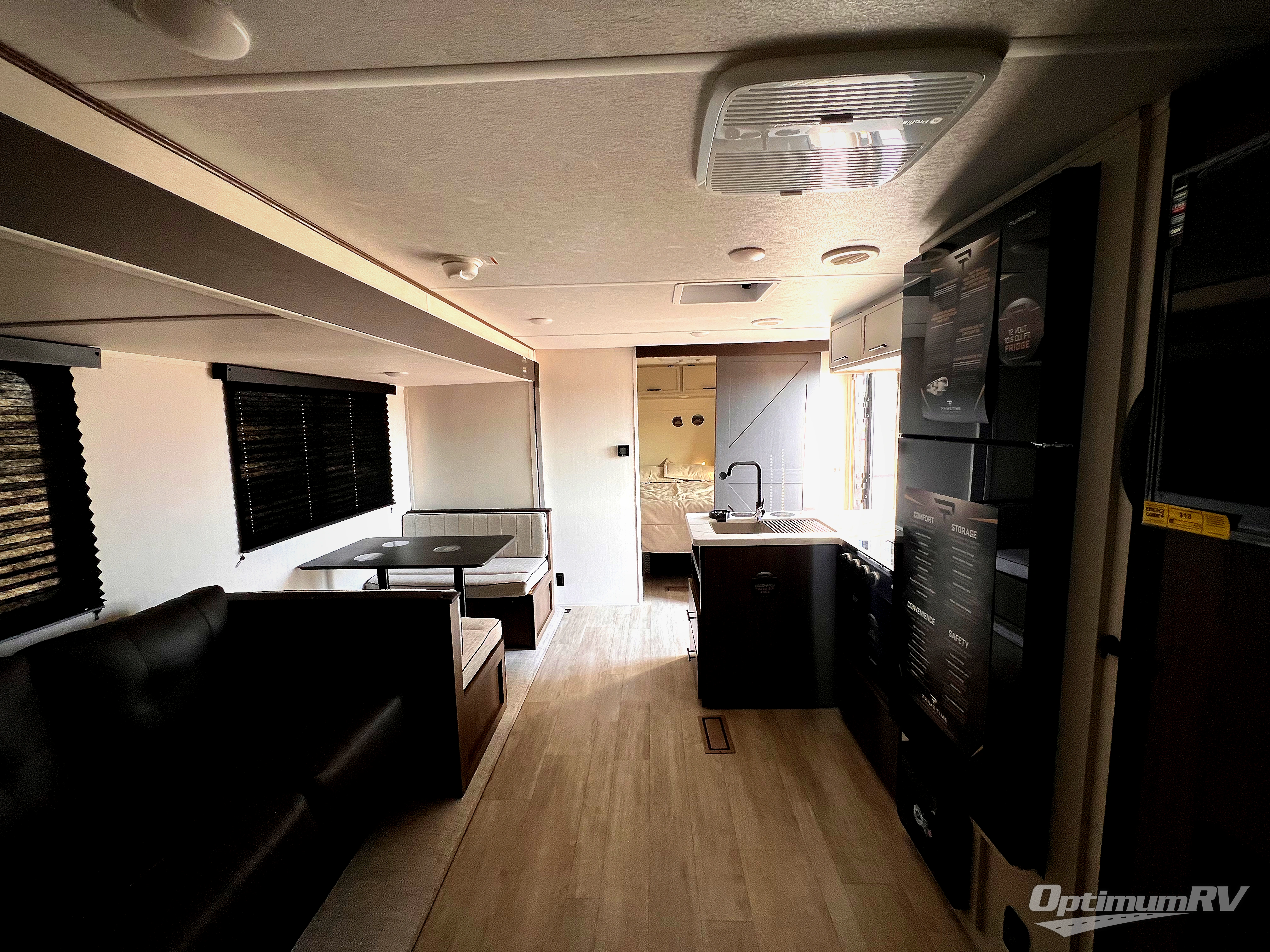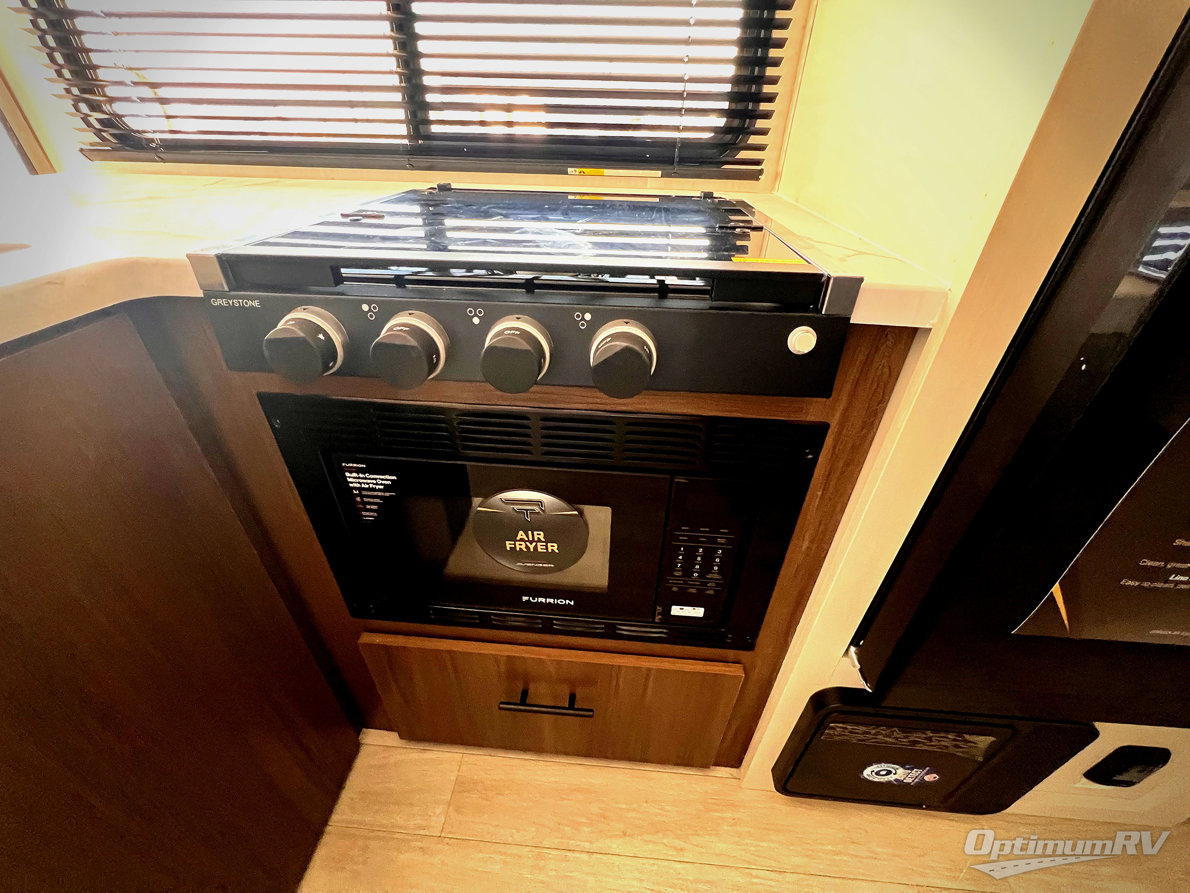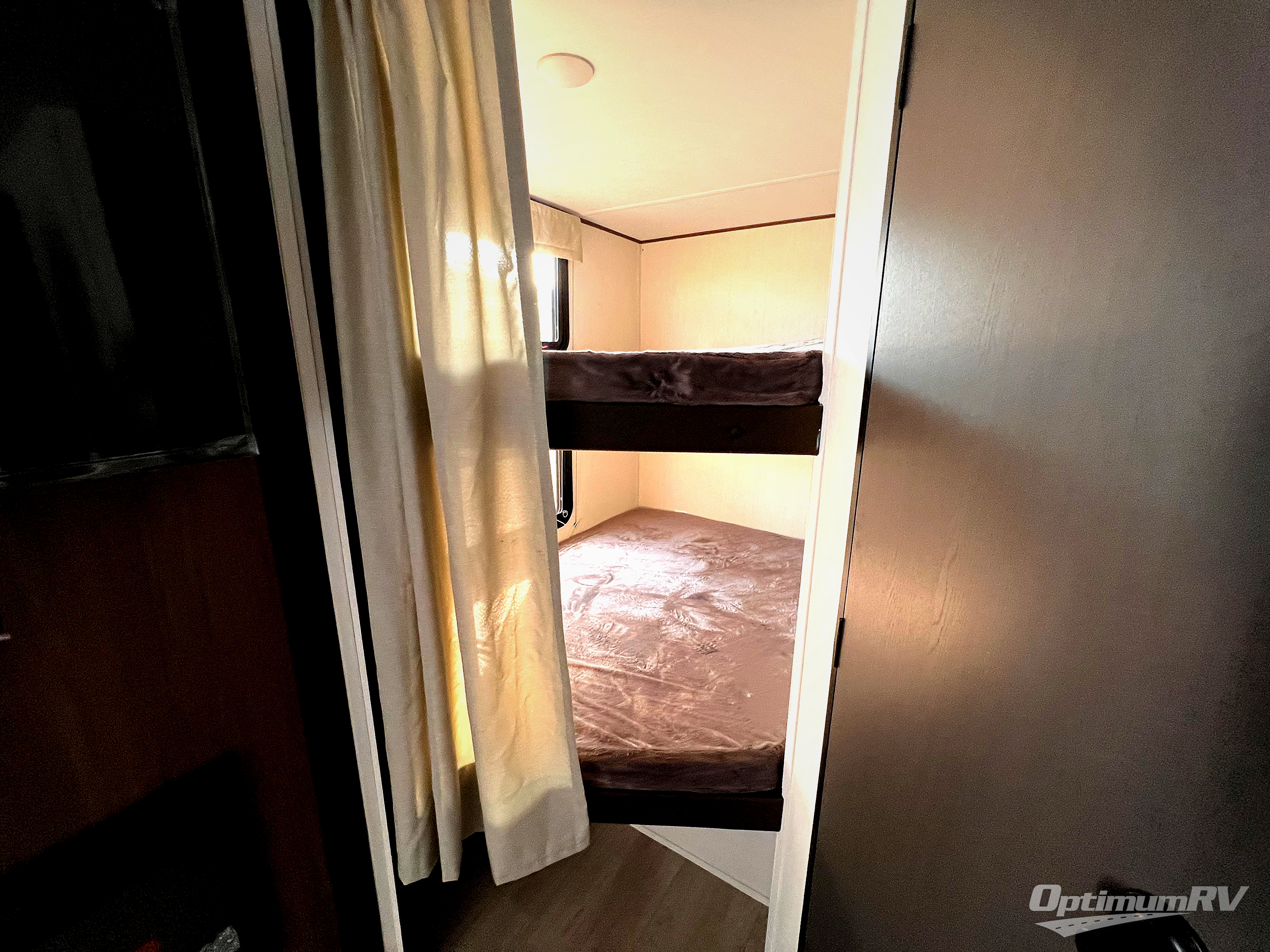 You'll appreciate the added space in this travel trailer thanks to the large slide out! The booth dinette and sofa are found here, and there is a moveable storage ottoman for extra blankets or board games. You'll have your own space up front in the private bedroom, complete with a camp king bed and storage for your things, while your guests take the double-size bunk beds towards the back. The chef of your group will find a three burner cooktop and a built-in convection microwave with an air fryer to cook meals, plus there is a 12V refrigerator and large hidden pantry for food storage. This unit also includes a power awning outdoors and an outside refrigerator to keep cold drinks close by.