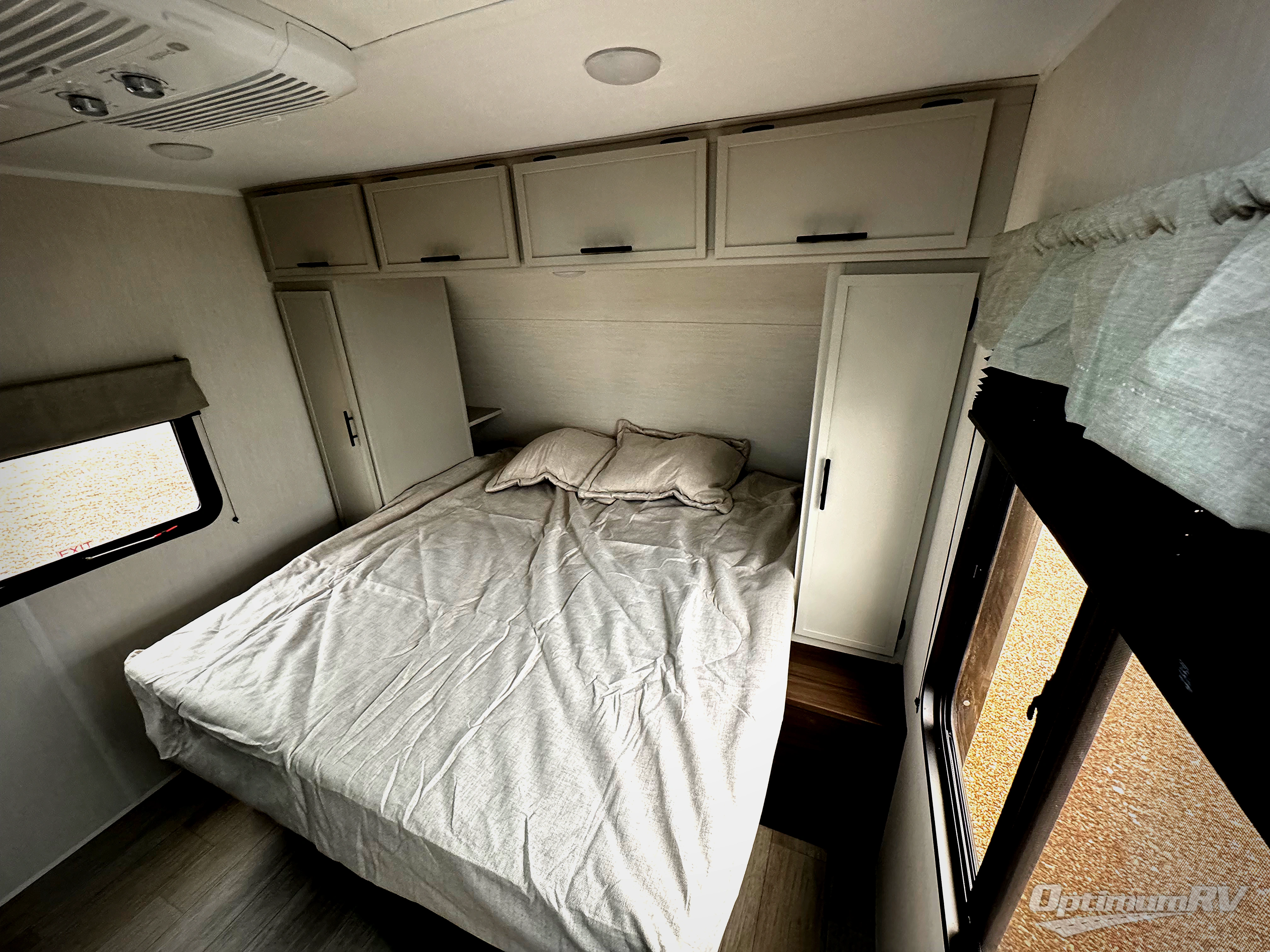 There is ample space to move about in this travel trailer thanks to the dual opposing slides! Here, you'll find an L-shaped sofa with a chaise lounge in direct view of TV and fireplace. There is also a hidden pantry behind the TV for snacks and movies! The center farm table includes four stools so you can gather around for meal times, and the desk with a chair will provide a place for you to get some work done if needed. This unit features a full bath towards the front private bedroom for easy access at night, and you're sure to get a great night's rest on the camp king bed!