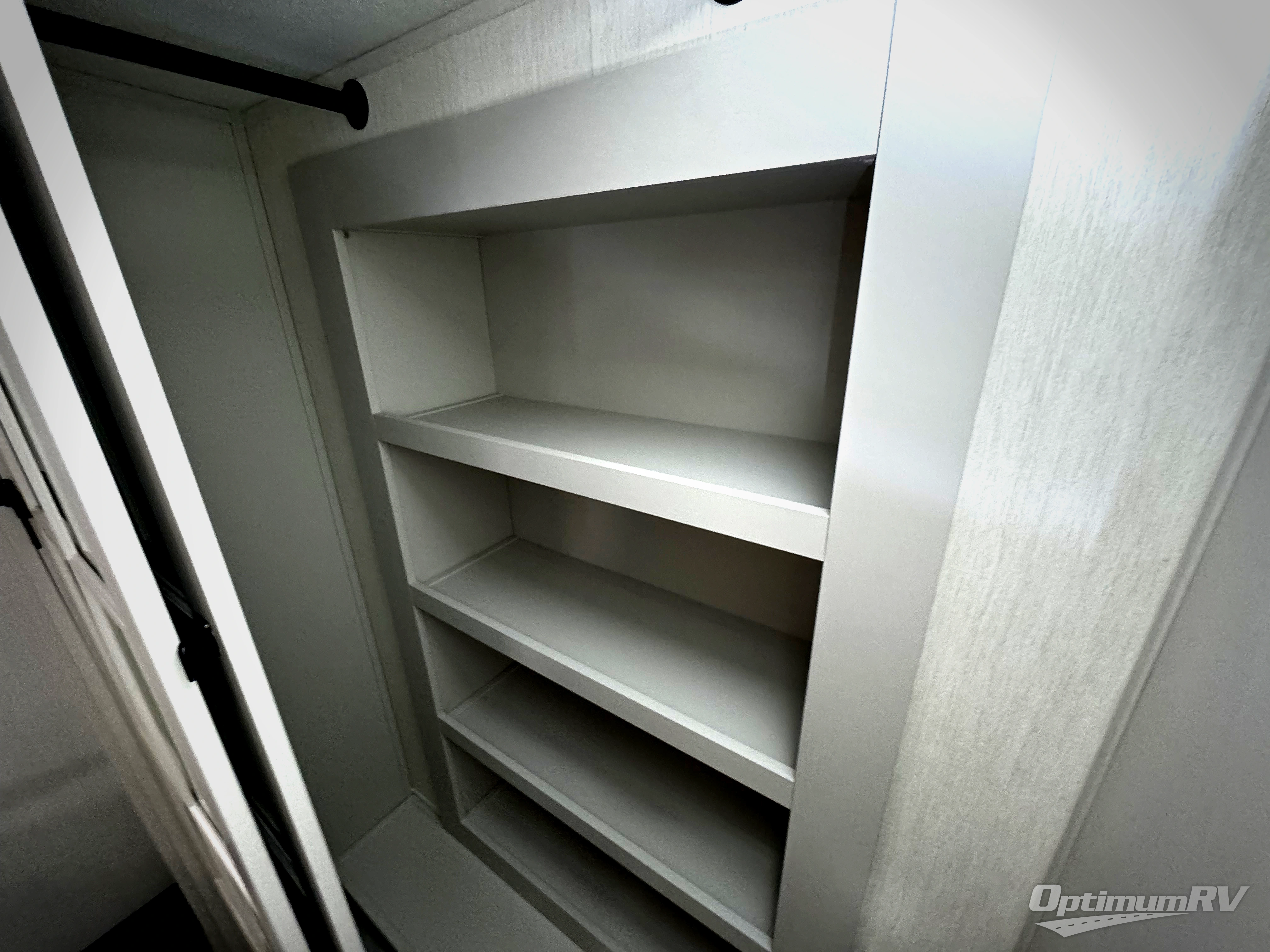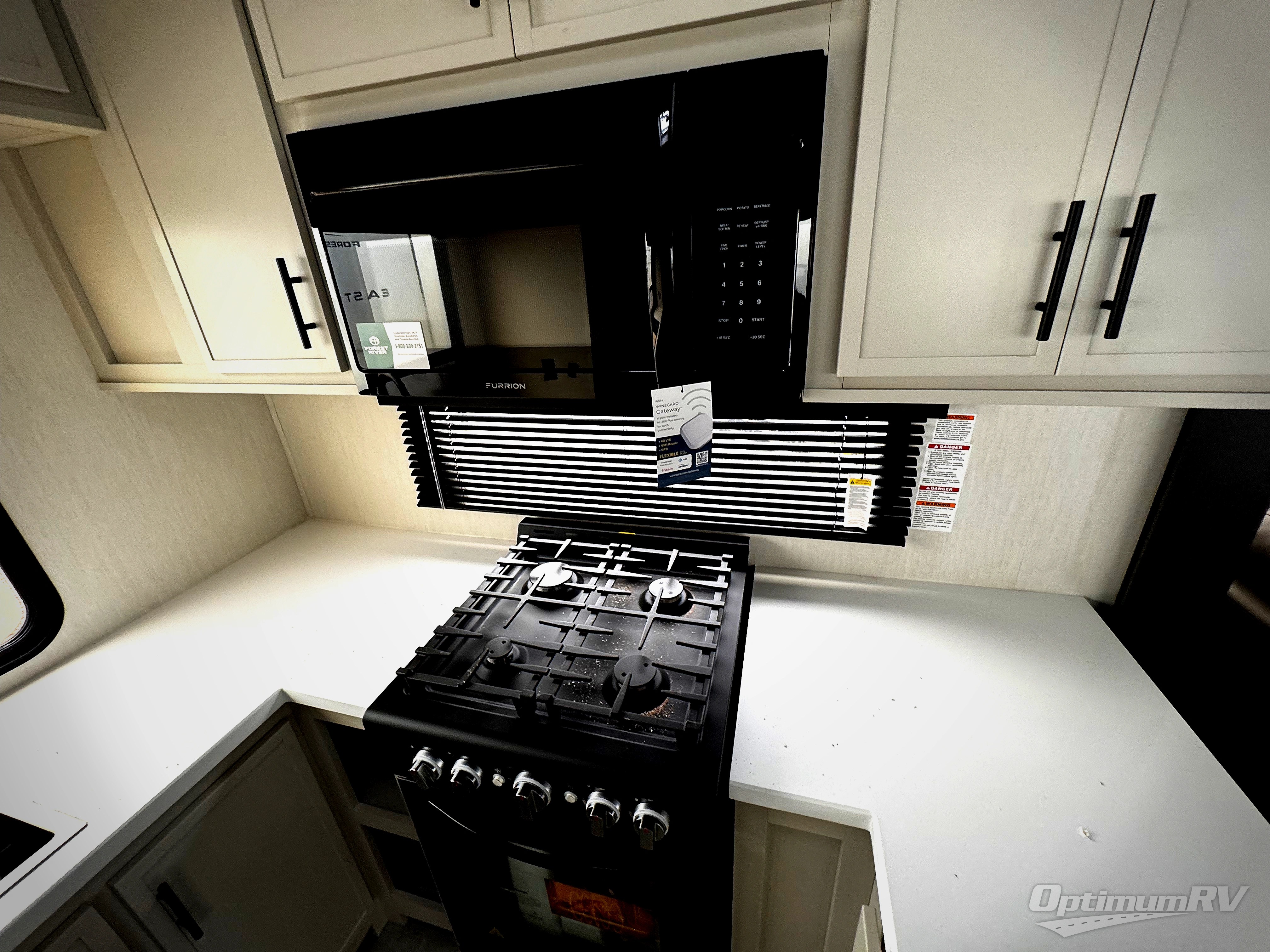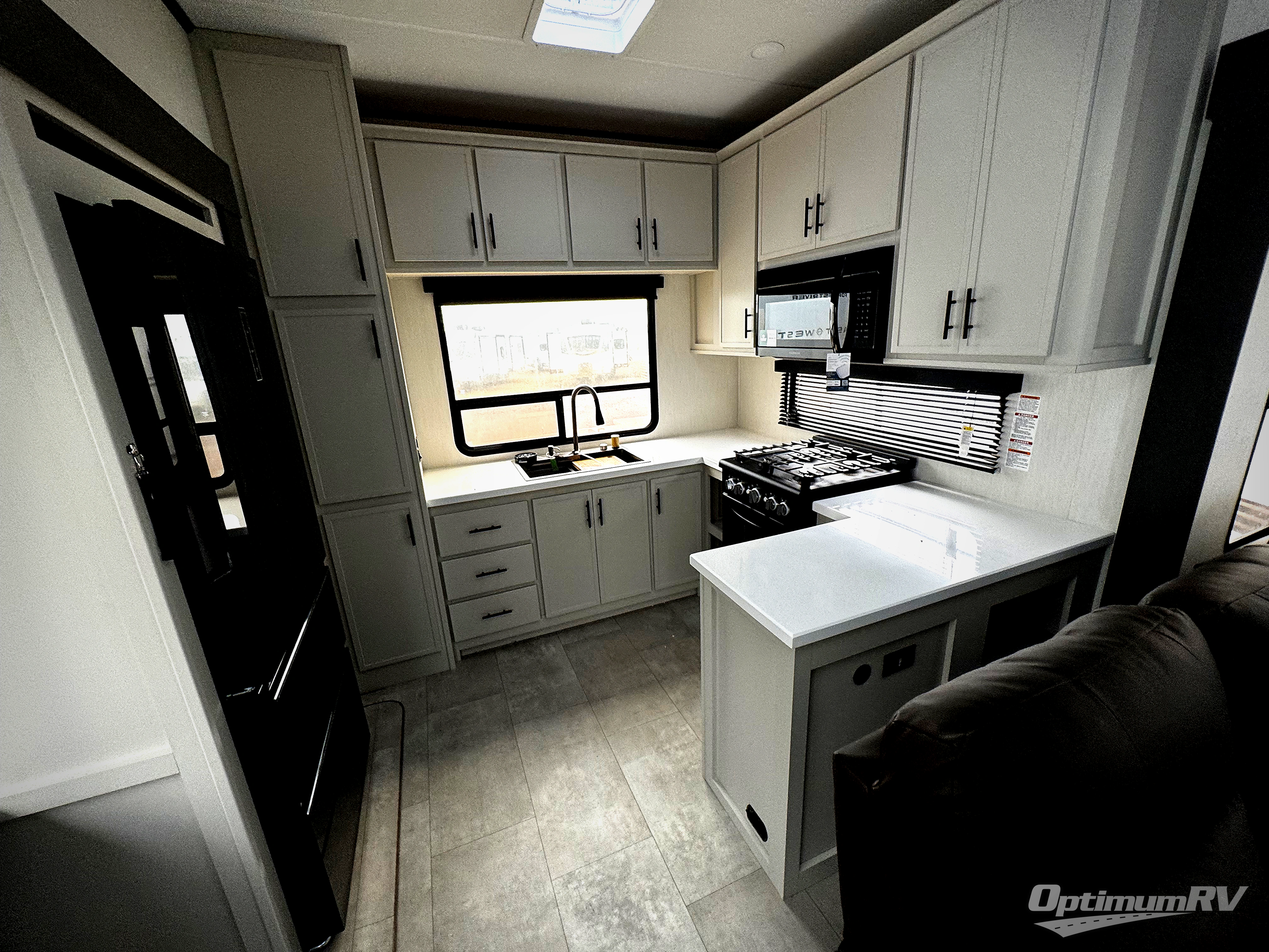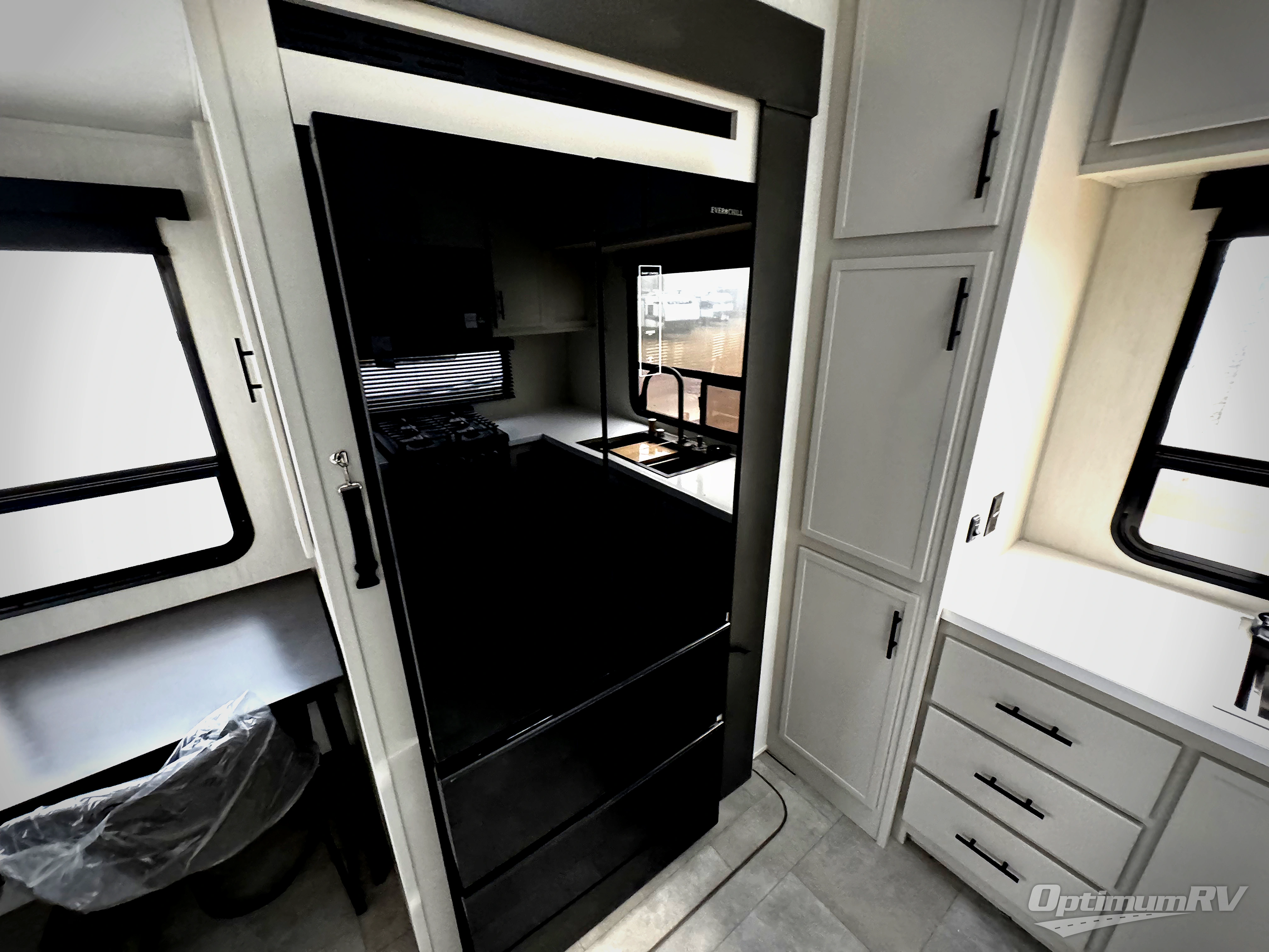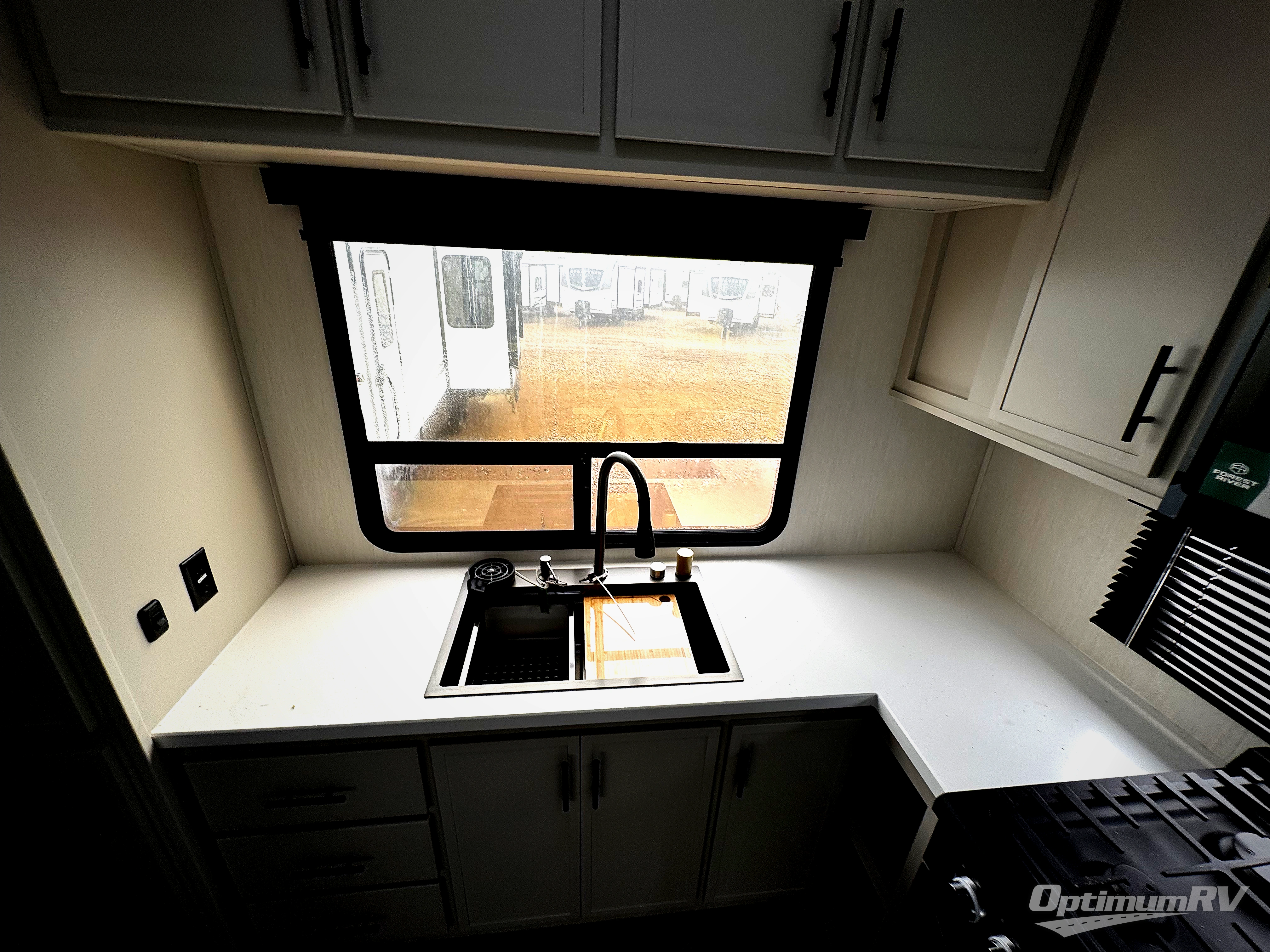 If you enjoy camping with family or friends, this fifth wheel is sure to meet all of your needs! The front bedroom includes a King bed slide out for more space and comfort, plus a front wardrobe/washer and dryer prep. And the full bath is right next door for easy nighttime use. The living room is made spacious thanks to the dual opposing slides, and you'll find a sectional sleeper sofa here, as well as a hybrid desk/dinette, perfect for a quick meal and to catch up with some emails. And don't overlook the rear kitchen with ample counter space, a four burner range, an accessory sink and a French door 12V refrigerator!