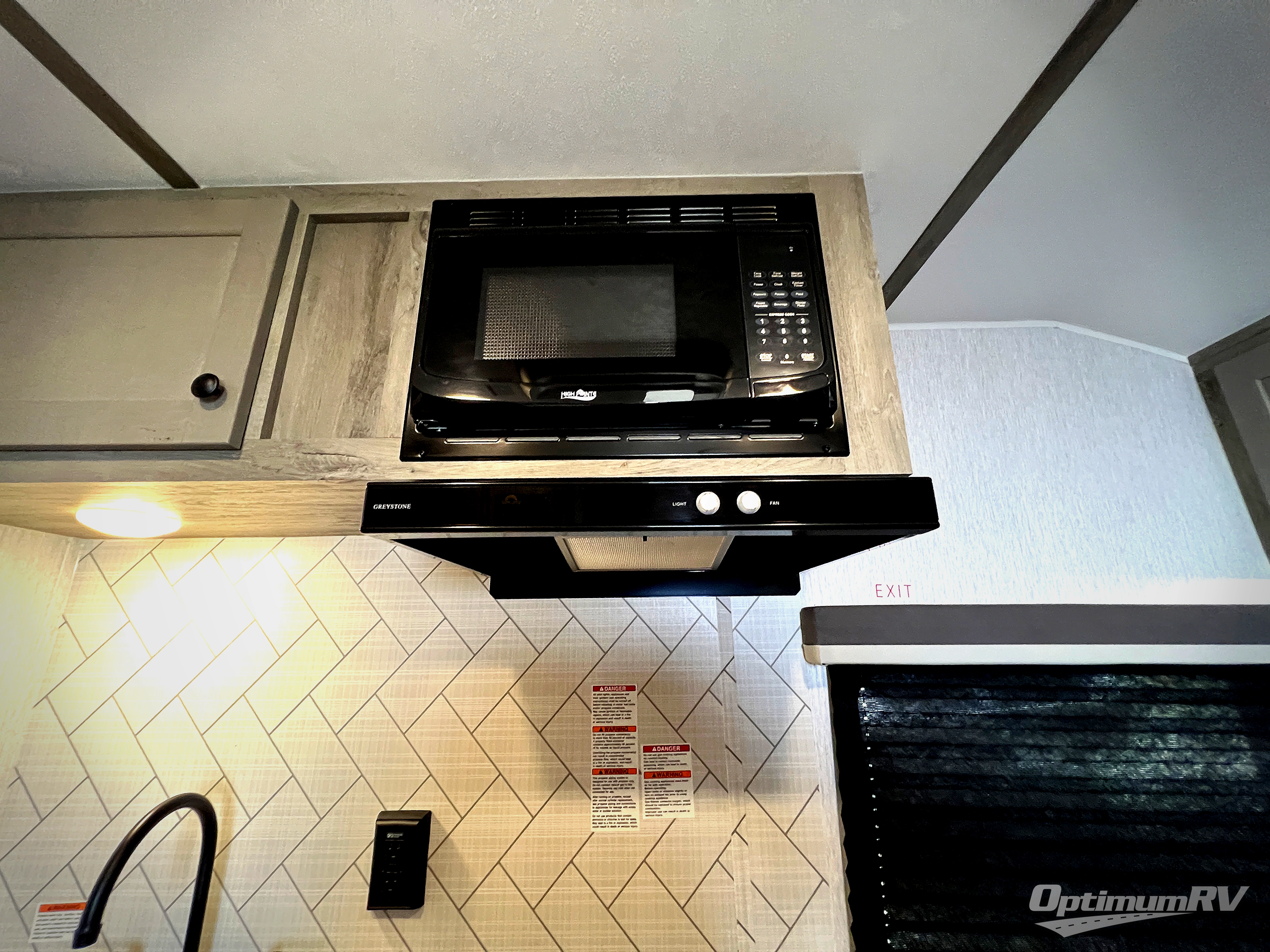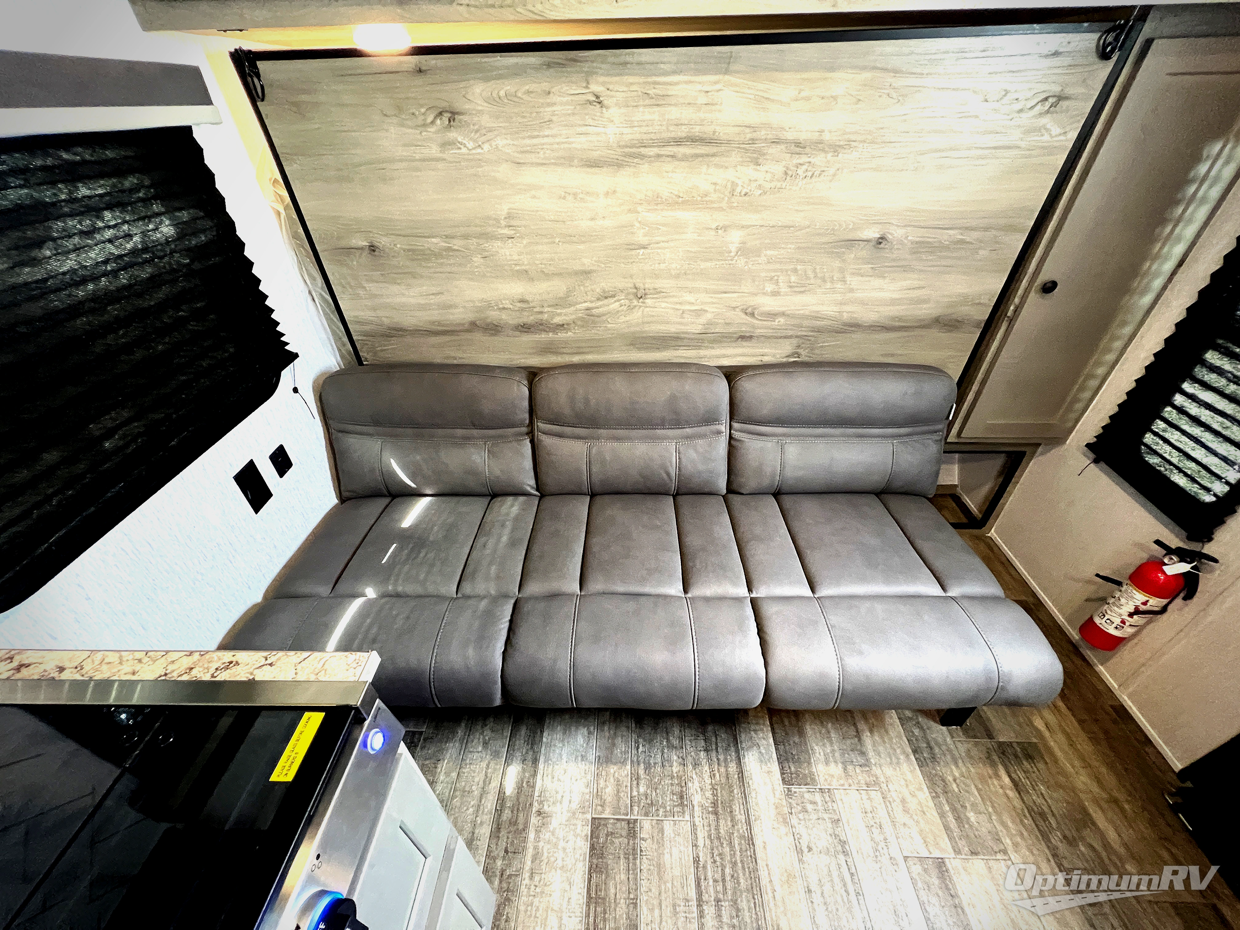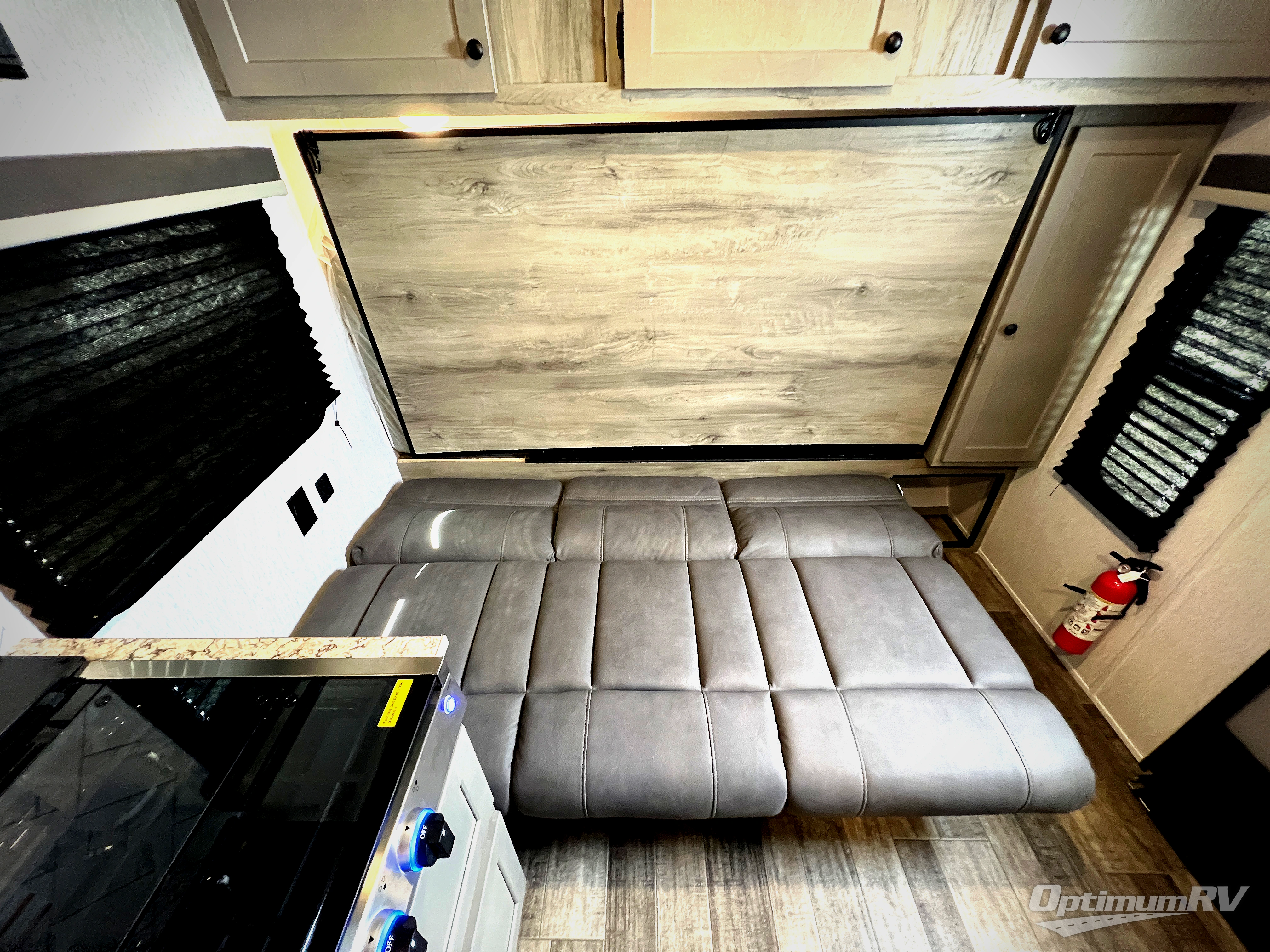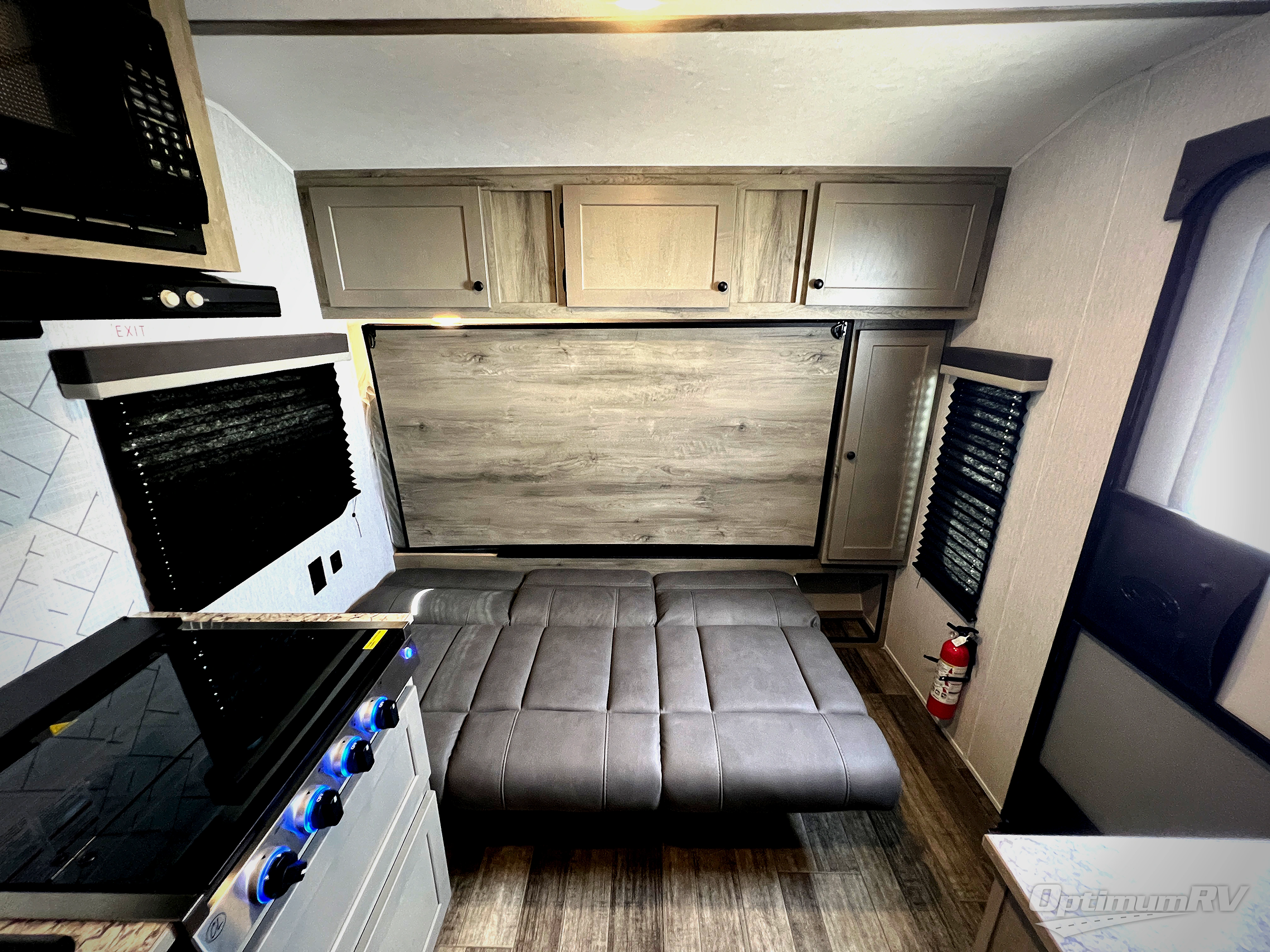 This compact travel trailer will be perfect for trips to the lake. Since there is a front Murphy bed, you won't have to sleep on an air mattress, and the convenient rear full bathroom lets you freshen up each day. Breakfast can be made on either the three burner cooktop, warmed up in the microwave oven, or even at the outside kitchen. When you're ready to wind down at night, you can grab a book and head to the sofa for a relaxing evening!