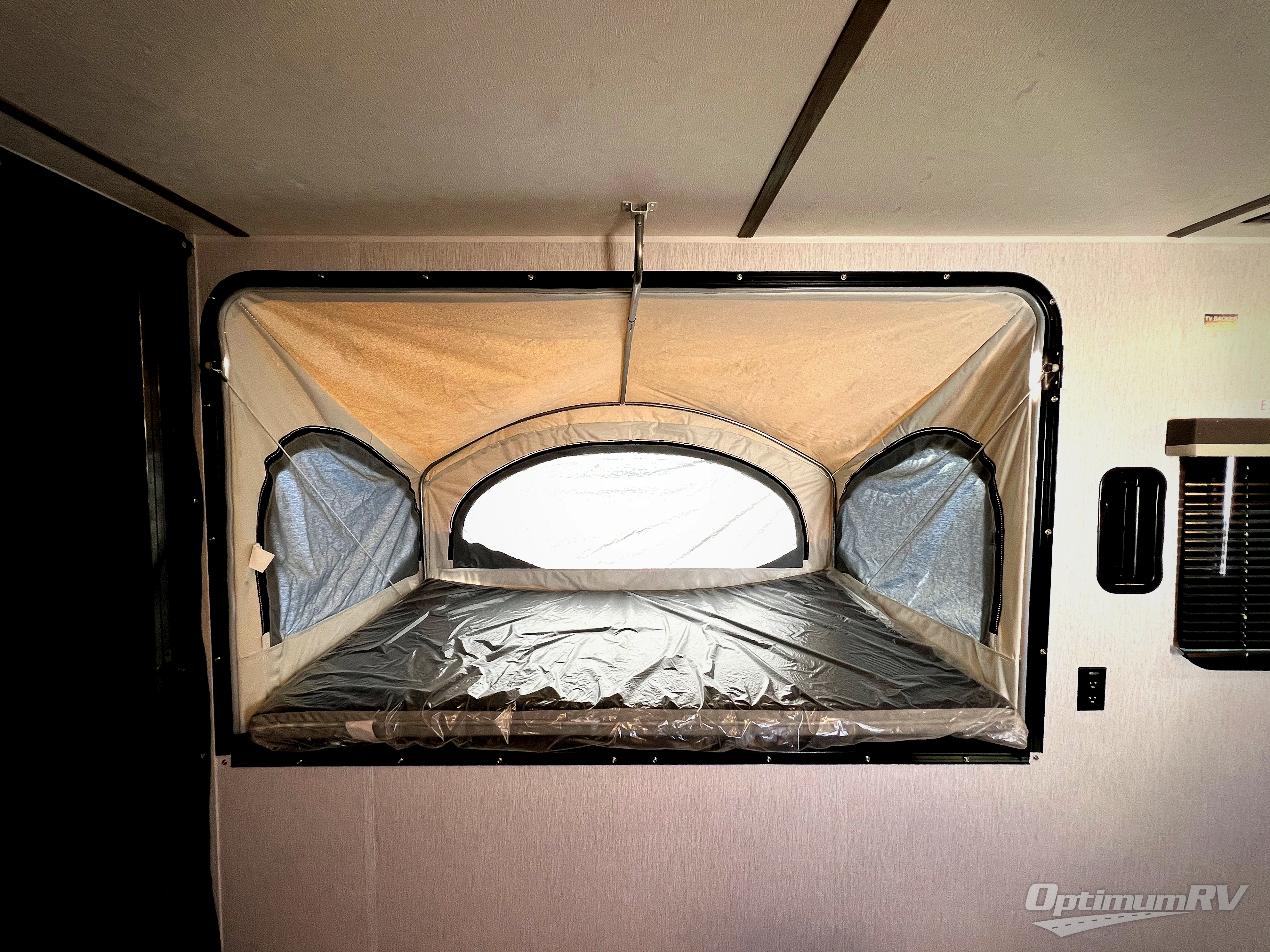 Get ready for a great camping experience where you can take along your favorite ride-on toys, kayaks, or other items that you may not normally have room to load as this toy hauler features a 6' 9" cargo width and 10' 11" cargo length. Once unloaded, set up with the rear bed that will make for a great night's rest. The front of this unit is shared with the wet bath and kitchen. Here, you can make meals on the two burner stove or in the microwave oven, and there is a refrigerator for perishables. And when the optional tent bed is added on this model, you can sleep more campers!