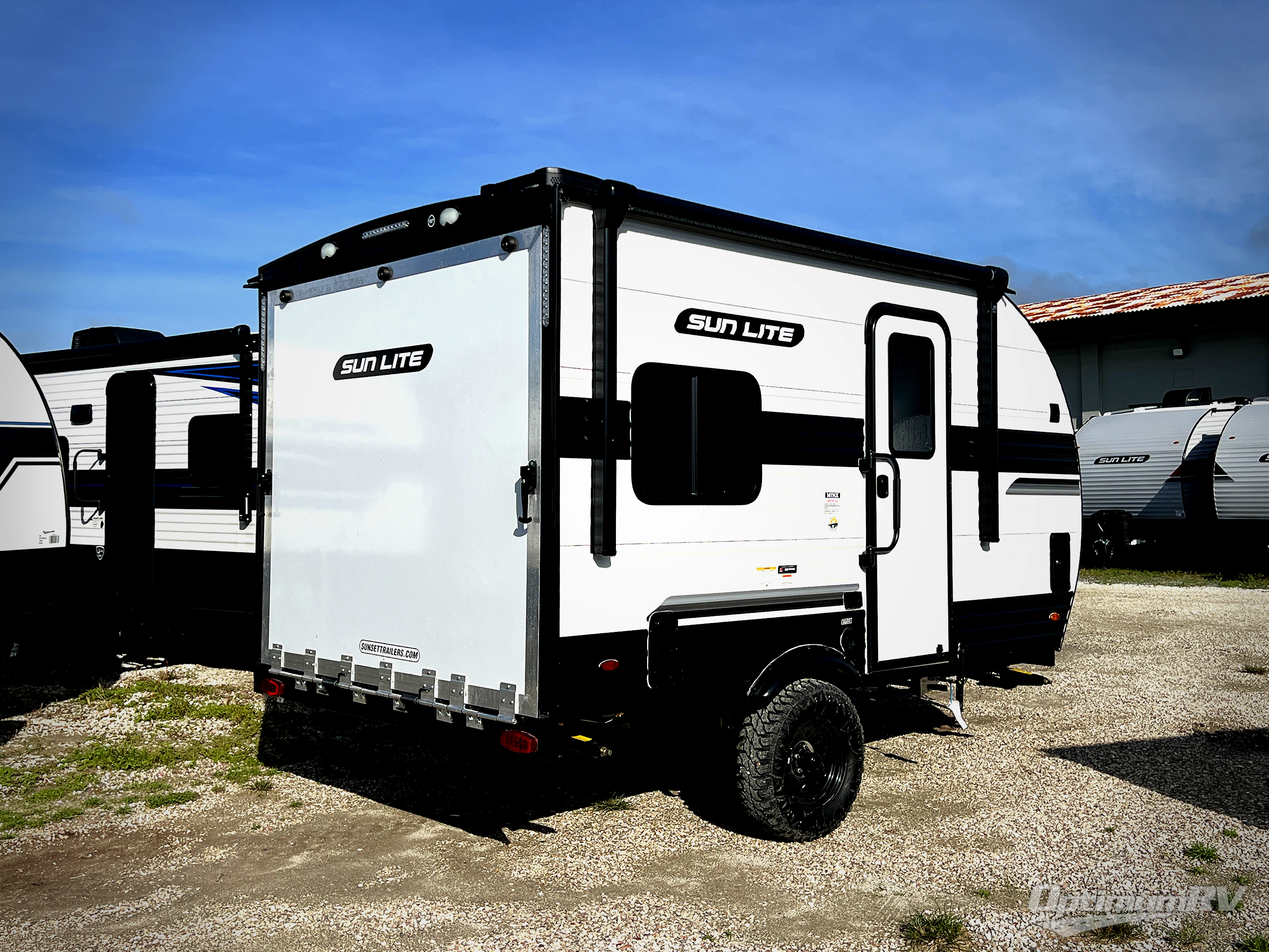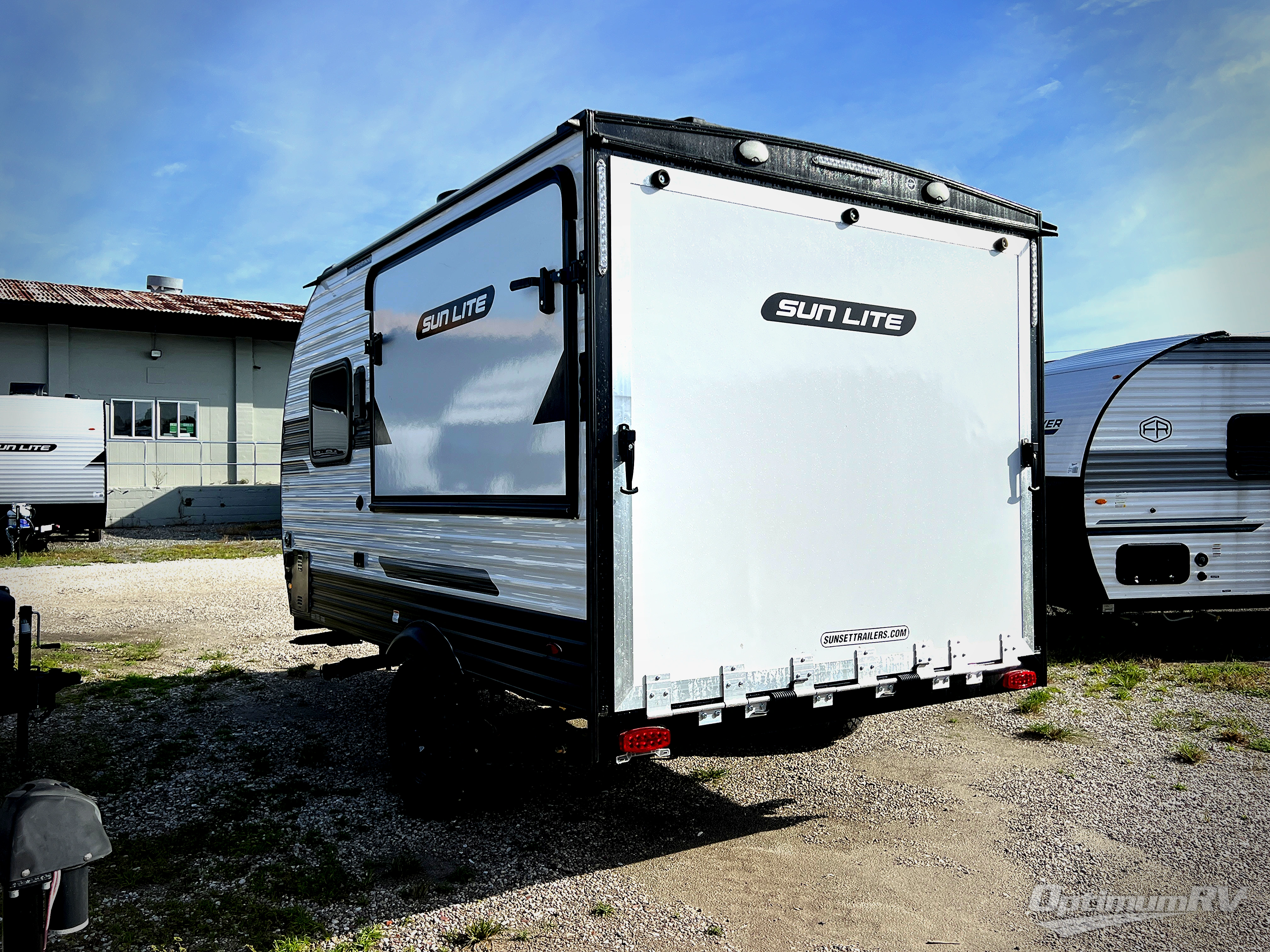 You can trust the build and enjoy your experience with any one of these Sunset Park RV Sun Lite travel trailers or toy haulers! Their aerodynamic profile is not only easy to haul, but also saves on fuel. They are built to withstand years of traveling even though they are lightweight with a diamond plate rock guard, a one piece PVC roof membrane, Dexter Spring-Leaf axles, and tinted safety glass windows. Some comfort standards you are sure to enjoy are the two-burner stove top range with hood, light and fan, plus the refrigerator and microwave, and an outside shower to help keep the dirt outdoors where it belongs.