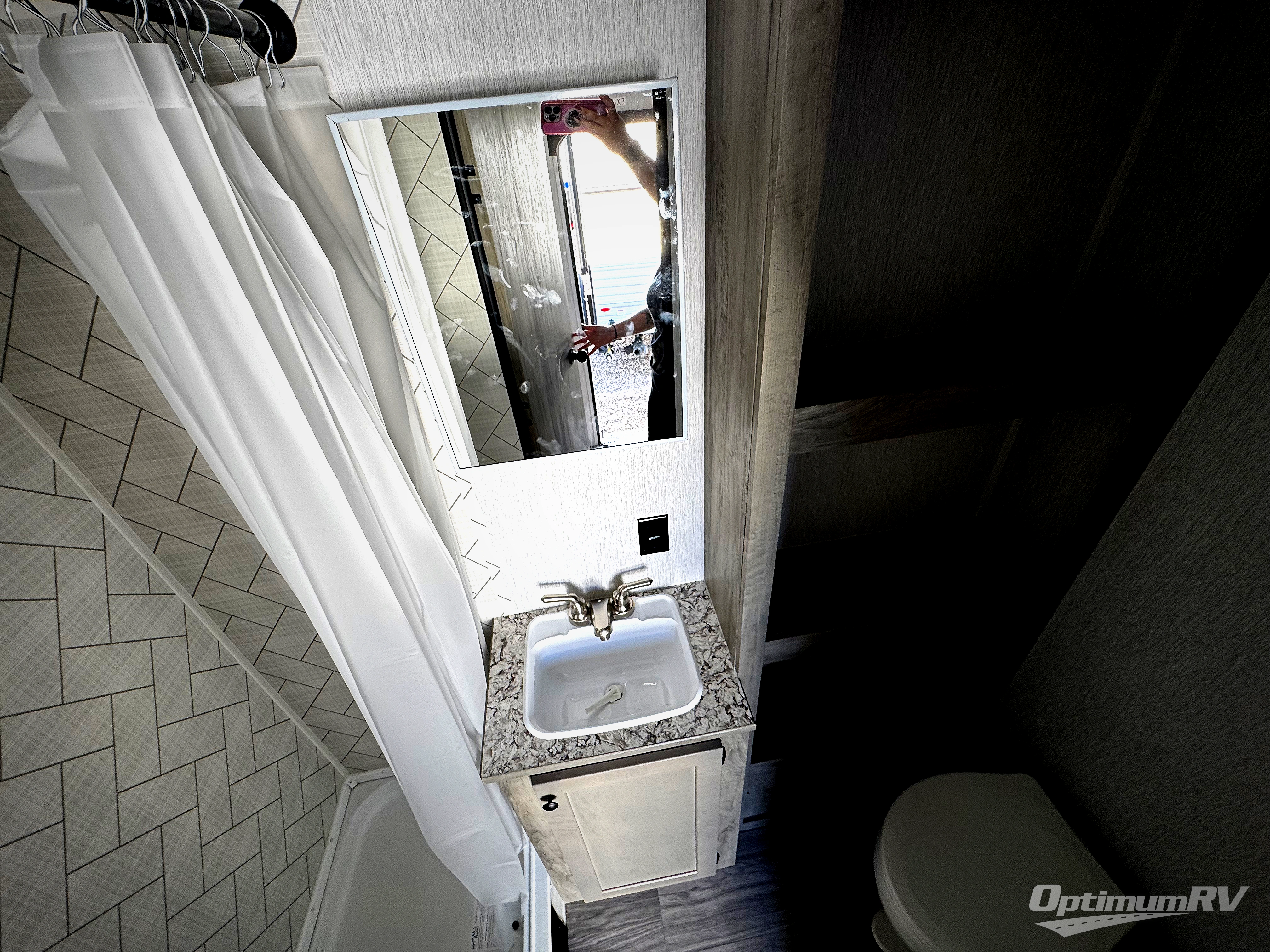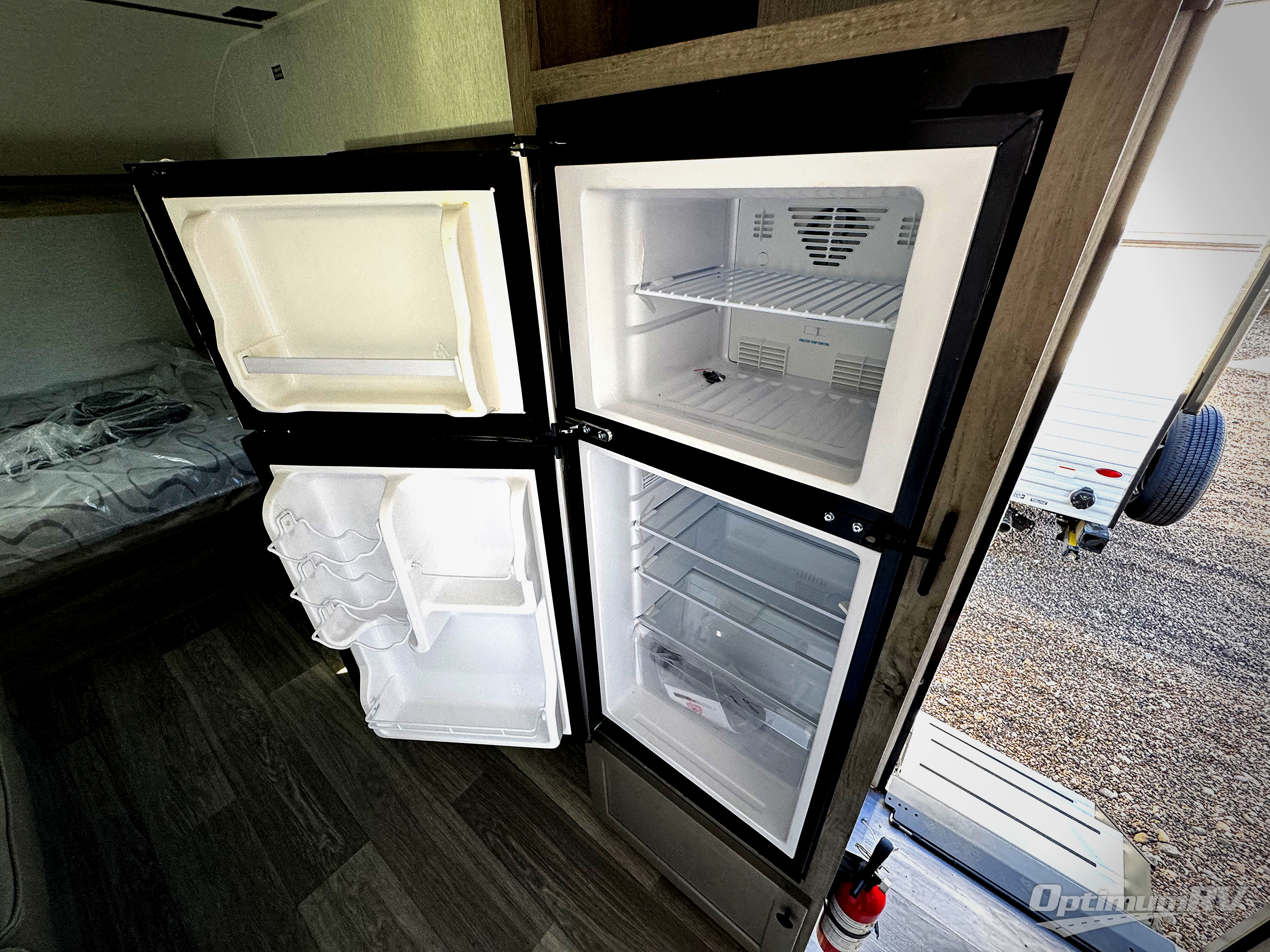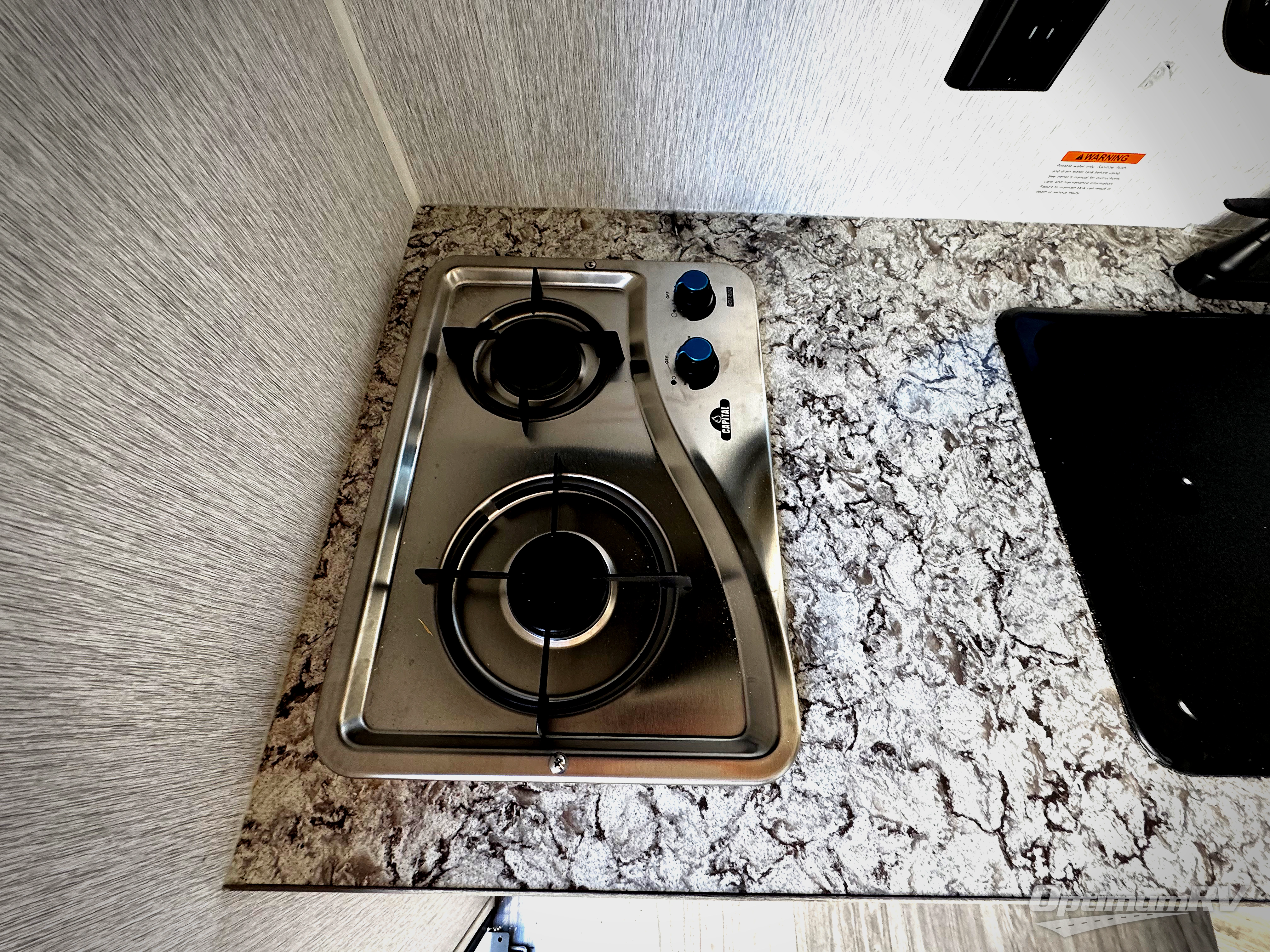You're going to love every minute spent in this cozy travel trailer for three happy campers! The rear corner kitchen includes a two burner stove and double sink for easy clean up, and the full bath is in the other rear corner. This model also includes a 4.3 cu. ft. 12V refrigerator and a bar top where you can enjoy your meals together each day. The 68" jiffy sofa provides a place to relax in the evenings, and an overnight guests can make their bed here at night. You will find the RV queen bed to be accommodating, especially with its shelf for your personal belongings and a closet for clothes!
