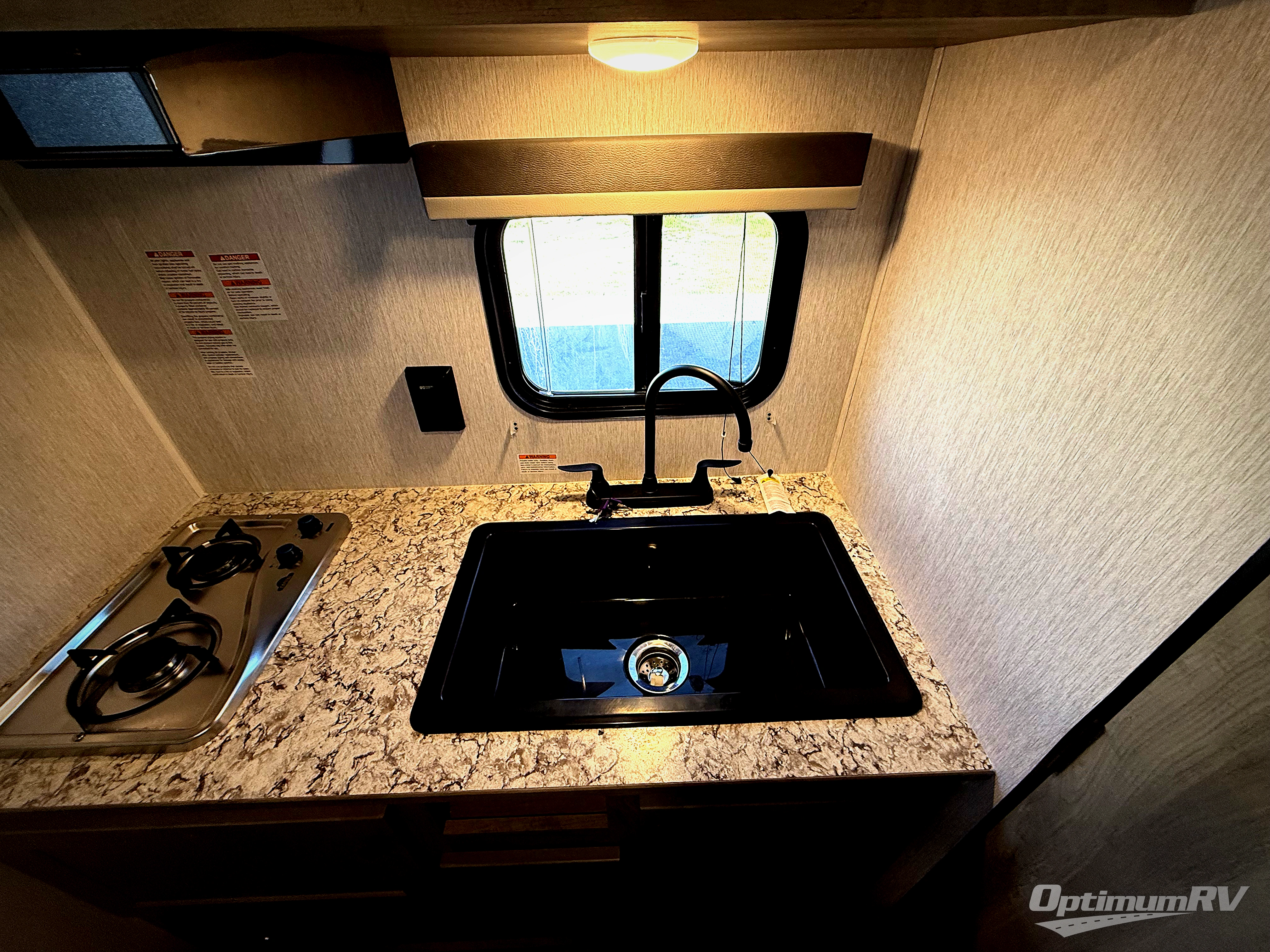 You're going to love every minute spent in this cozy travel trailer for three happy campers! The rear corner kitchen includes a two burner stove and double sink for easy clean up, and the full bath is in the other rear corner. This model also includes a 4.3 cu. ft. 12V refrigerator and a bar top where you can enjoy your meals together each day. The 68" jiffy sofa provides a place to relax in the evenings, and an overnight guests can make their bed here at night. You will find the RV queen bed to be accommodating, especially with its shelf for your personal belongings and a closet for clothes!