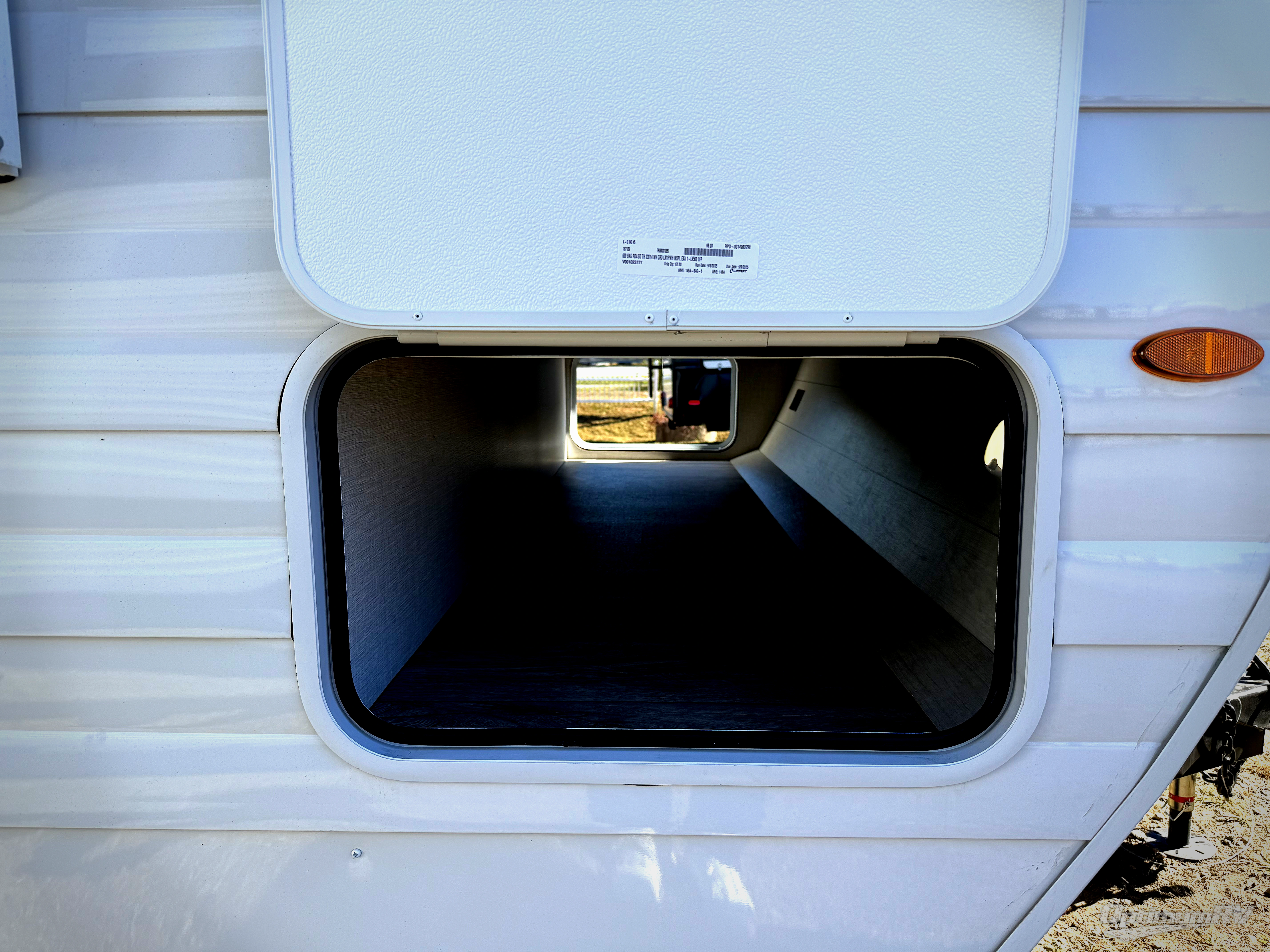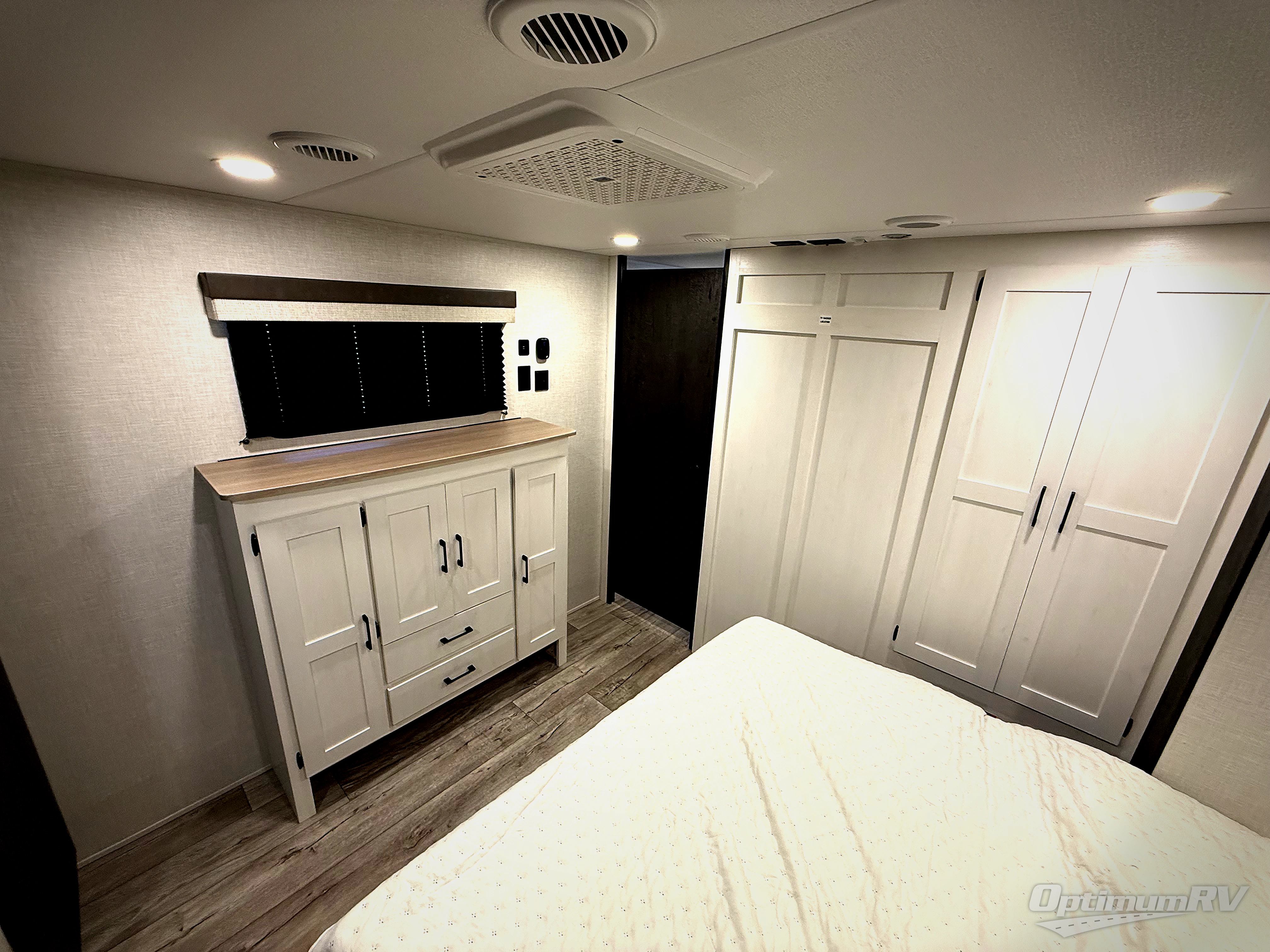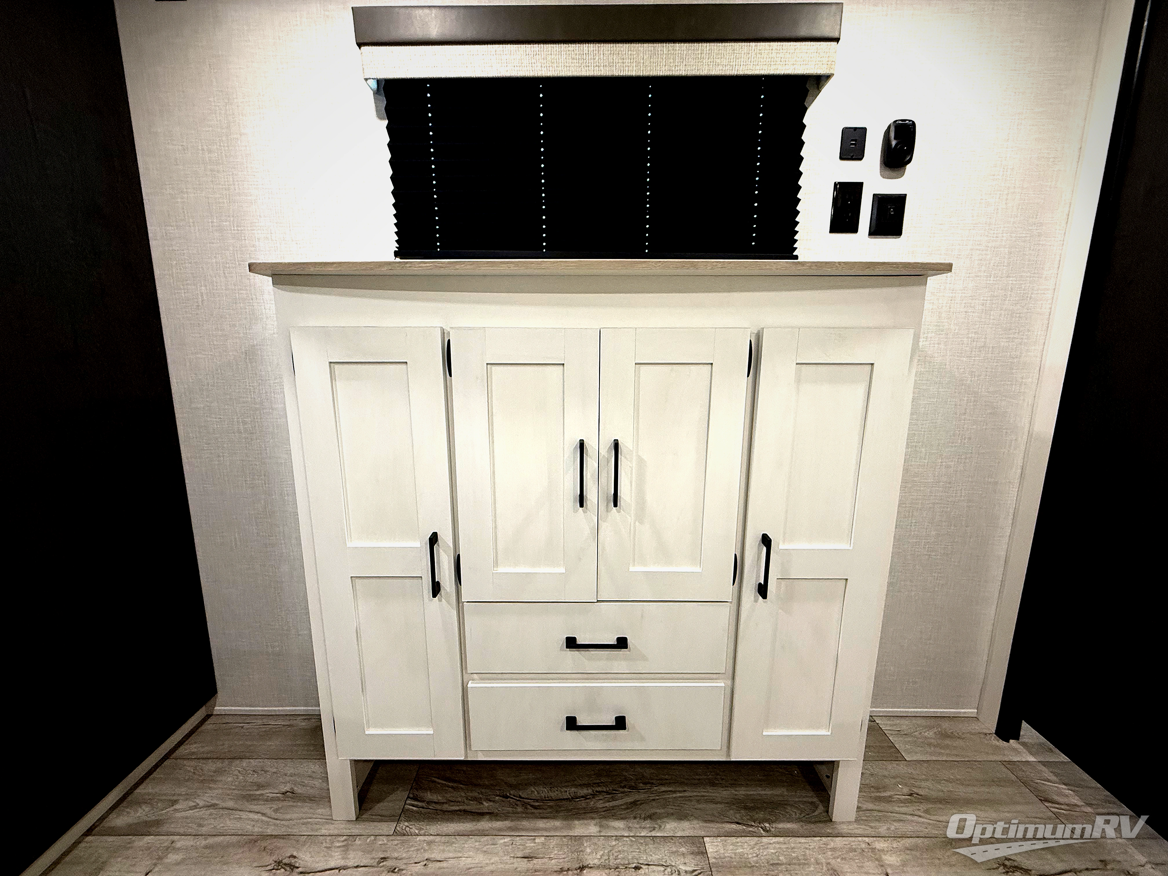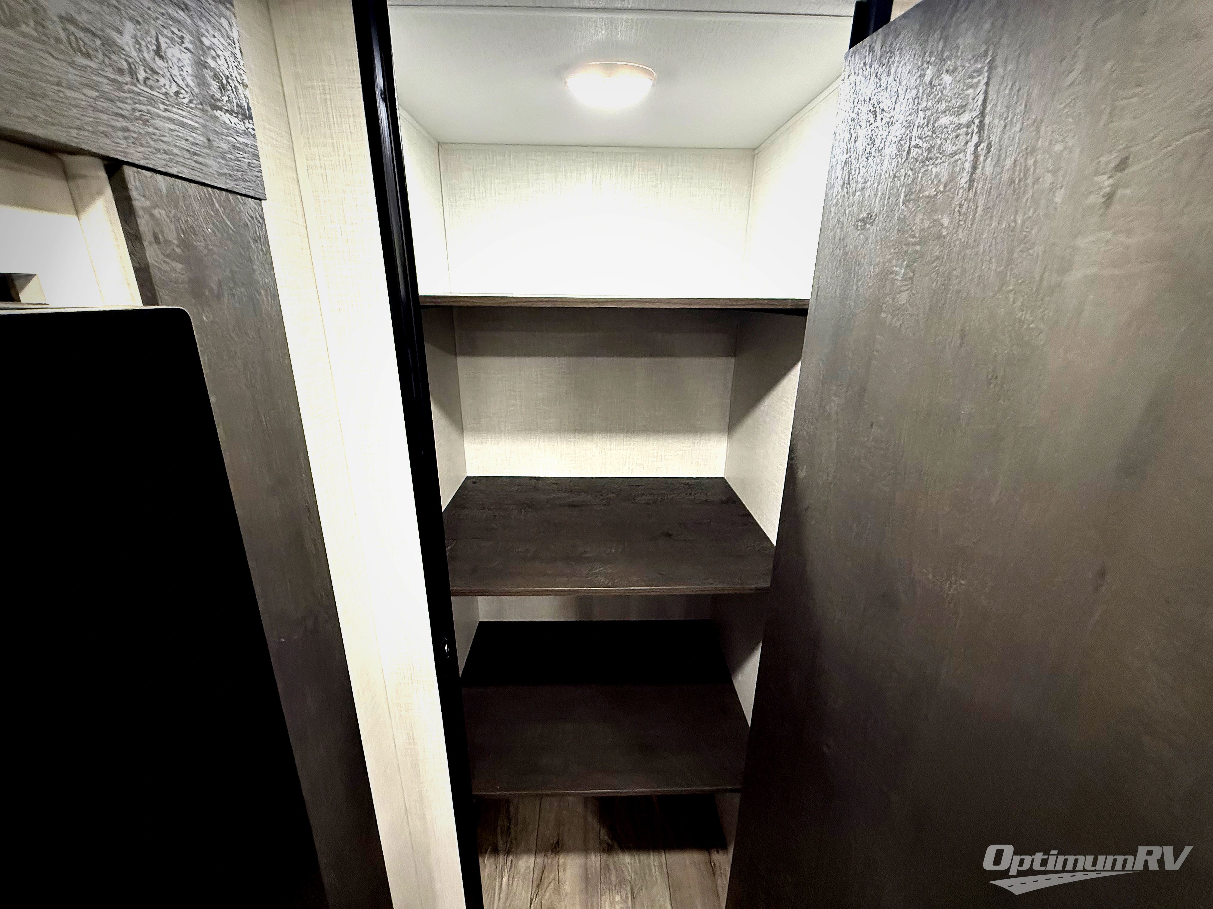 This travel trailer will feel just like home thanks to its spacious interior, large front private bedroom, and kitchen island. There are plenty of places to seating space, including a rear 70" sofa plus theater seating and a Sit N' Slide table within one of the slides. The opposing slide here includes the entertainment center and some of the kitchen appliances. You will also appreciate two pantries, one with washer and dryer prep if you want to add those appliances. A full bath lets you stay clean throughout your trip without having to use the campground's facilities, and the front bedroom is sure to make you feel at home. There is a Sleep Tight queen bed slide, a large front closet, plus a dresser and a second closet for ample storage space!